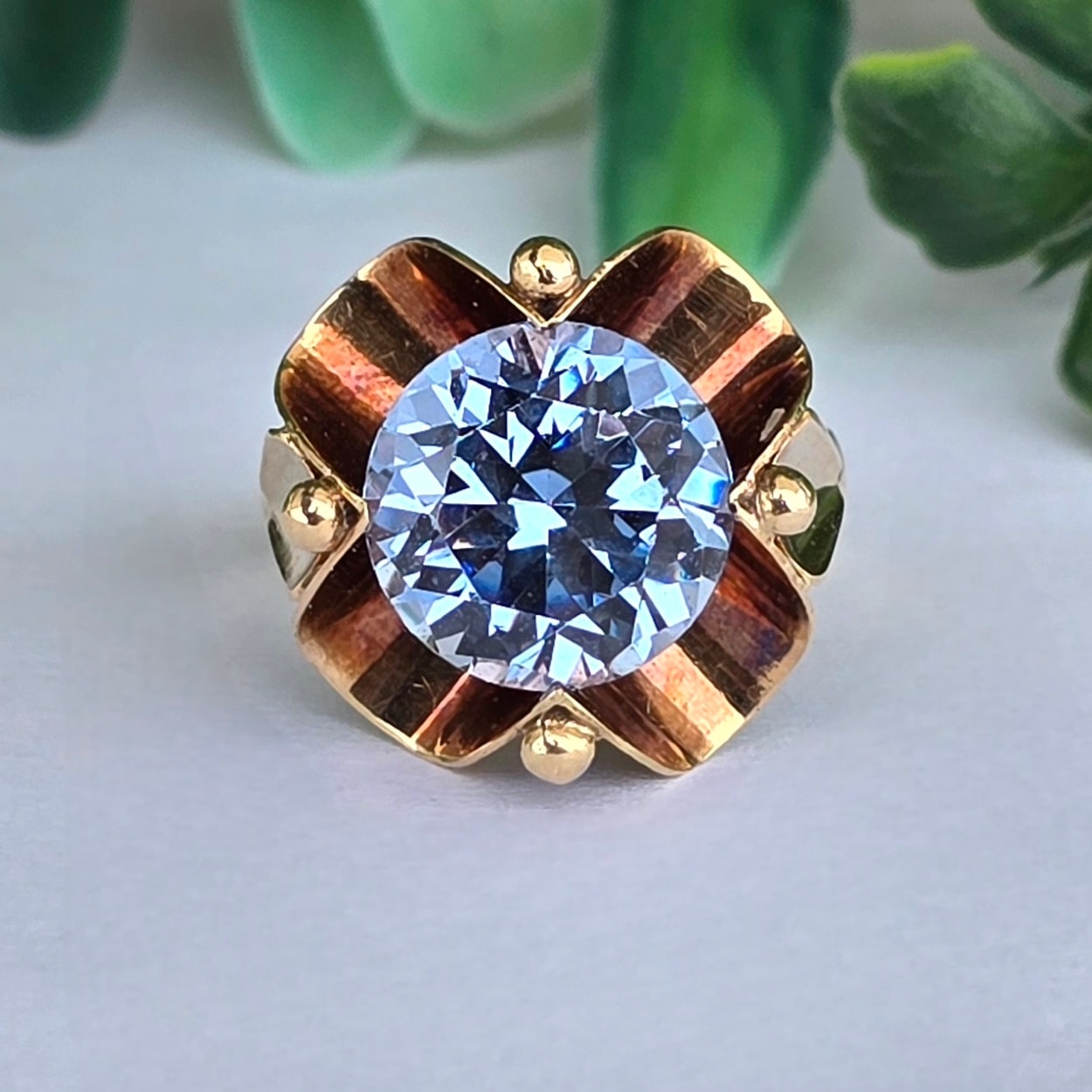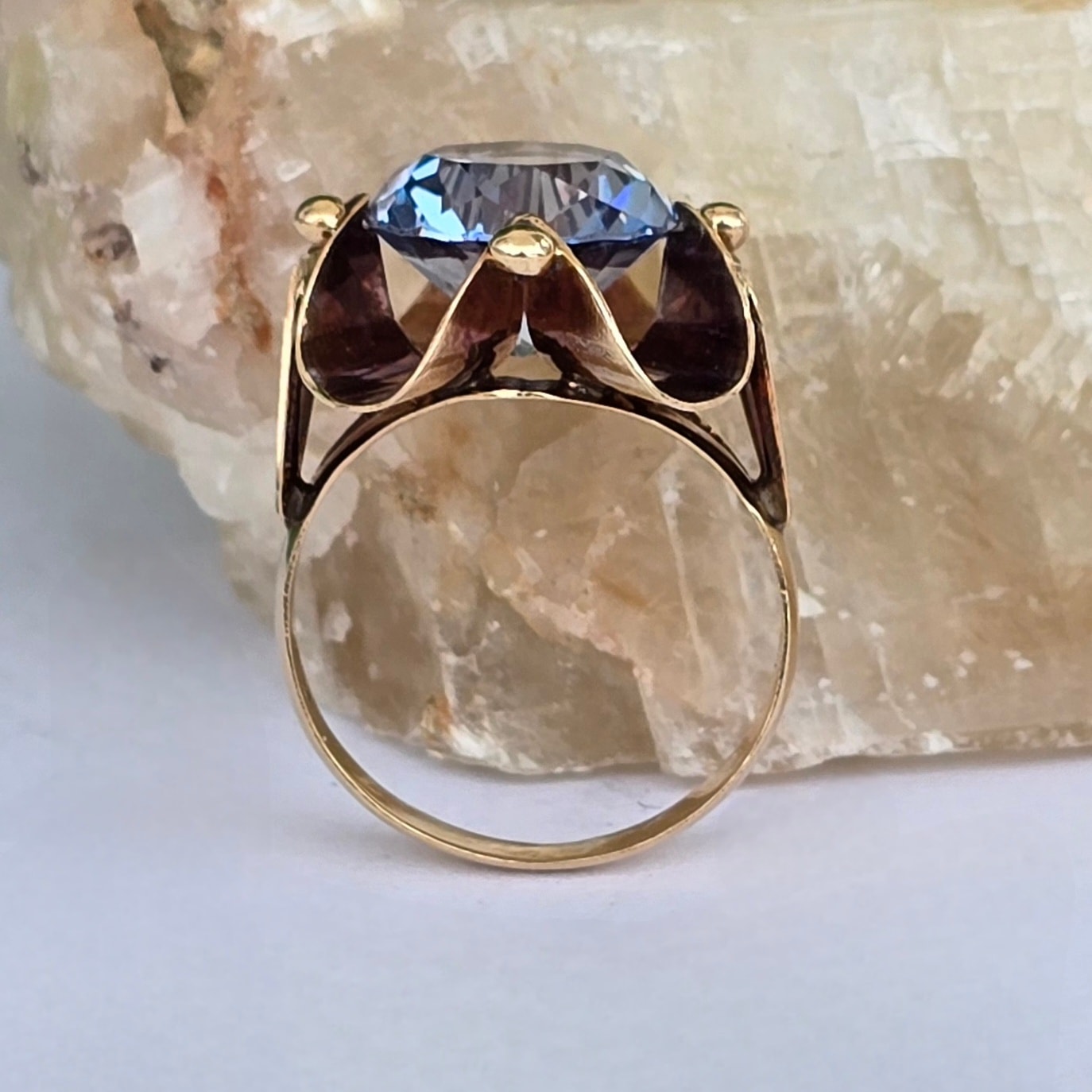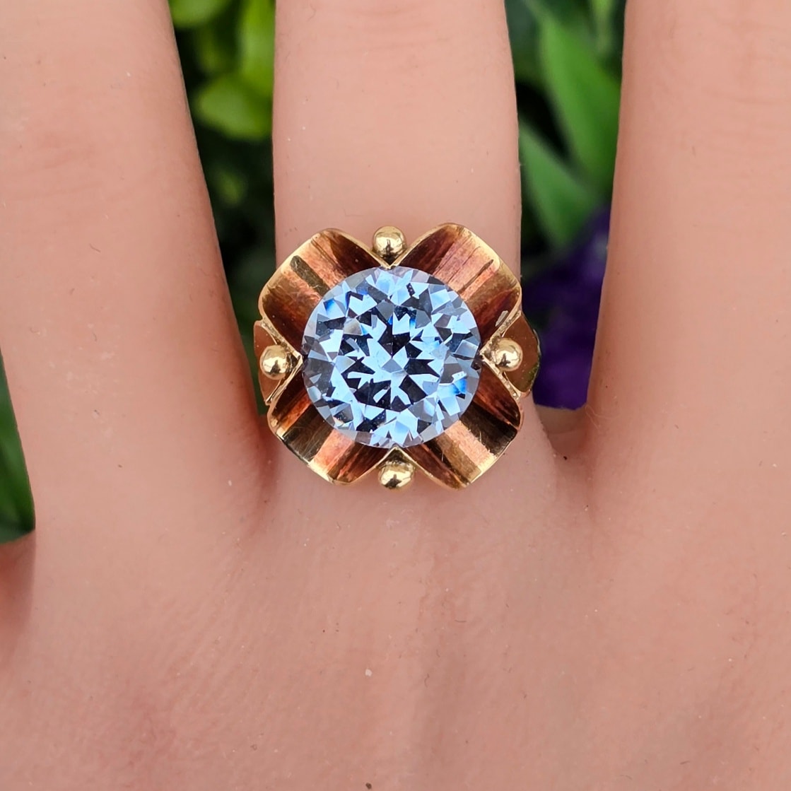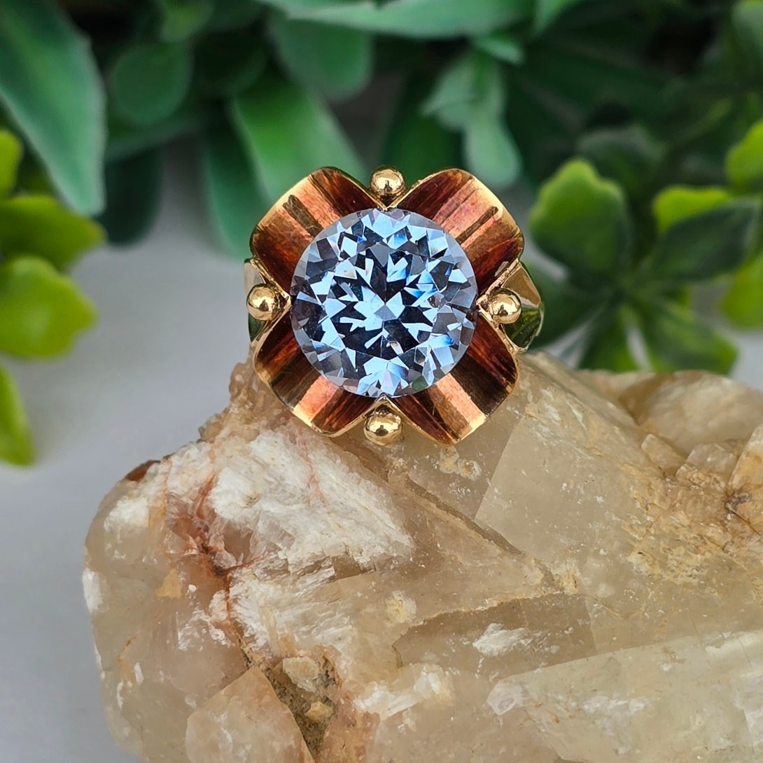 Inel vechi deosebit, din aur de 14K, cu un superb topaz "swiss blue" natural (anii 1940-1950, Germania).