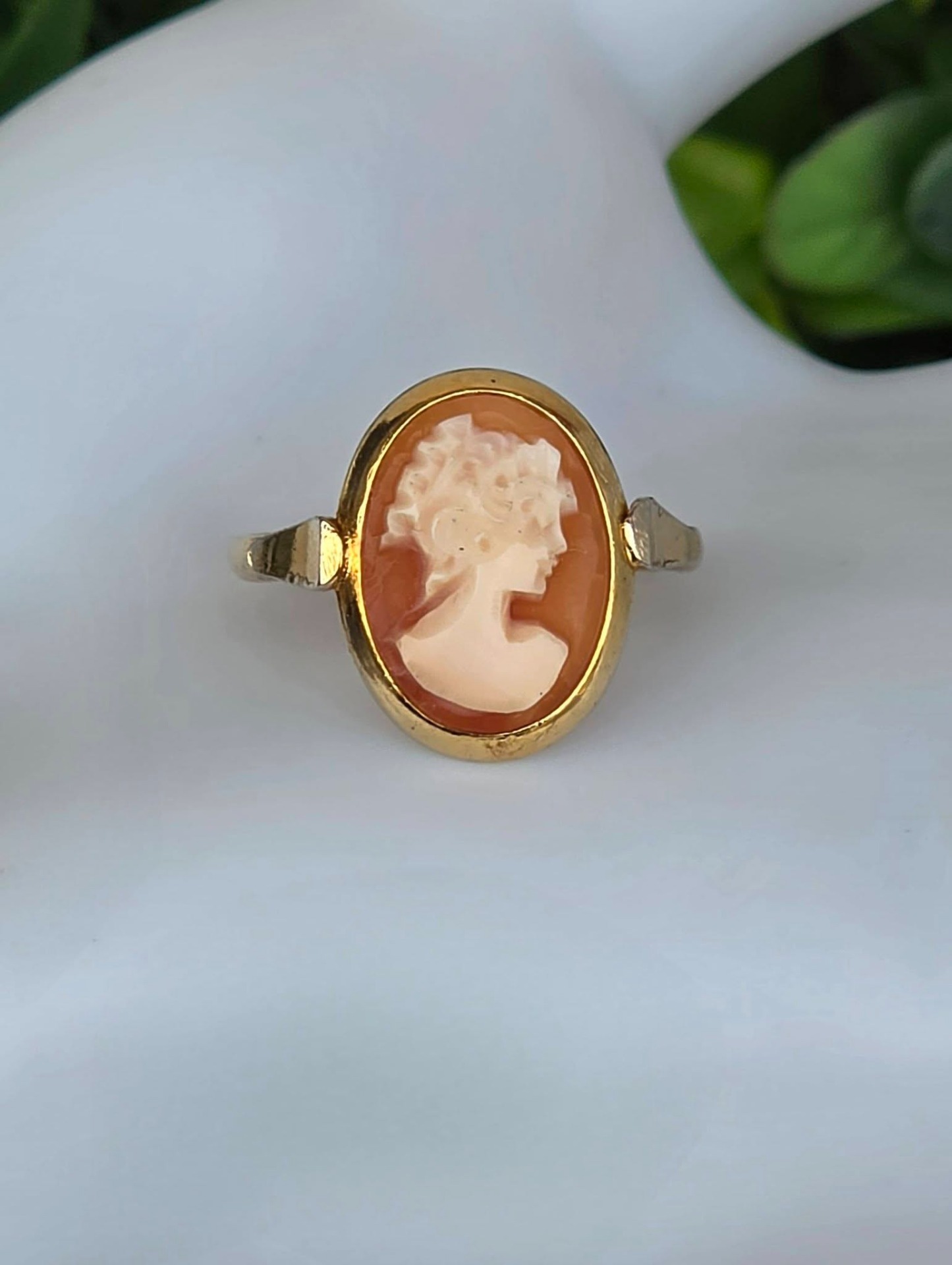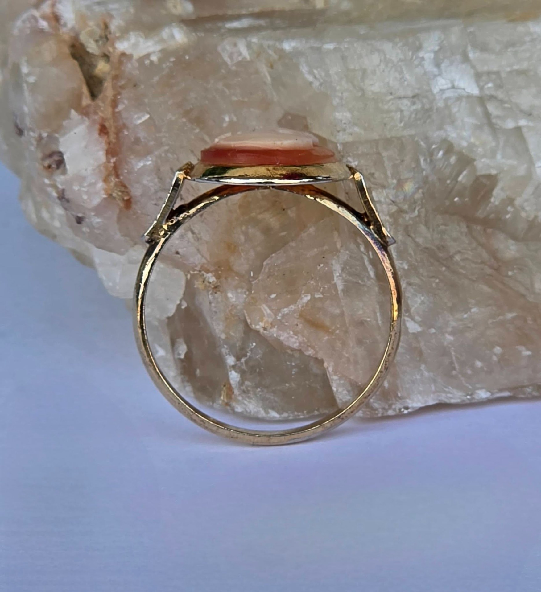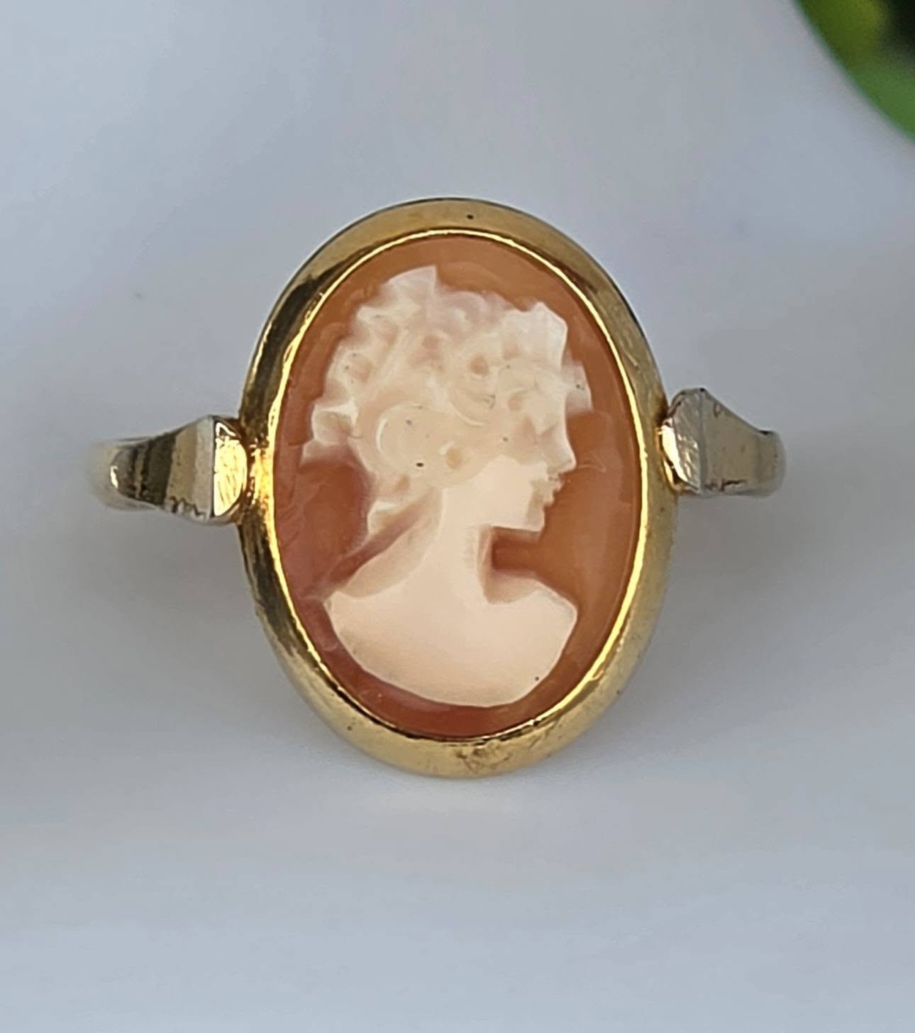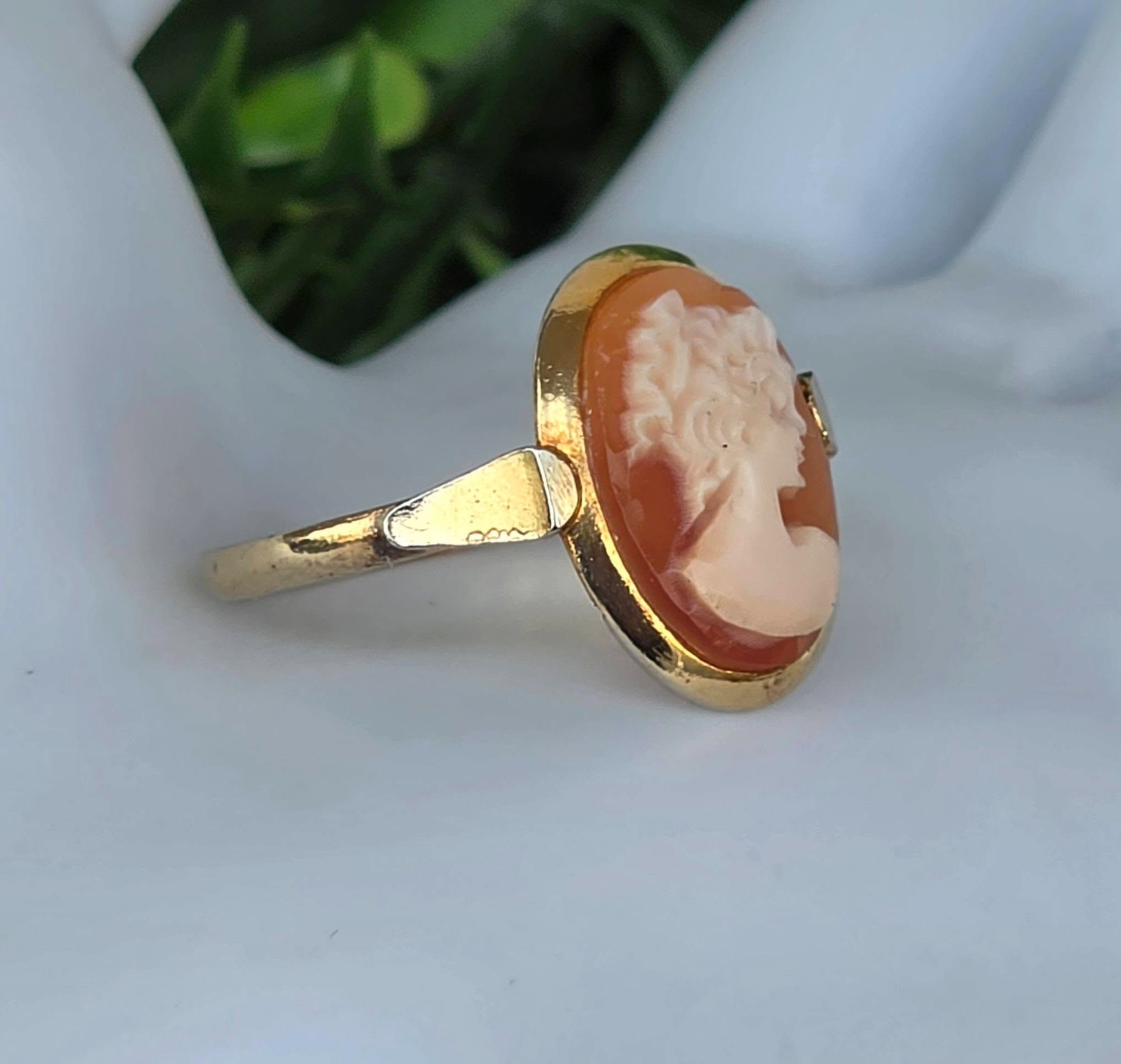 Inel vechi din argint aurit, cu camee, sculptură în scoică naturală.