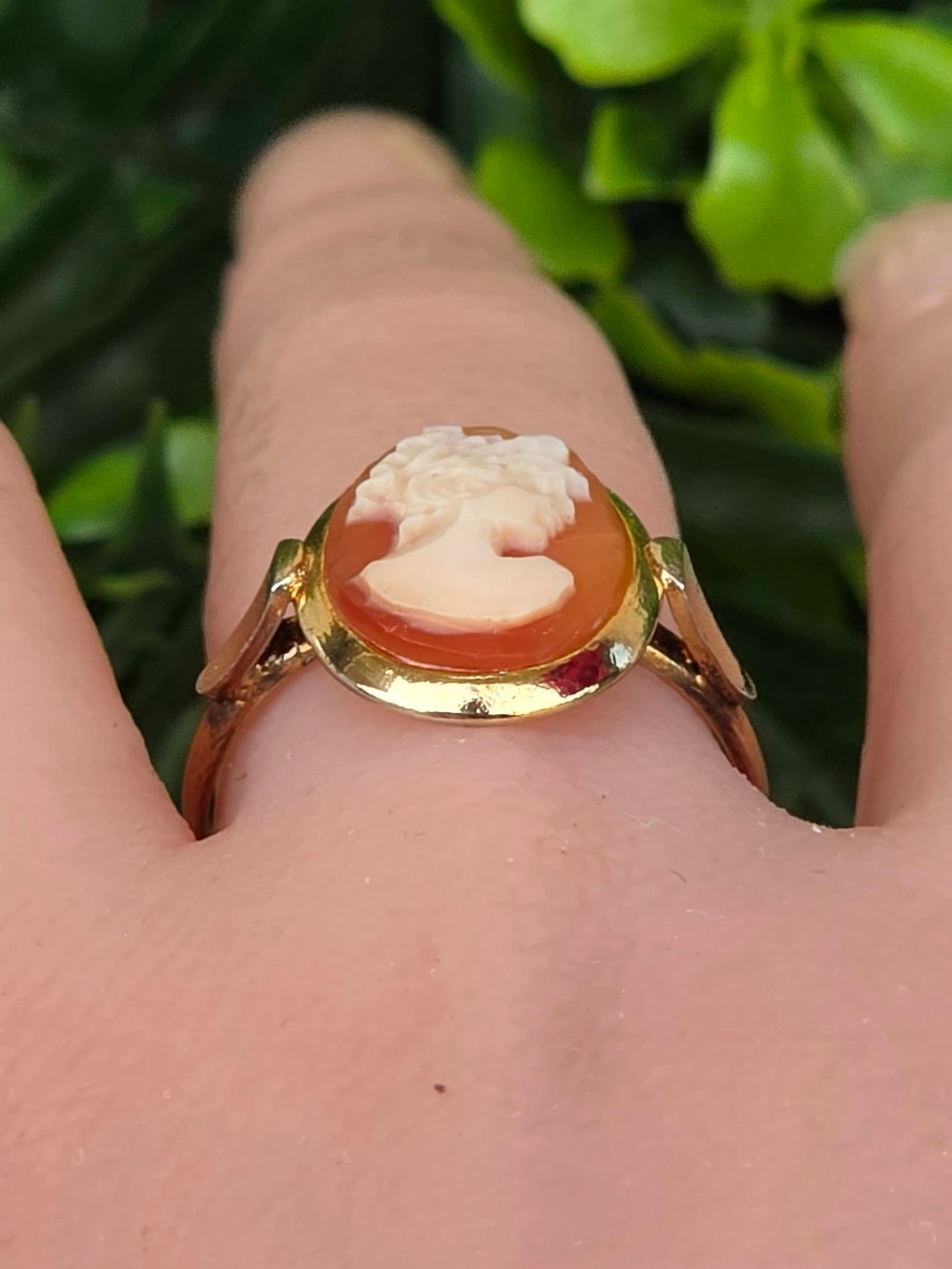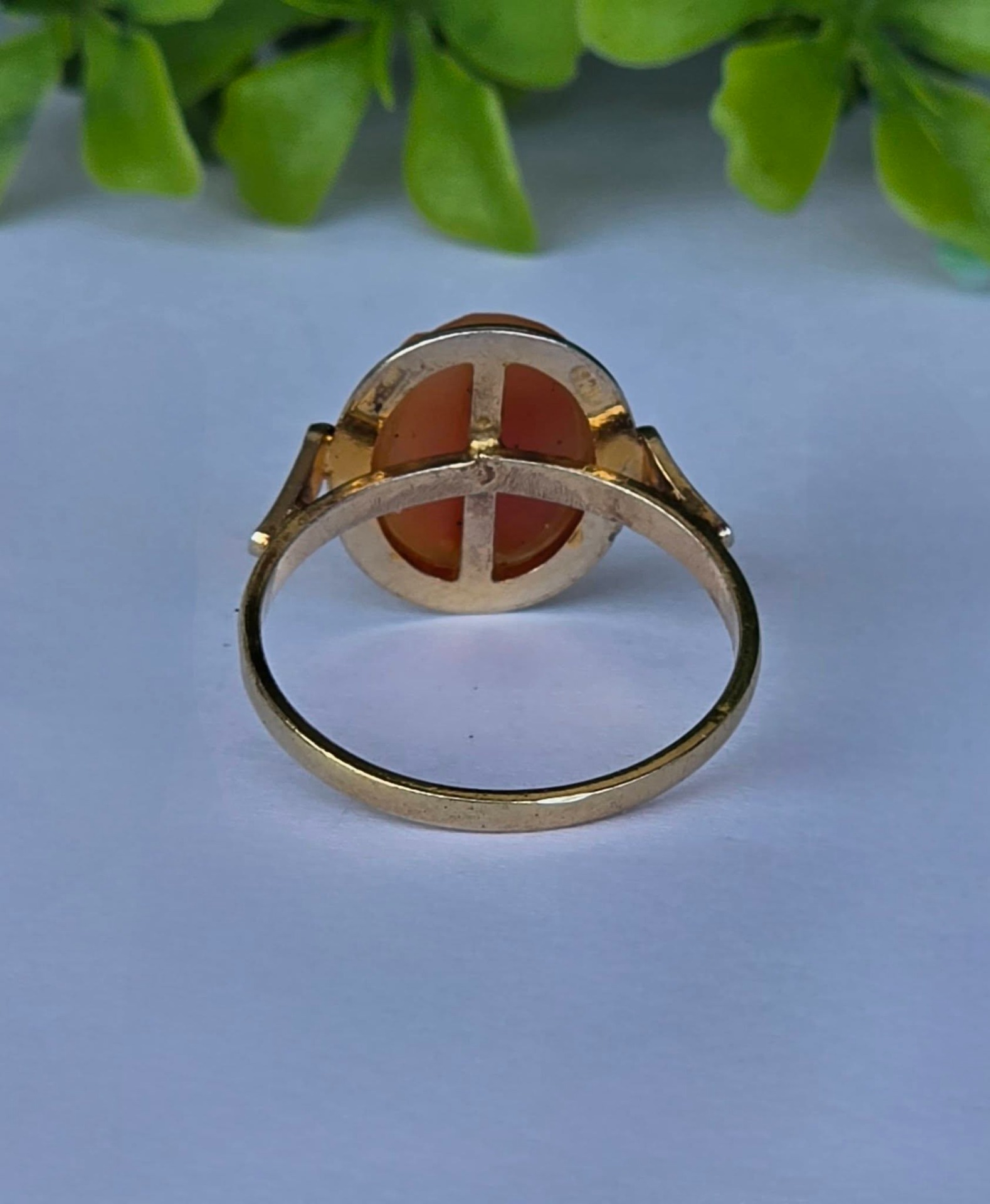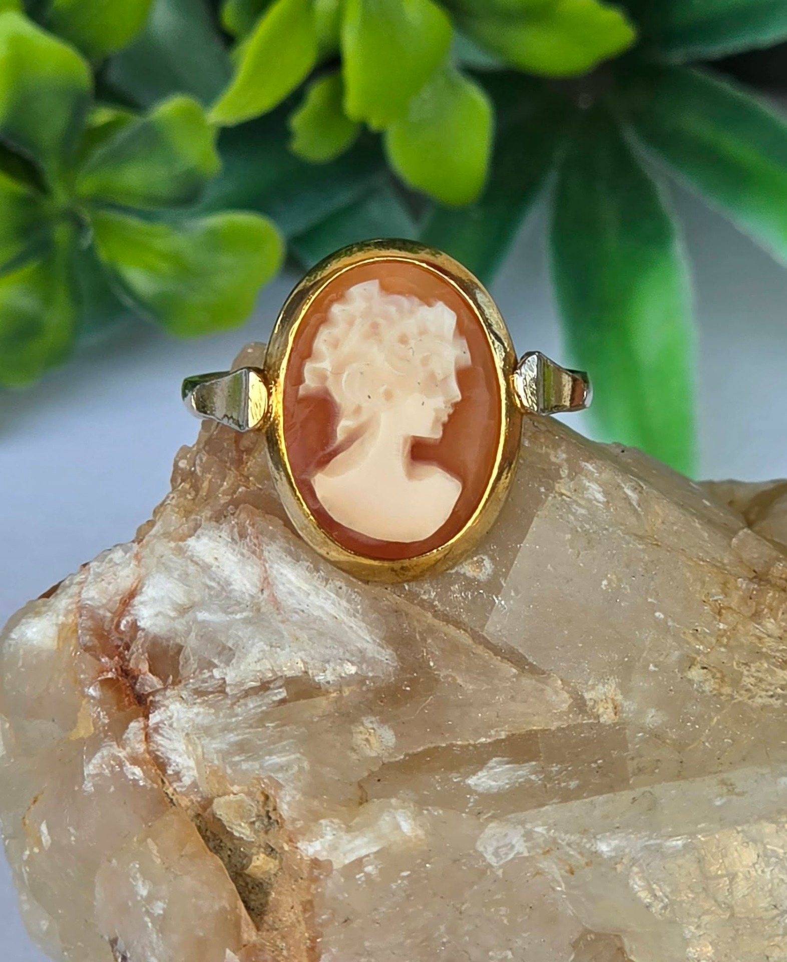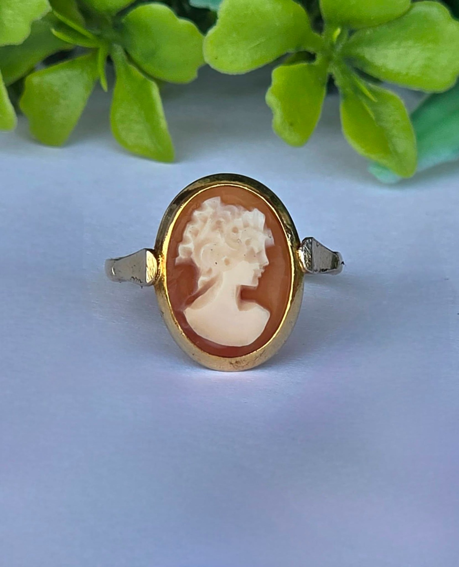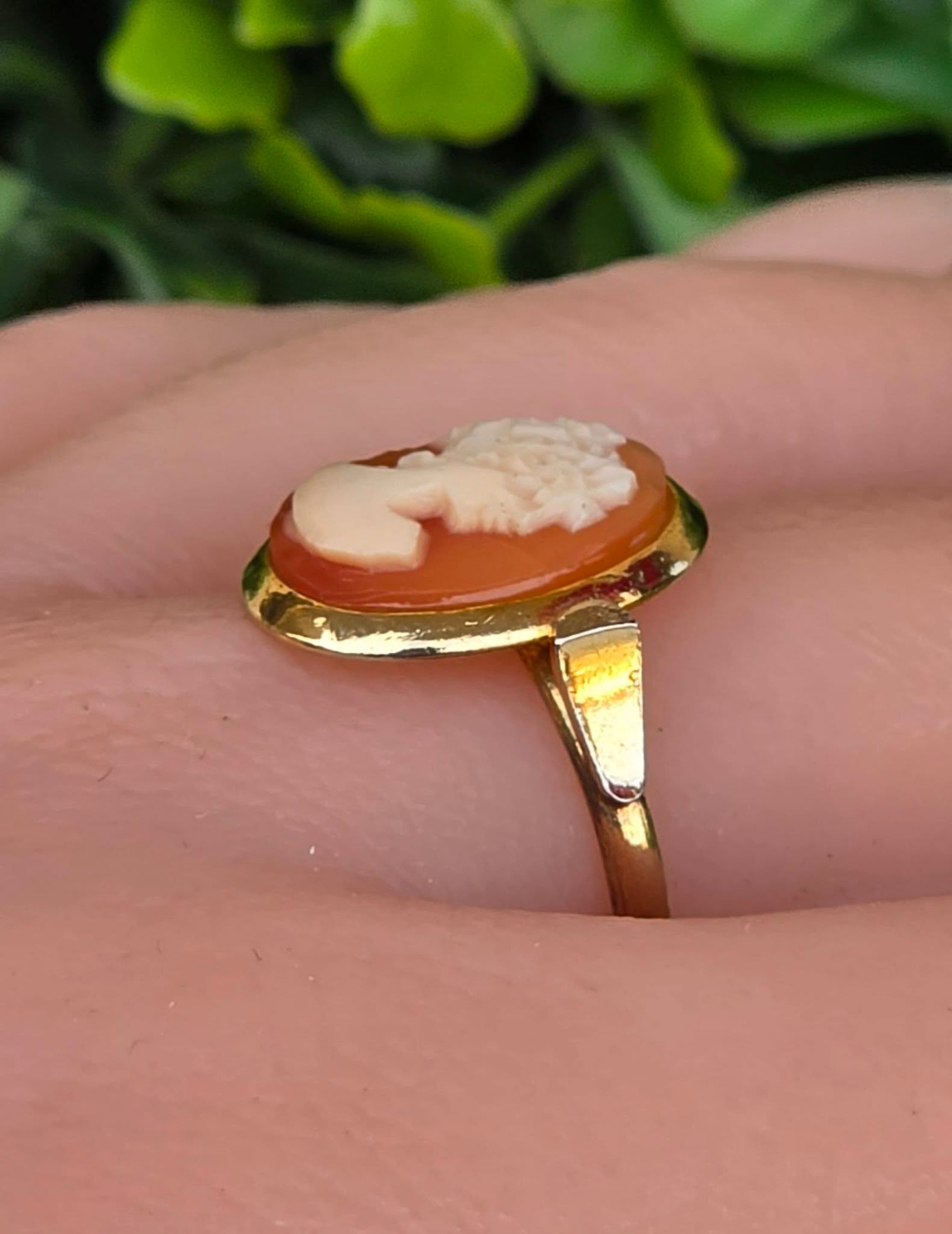 Inel vechi din argint aurit, cu camee, sculptură în scoică naturală.