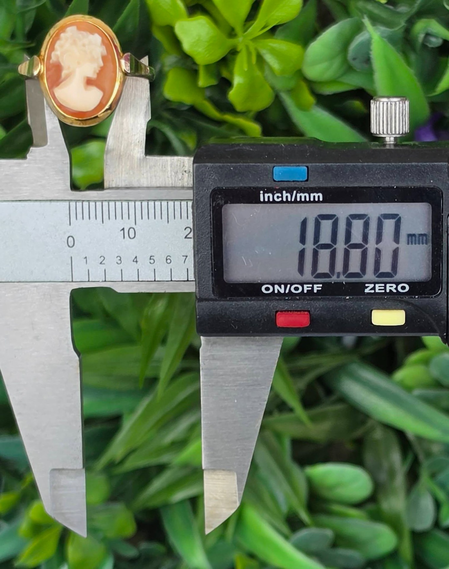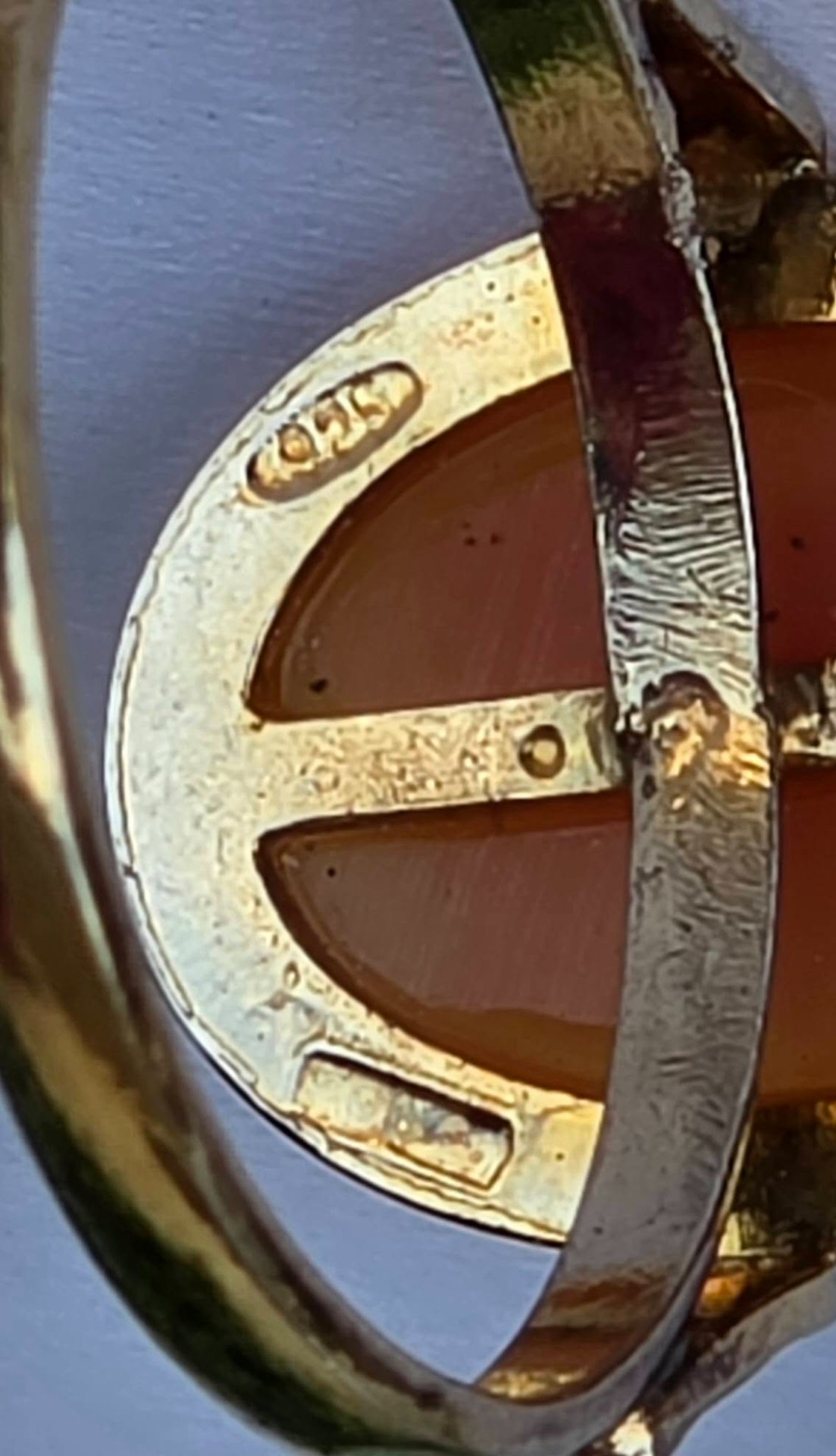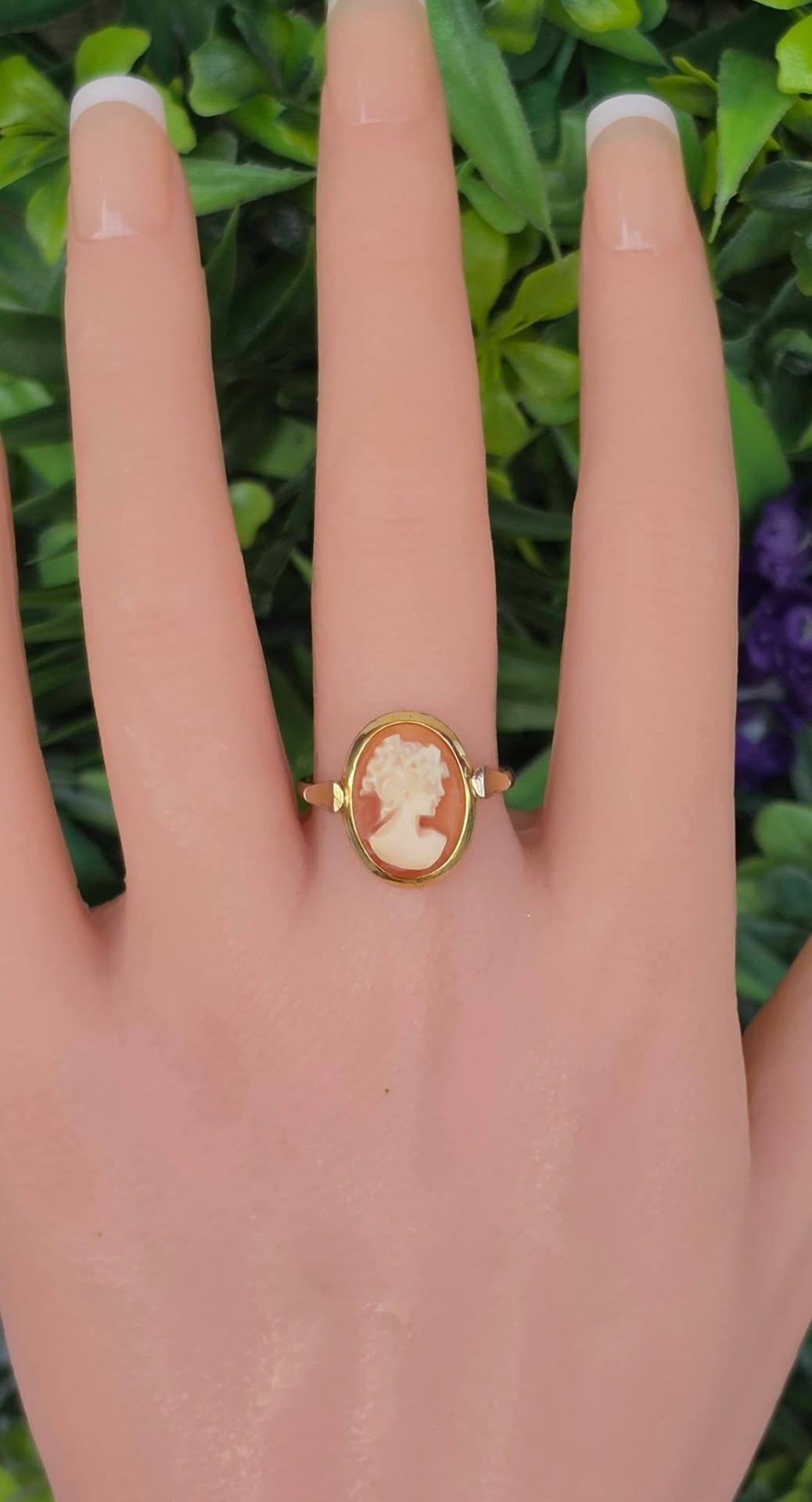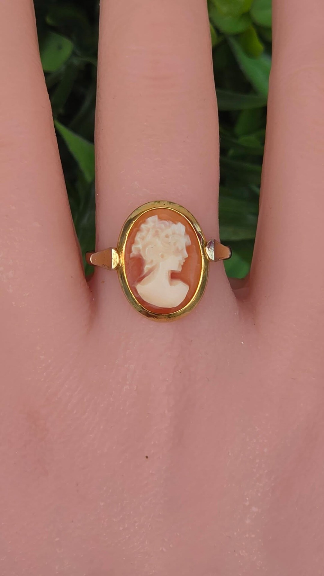 Inel vechi din argint aurit, cu camee, sculptură în scoică naturală.