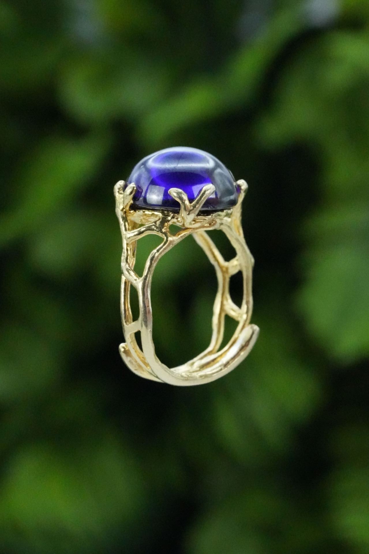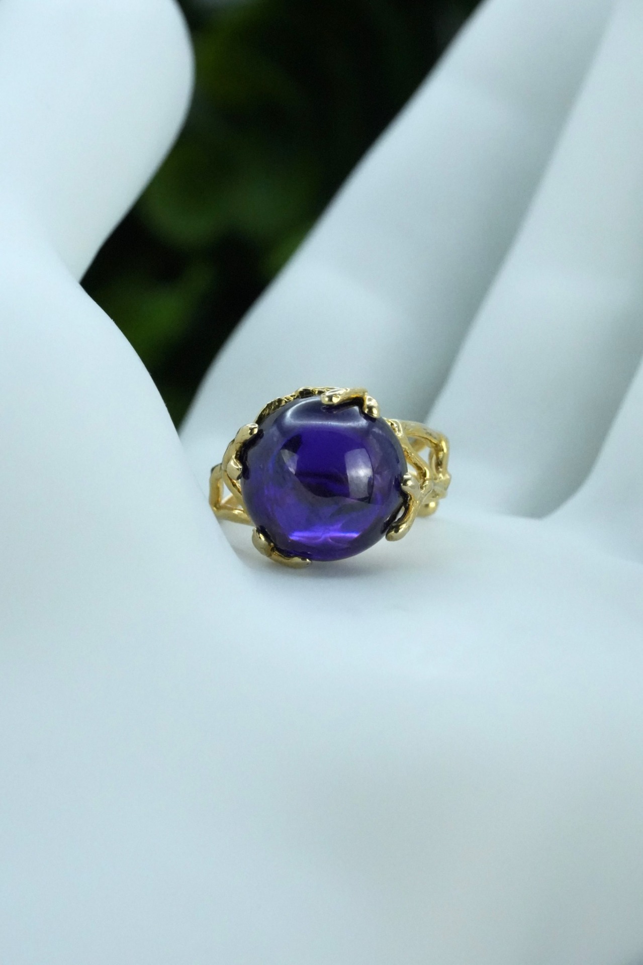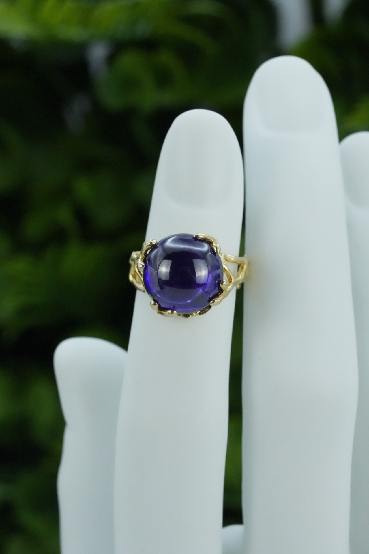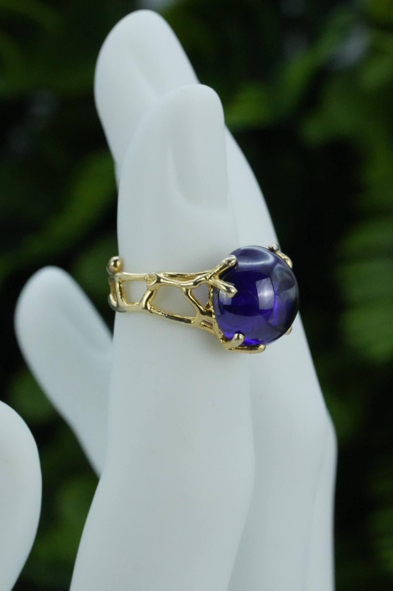Inel vechi din argint aurit, cu "glass paste" mov.