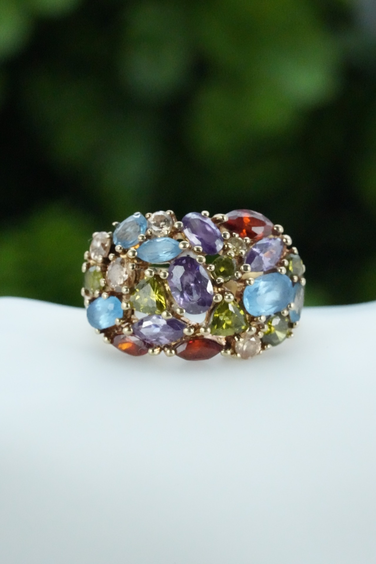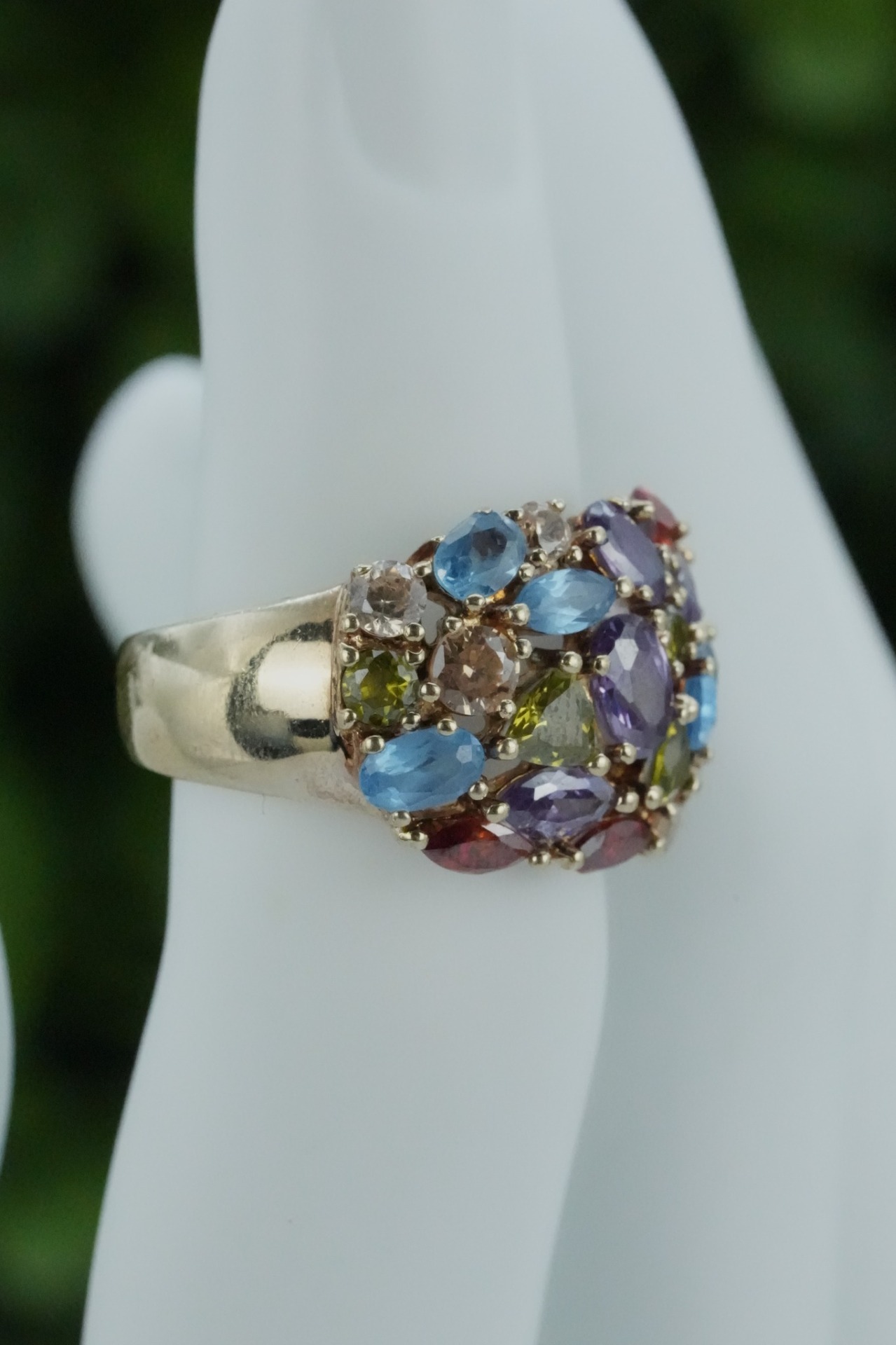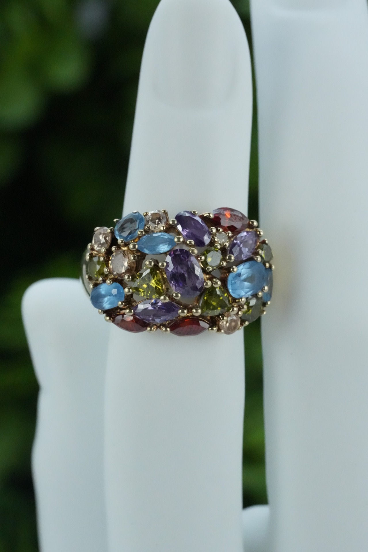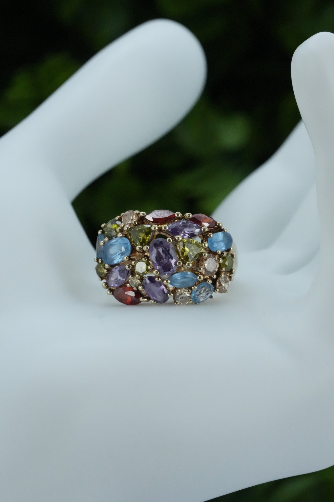 Inel vechi din argint aurit, "multigem", cu topaz natural și pietre cubic zirconia.