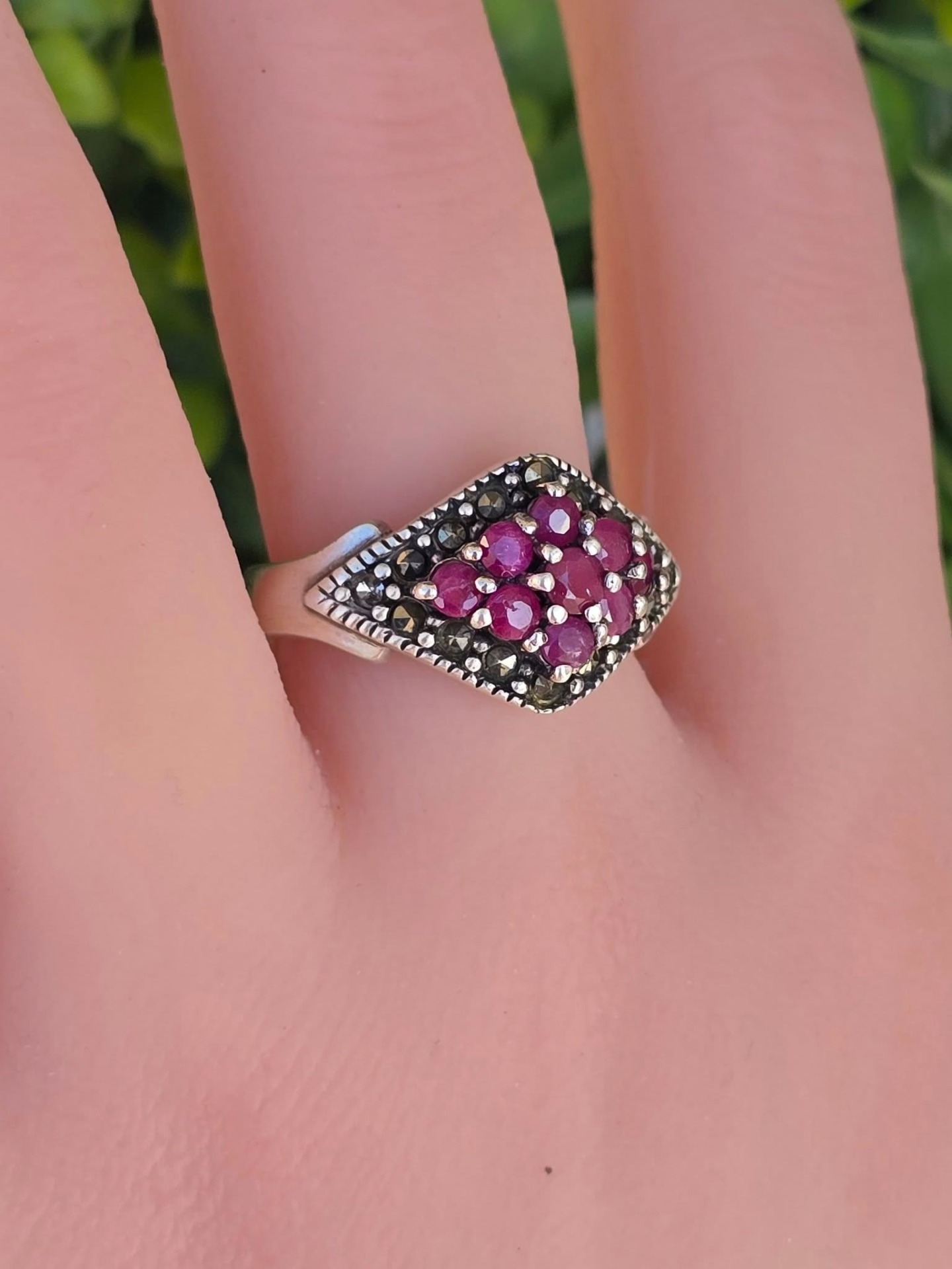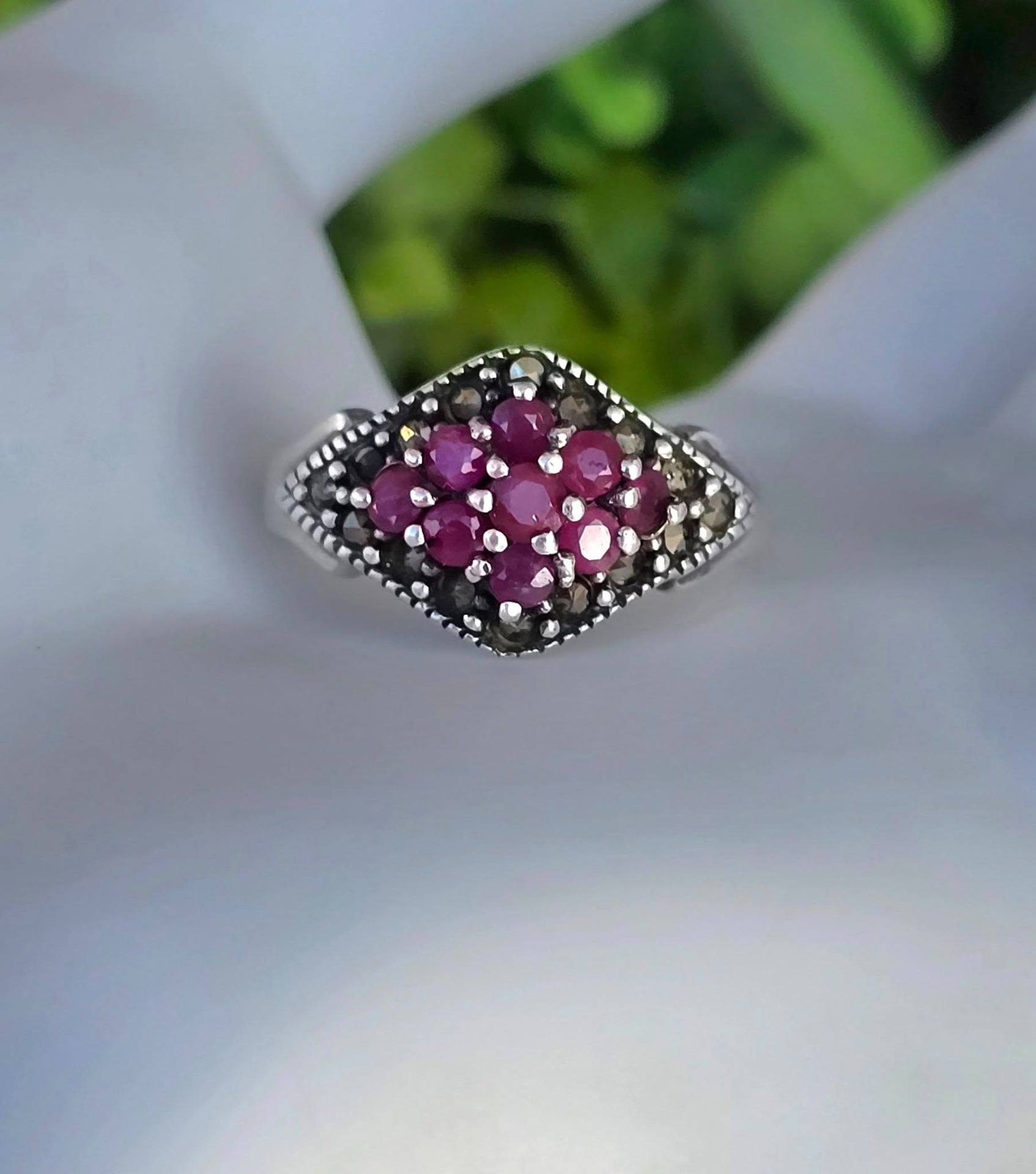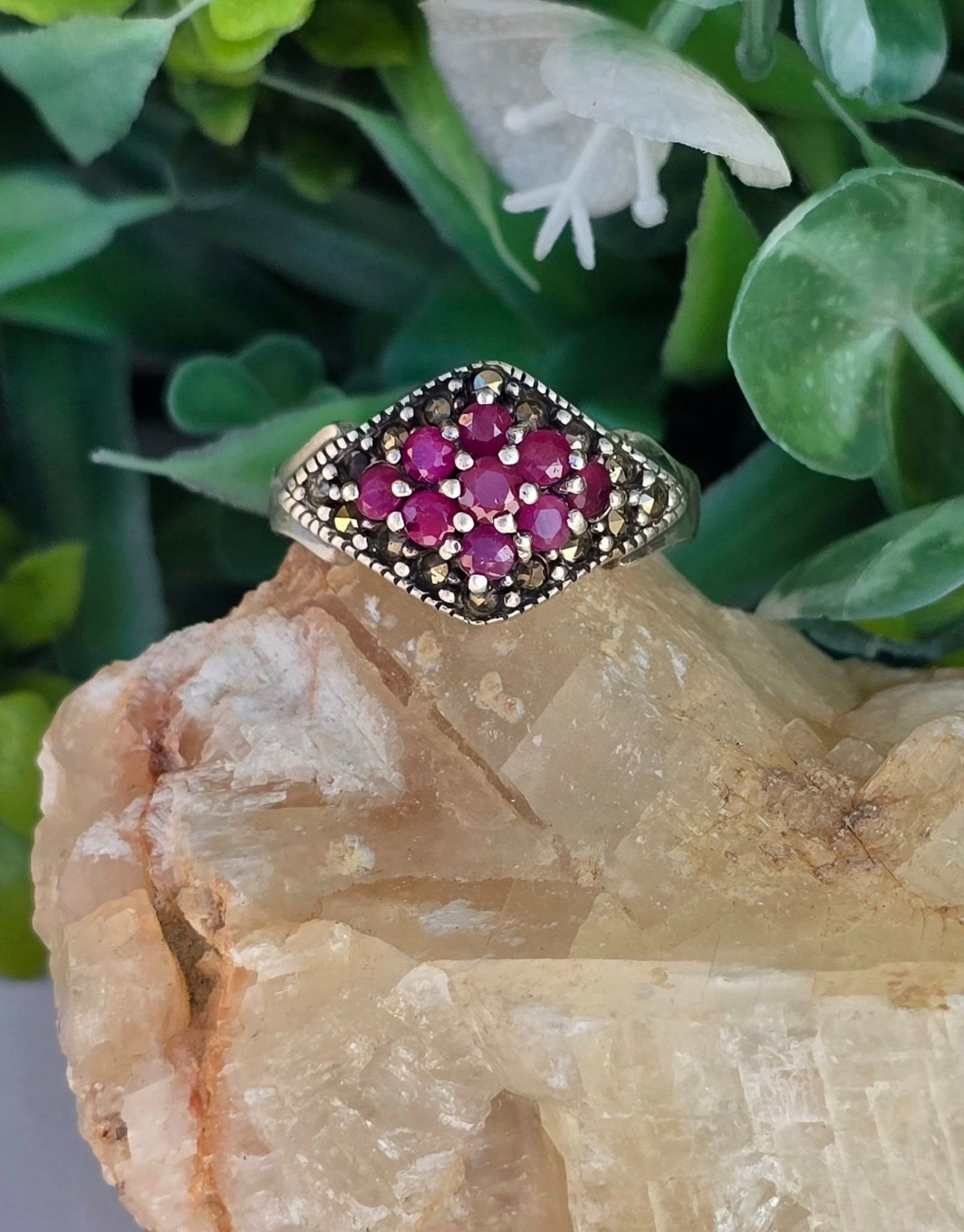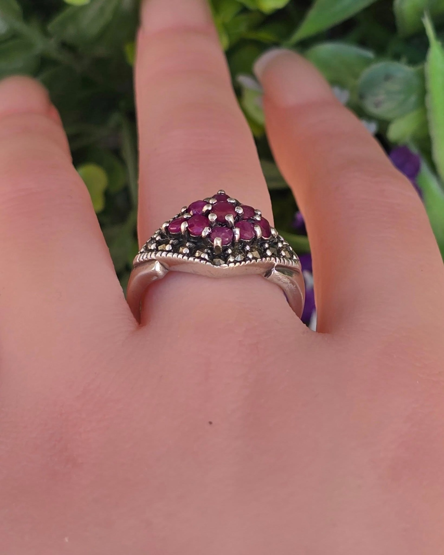 Inel vechi din argint, cu 9 rubine naturale și marcasite.