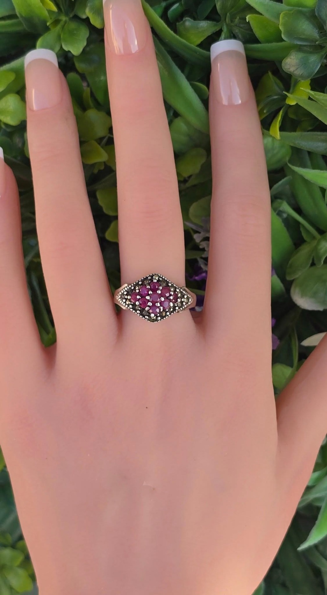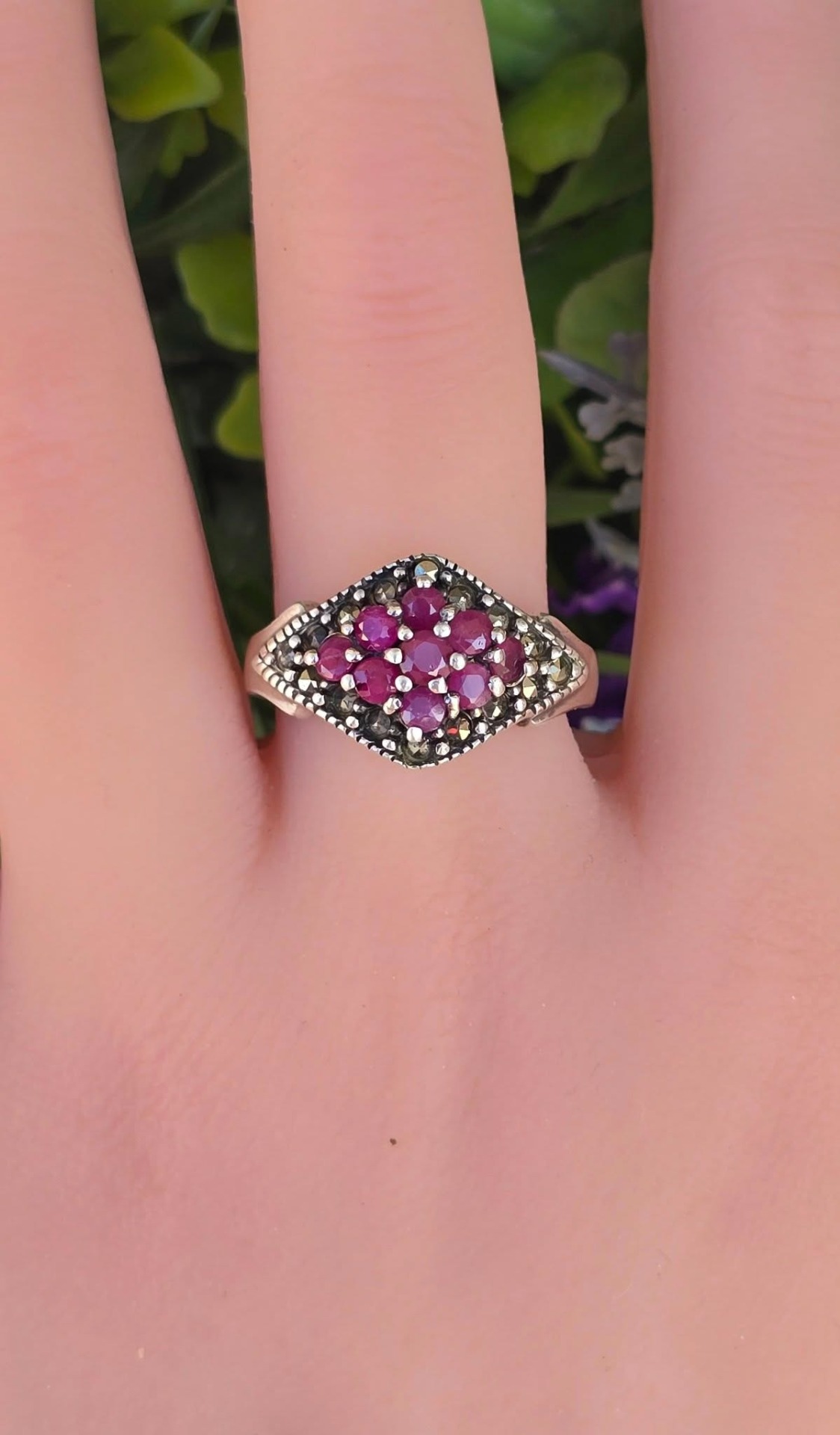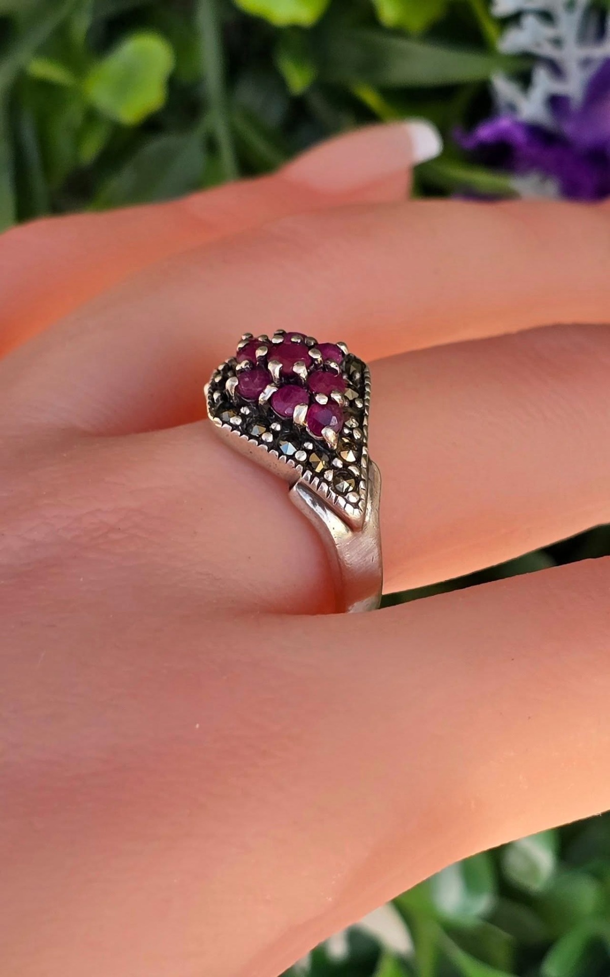 Inel vechi din argint, cu 9 rubine naturale și marcasite.