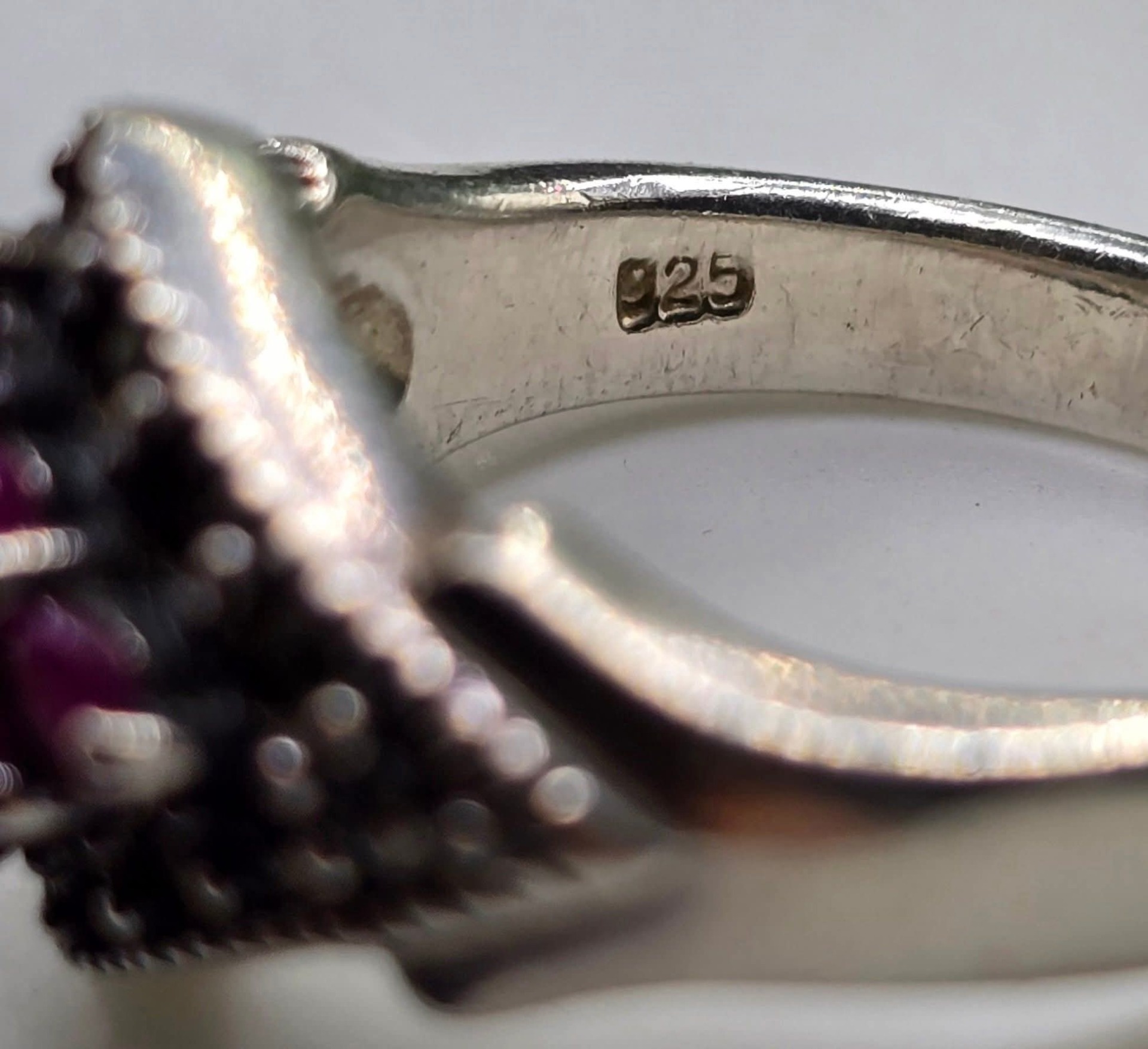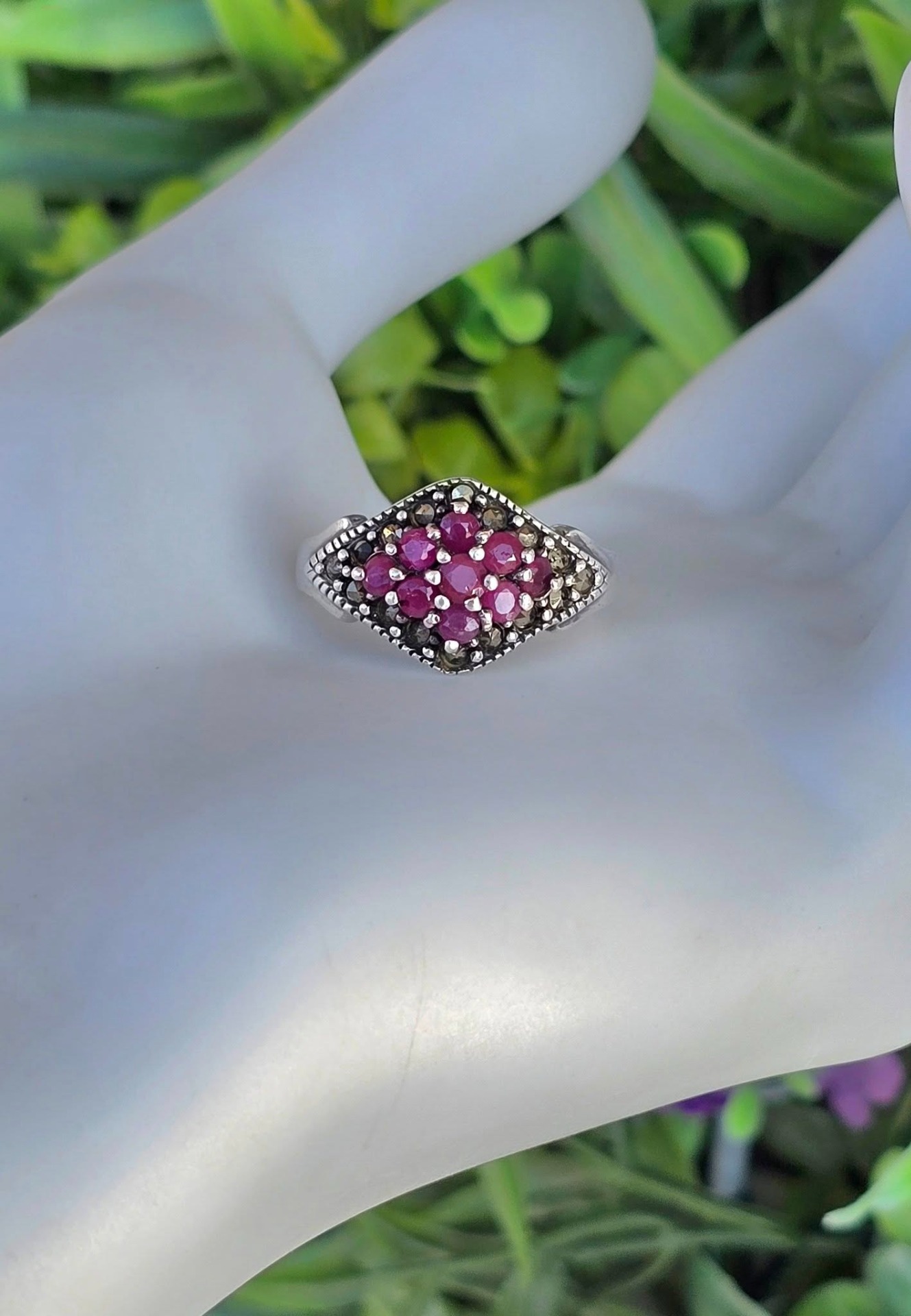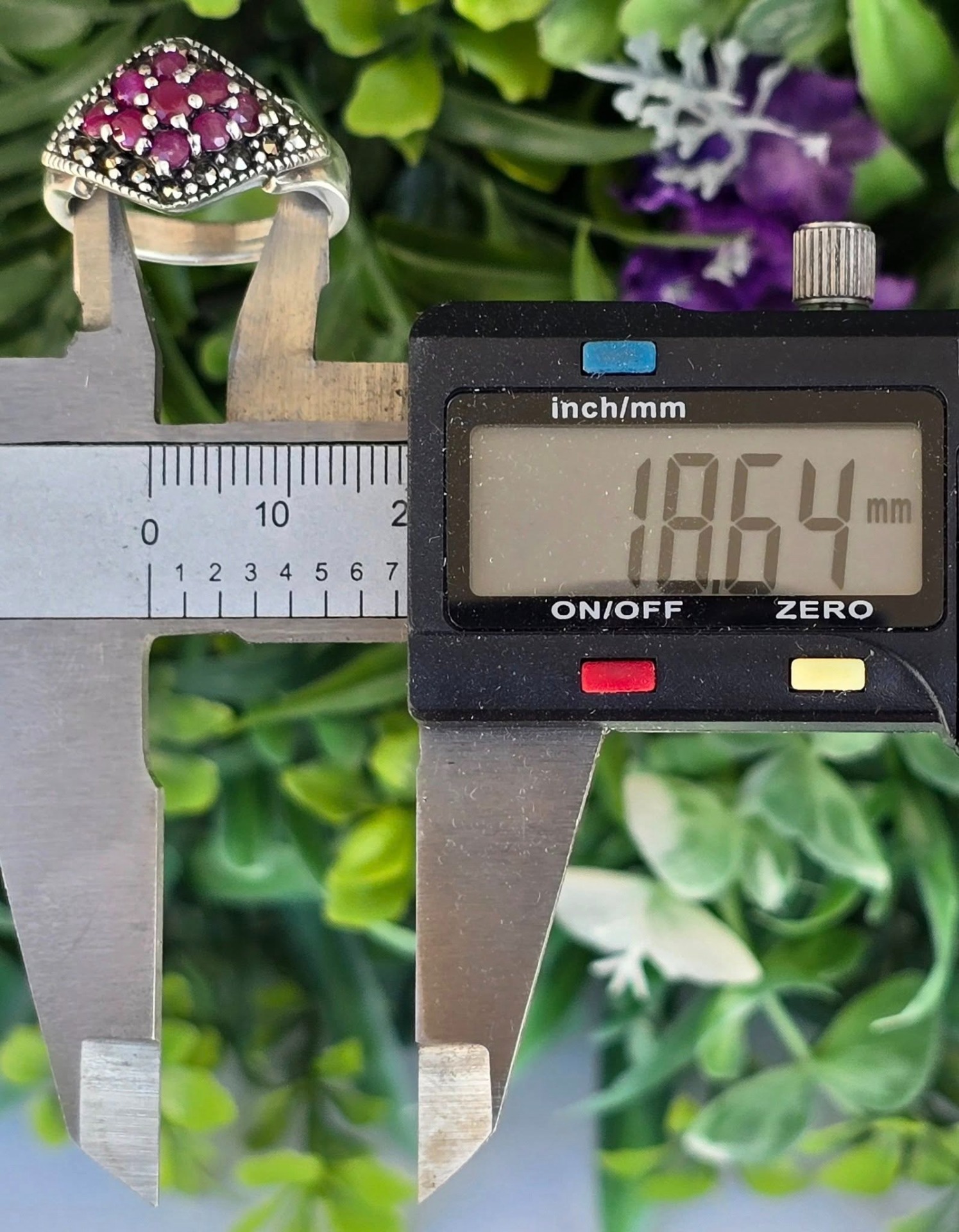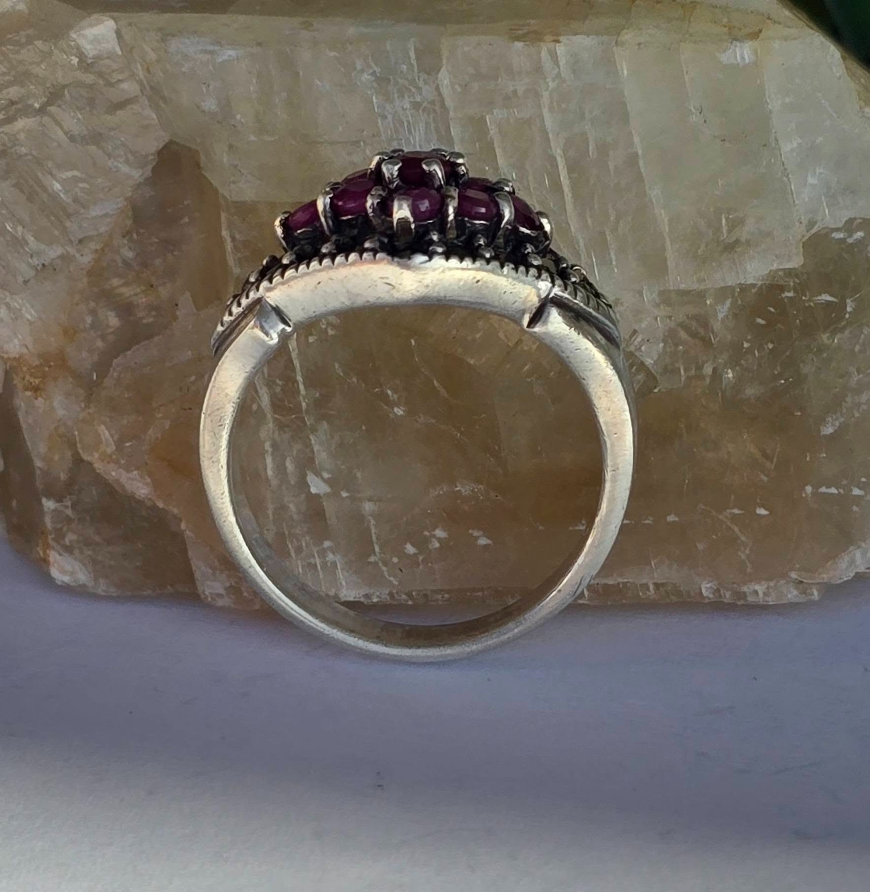 Inel vechi din argint, cu 9 rubine naturale și marcasite.