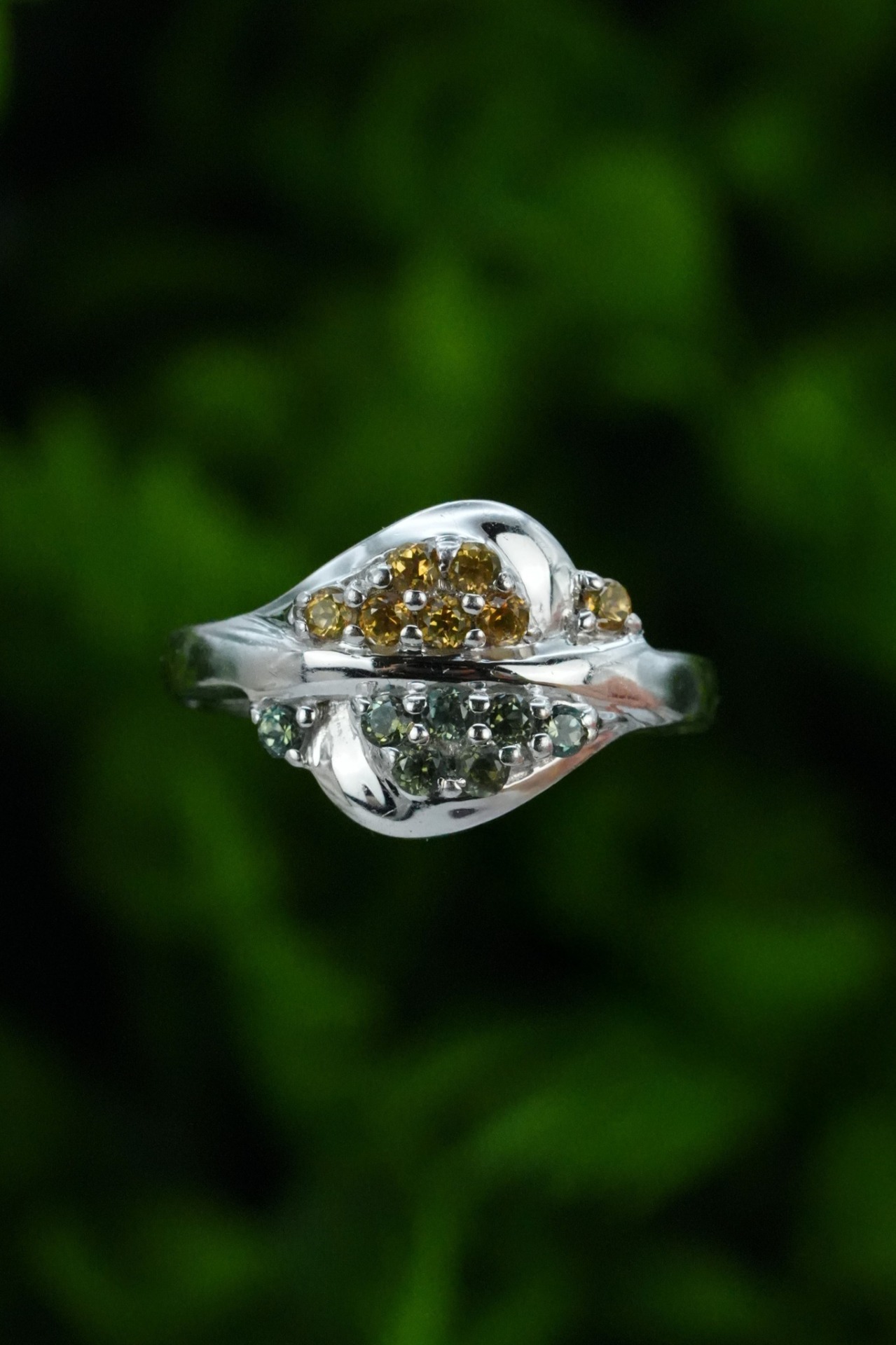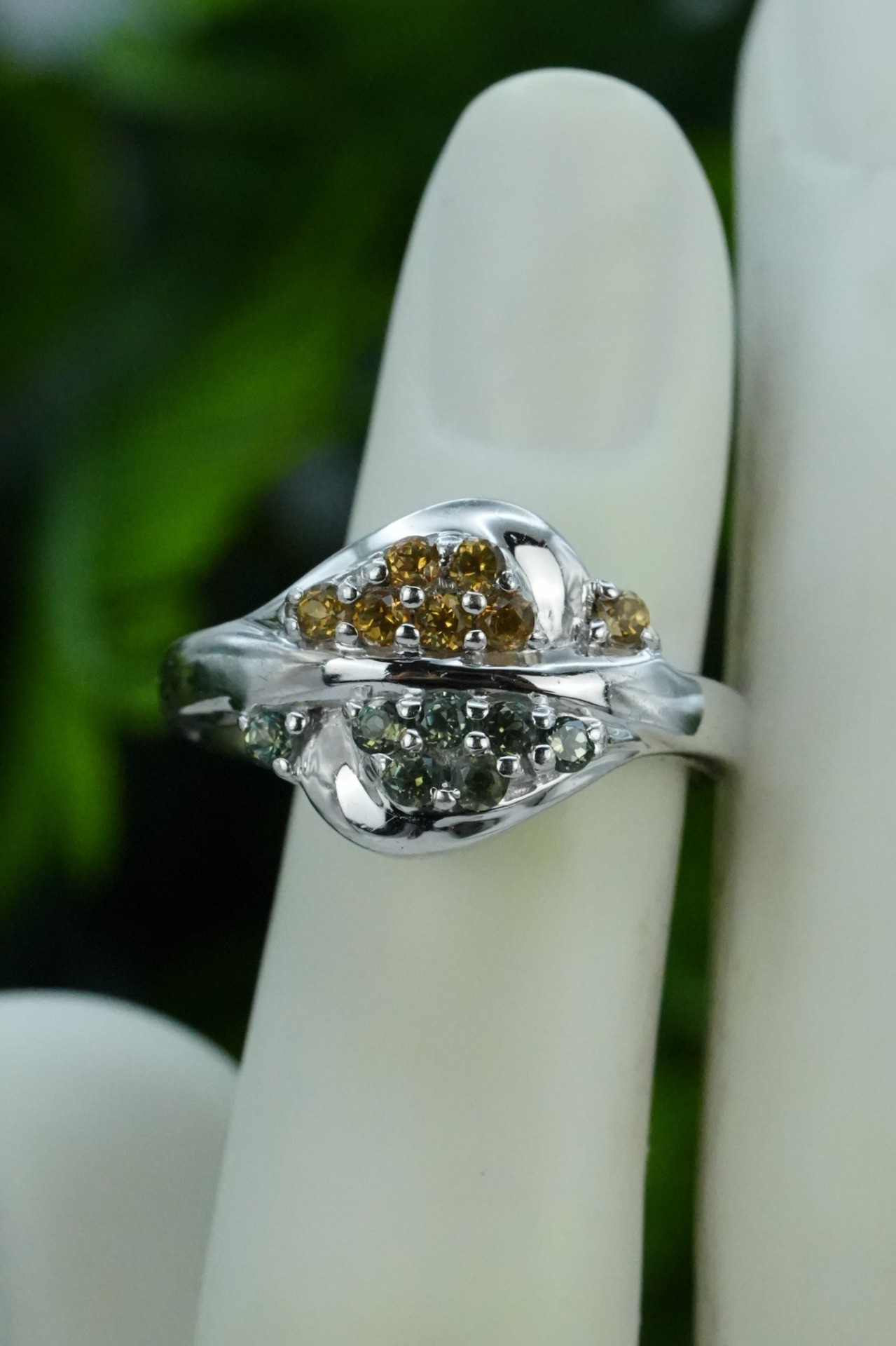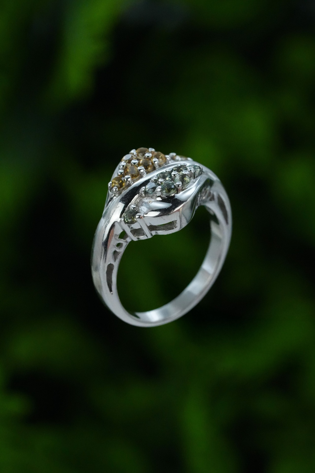 Inel vechi din argint, cu citrin și peridot naturale.