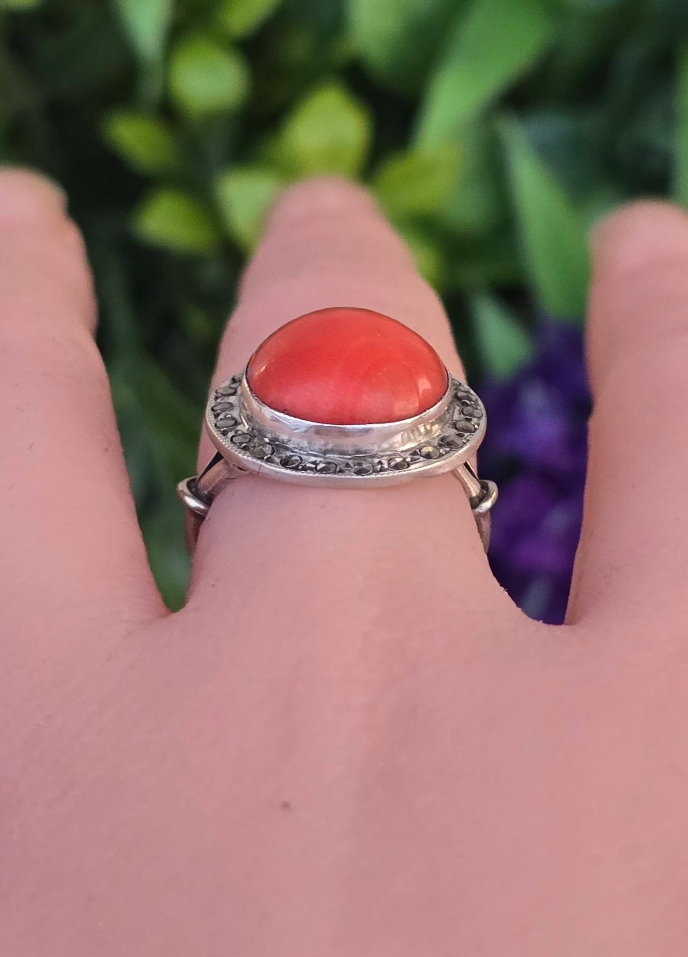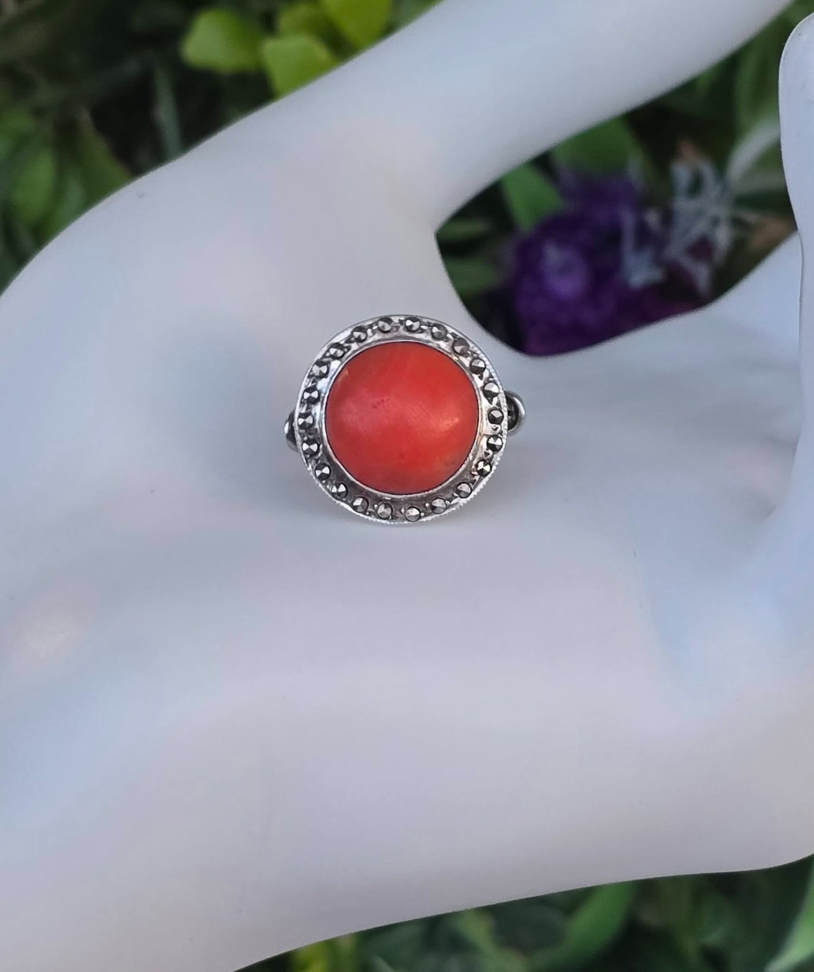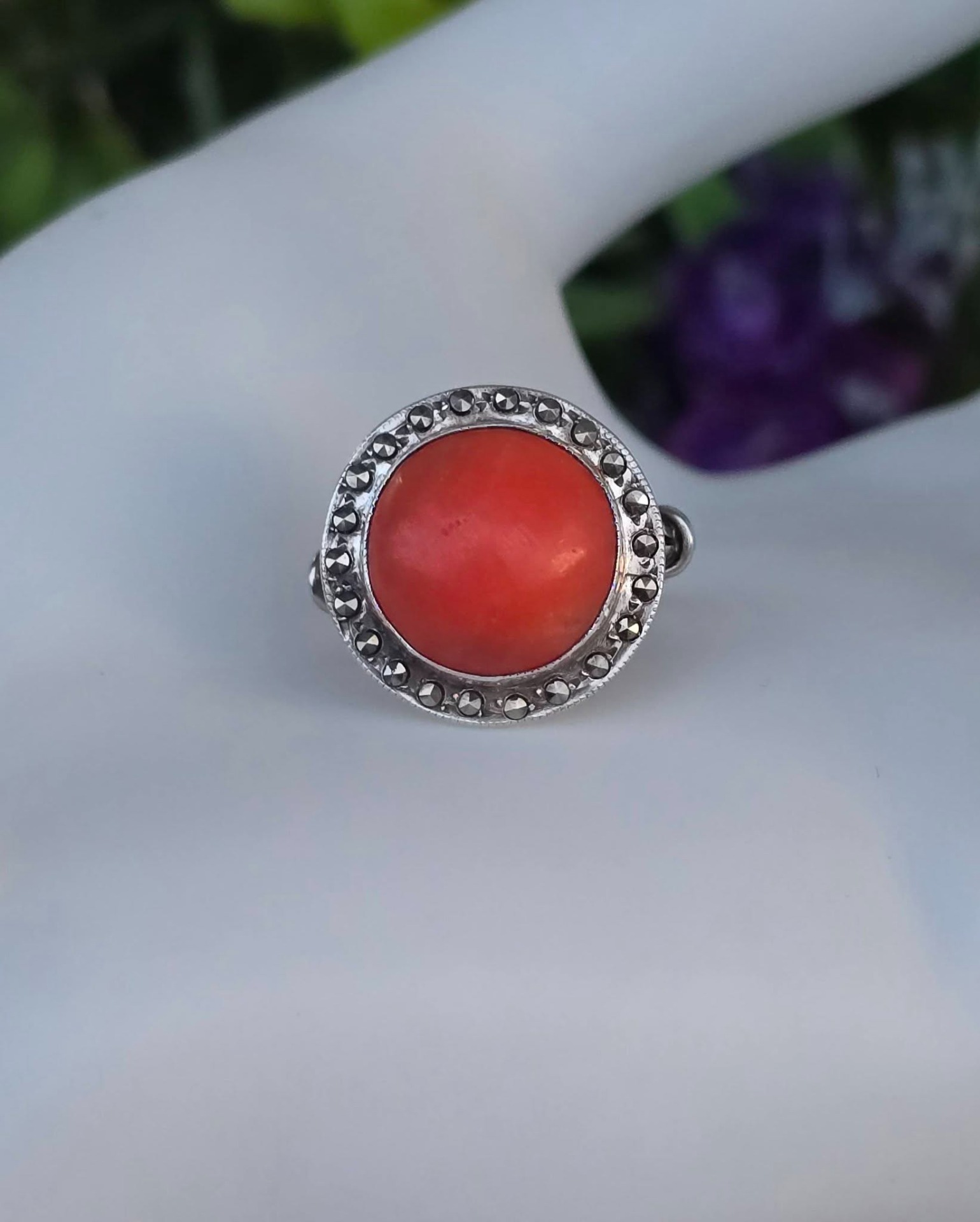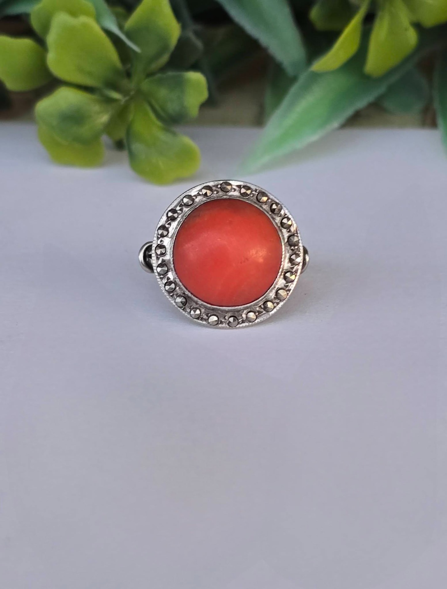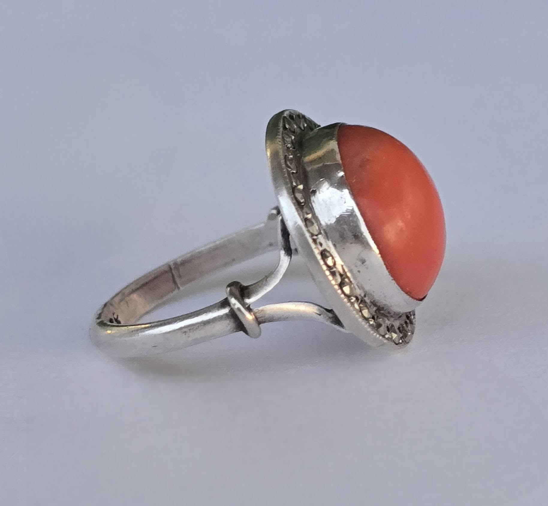 Inel vechi din argint, cu coral natural și marcasite.