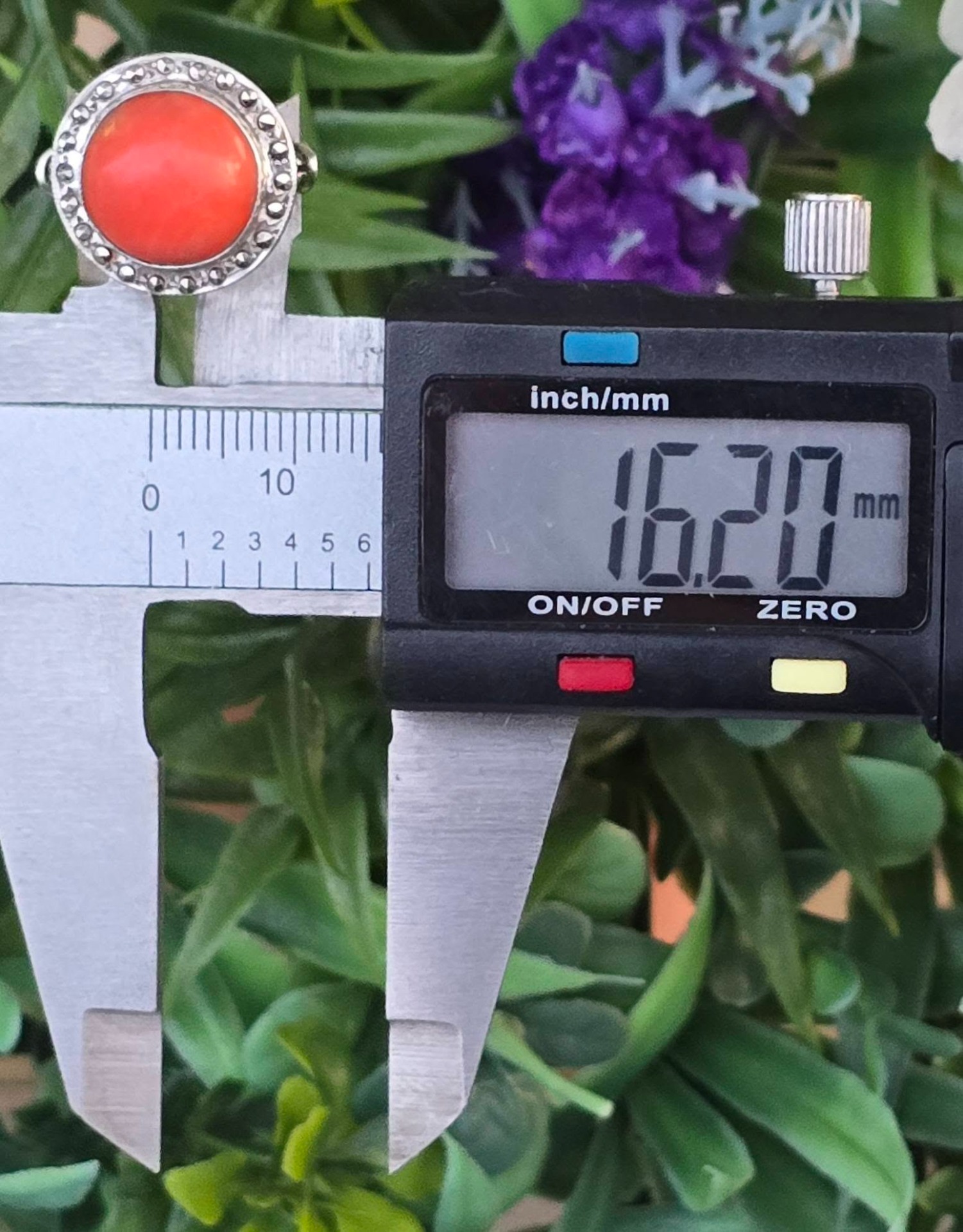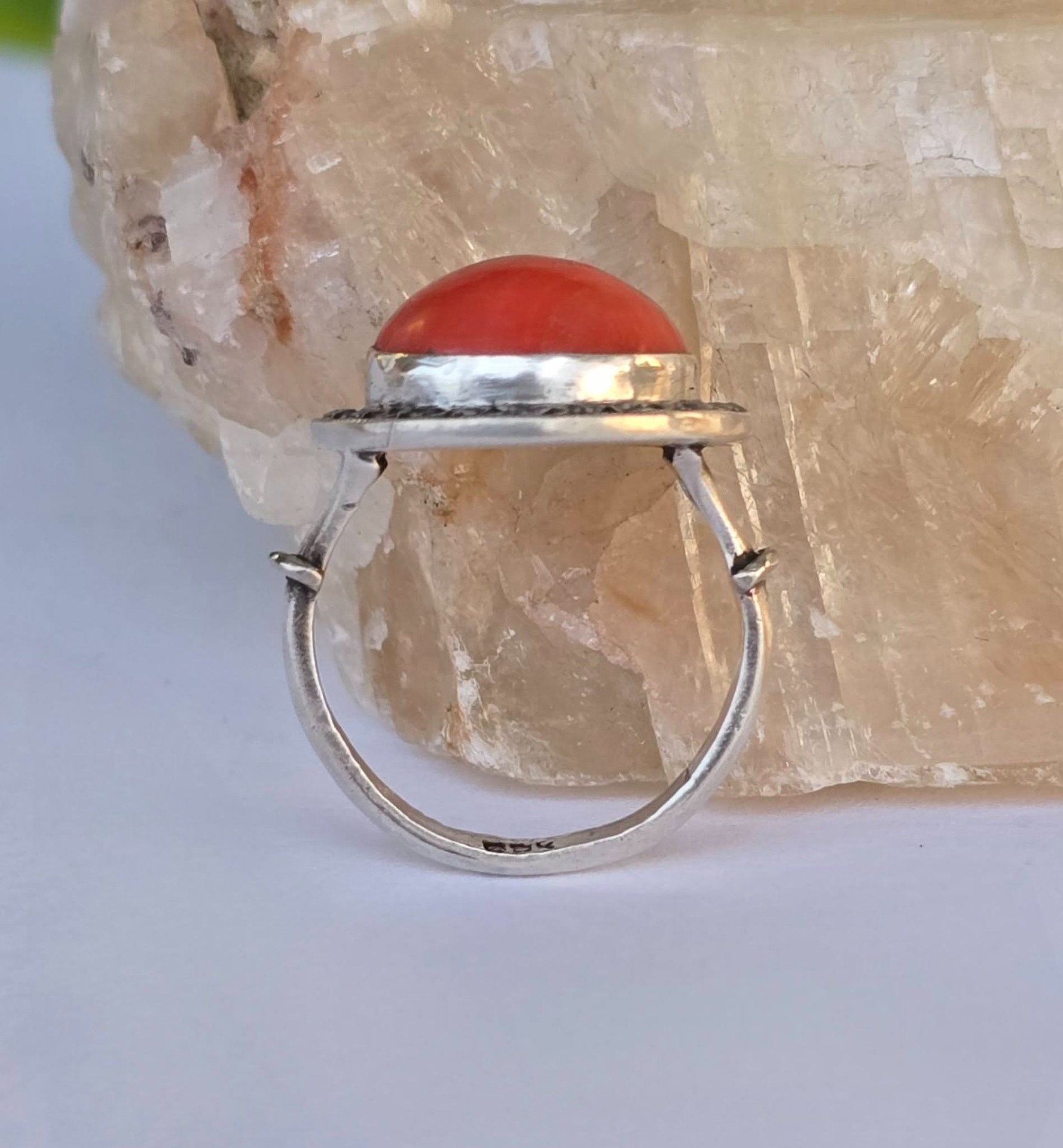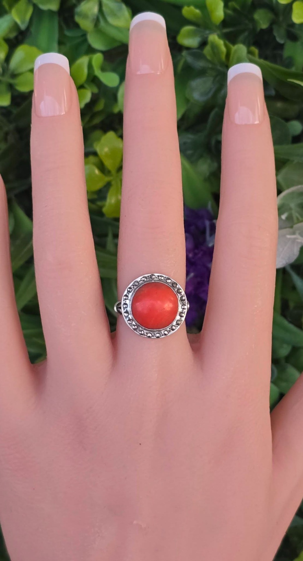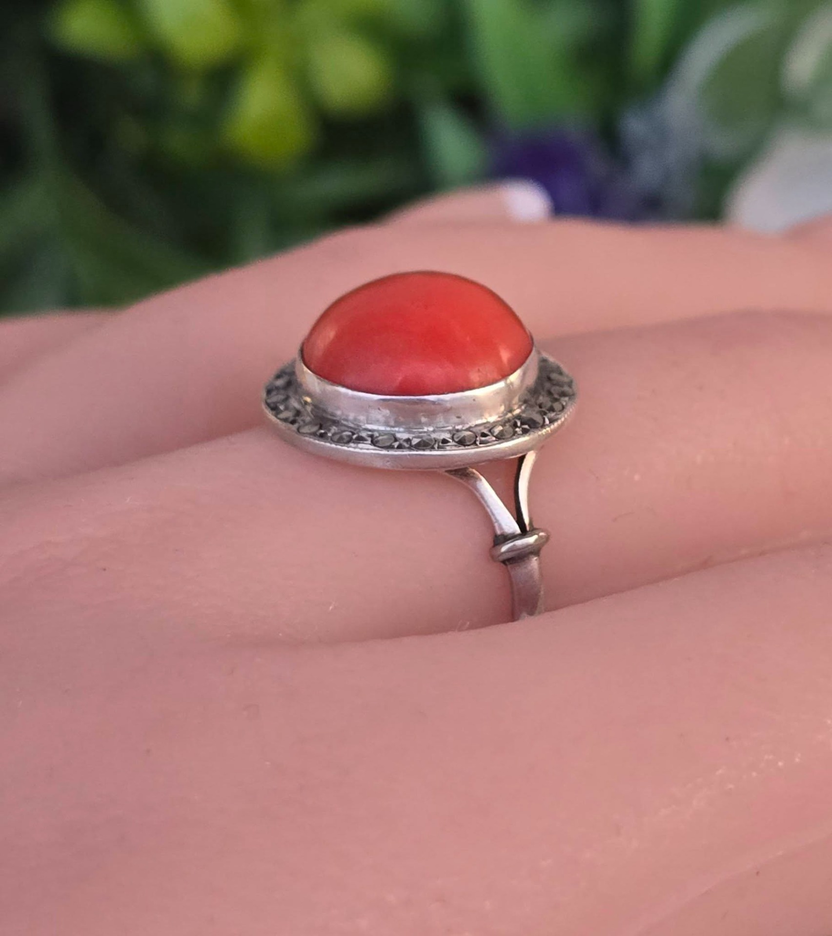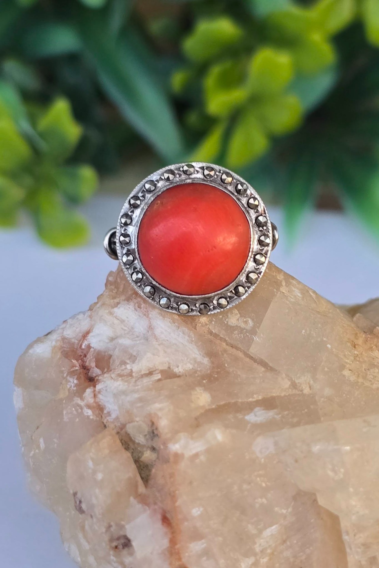 Inel vechi din argint, cu coral natural și marcasite.