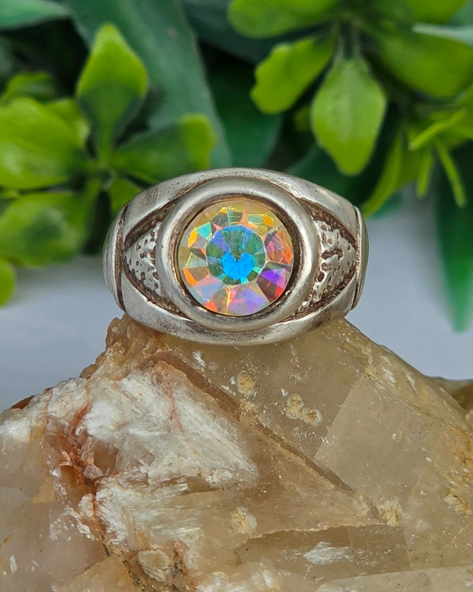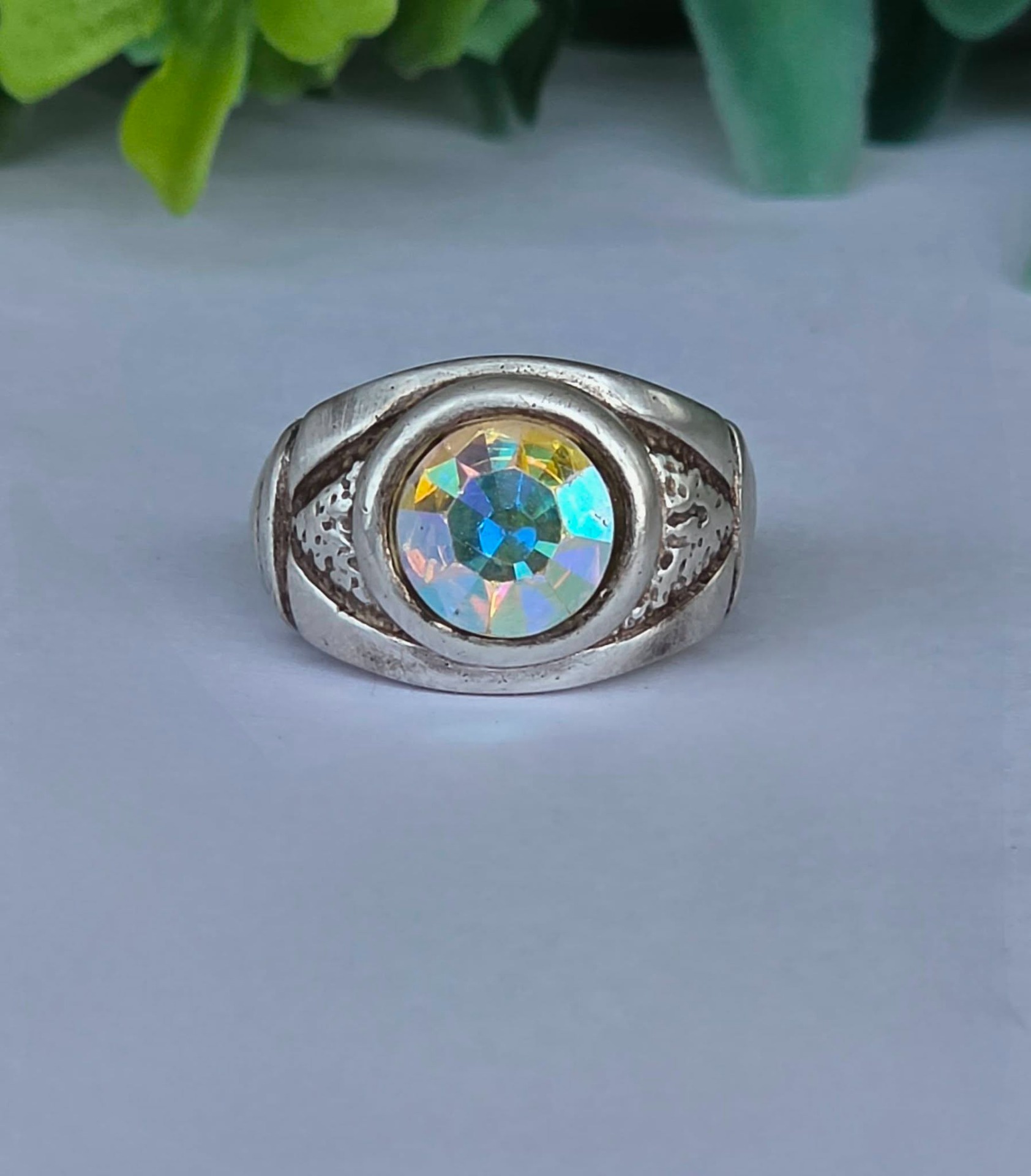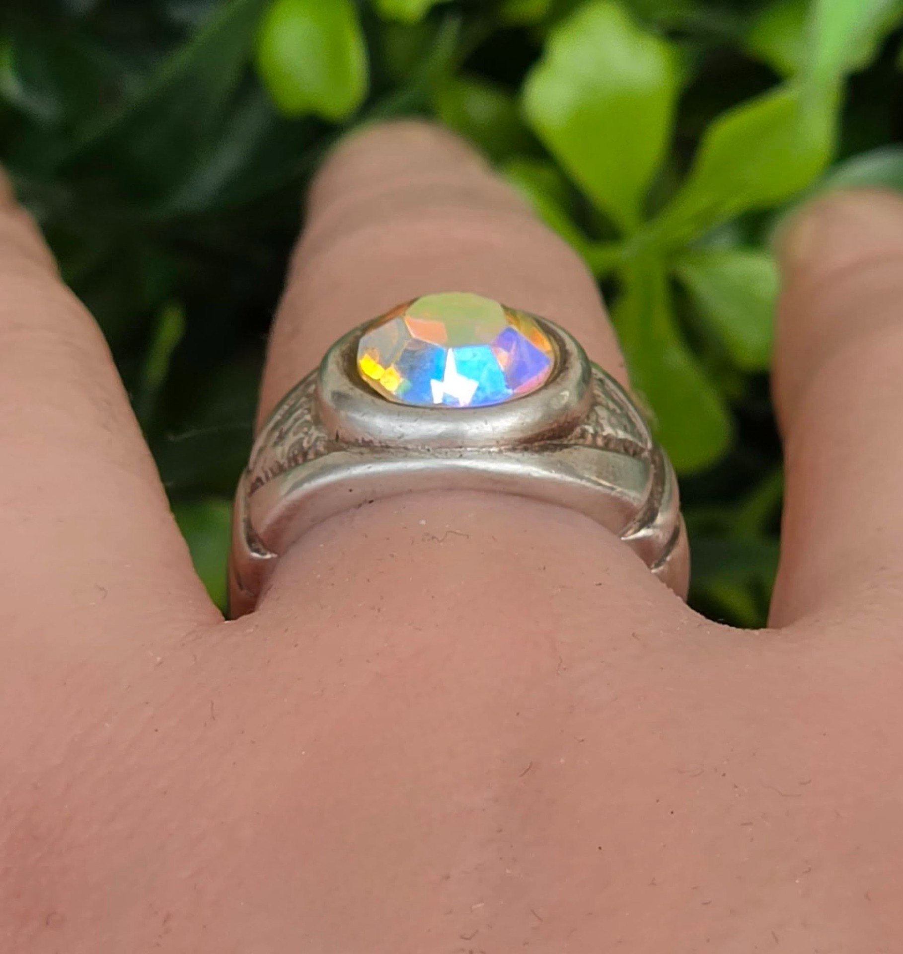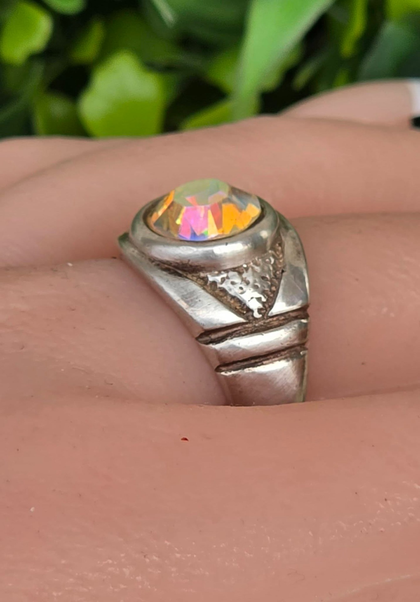 Inel vechi din argint, cu cristal Aurora Borealis.