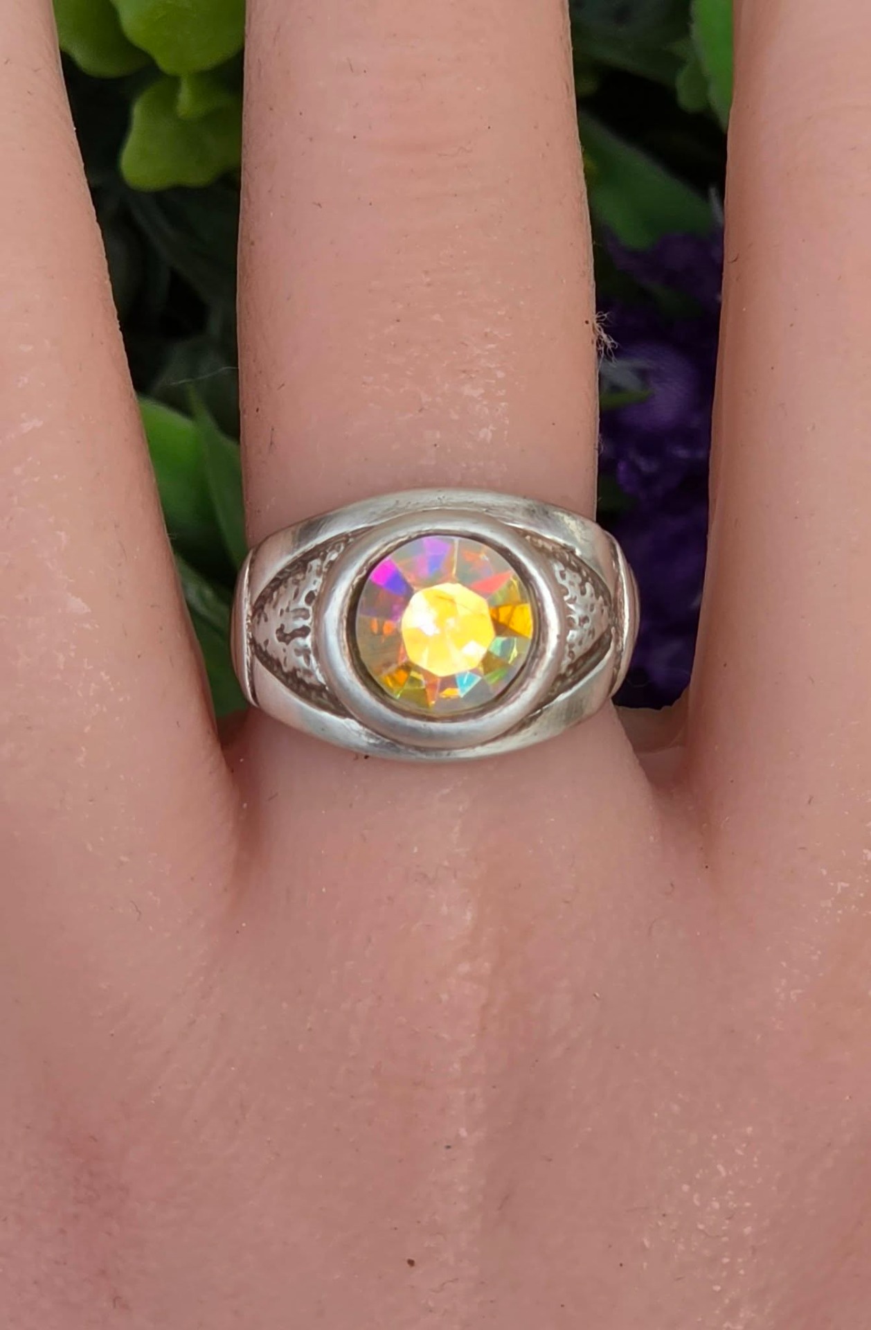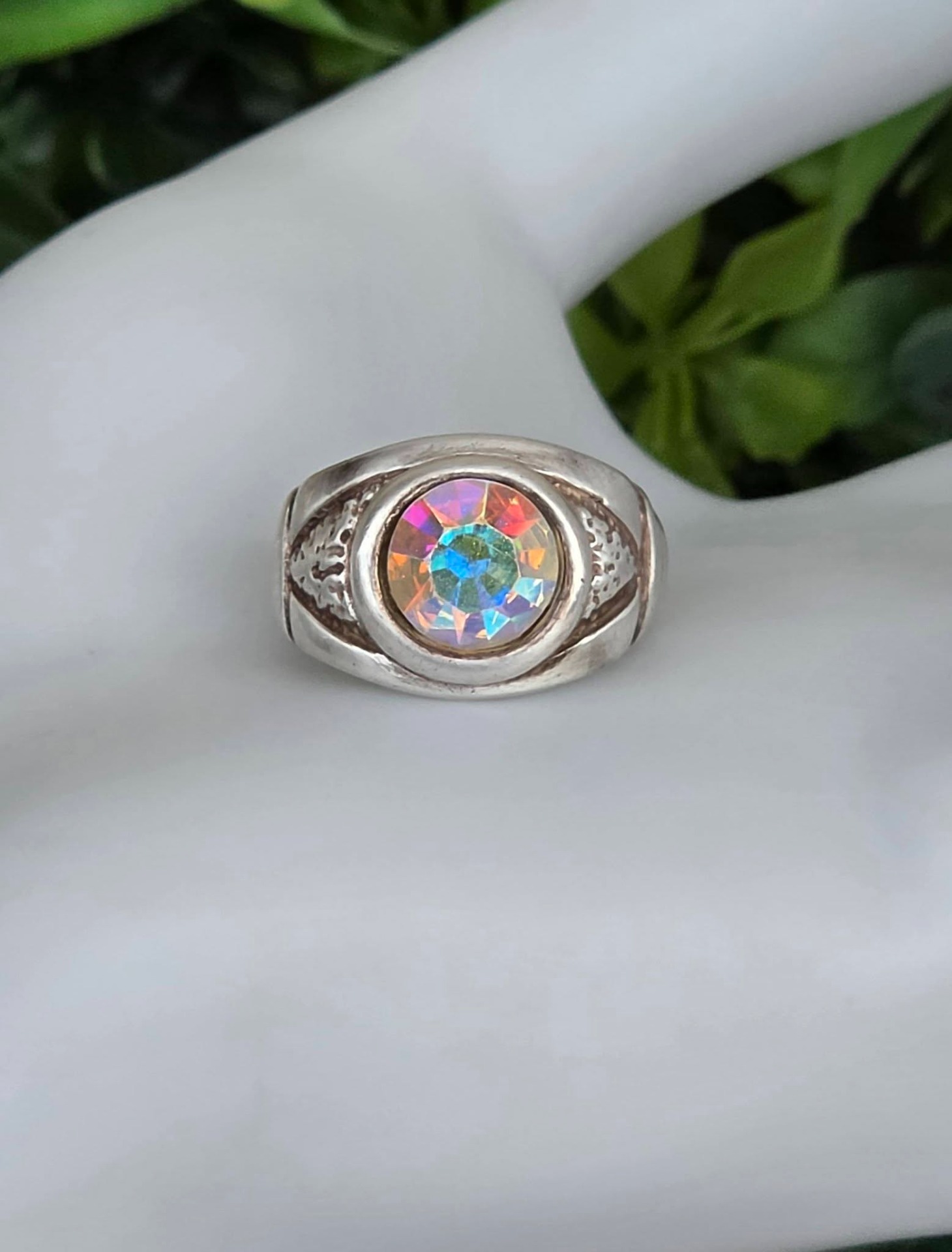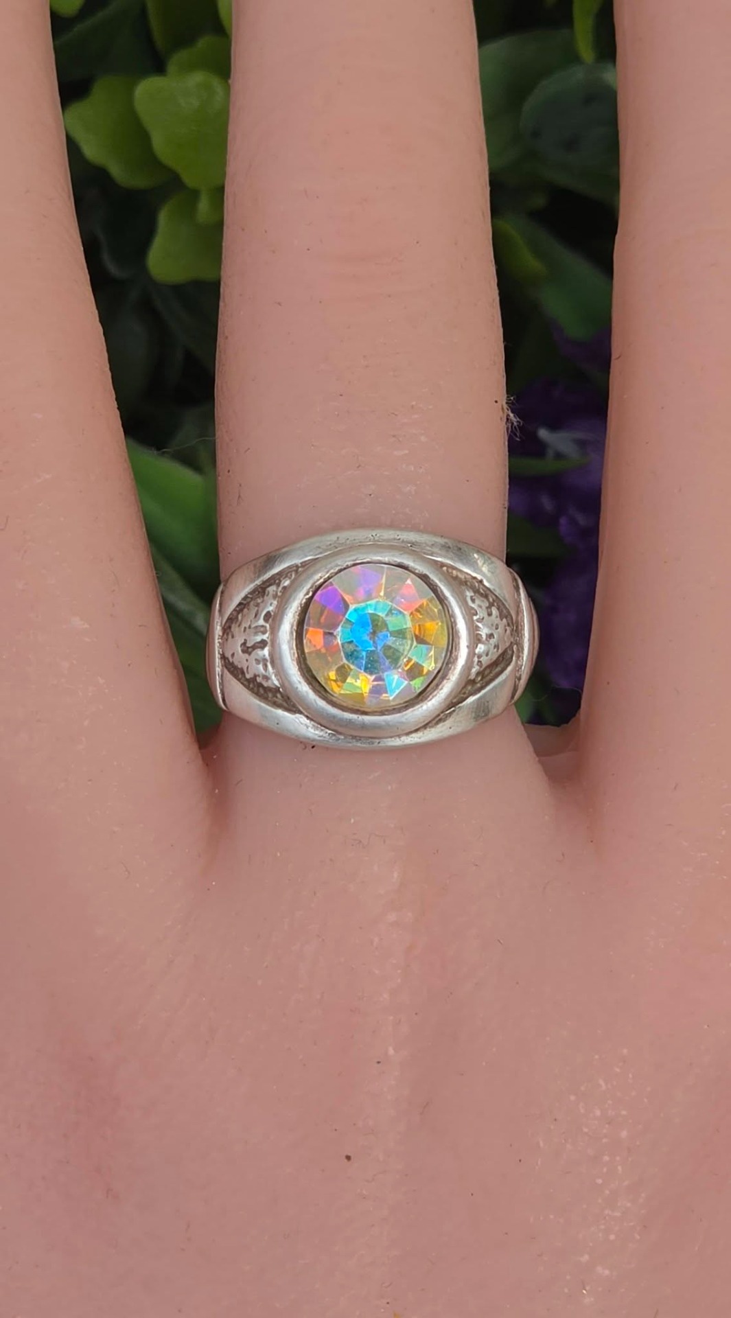 Inel vechi din argint, cu cristal Aurora Borealis.