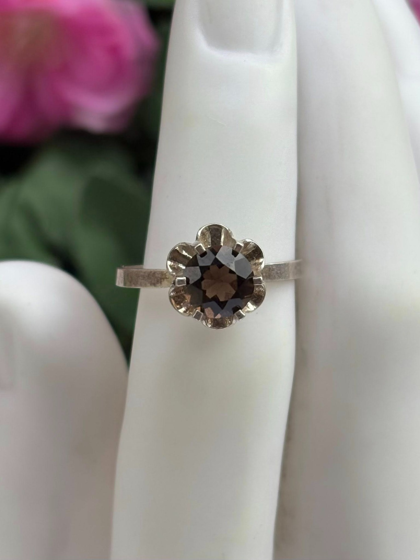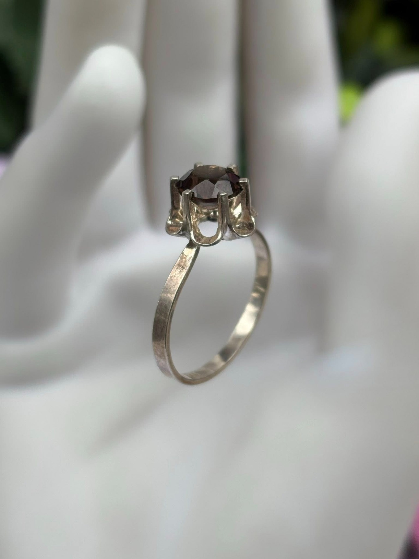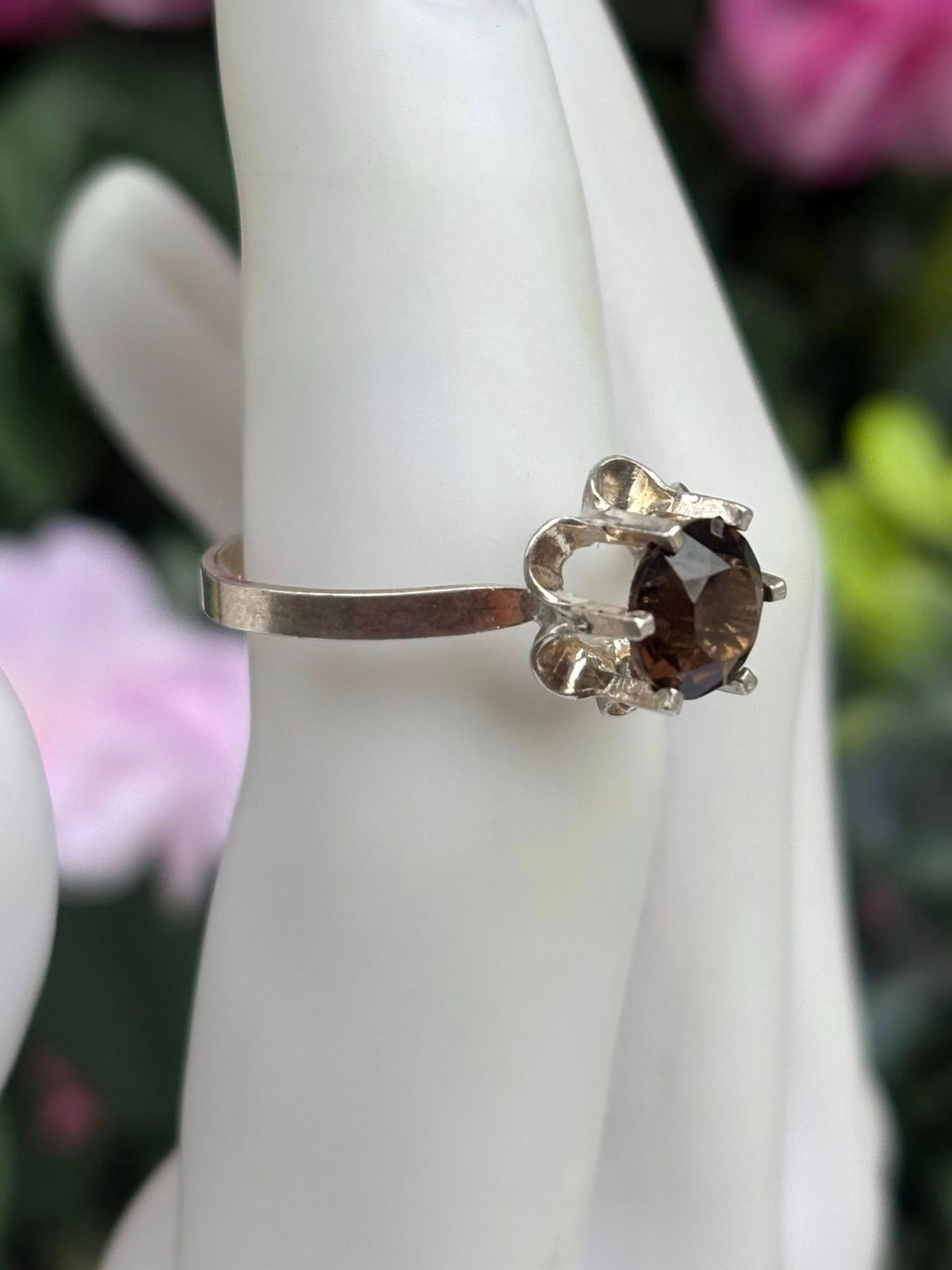 Inel vechi din argint, cu cuarț fumuriu natural.