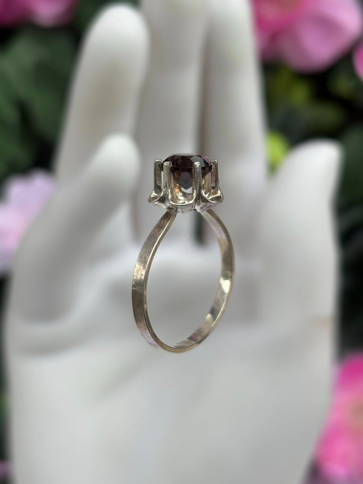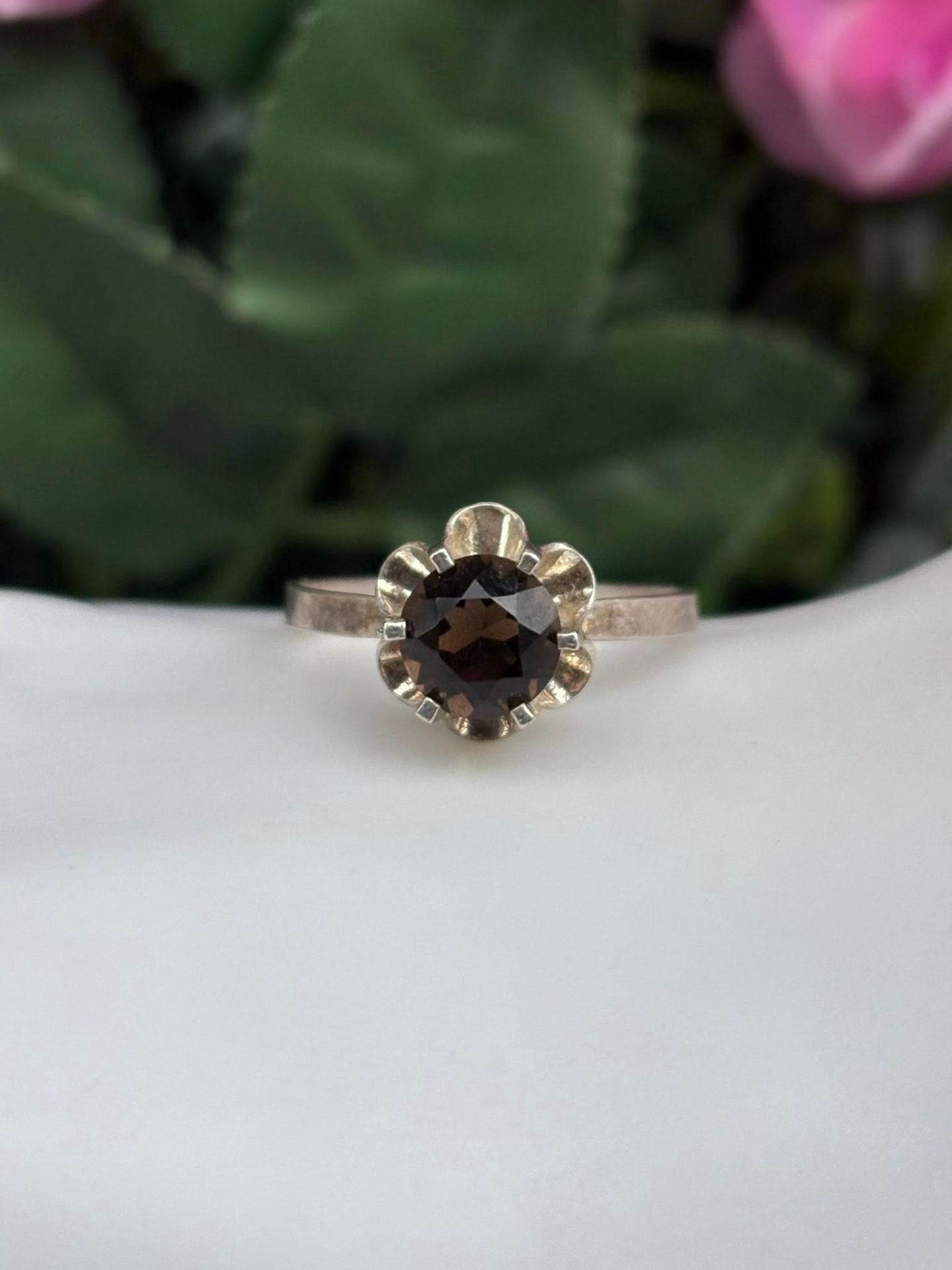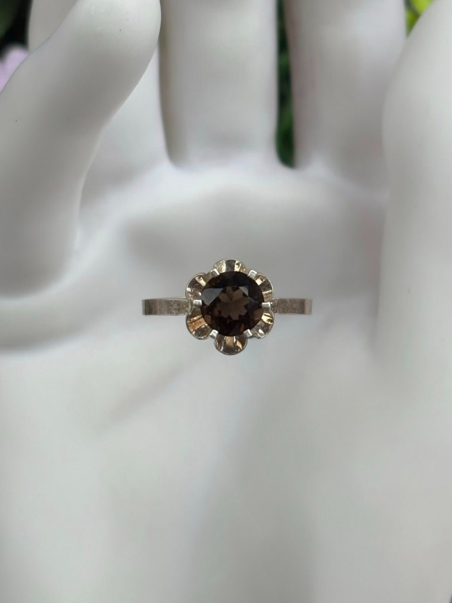 Inel vechi din argint, cu cuarț fumuriu natural.