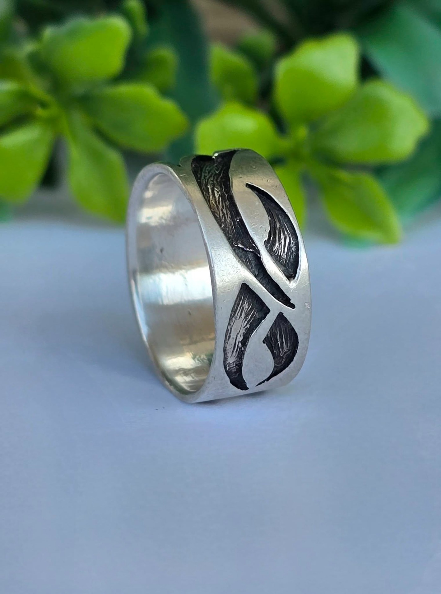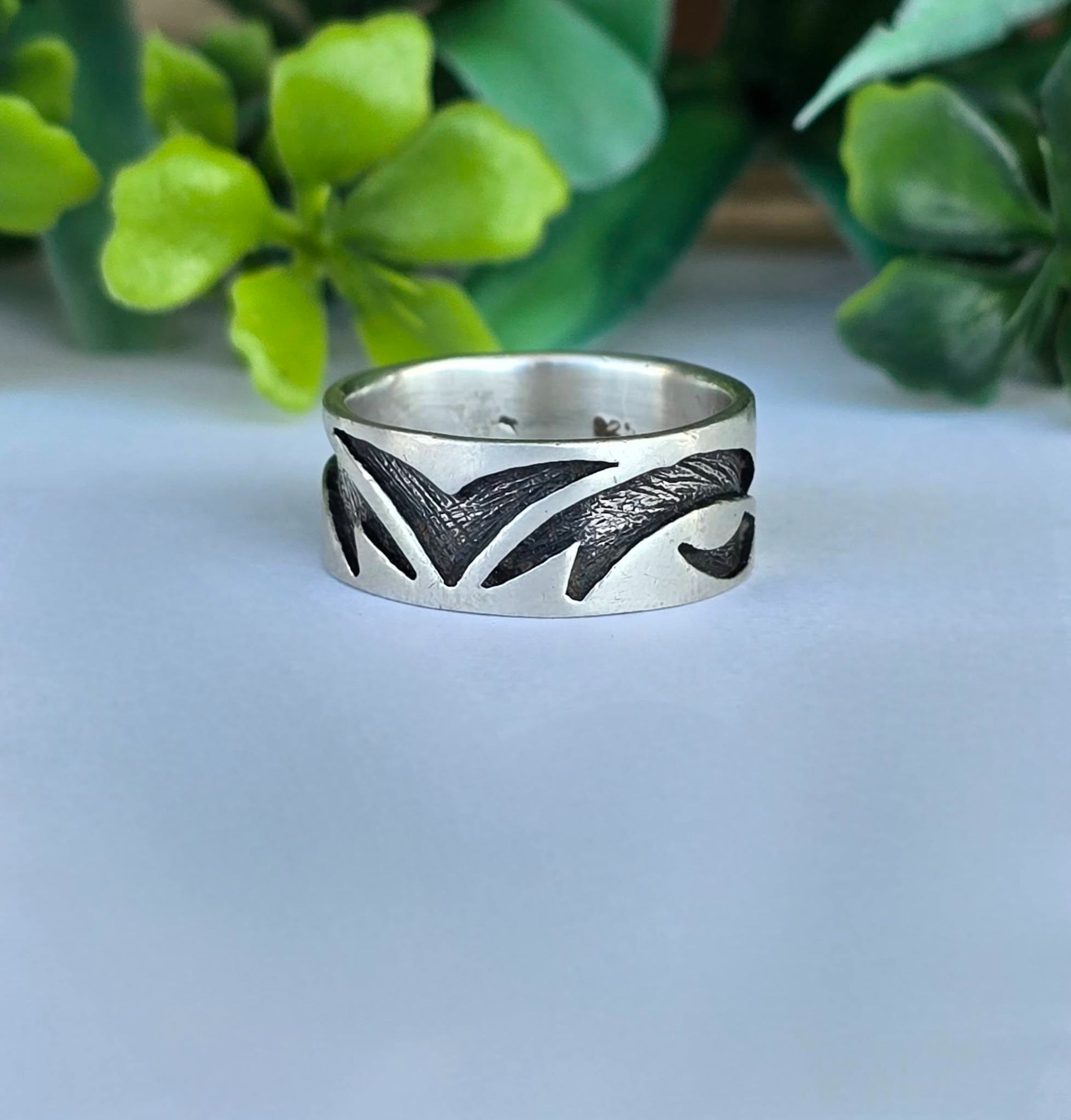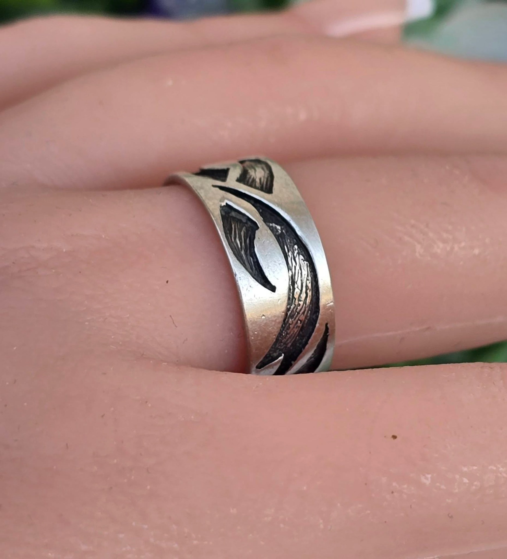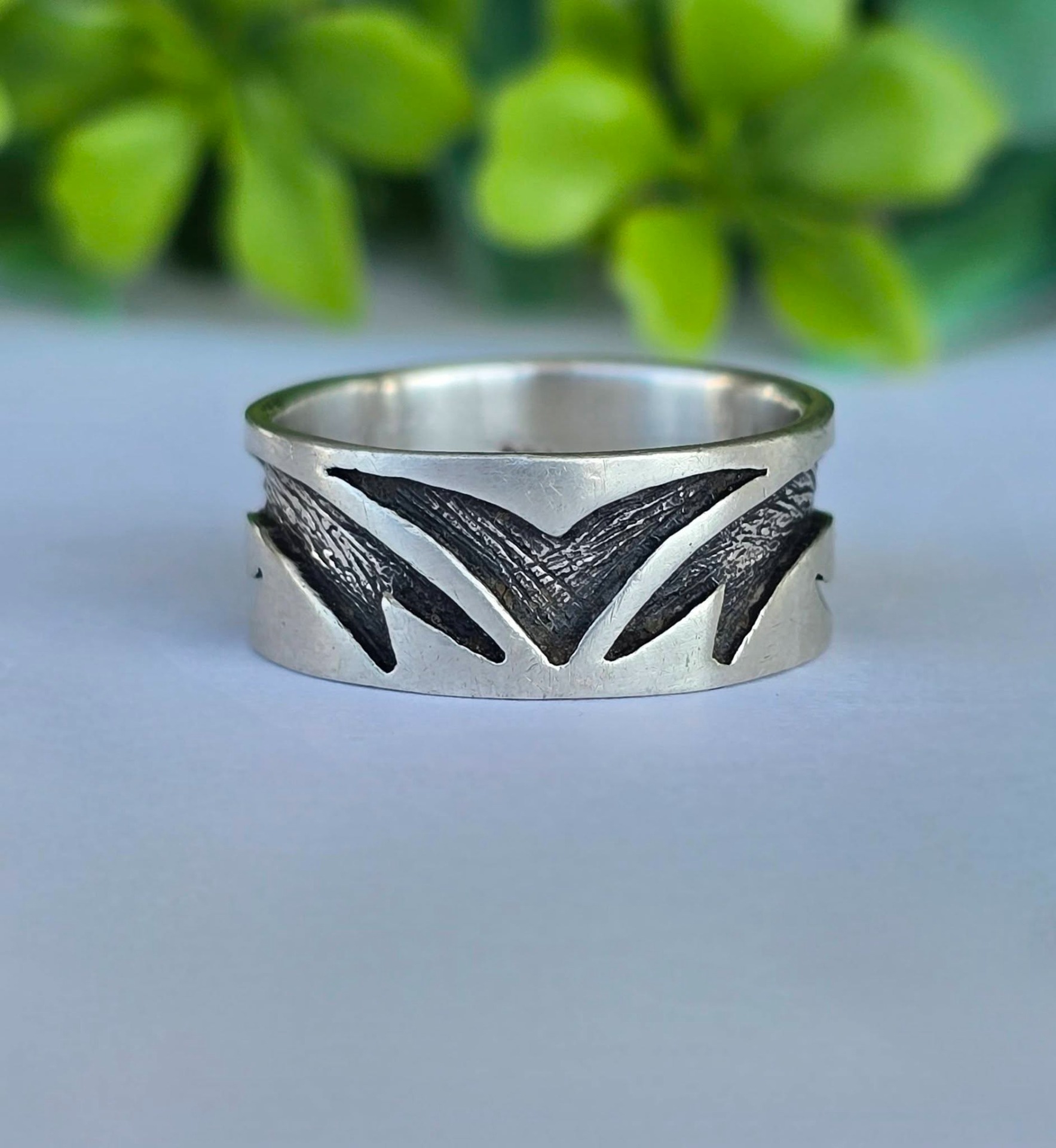Inel vechi din argint, cu design organic de inspirație tribală.