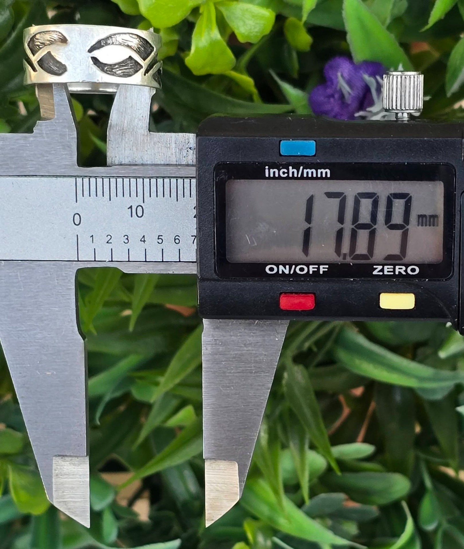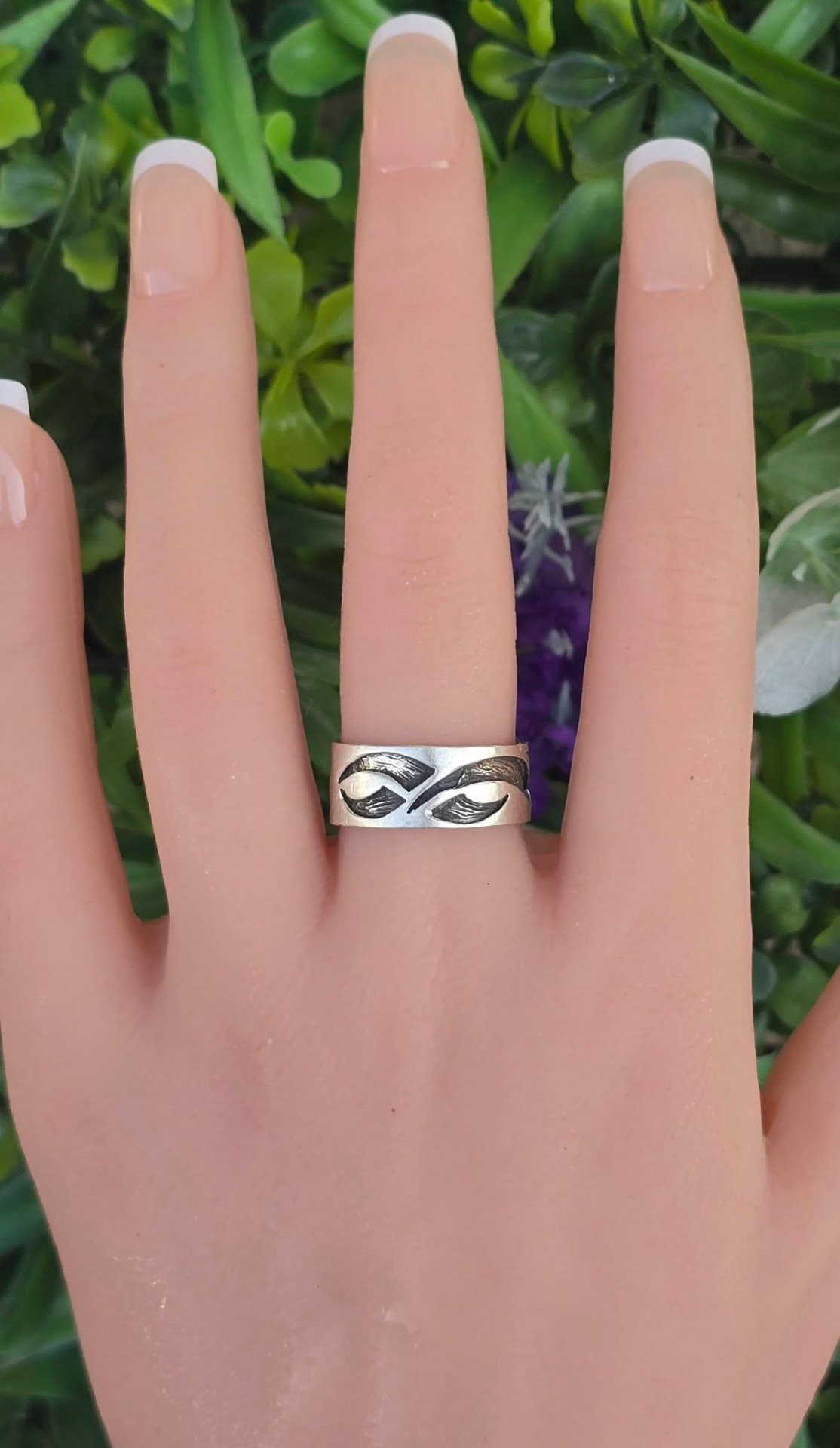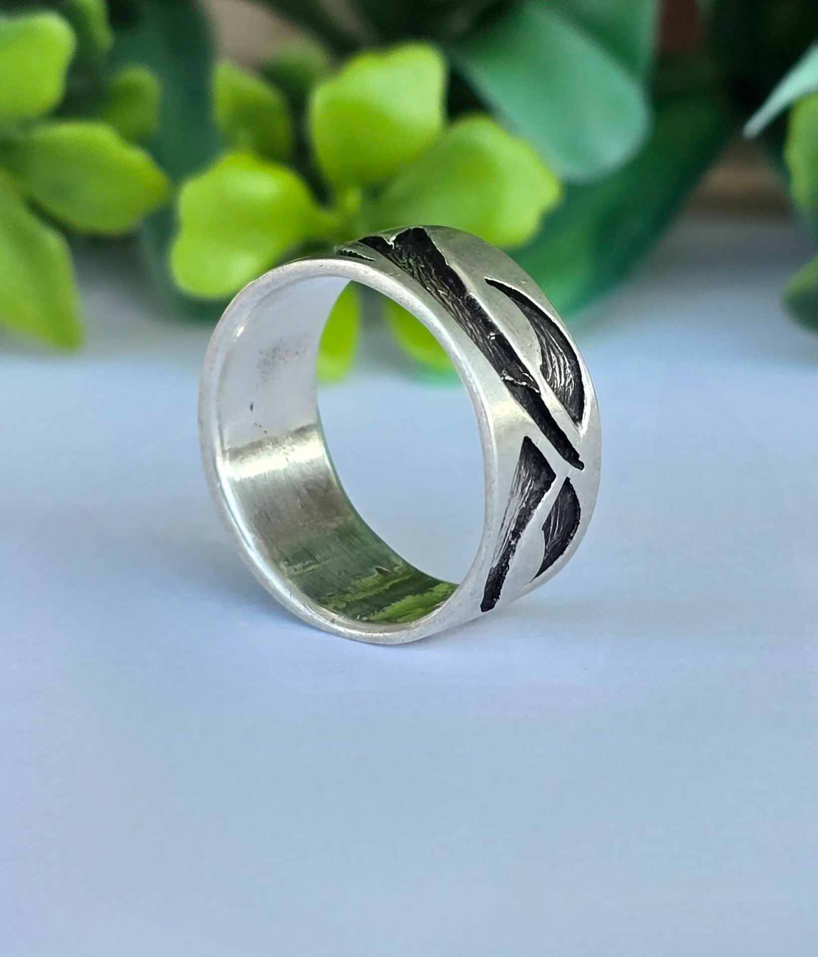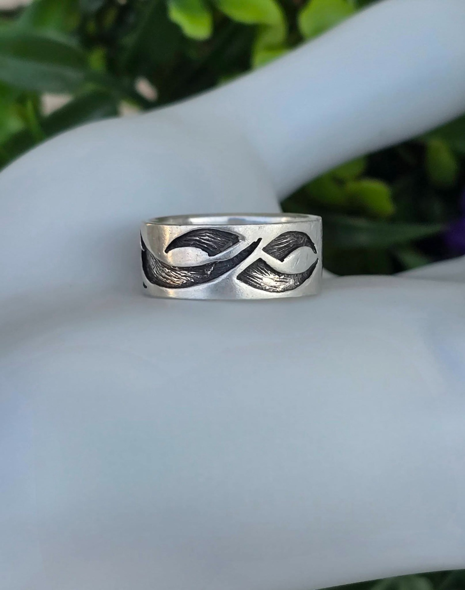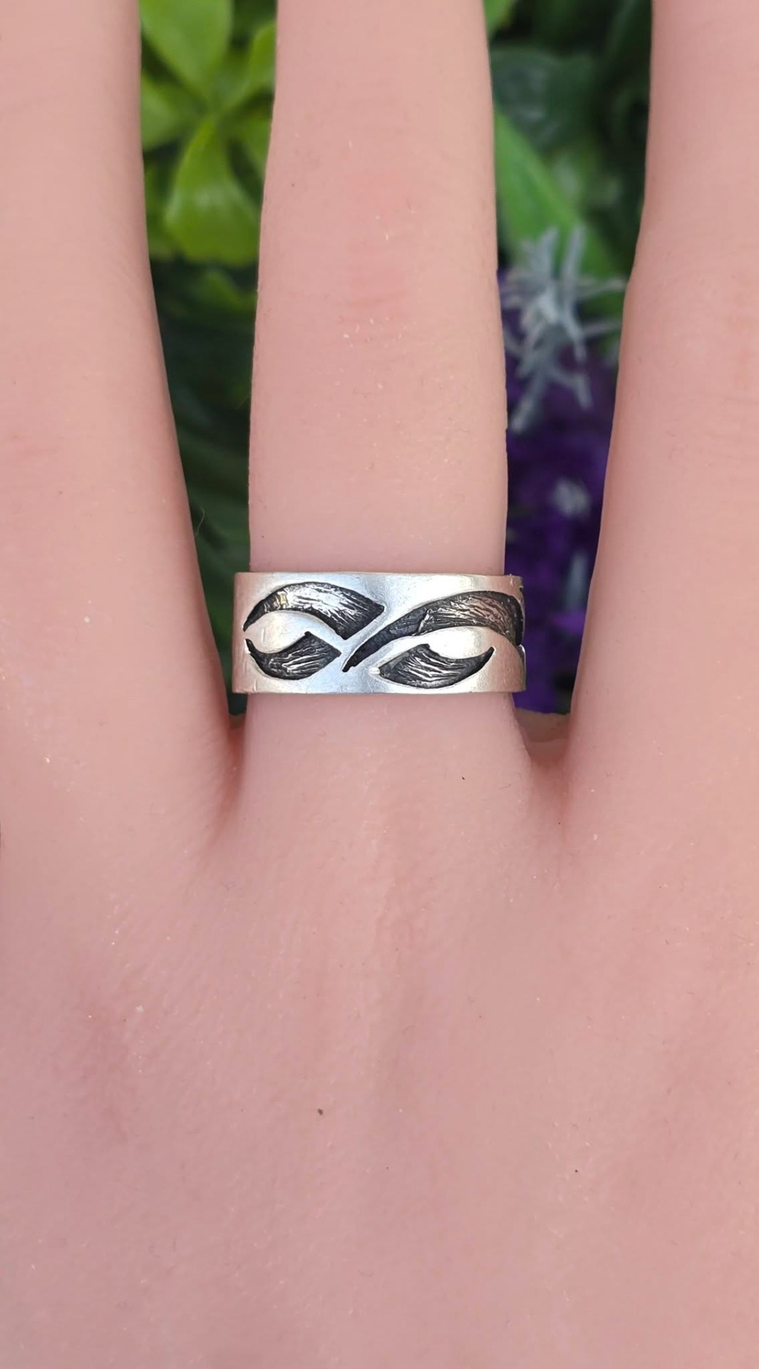 Inel vechi din argint, cu design organic de inspirație tribală.