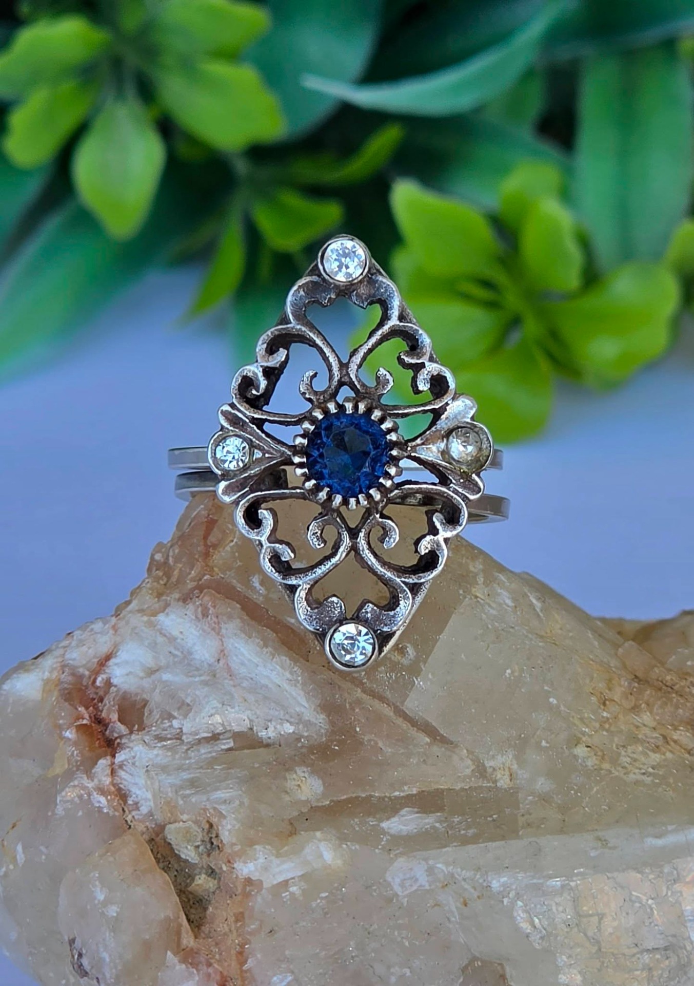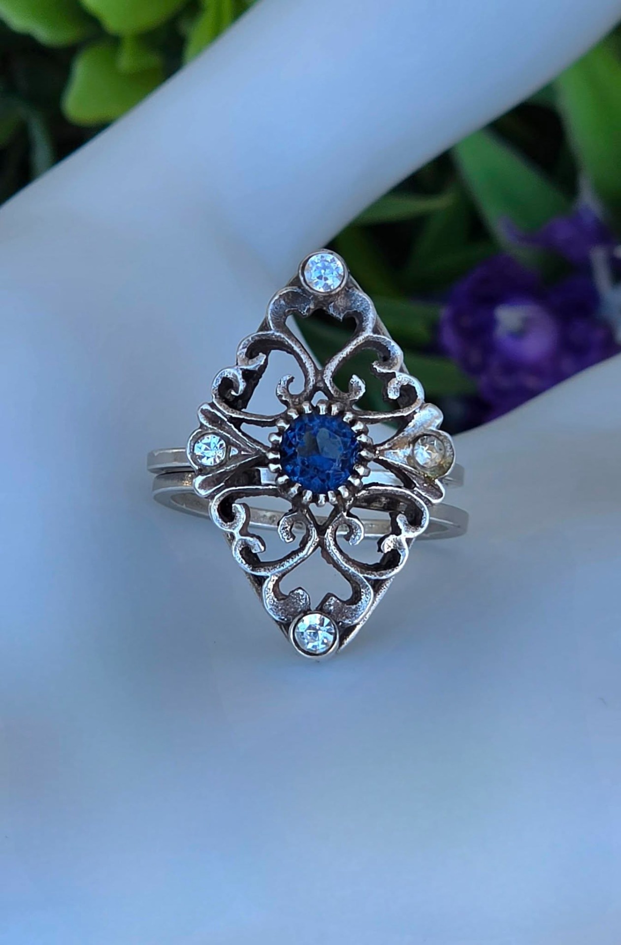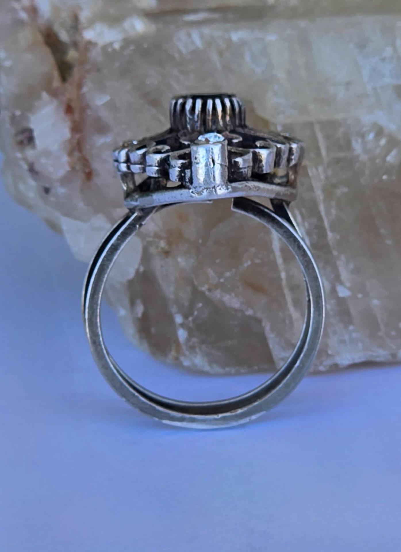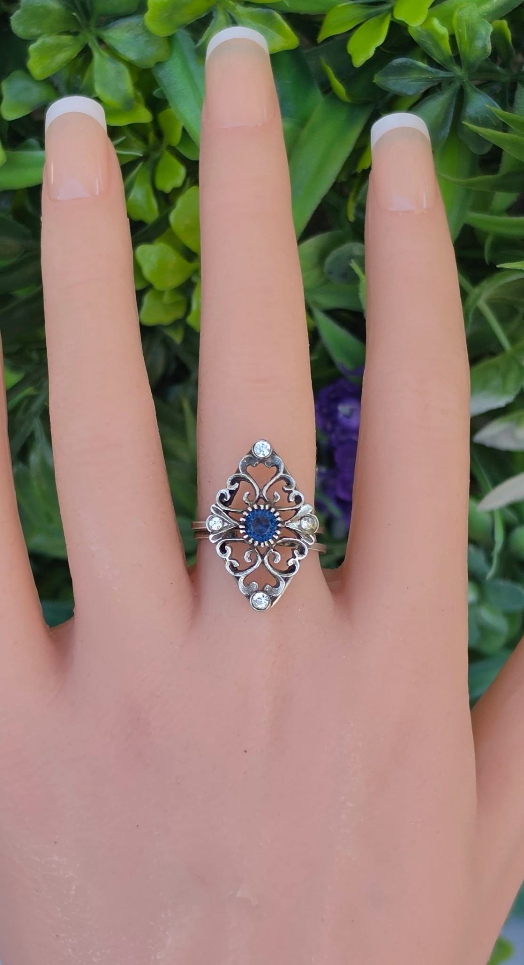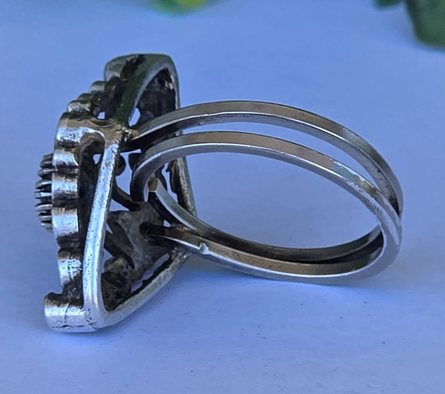 Inel vechi din argint, cu "glass paste" albastre și albe, manufactură deosebită în filigran.