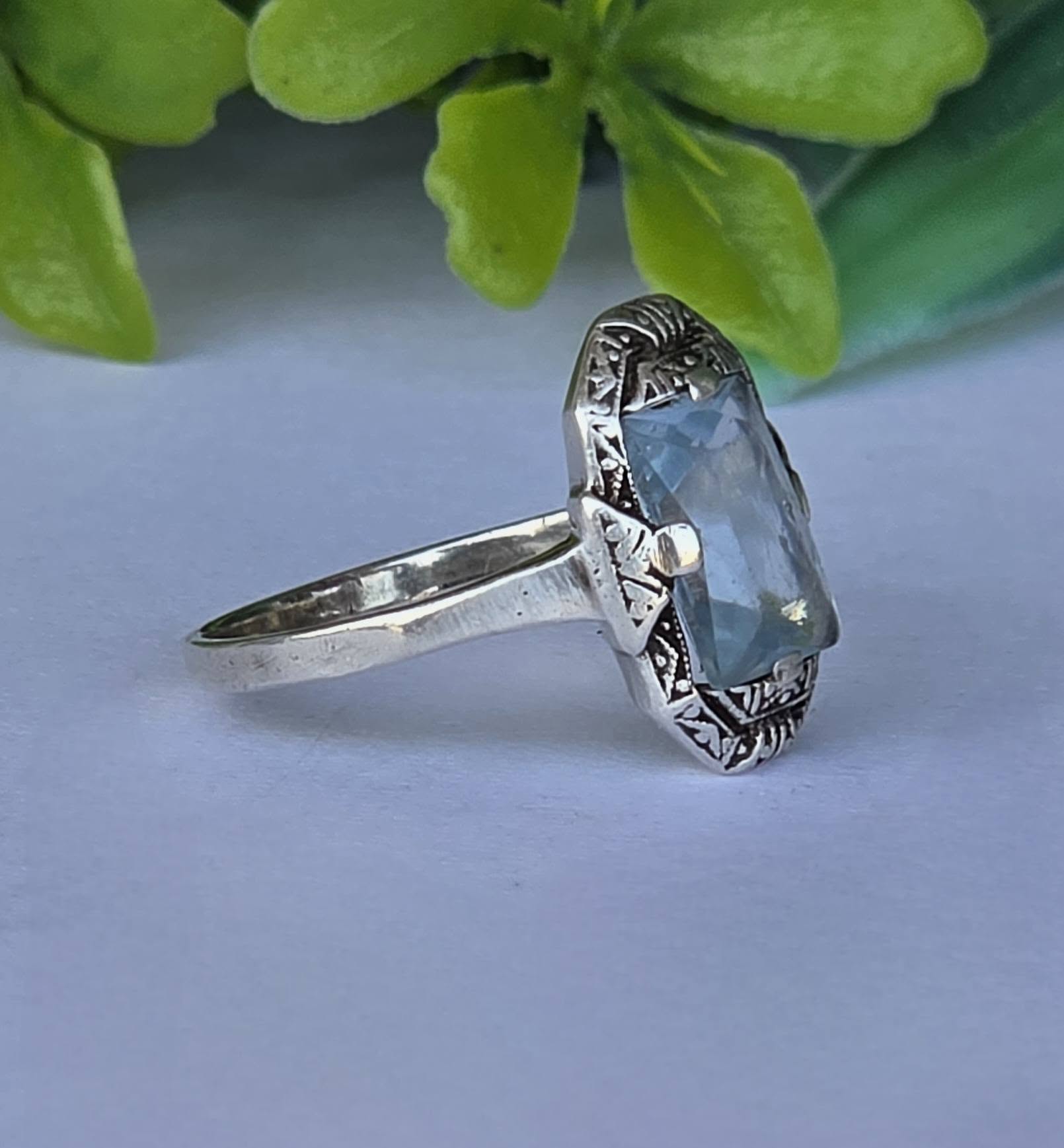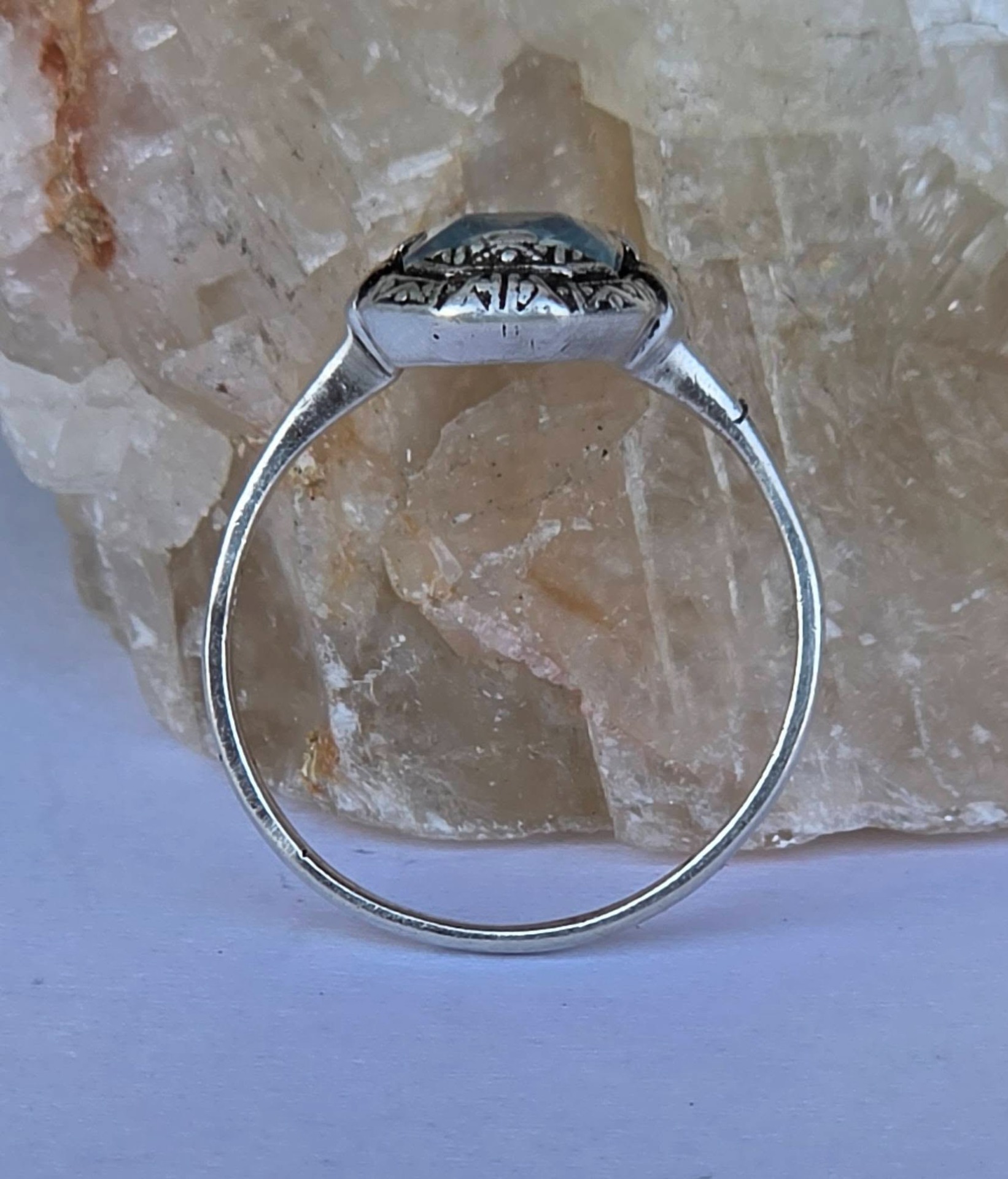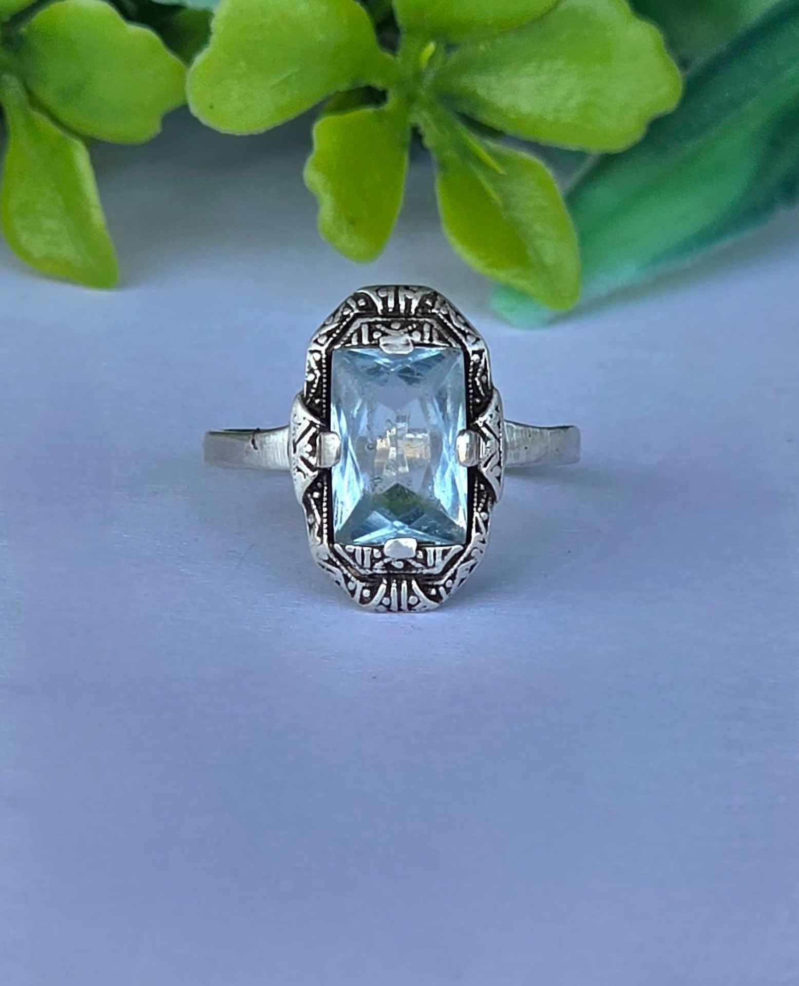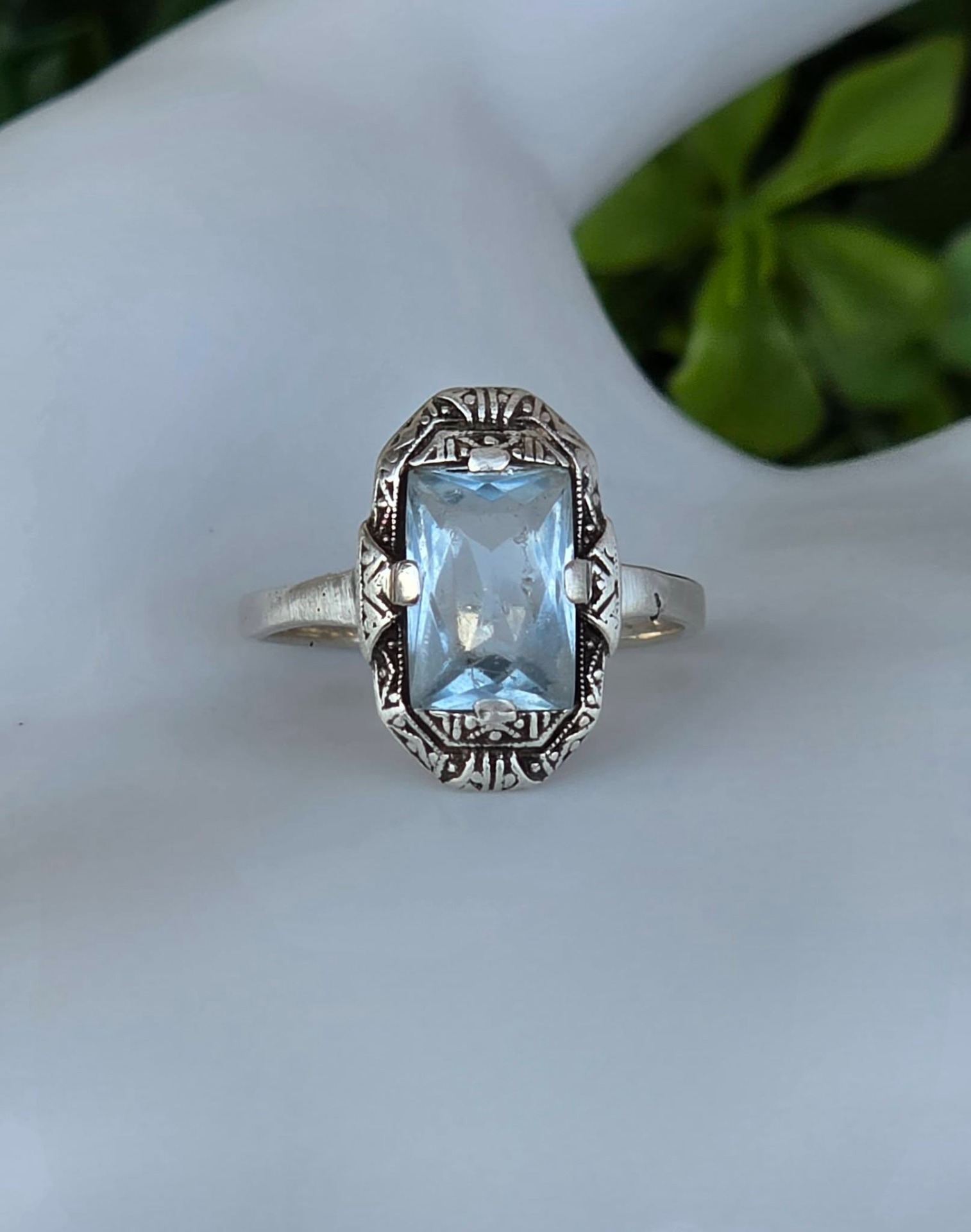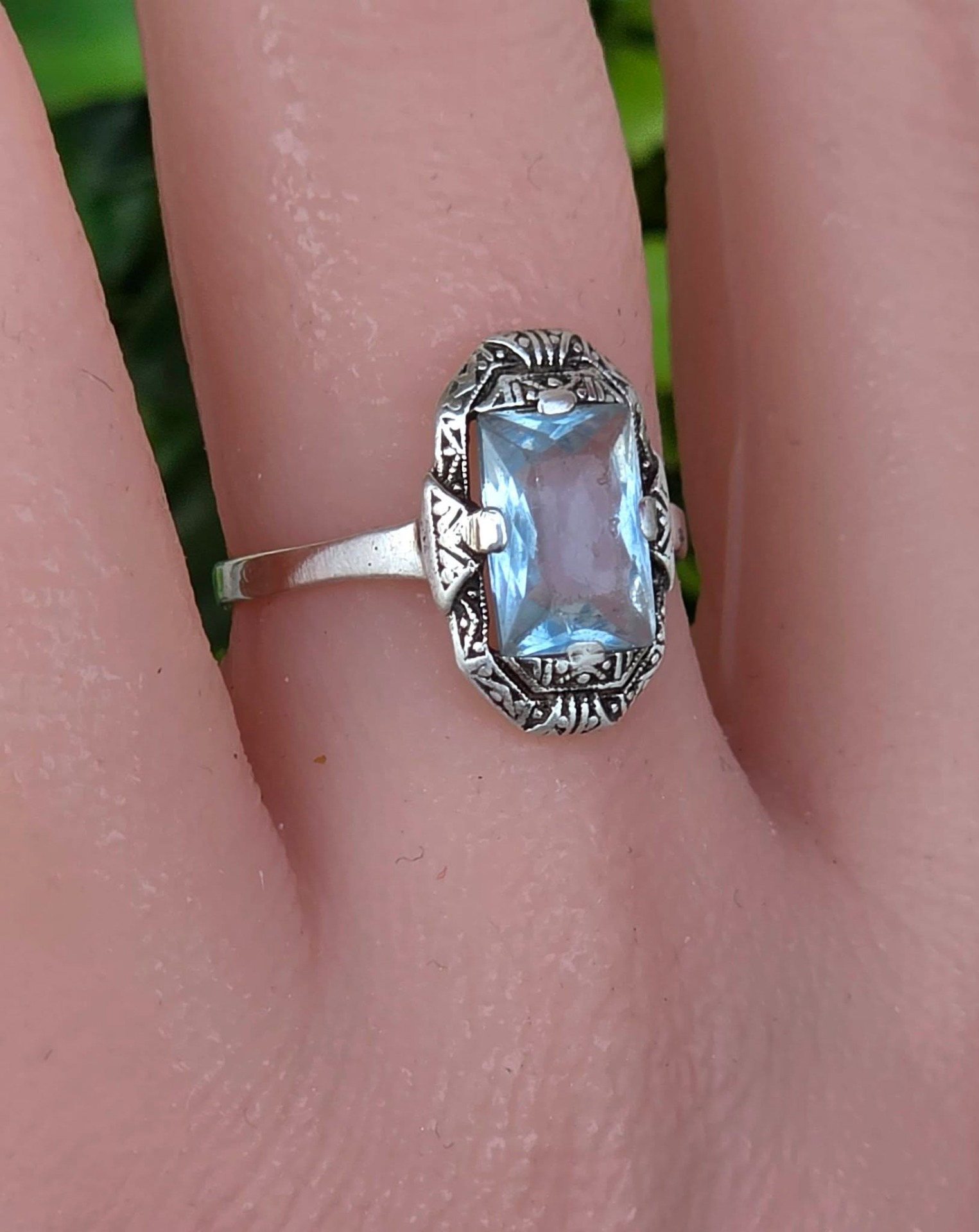 Inel vechi din argint, cu "glass paste" albastru, manufactură în stil Art Deco.