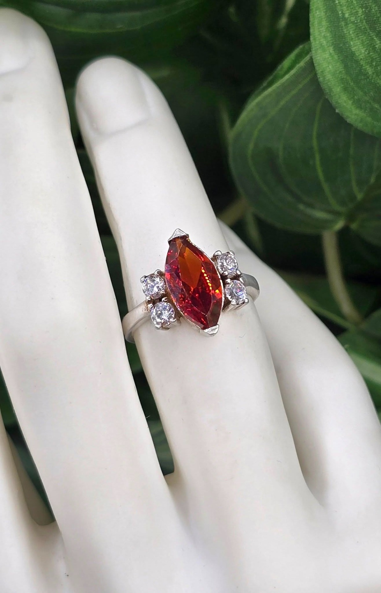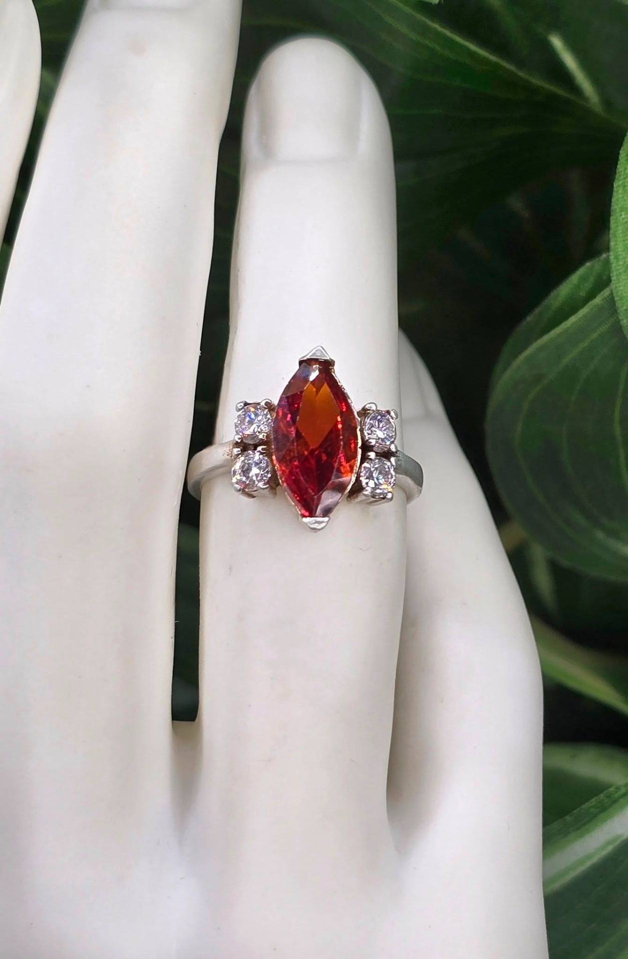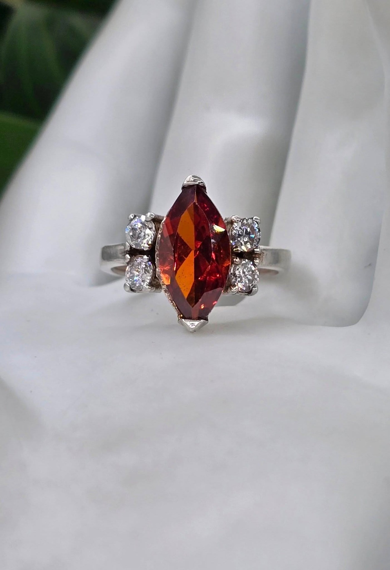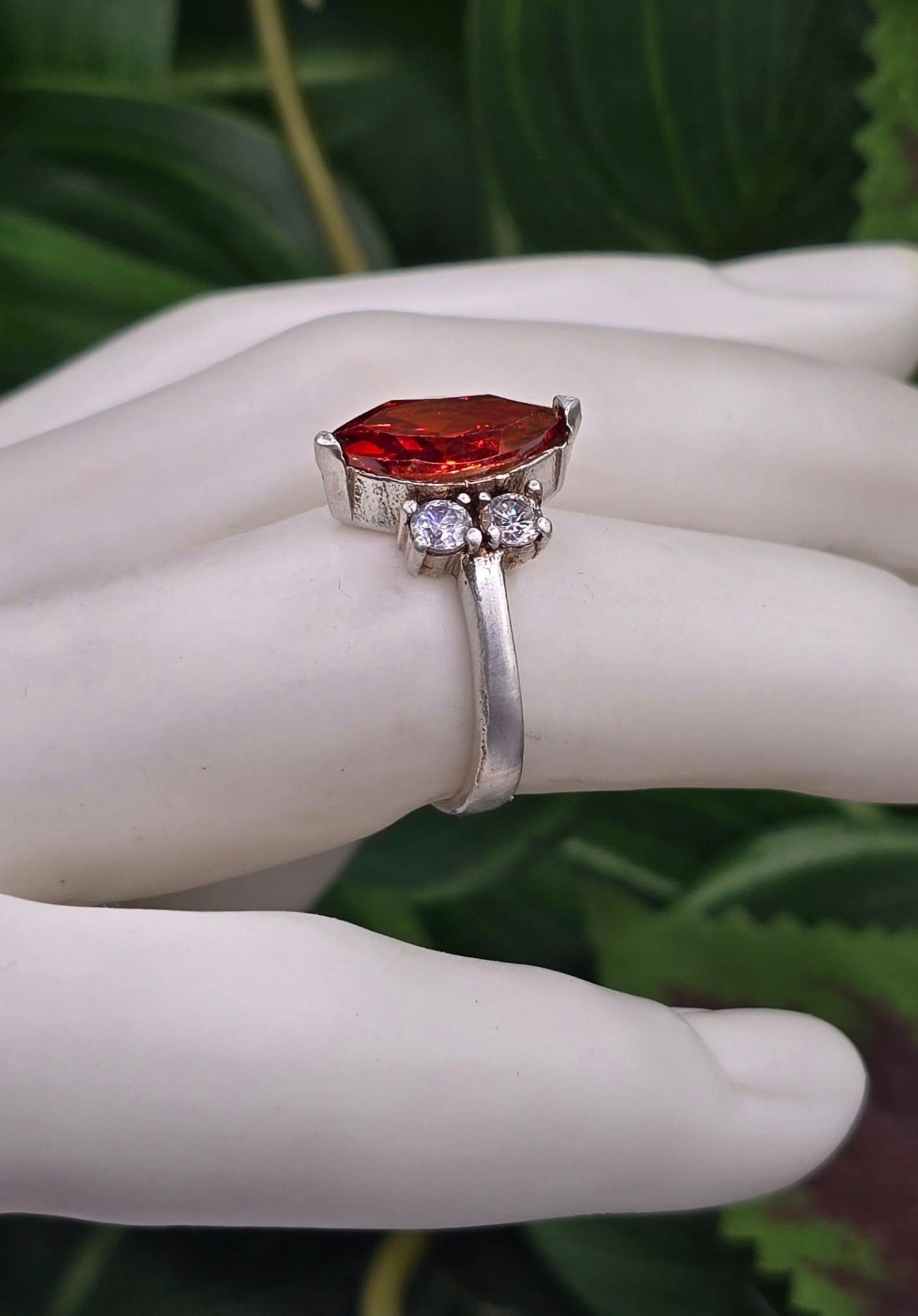 Inel vechi din argint, cu granat mandarin natural și pietre cubic zirconia.