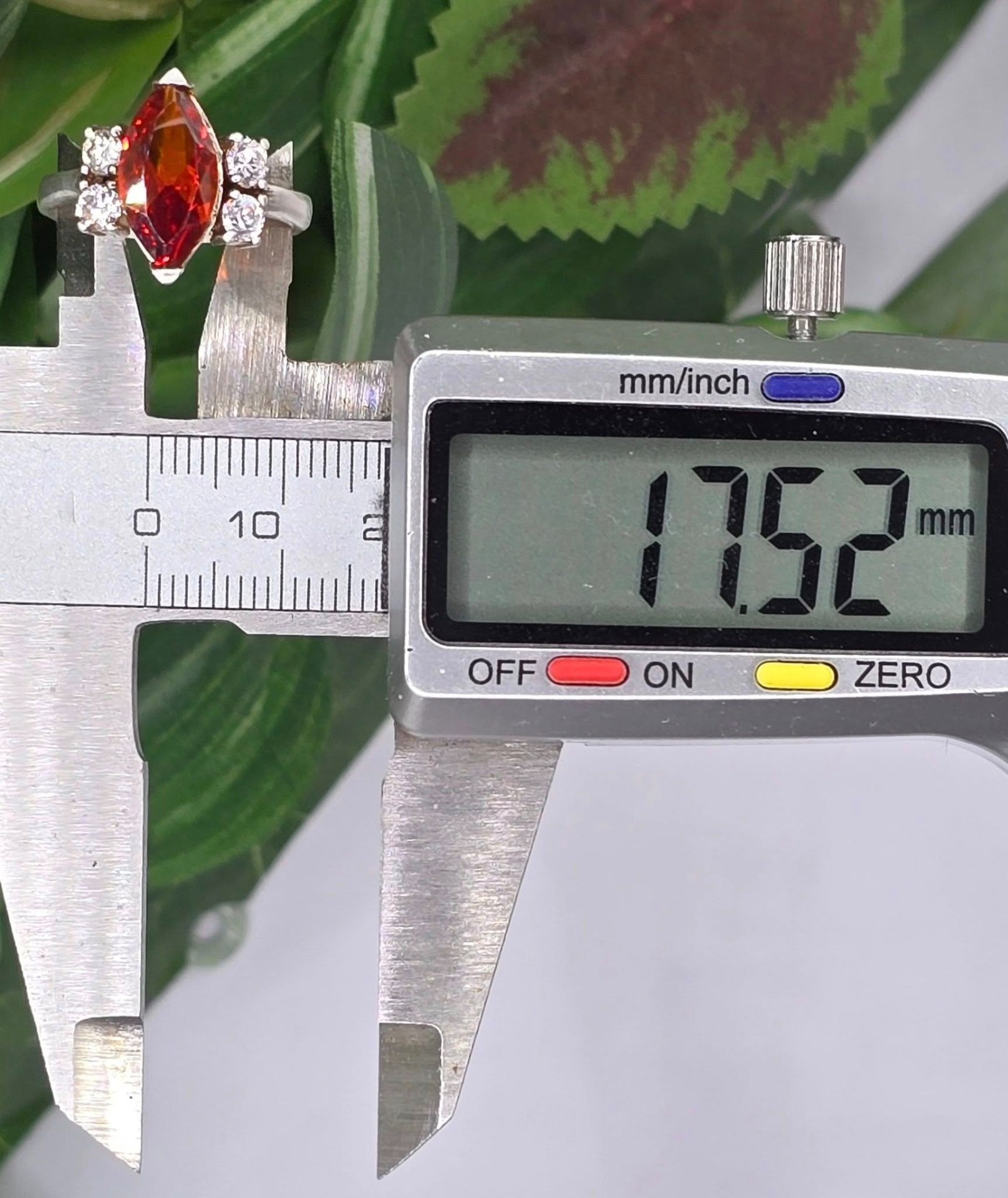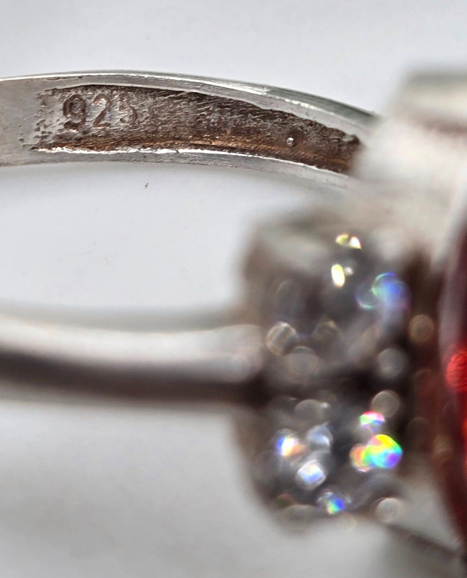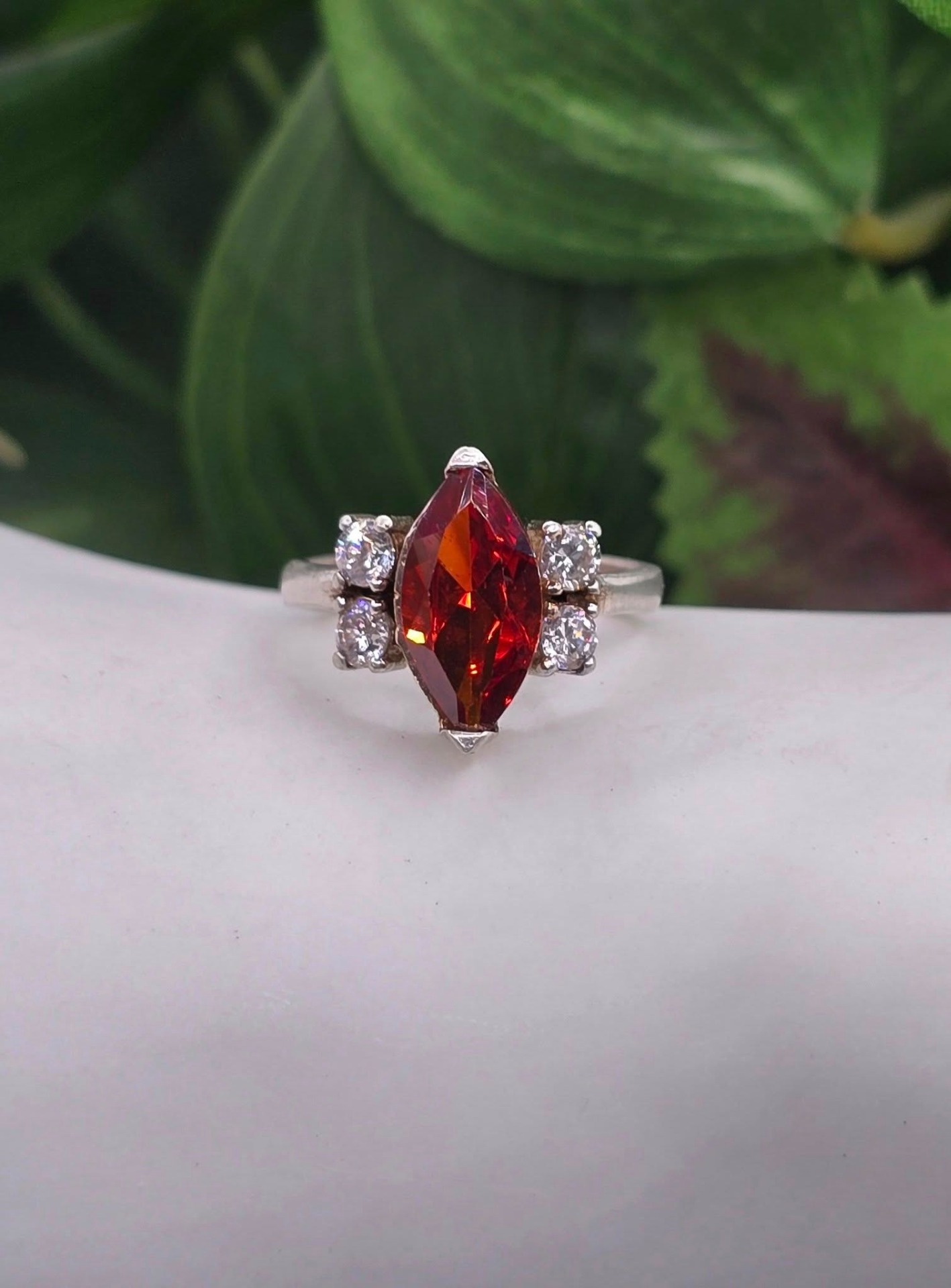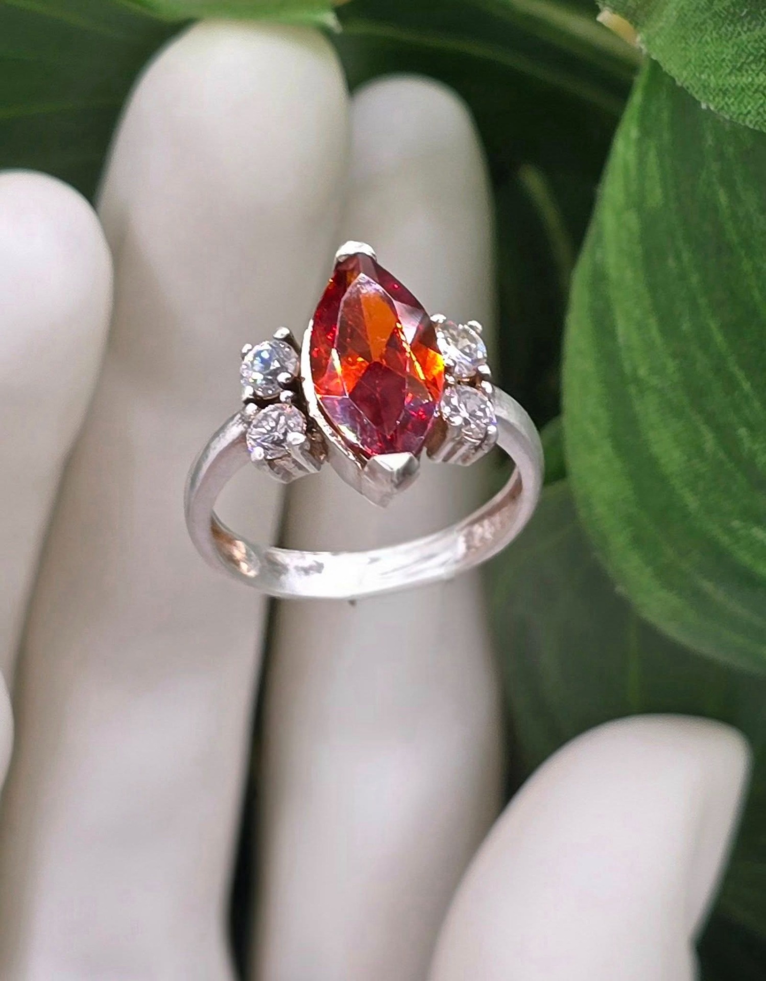Inel vechi din argint, cu granat mandarin natural și pietre cubic zirconia.