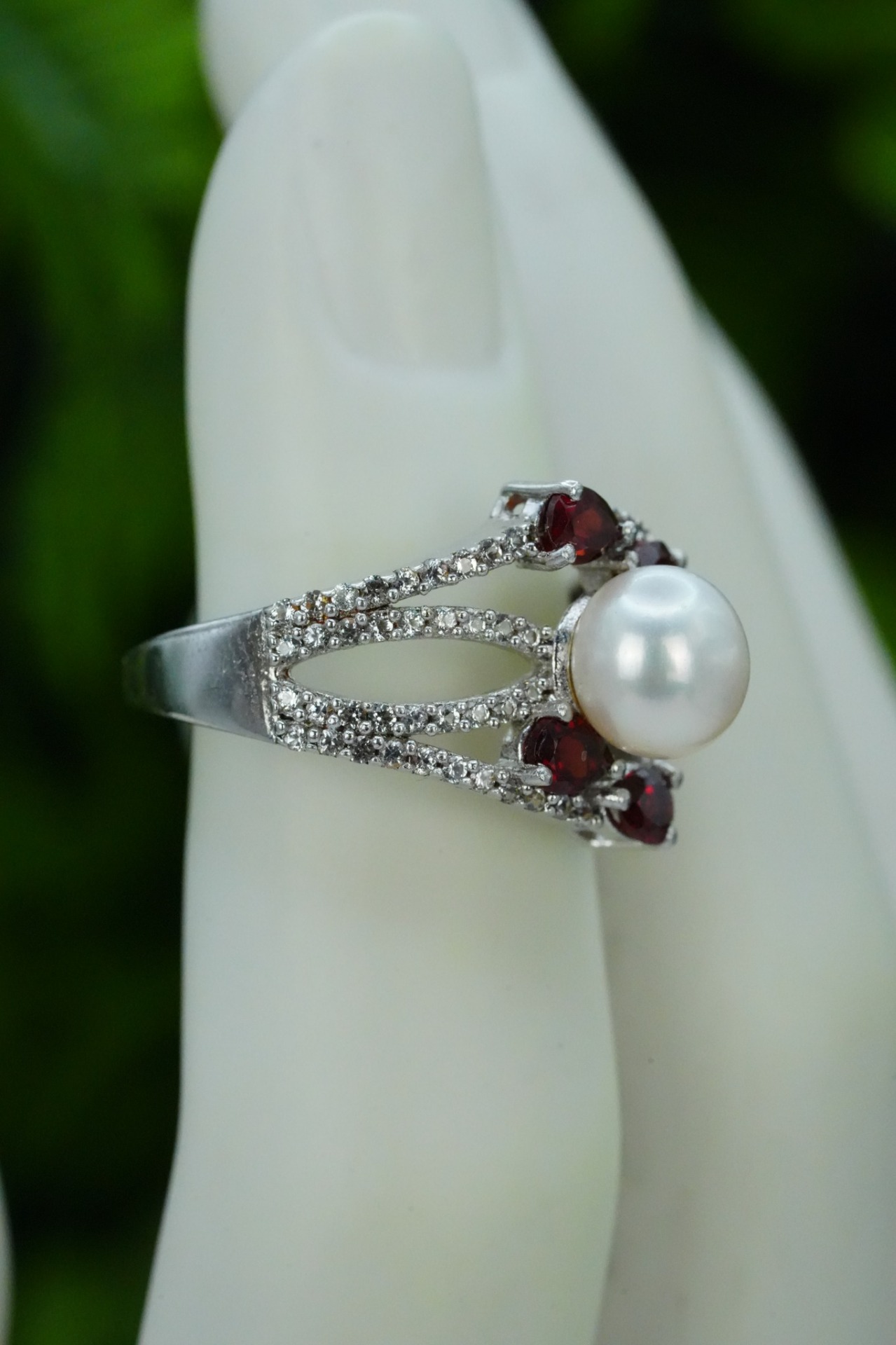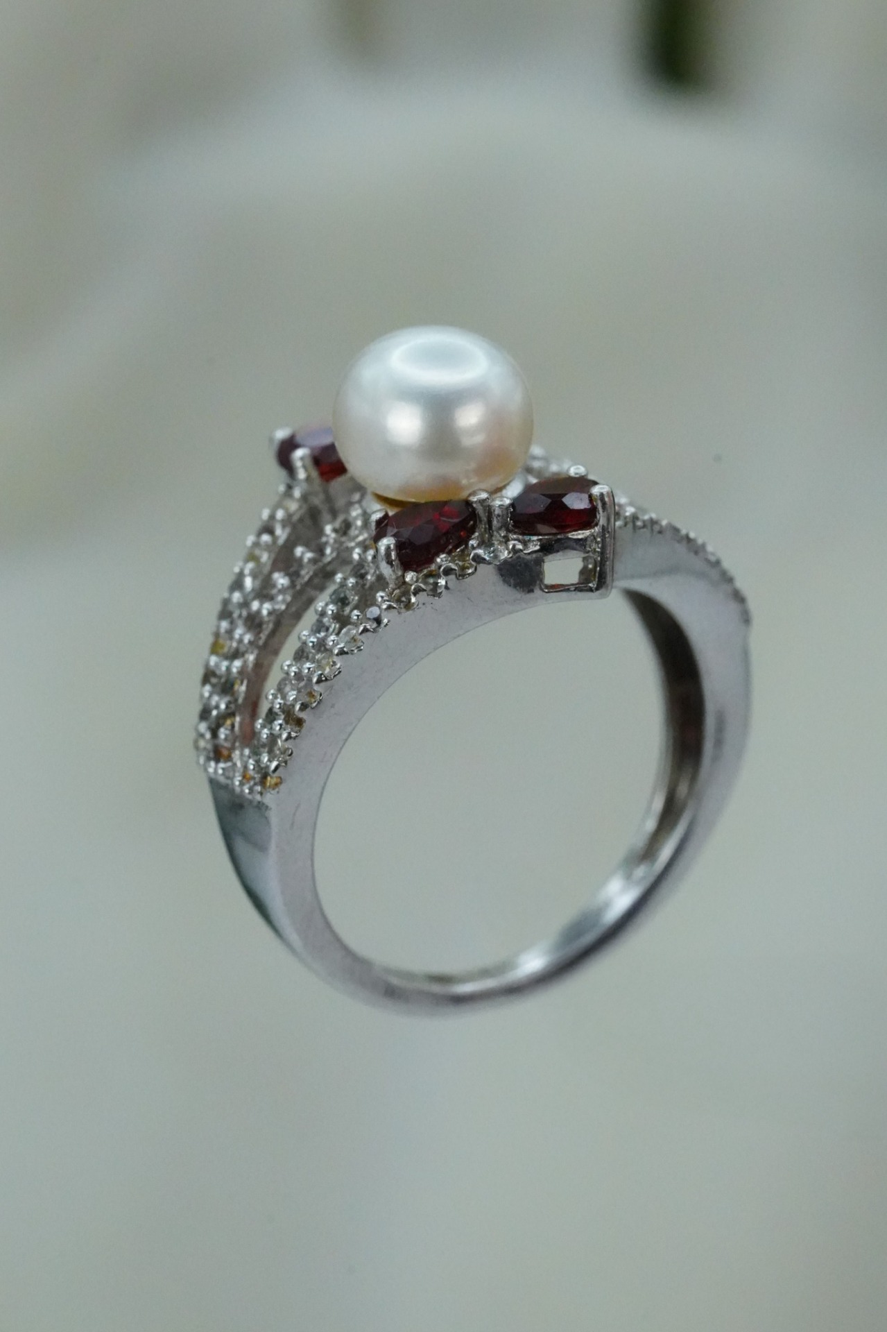 Inel vechi din argint, cu granate naturale, topaze naturale, și perlă naturală de cultură.