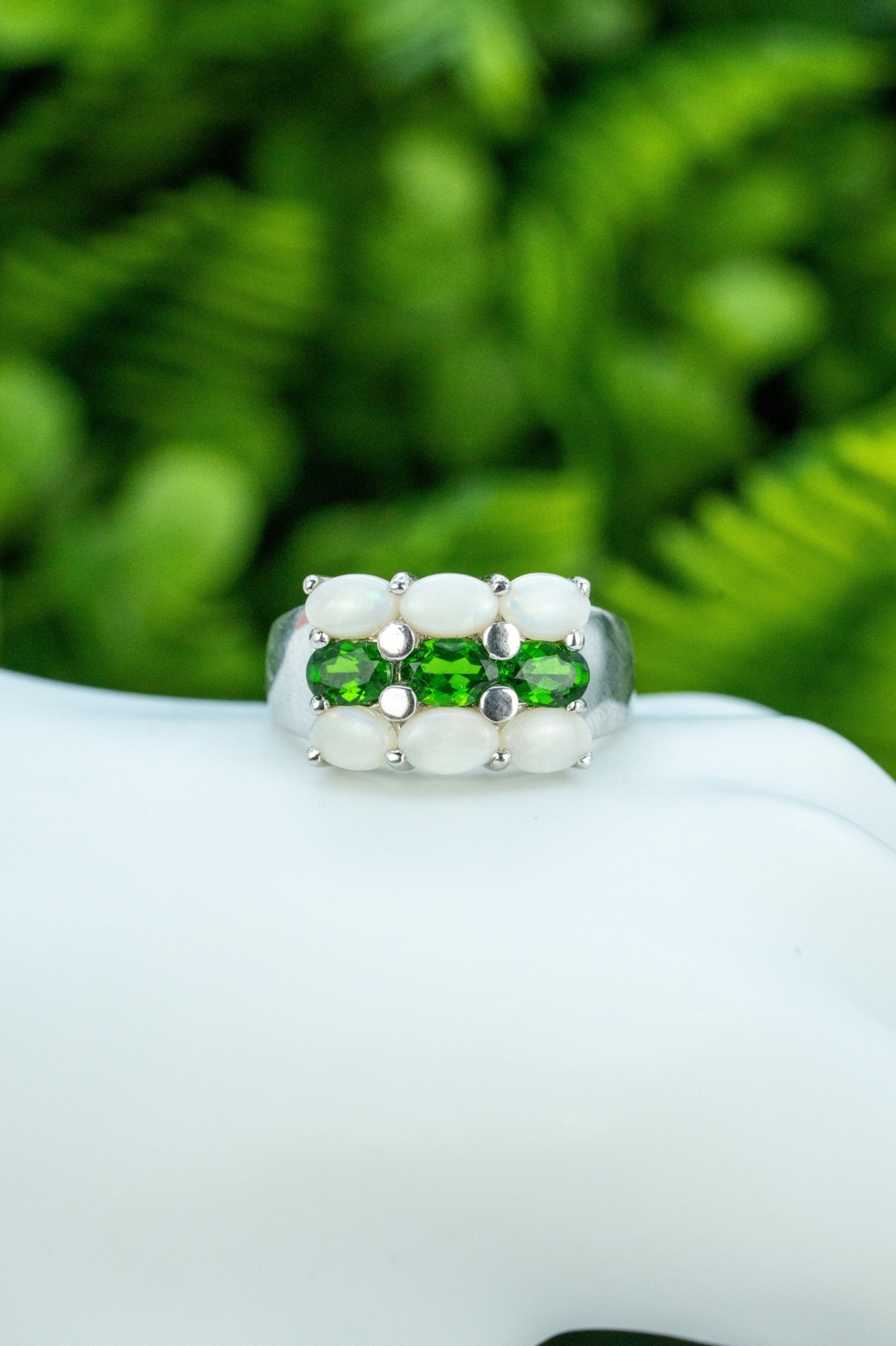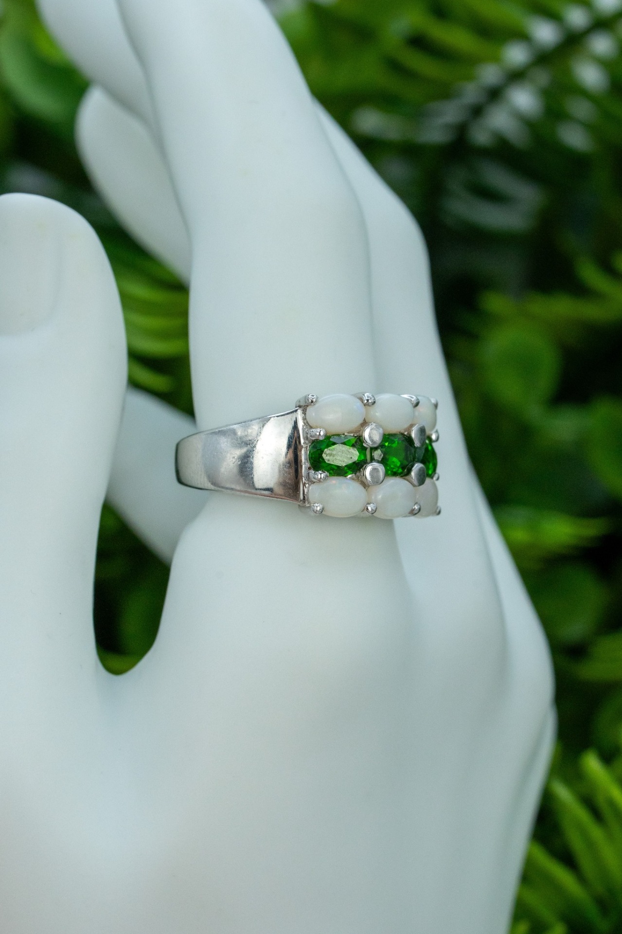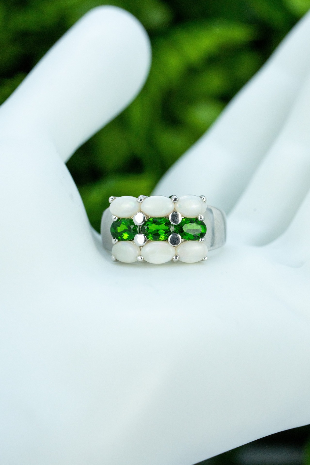 Inel vechi din argint, cu opale și peridot naturale.