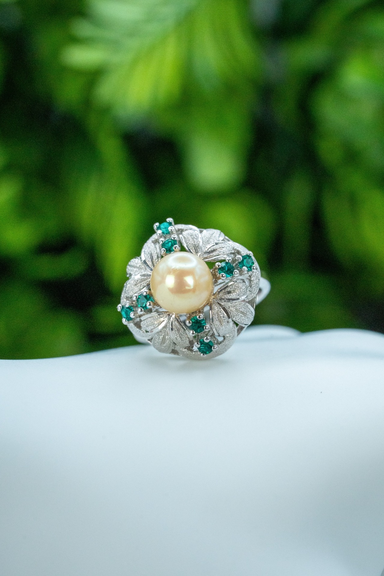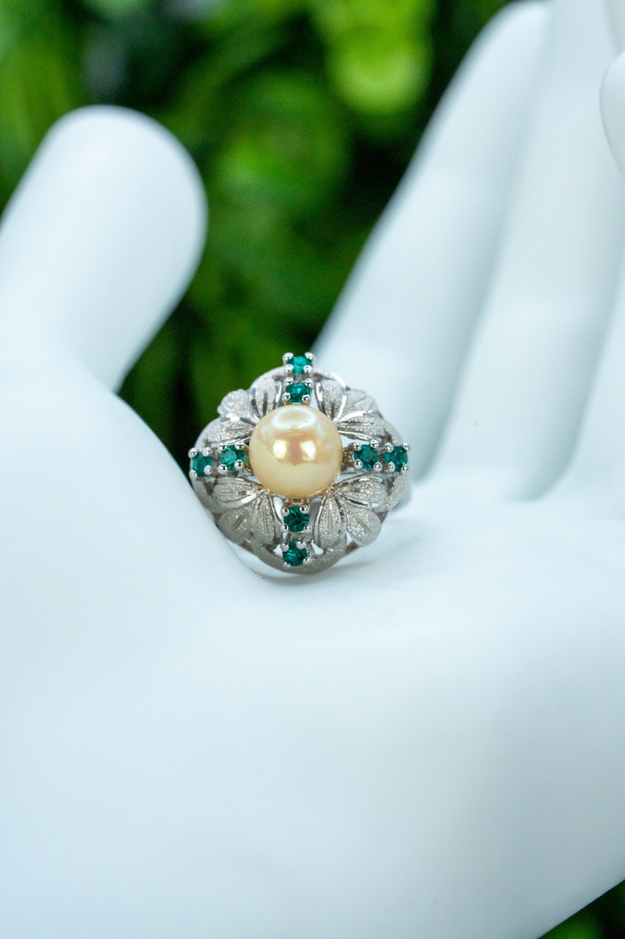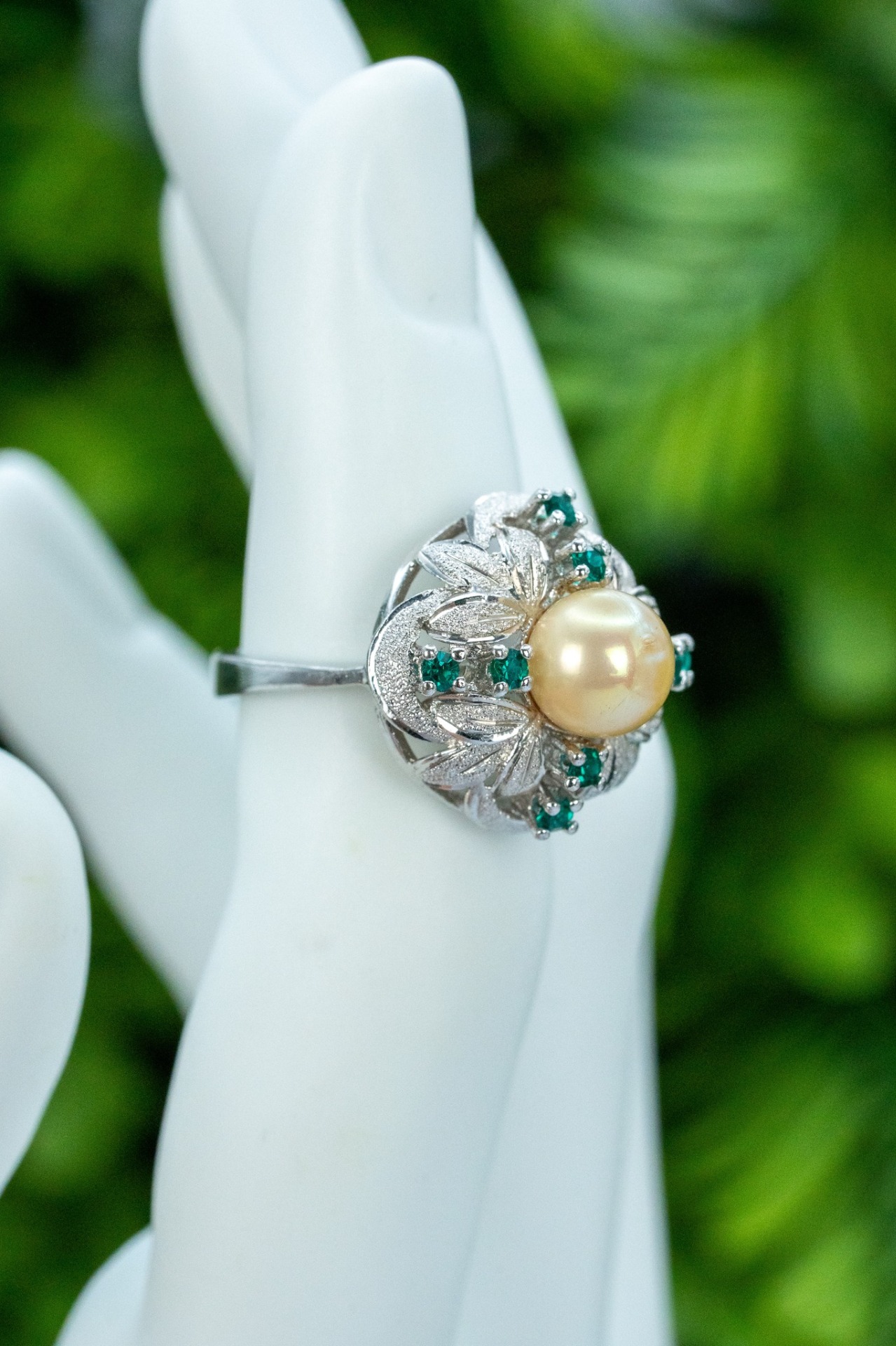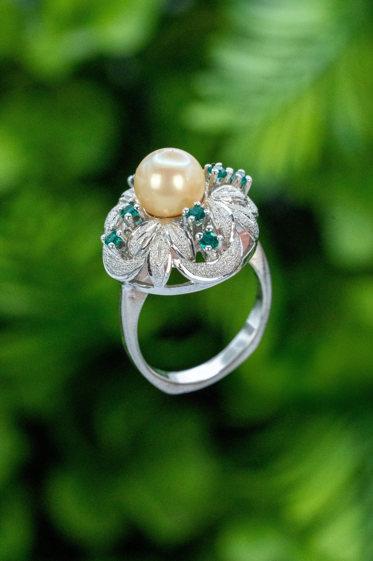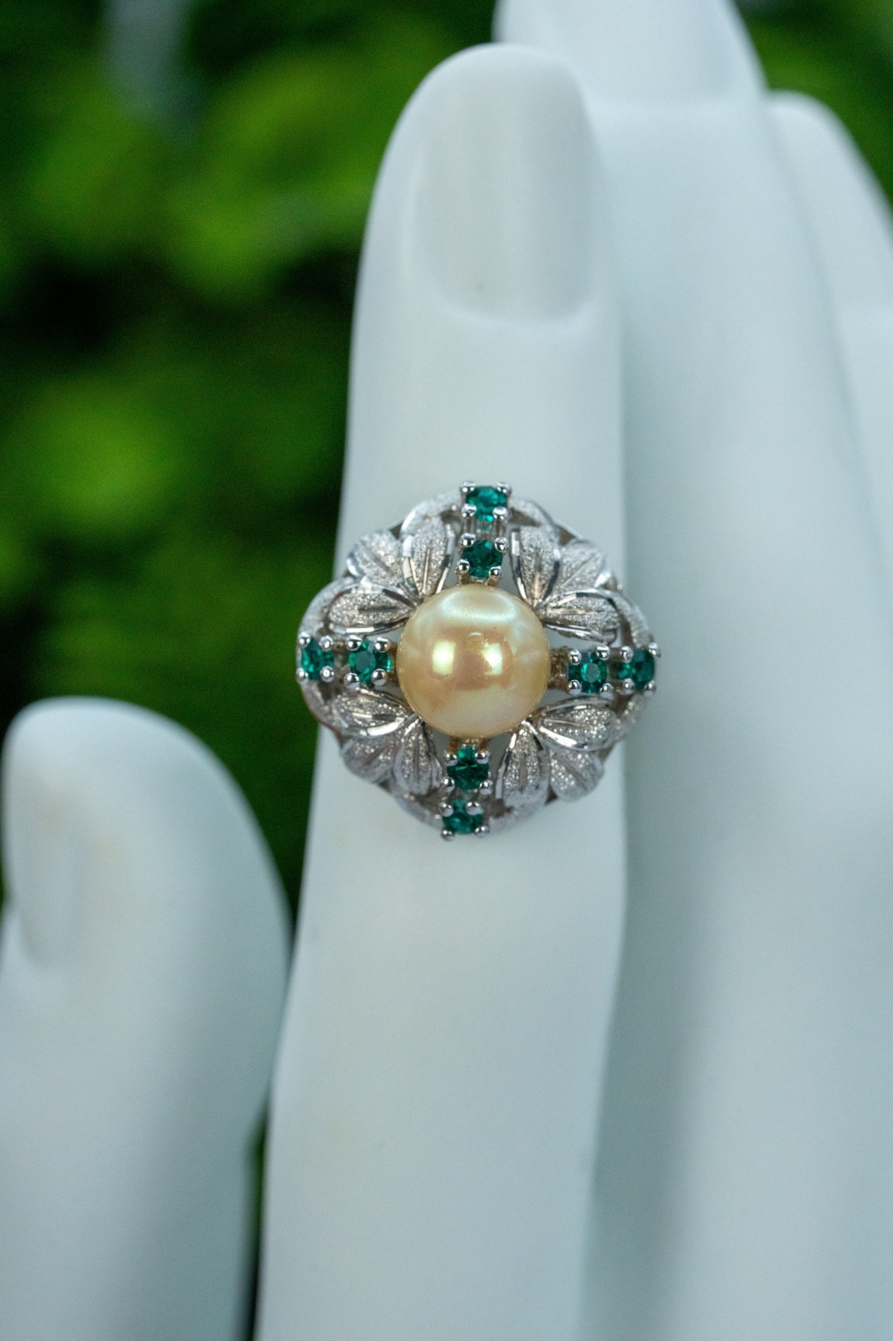 Inel vechi din argint, cu perlă faux și pietre cubic zirconia.