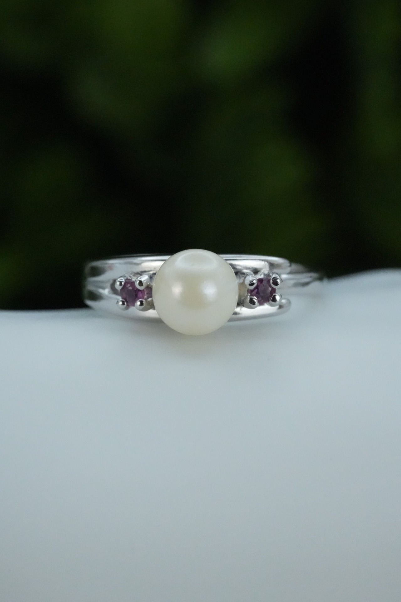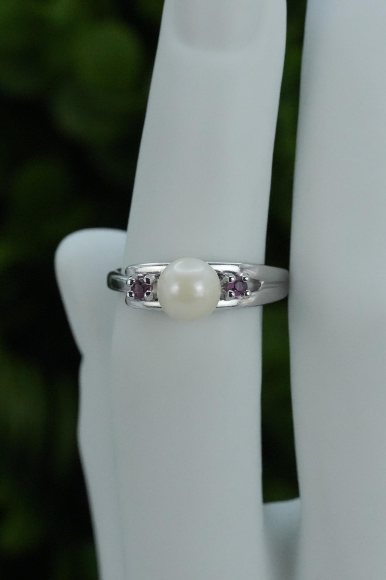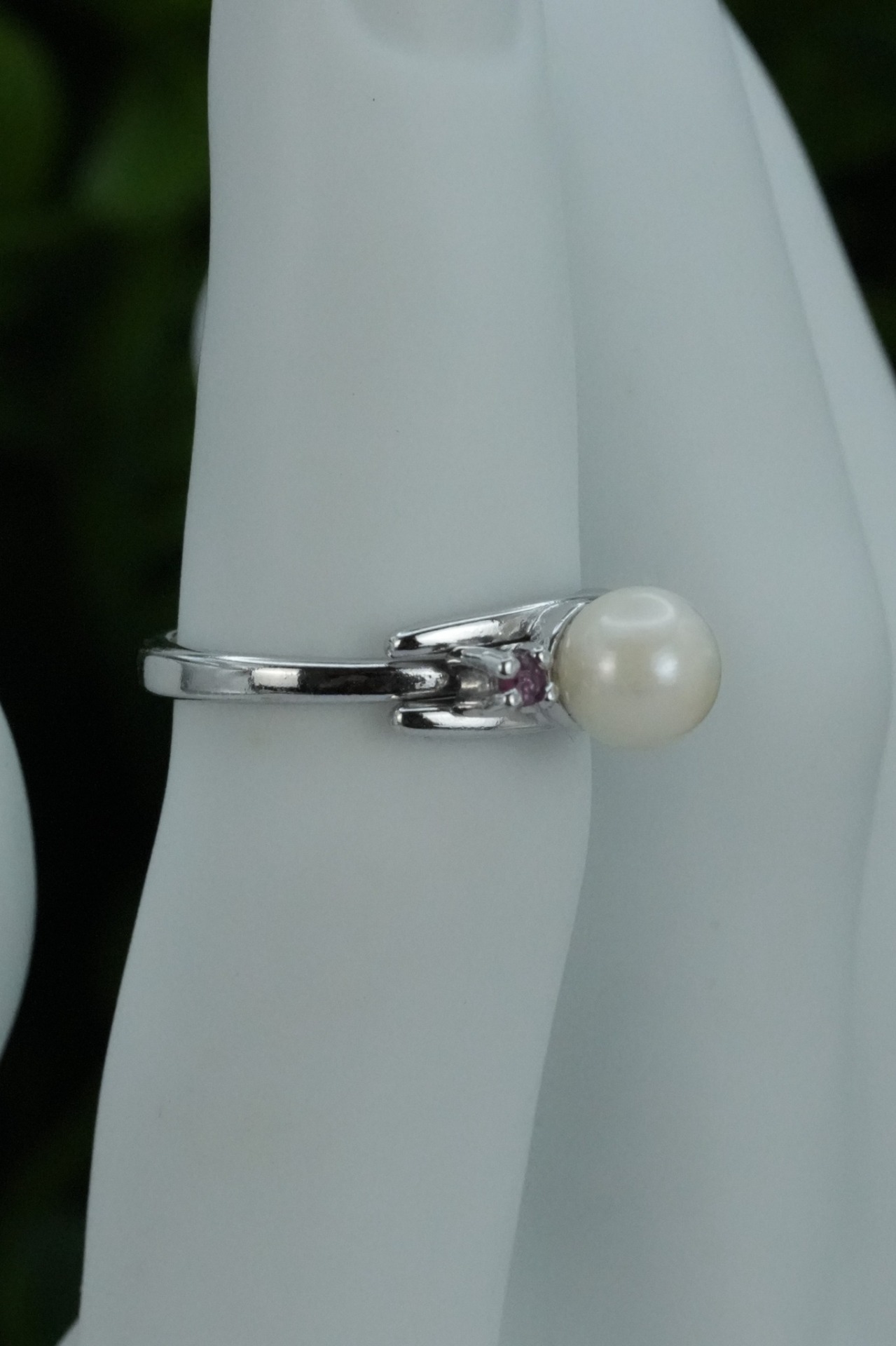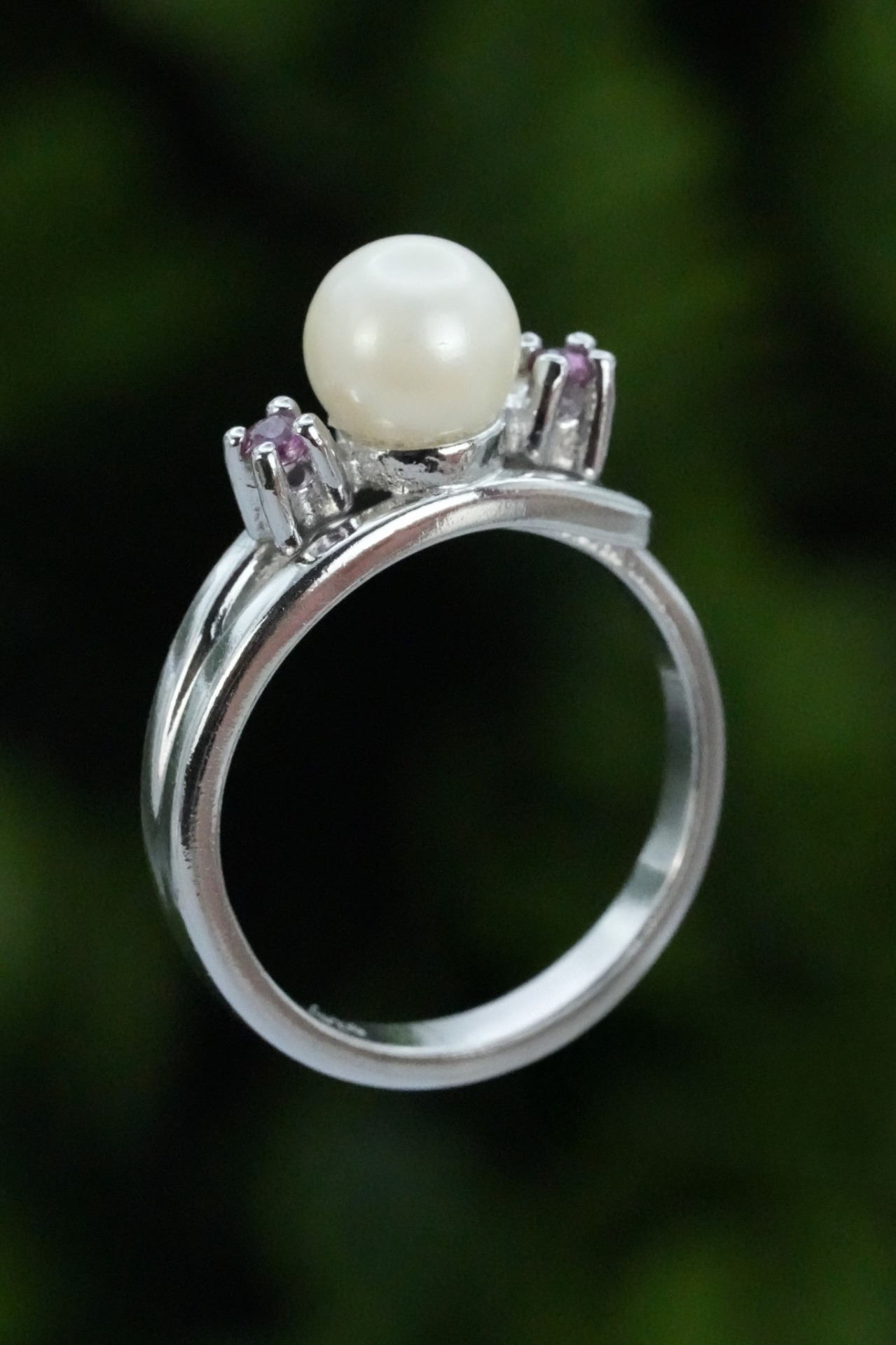 Inel vechi din argint, cu perlă naturală de cultură și rubine naturale.