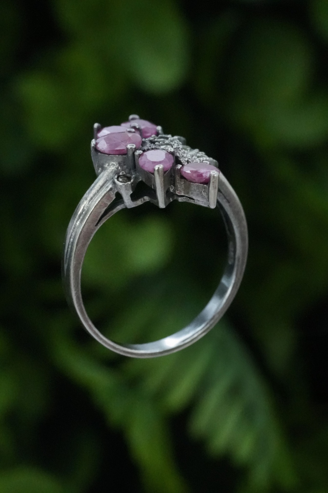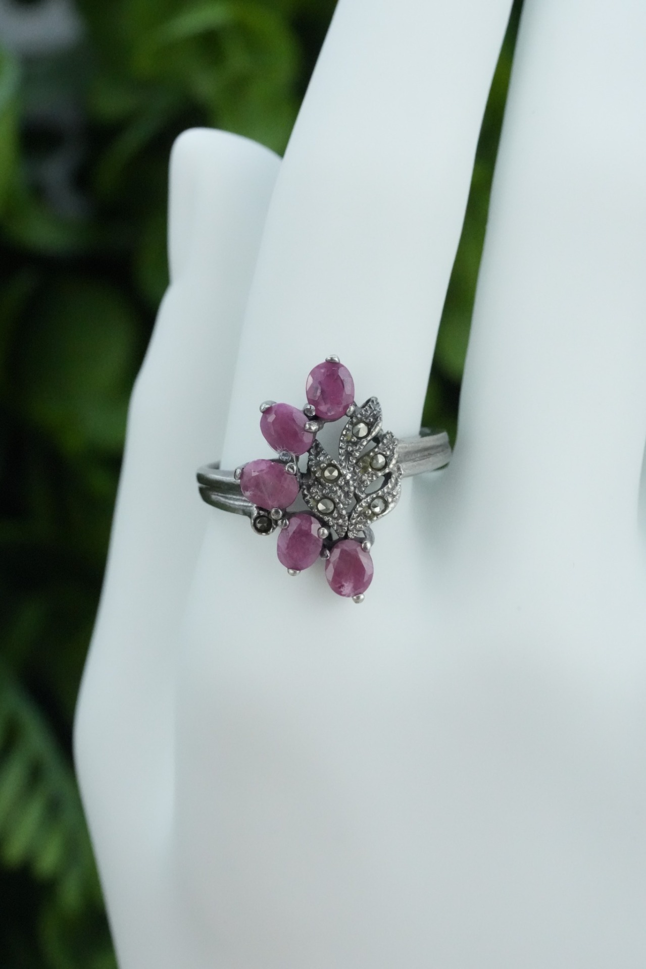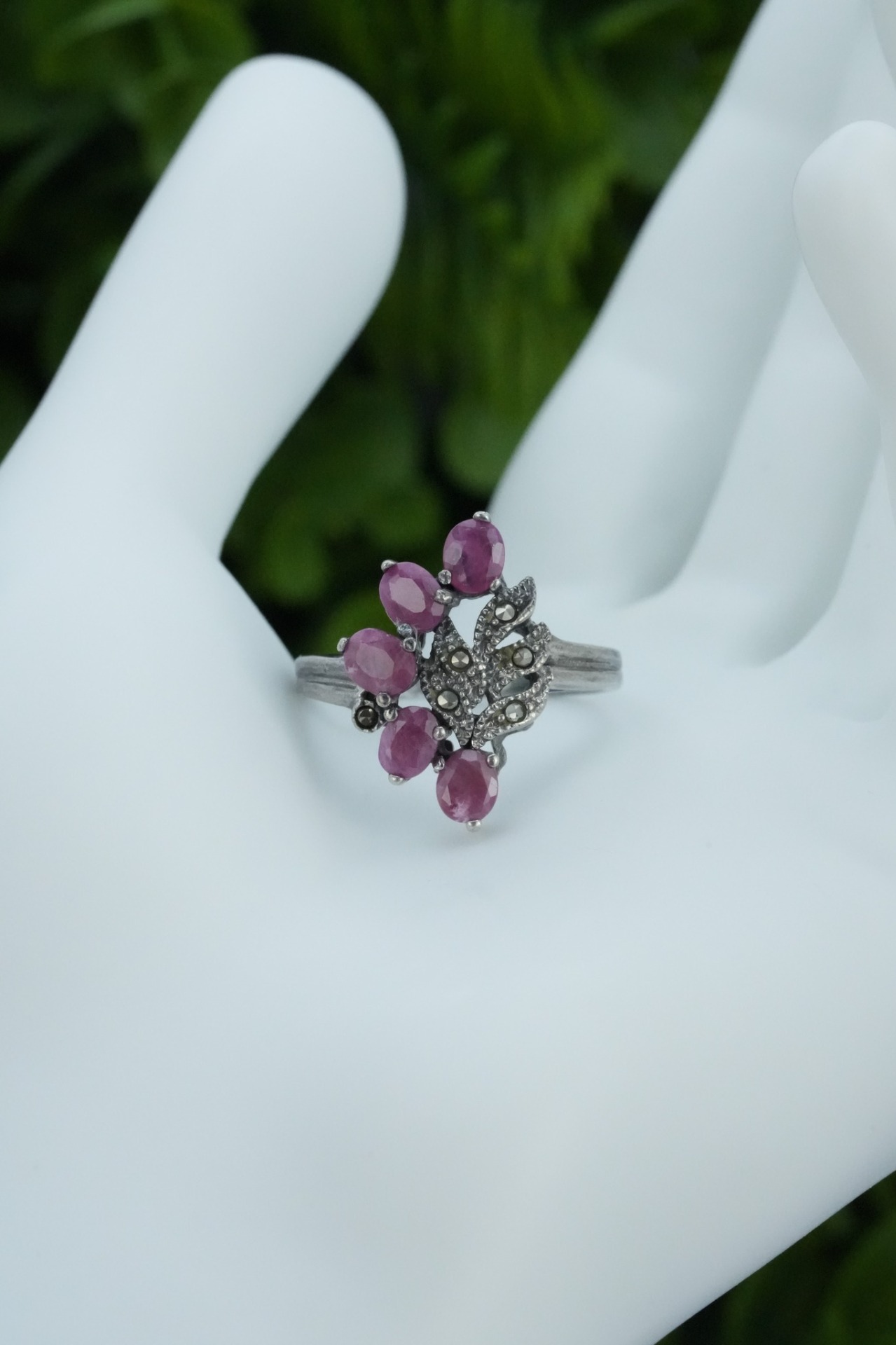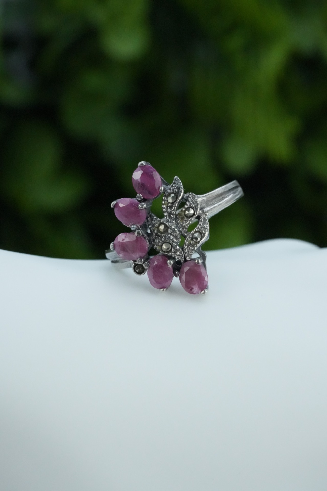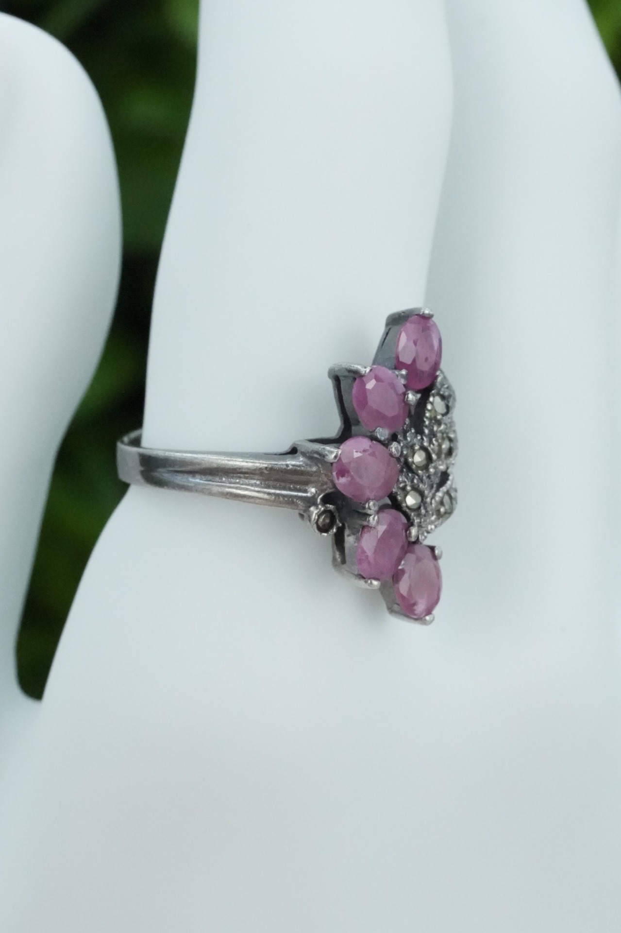 Inel vechi din argint, cu rubine naturale și marcasite.
