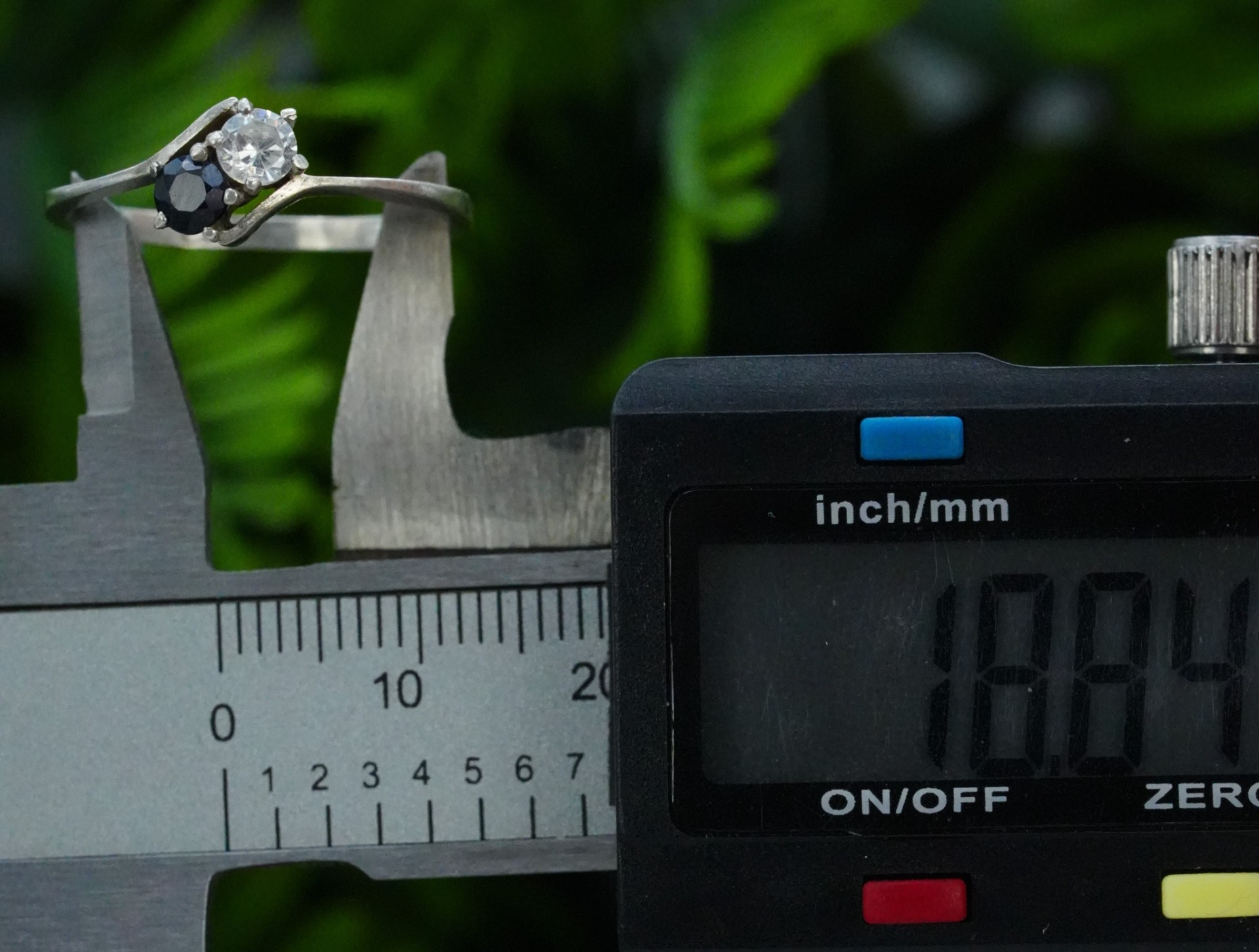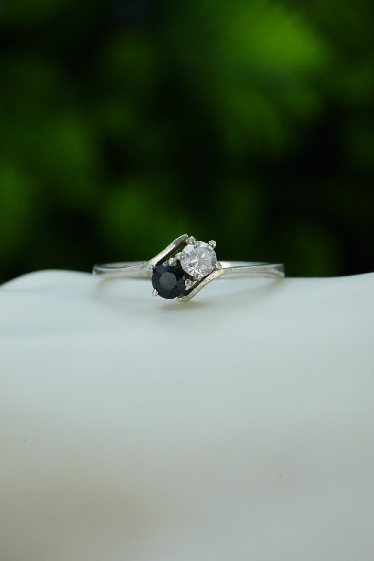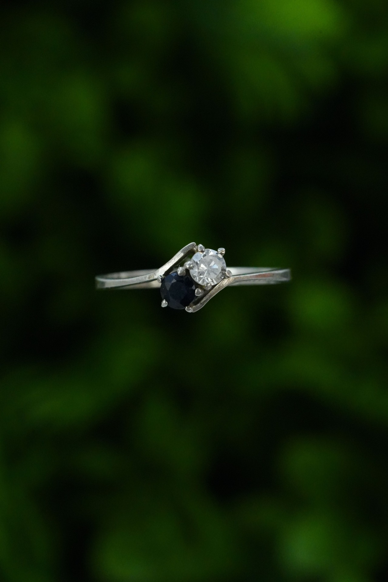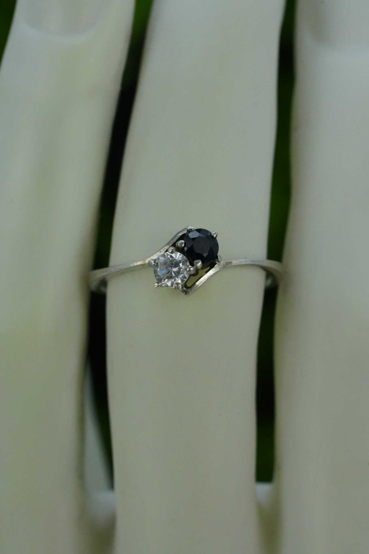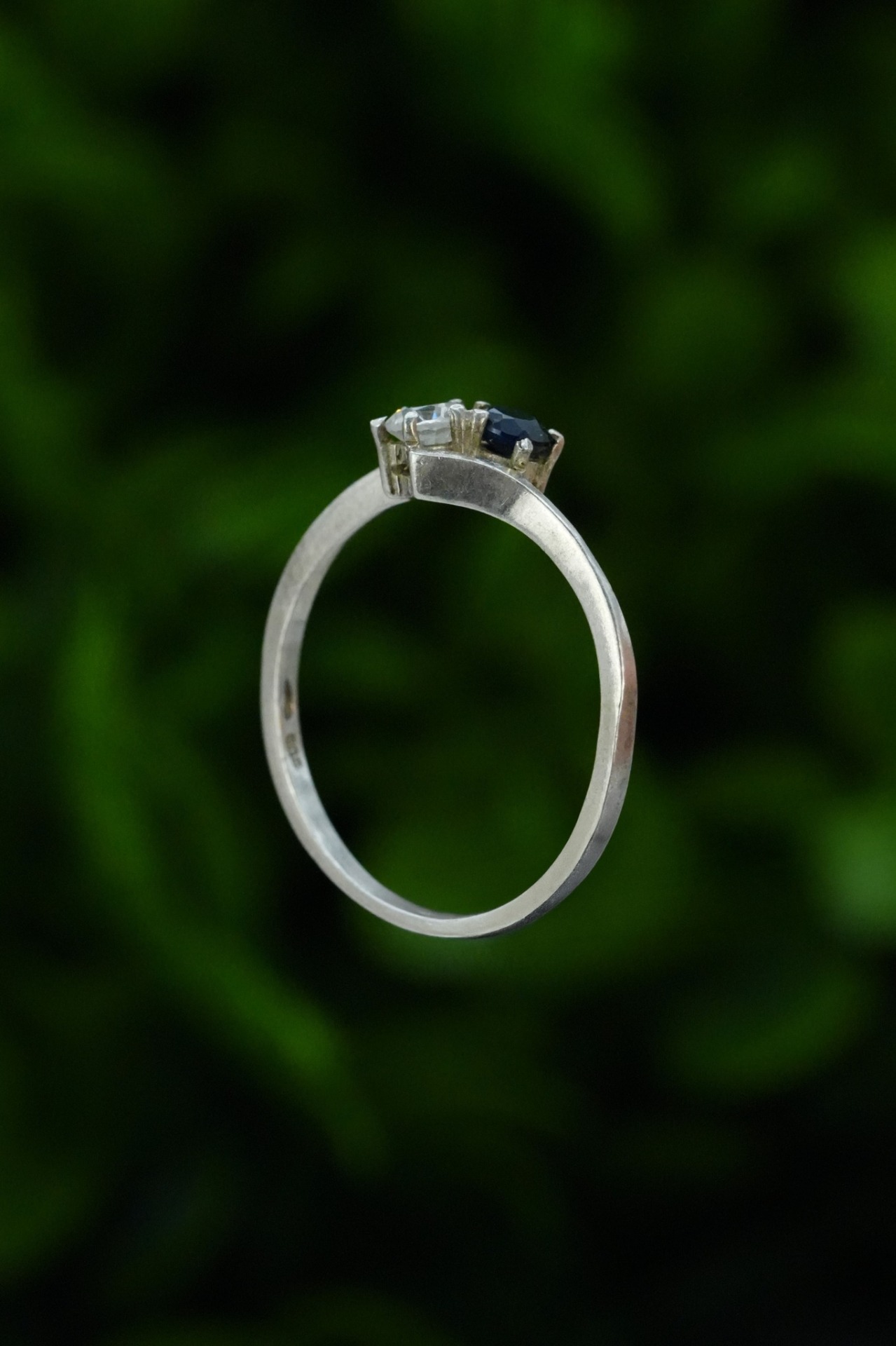 Inel vechi din argint, cu safir natural și piatră cubic zirconia.