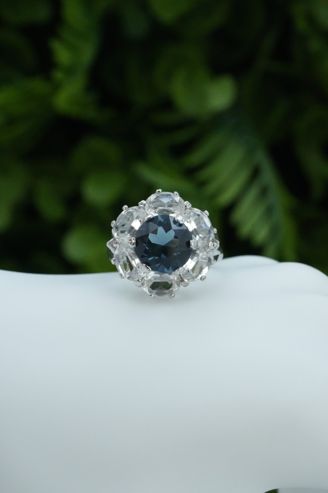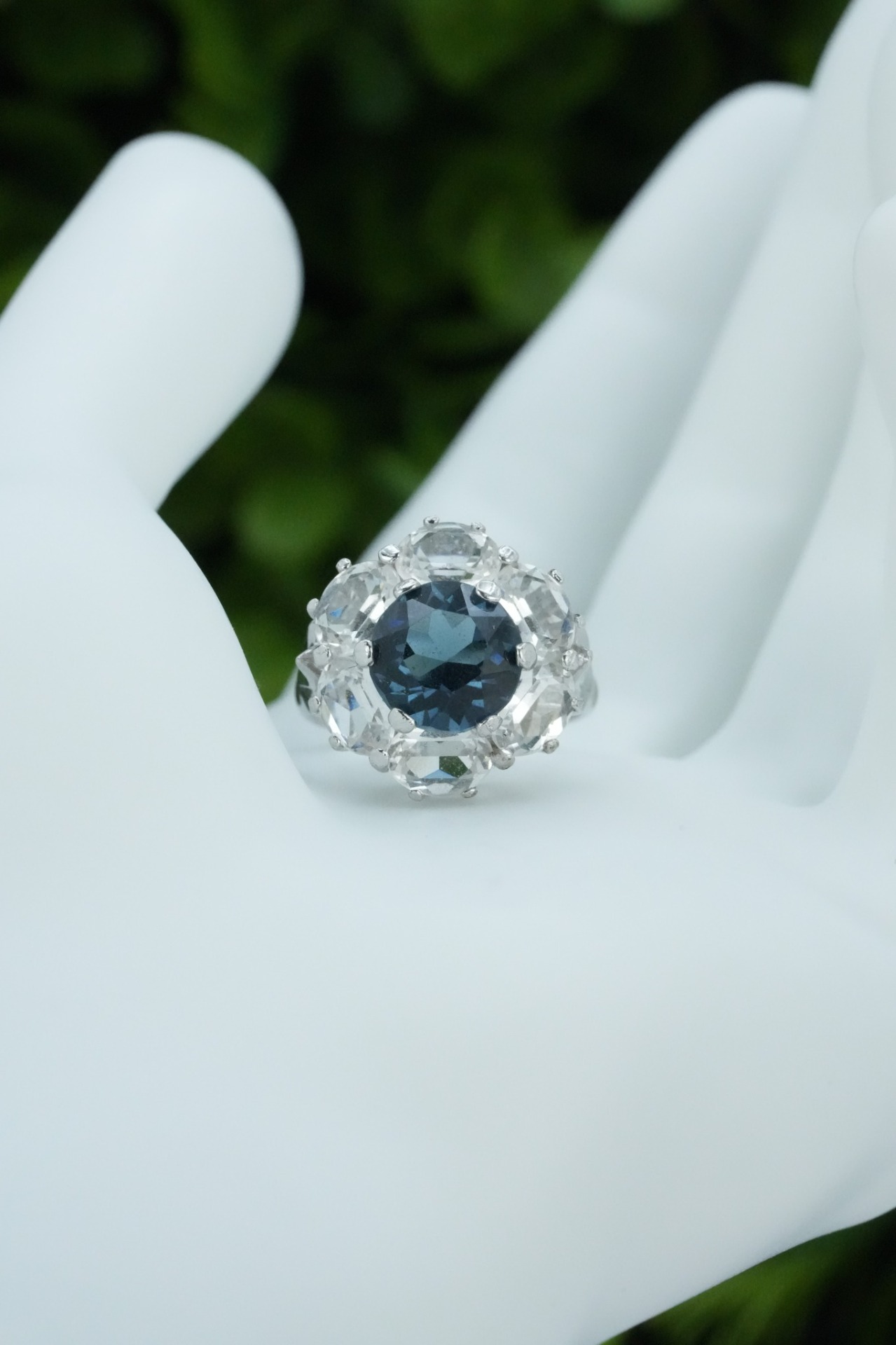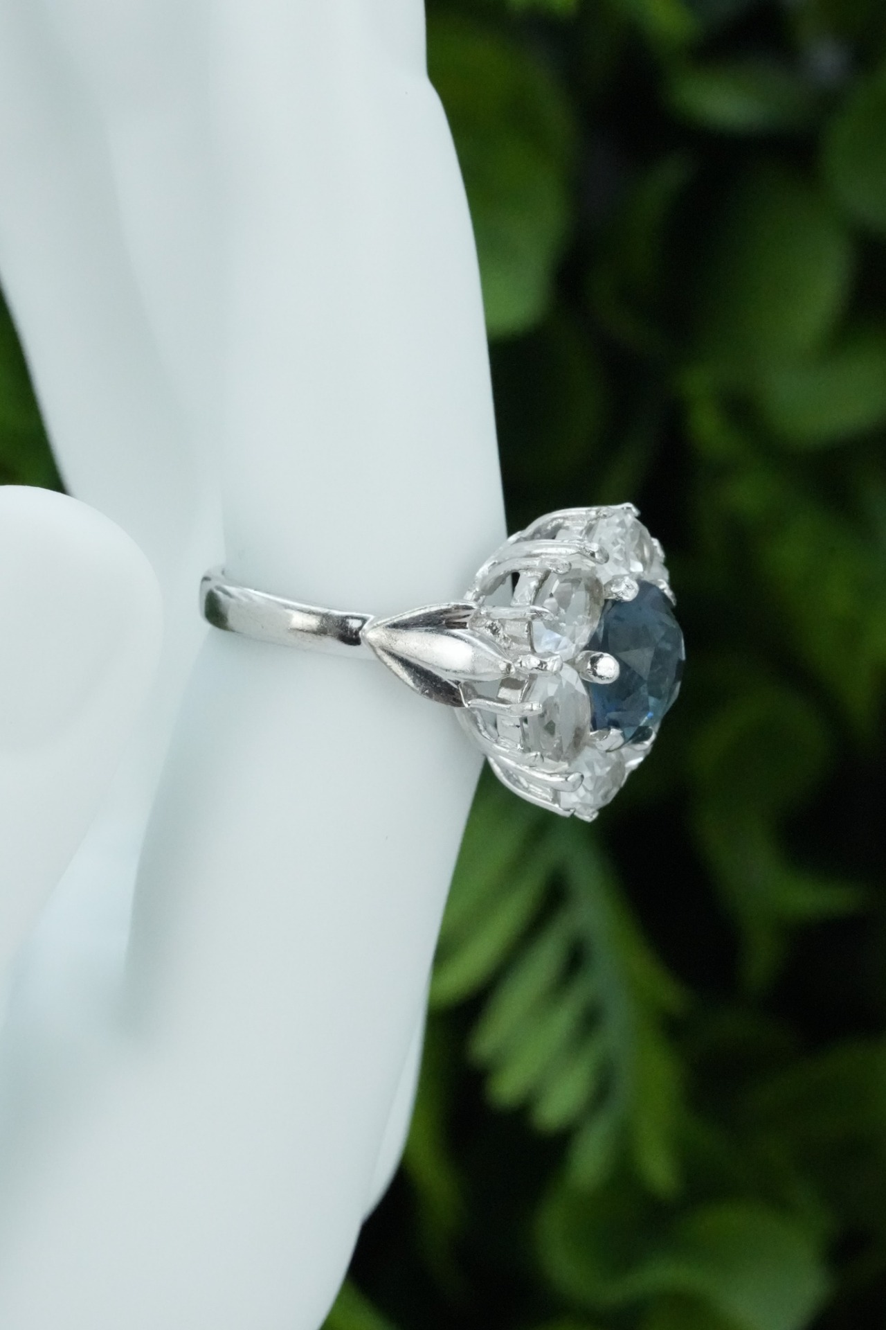 Inel vechi din argint, cu safir simulat și pietre cubic zirconia.