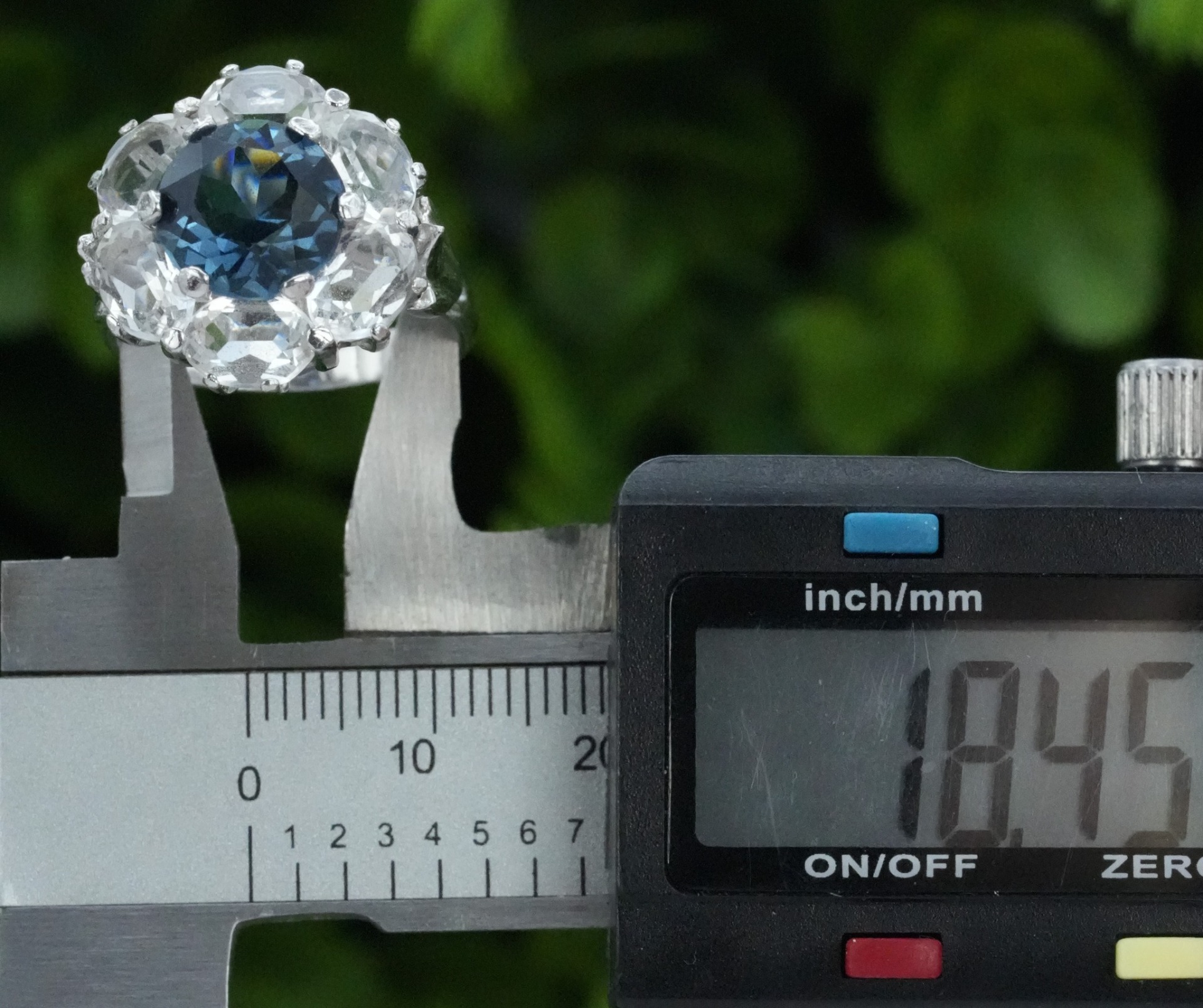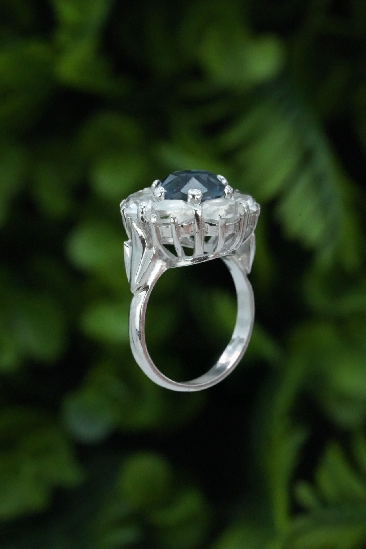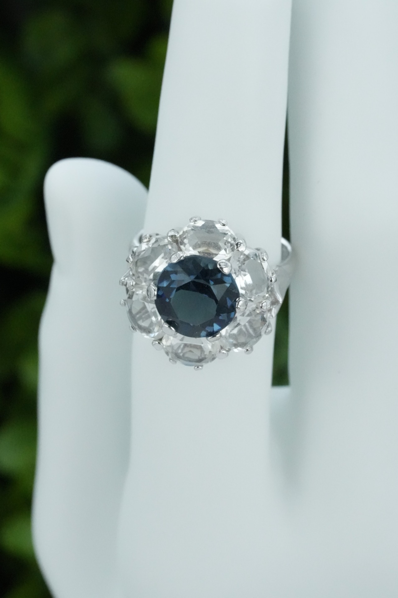 Inel vechi din argint, cu safir simulat și pietre cubic zirconia.
