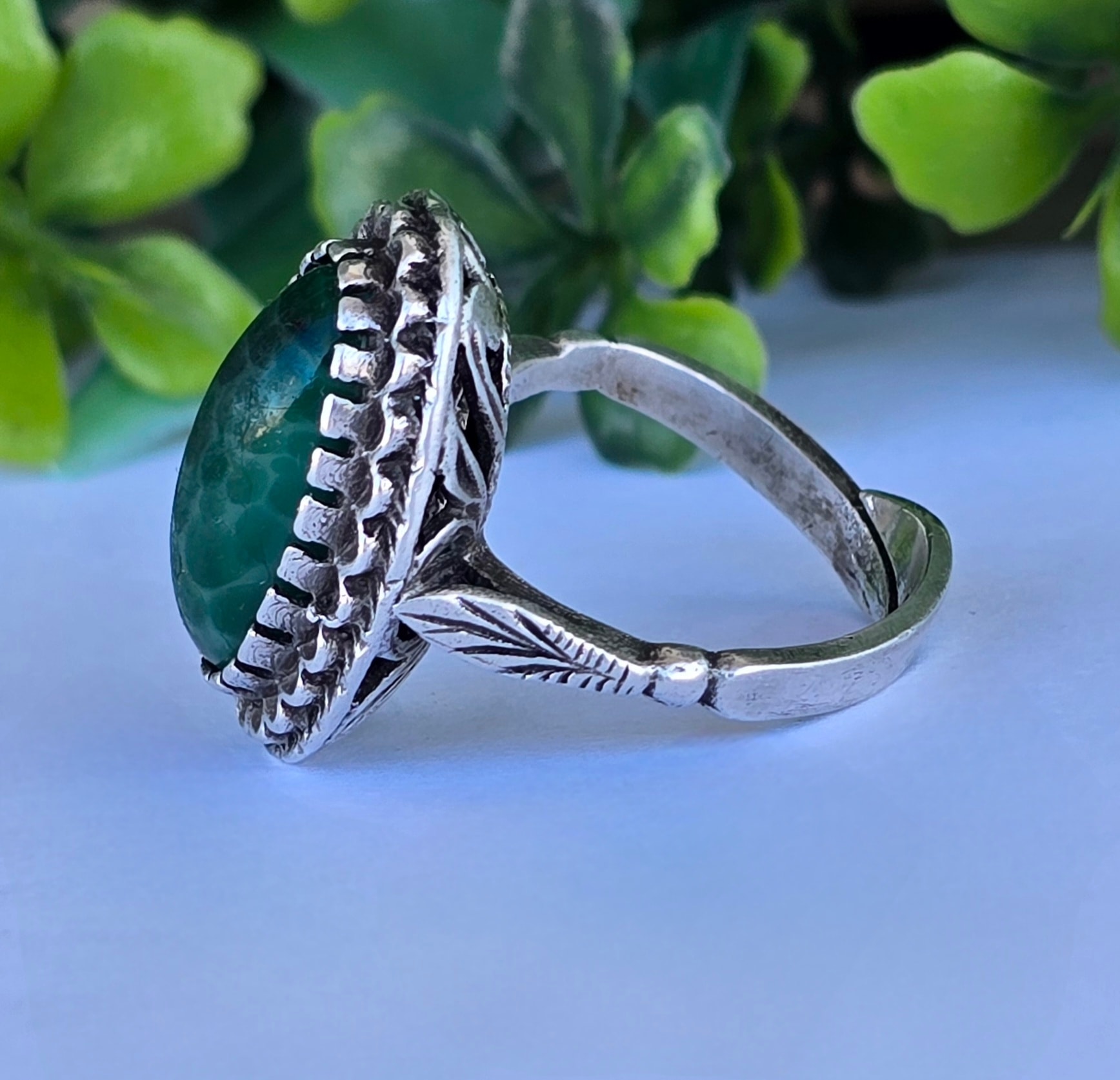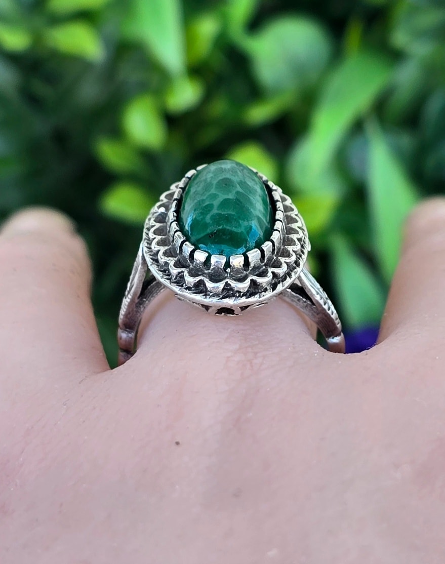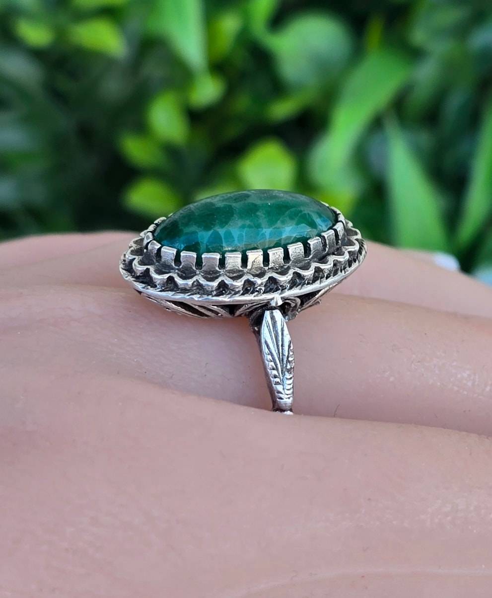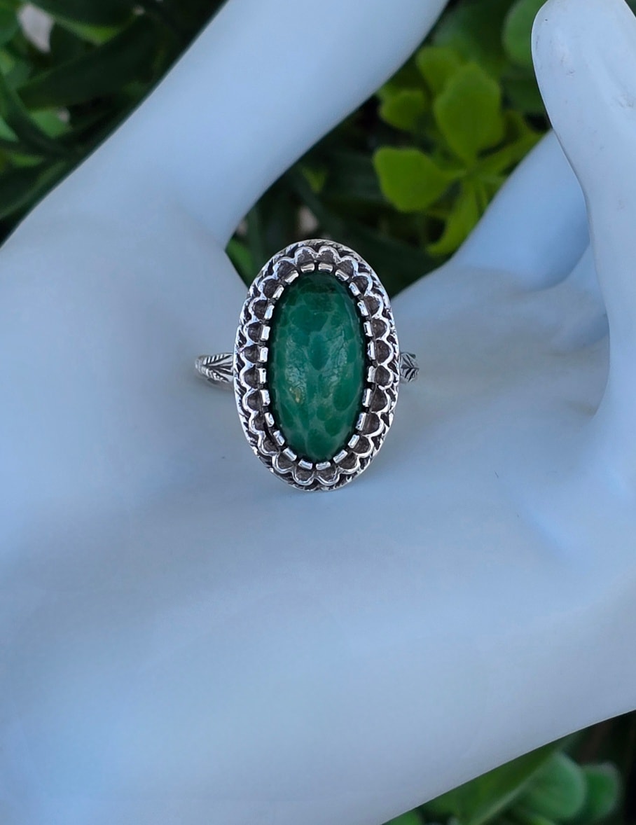 Inel vechi din argint, cu serpentinit natural.