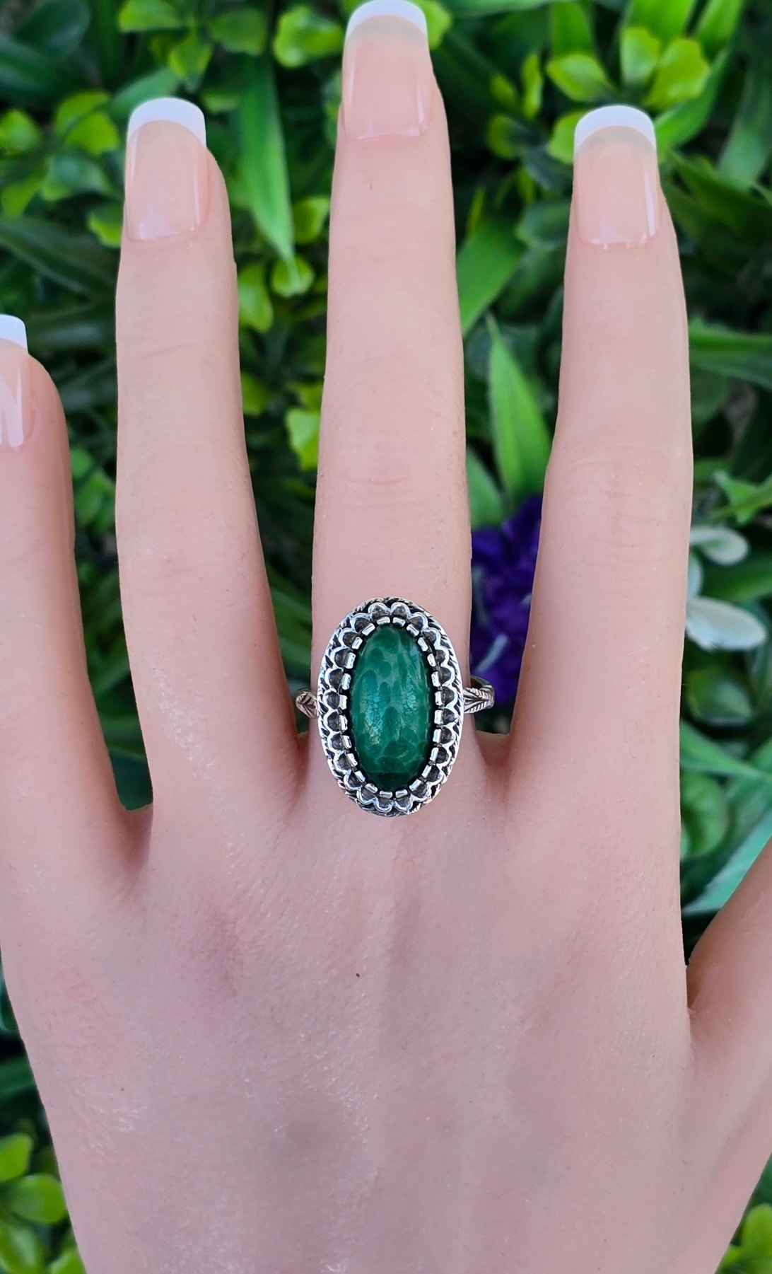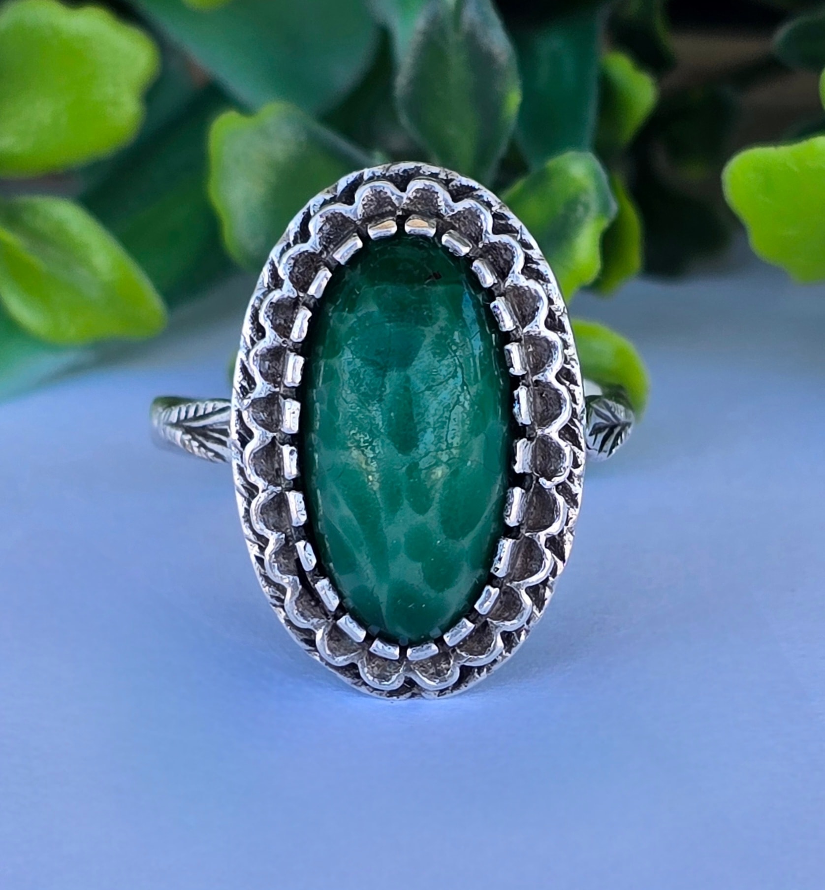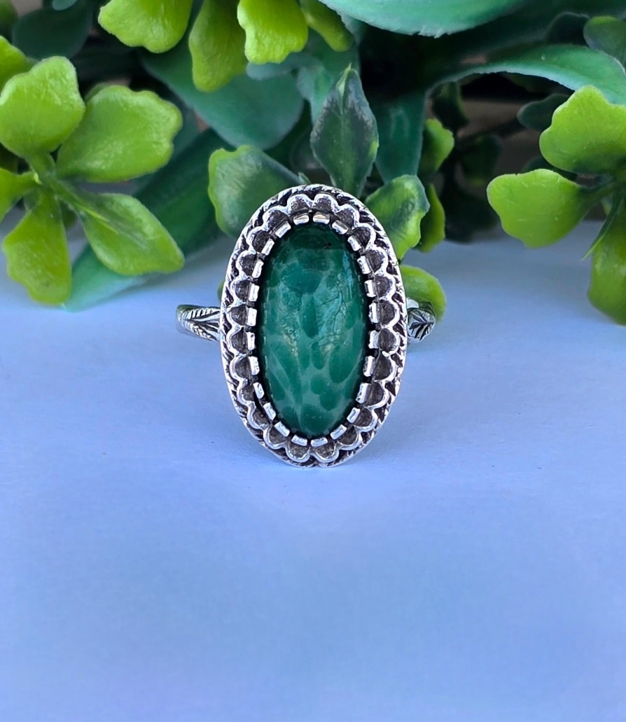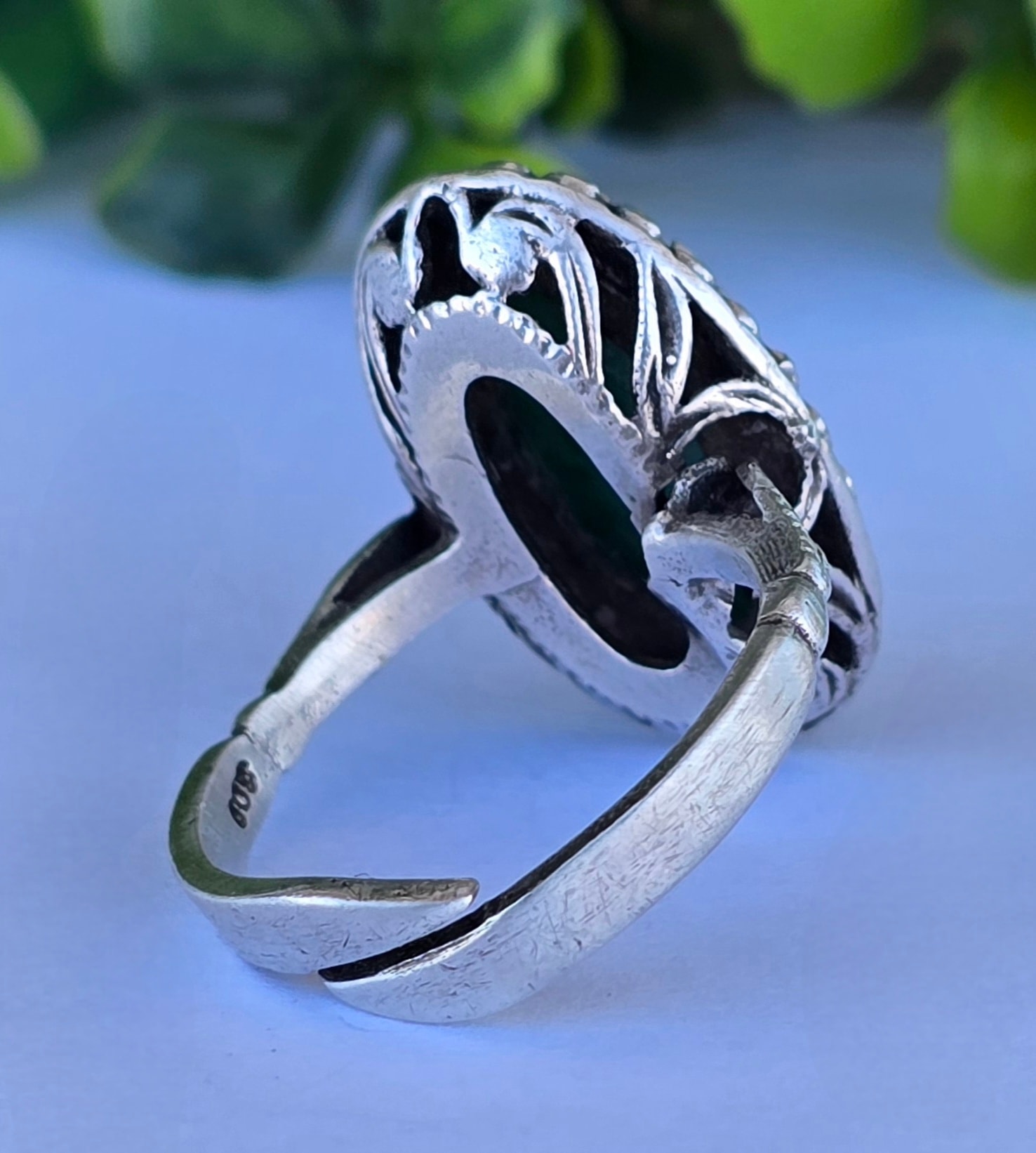 Inel vechi din argint, cu serpentinit natural.