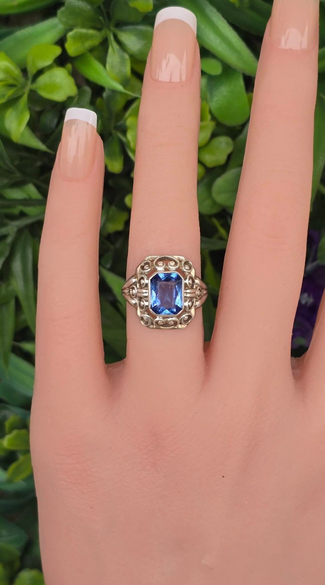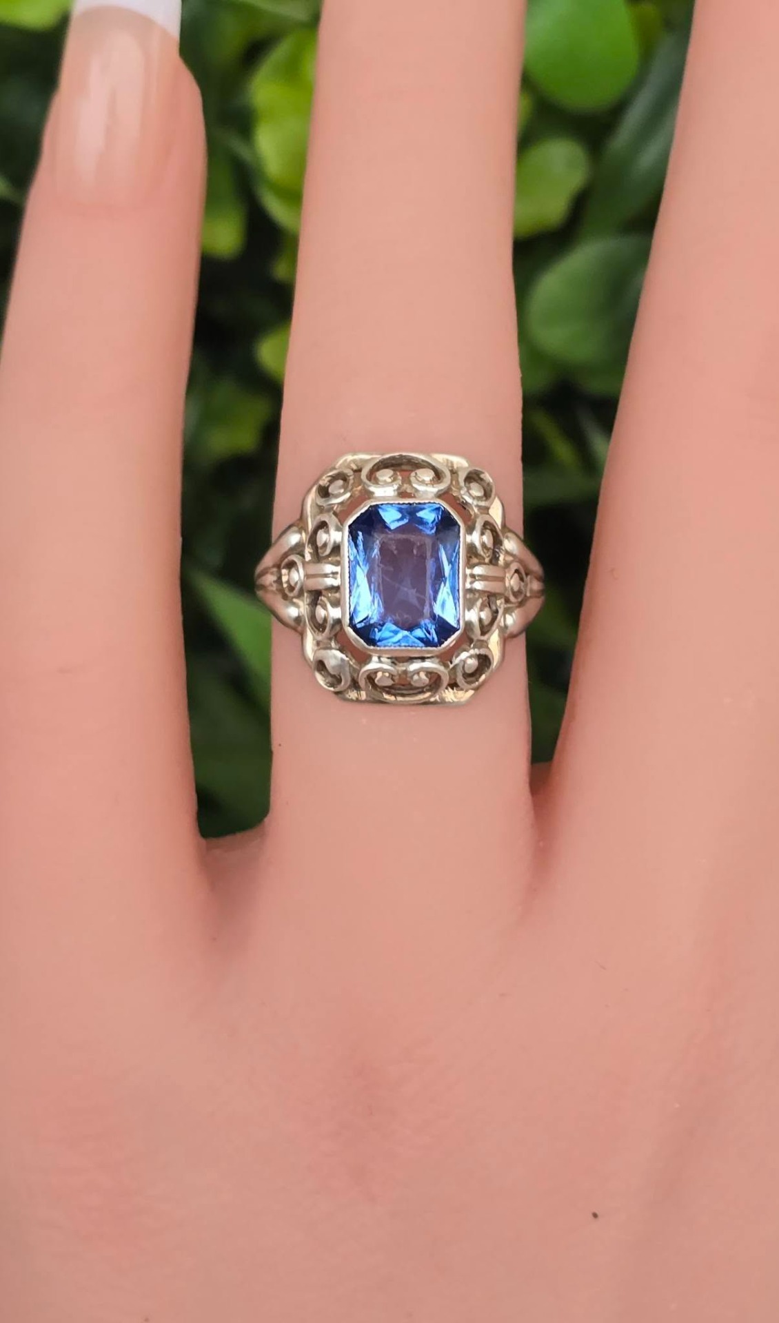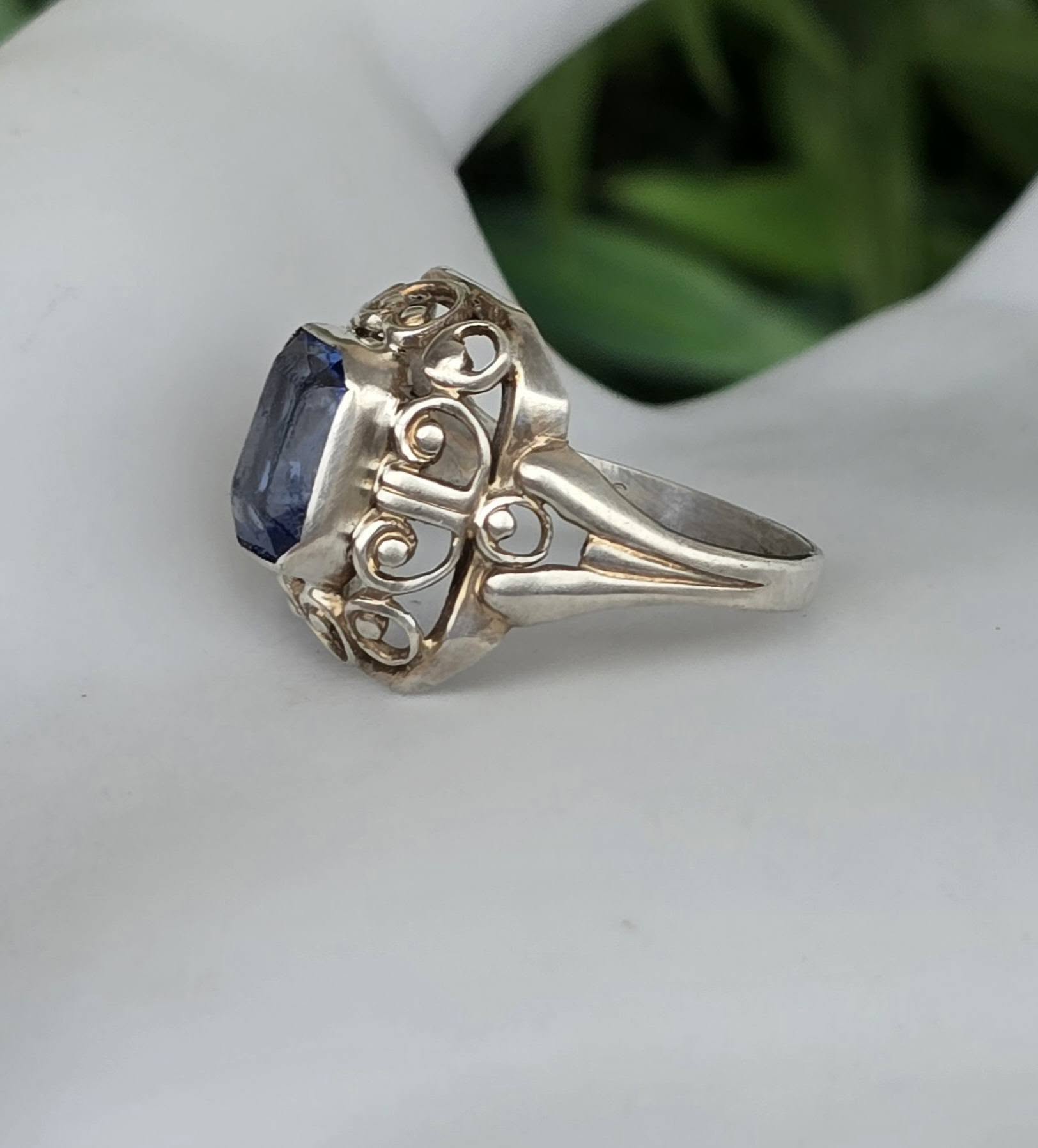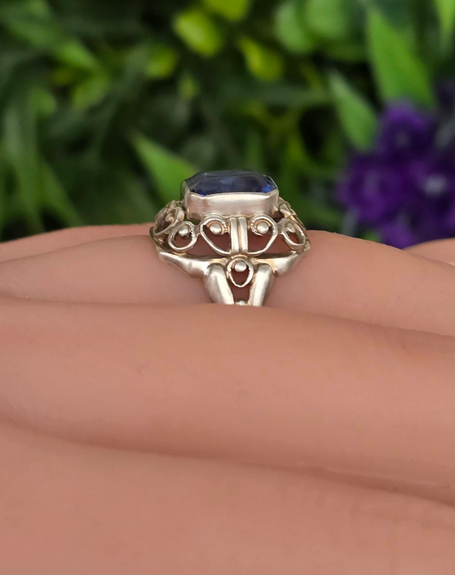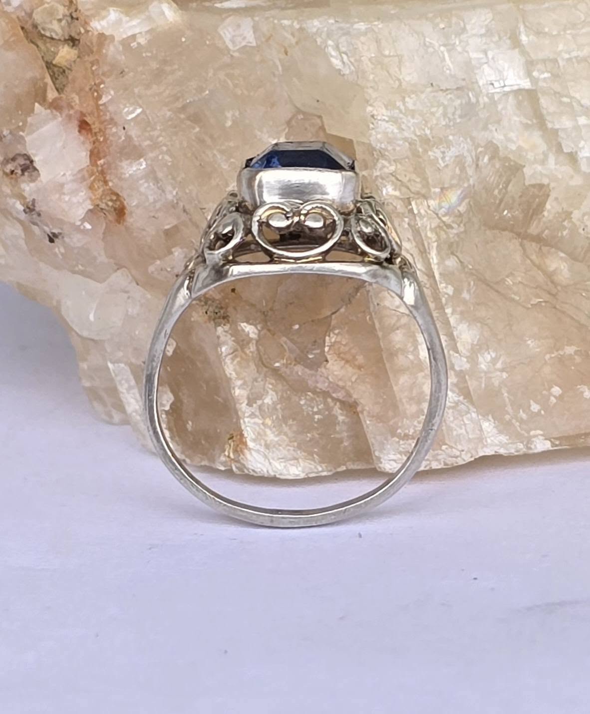 Inel vechi din argint, cu topaz simulat ("blue glass paste"), manufactură deosebită în filigran, în stil Retro cu influențe Art Deco târziu (anii 1940-1950,