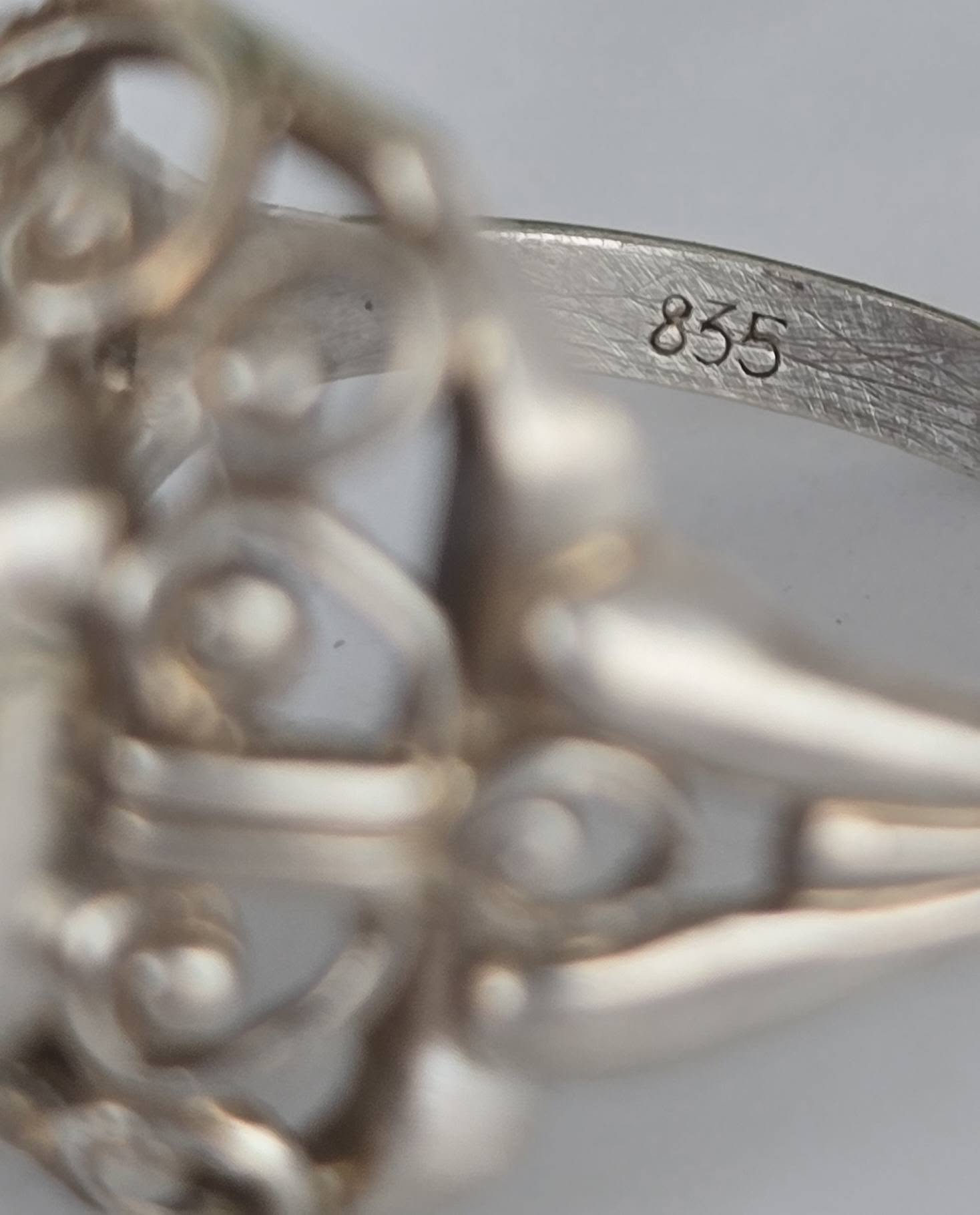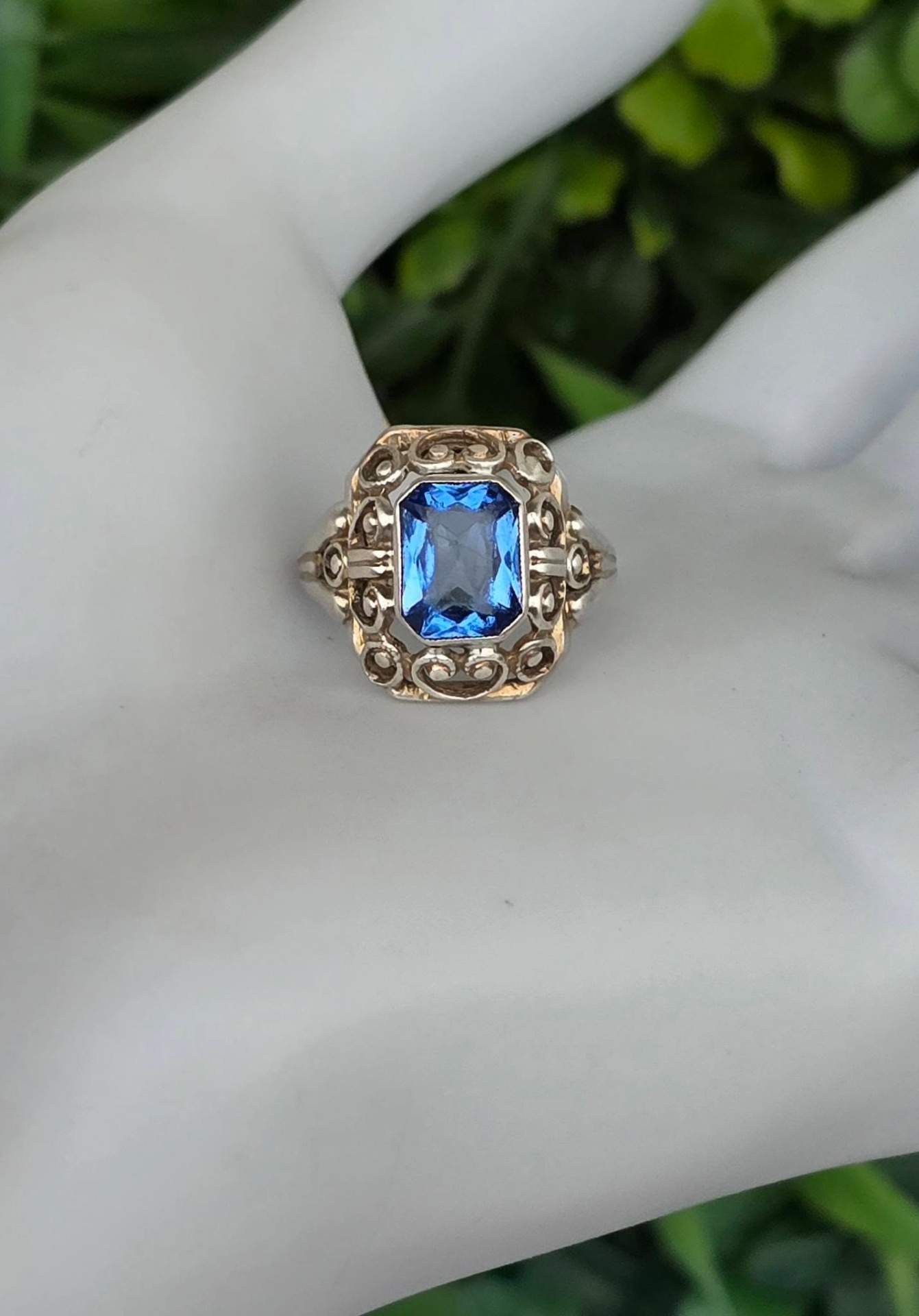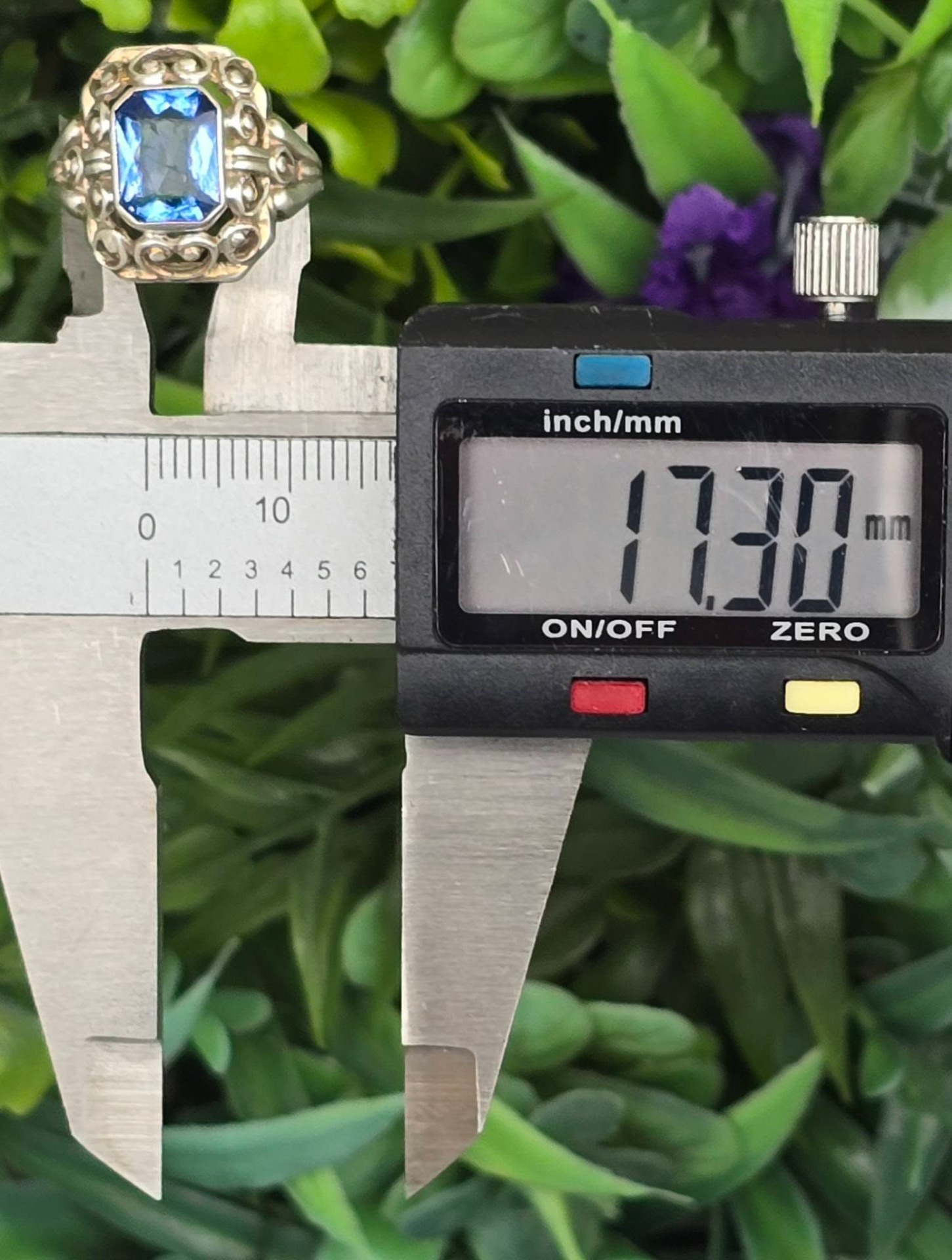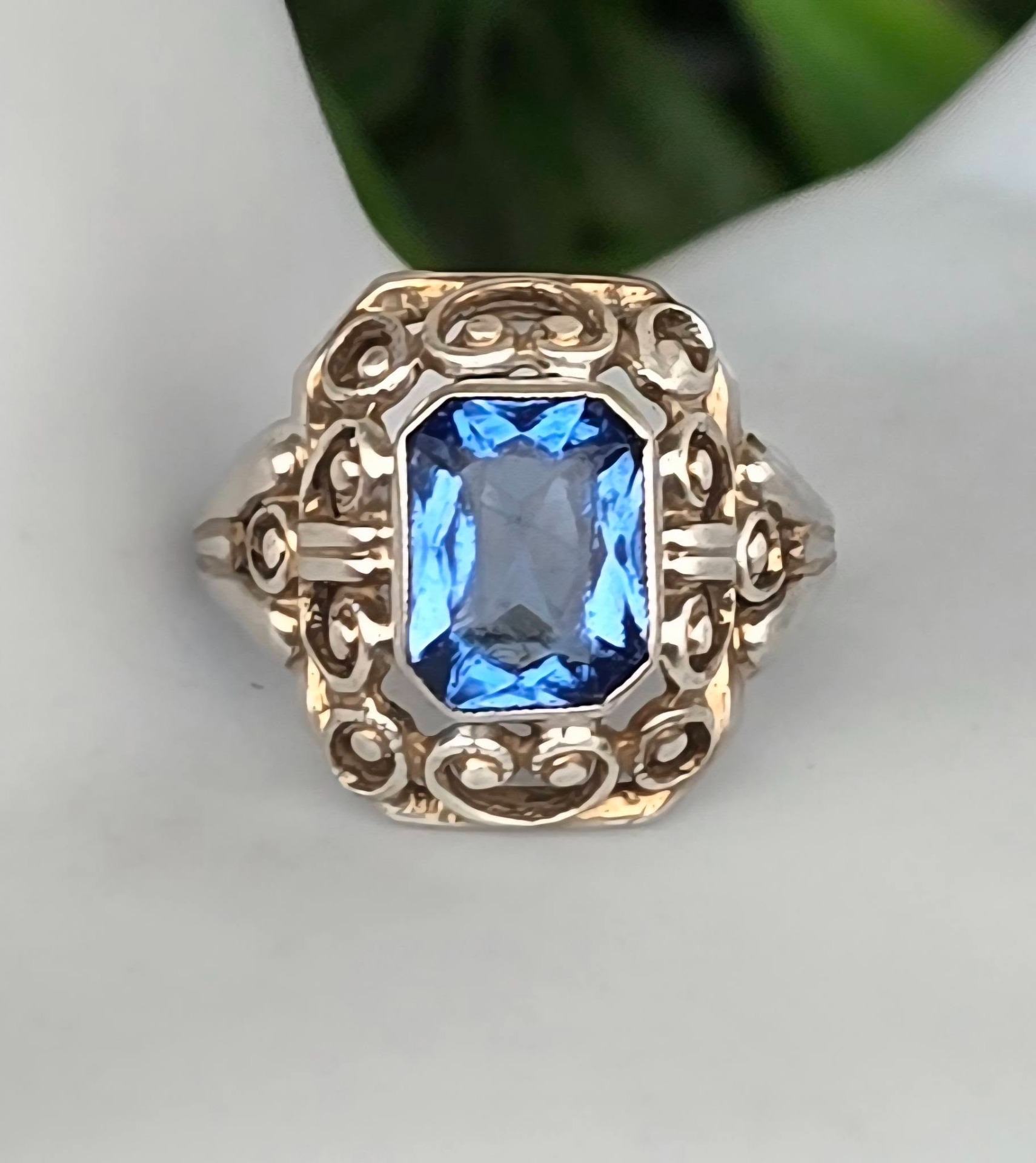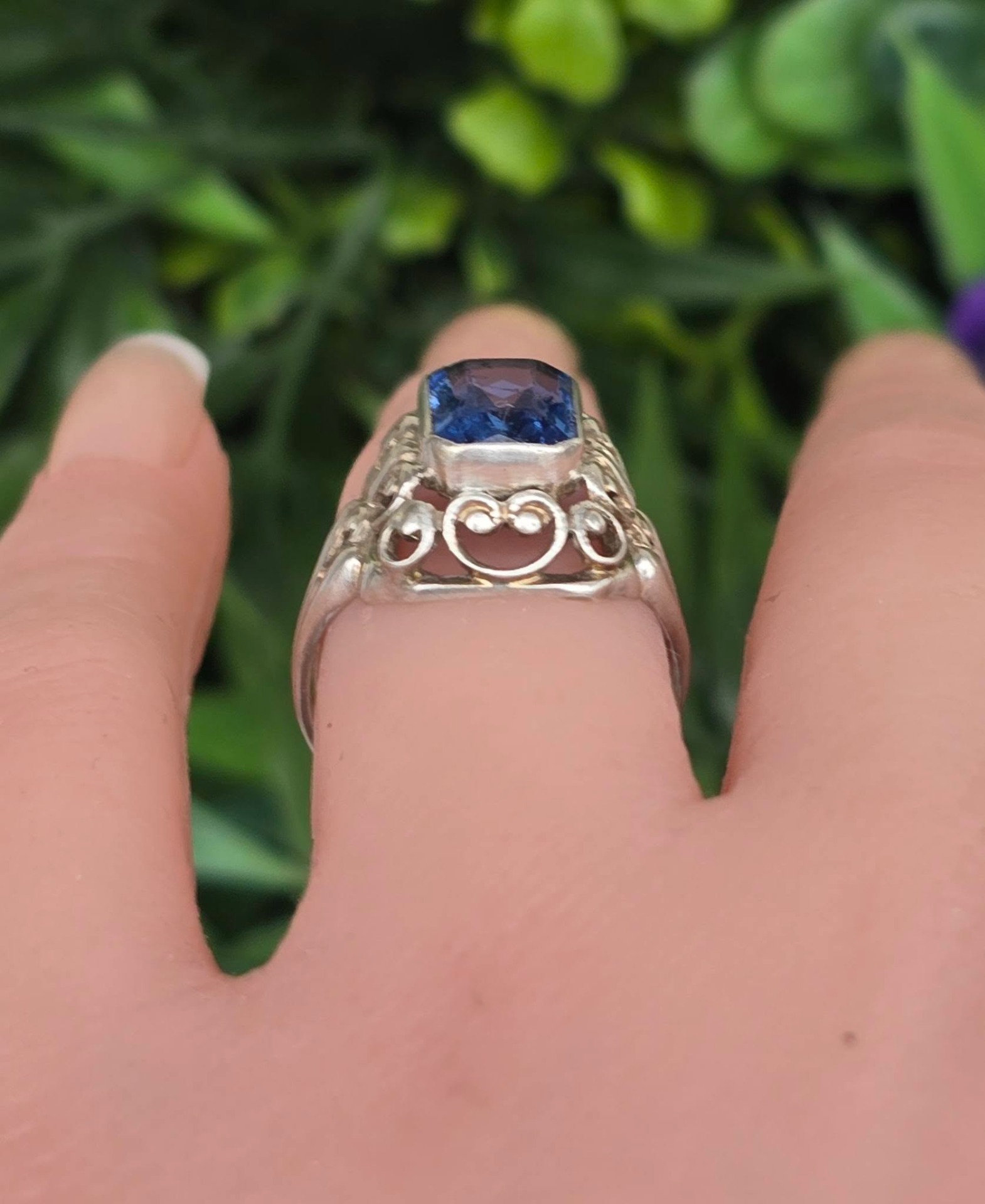 Inel vechi din argint, cu topaz simulat ("blue glass paste"), manufactură deosebită în filigran, în stil Retro cu influențe Art Deco târziu (anii 1940-1950,
