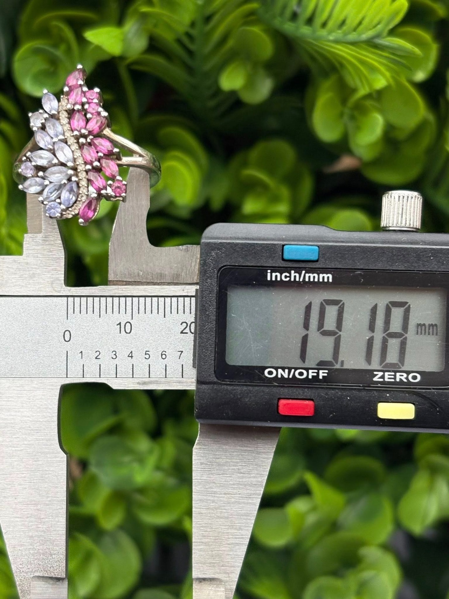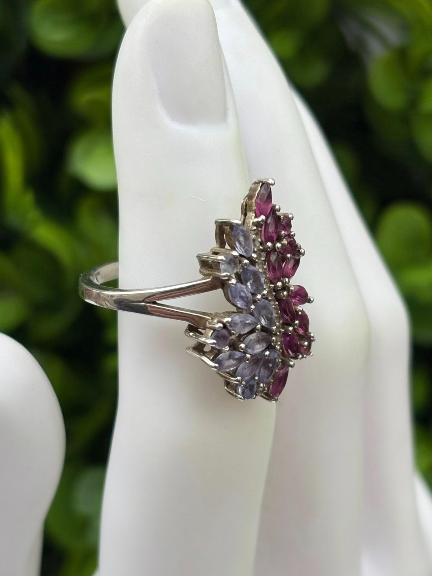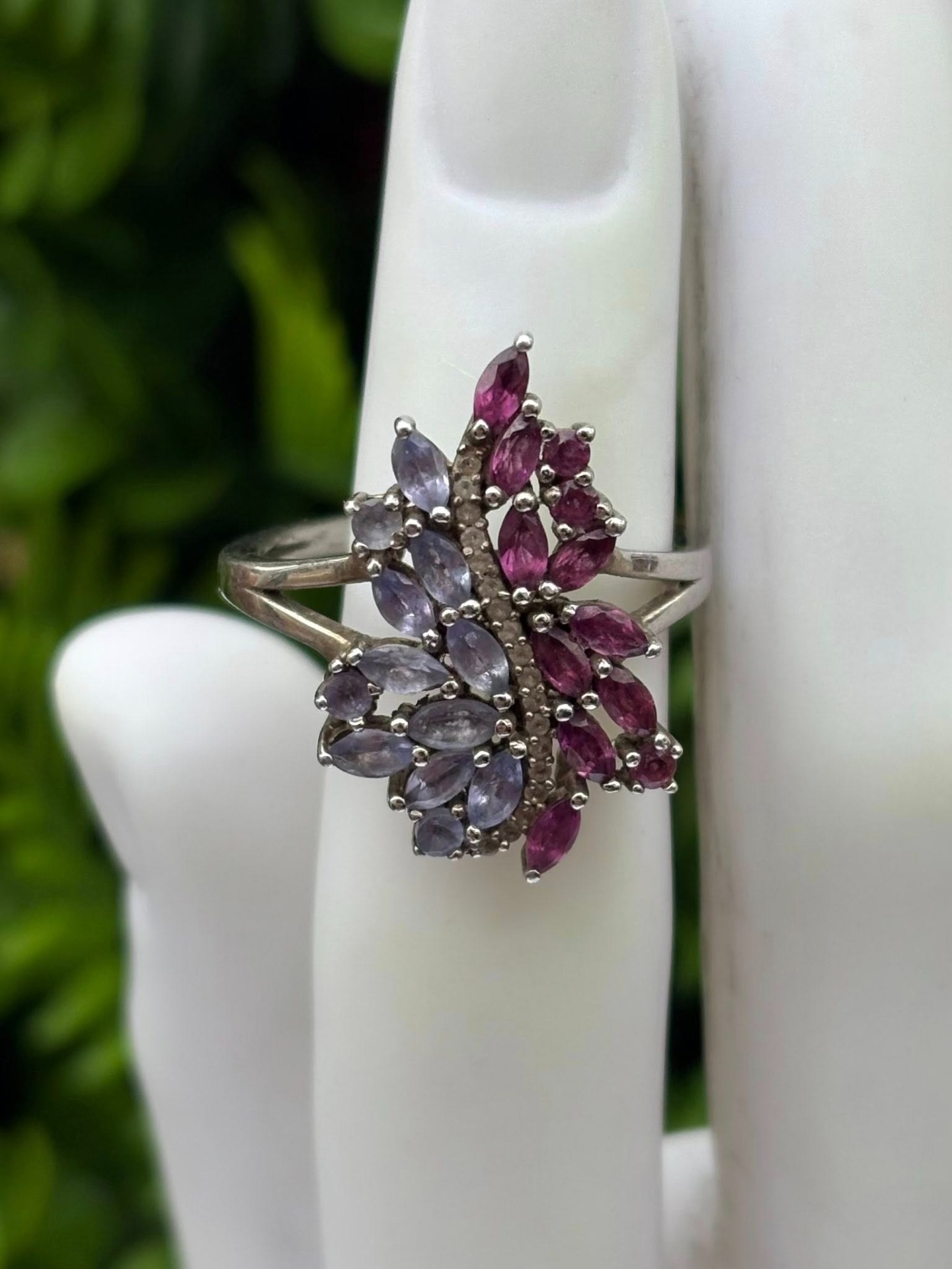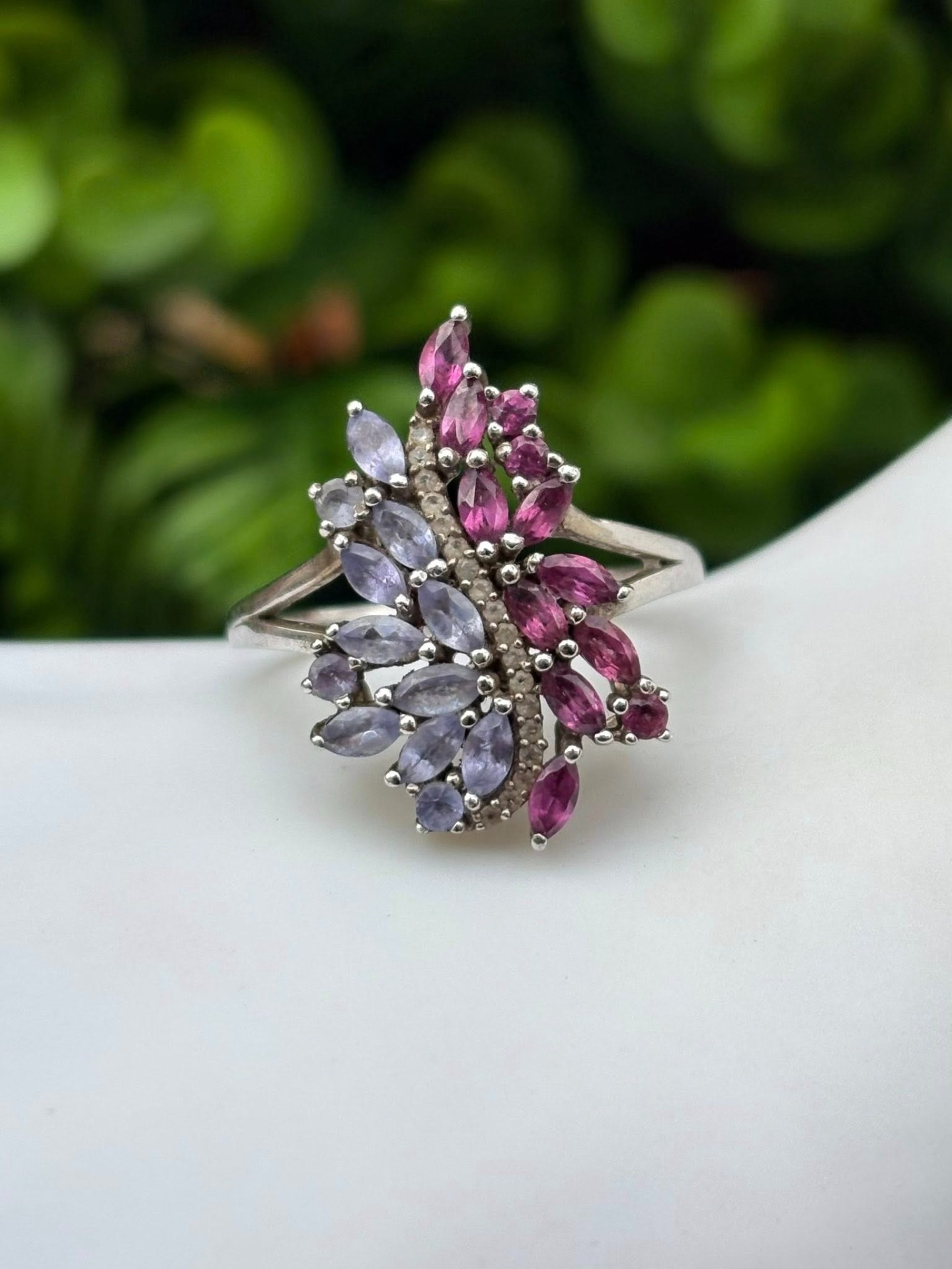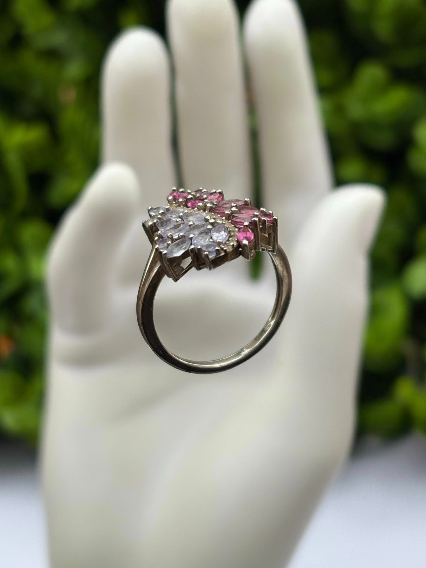 Inel vechi din argint, cu topaze roz și tanzanite naturale.
