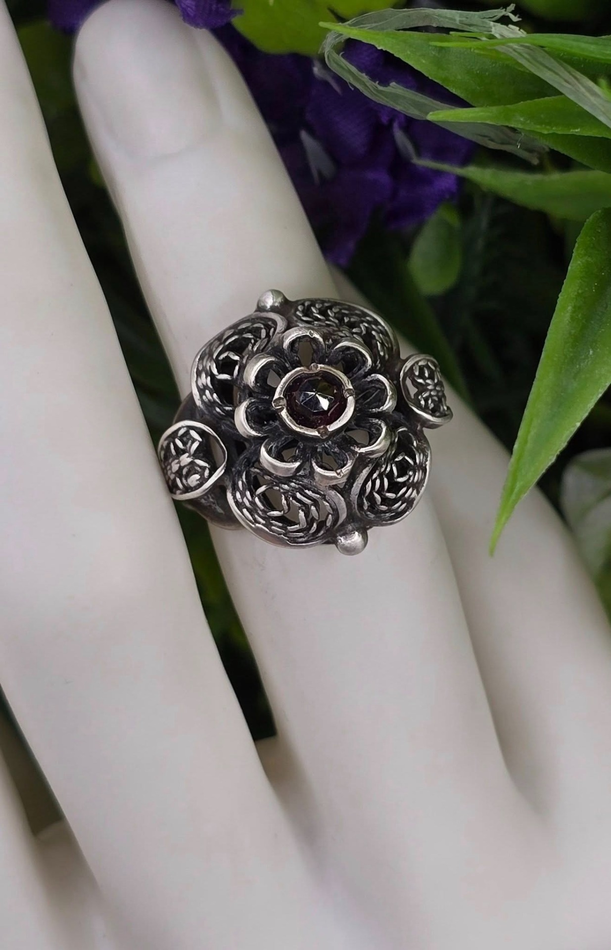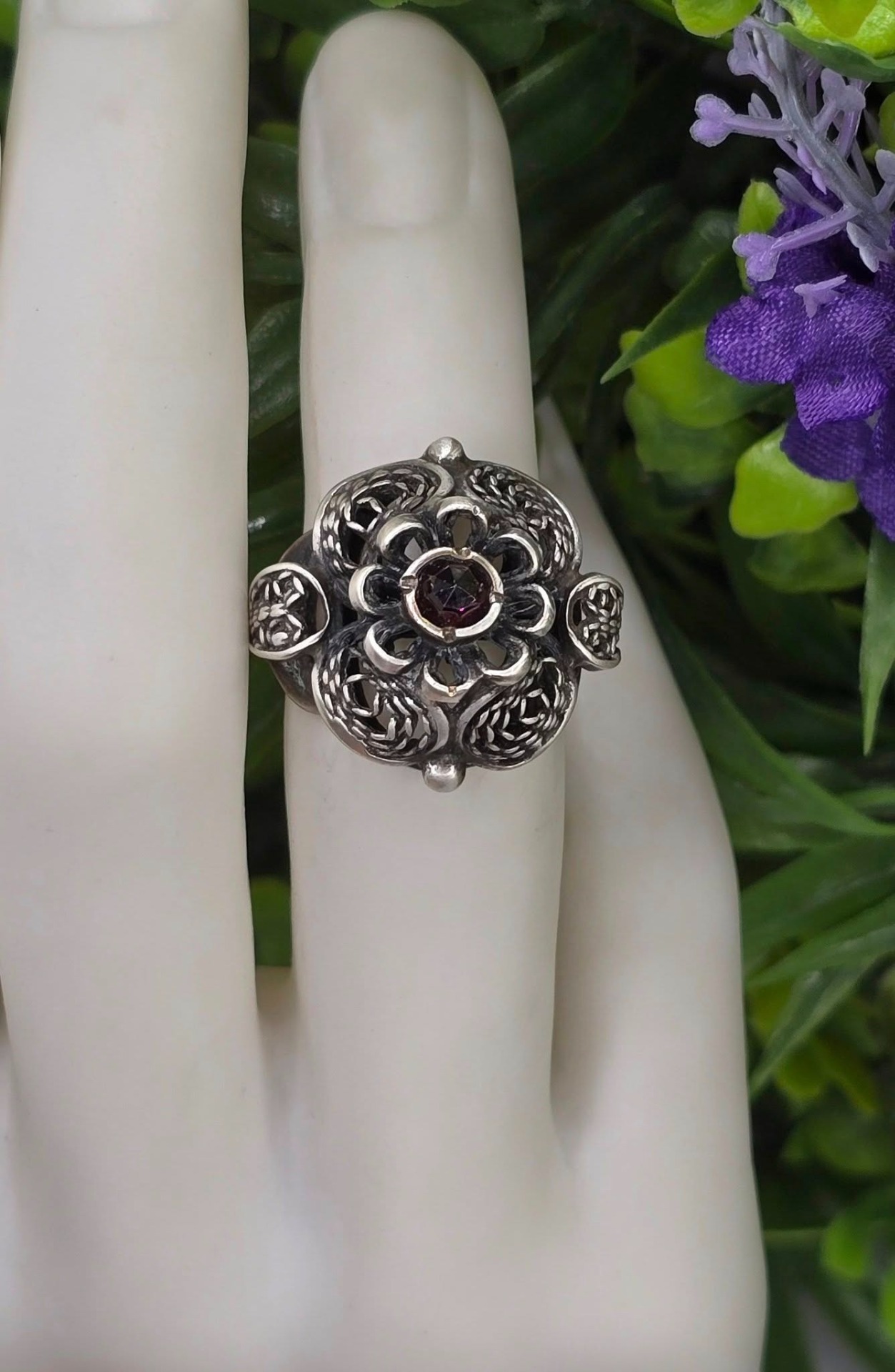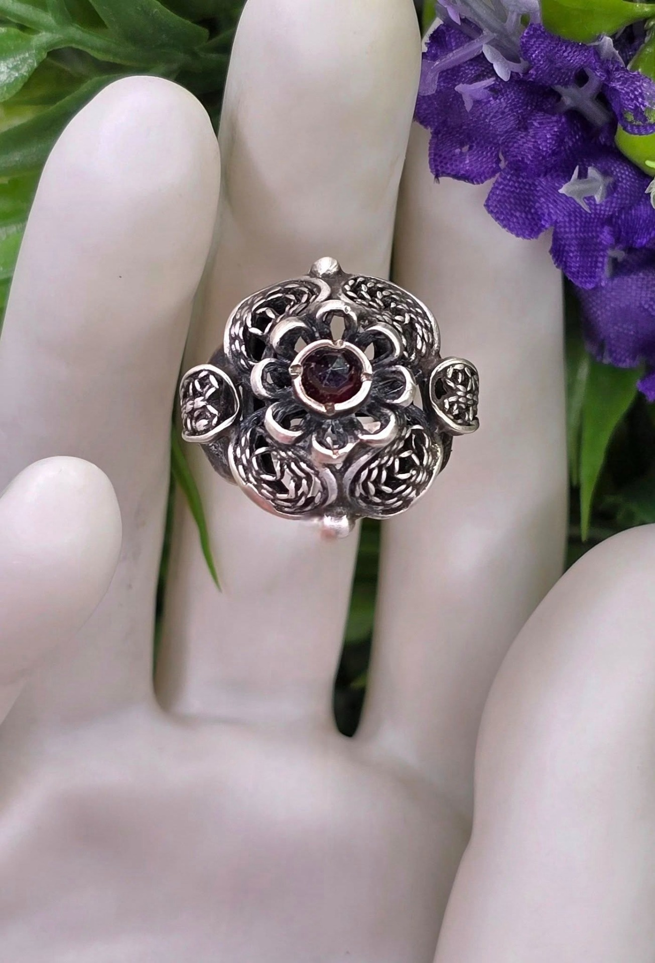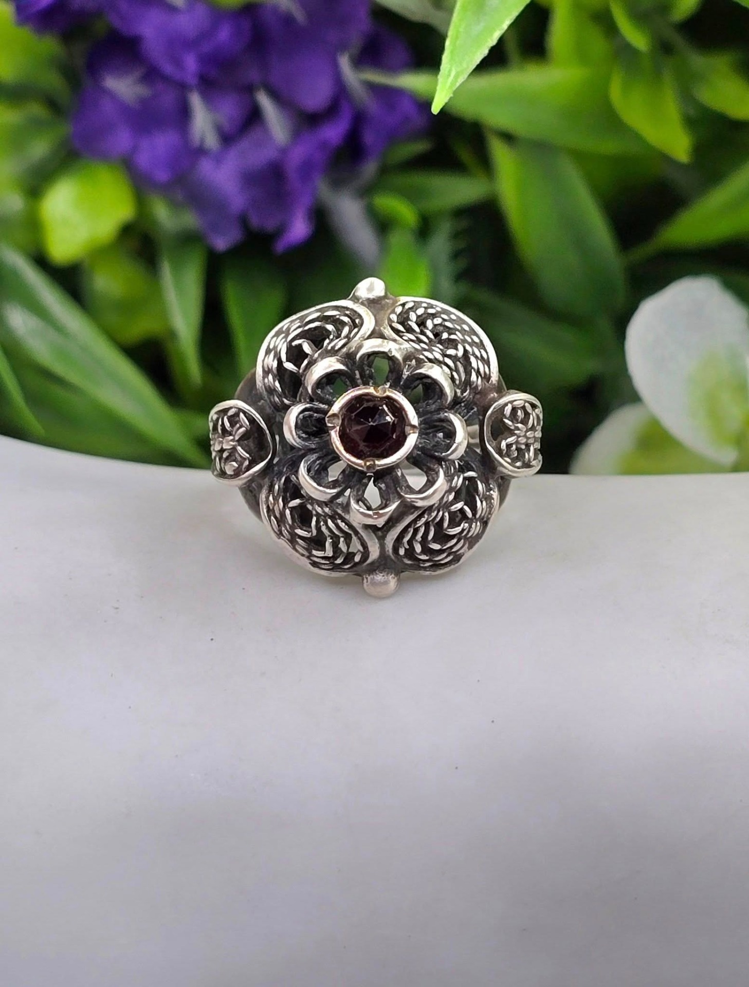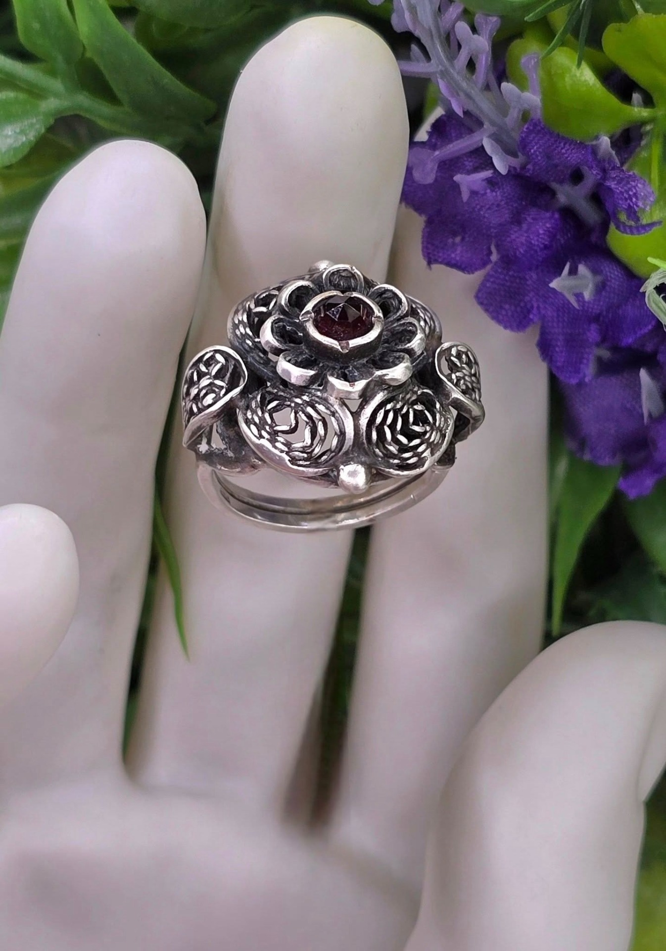 Inel vechi din argint, de colecție, cu granat Bohemia natural, manufactură de atelier austriac în filigran tridimensional "cannetille", în motiv floral (anii 1920-1930, Austria).