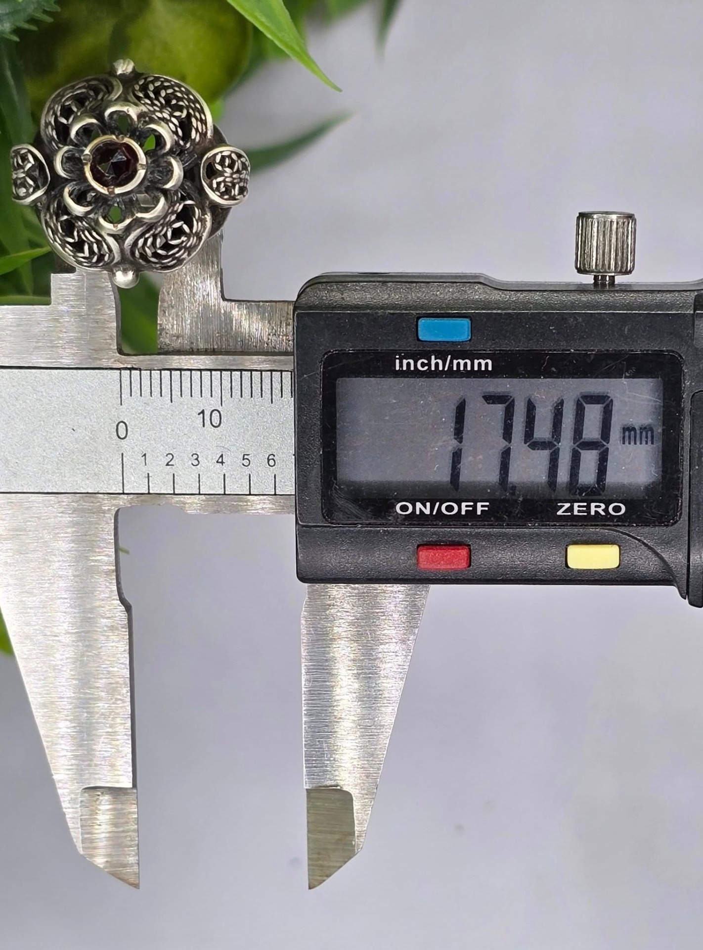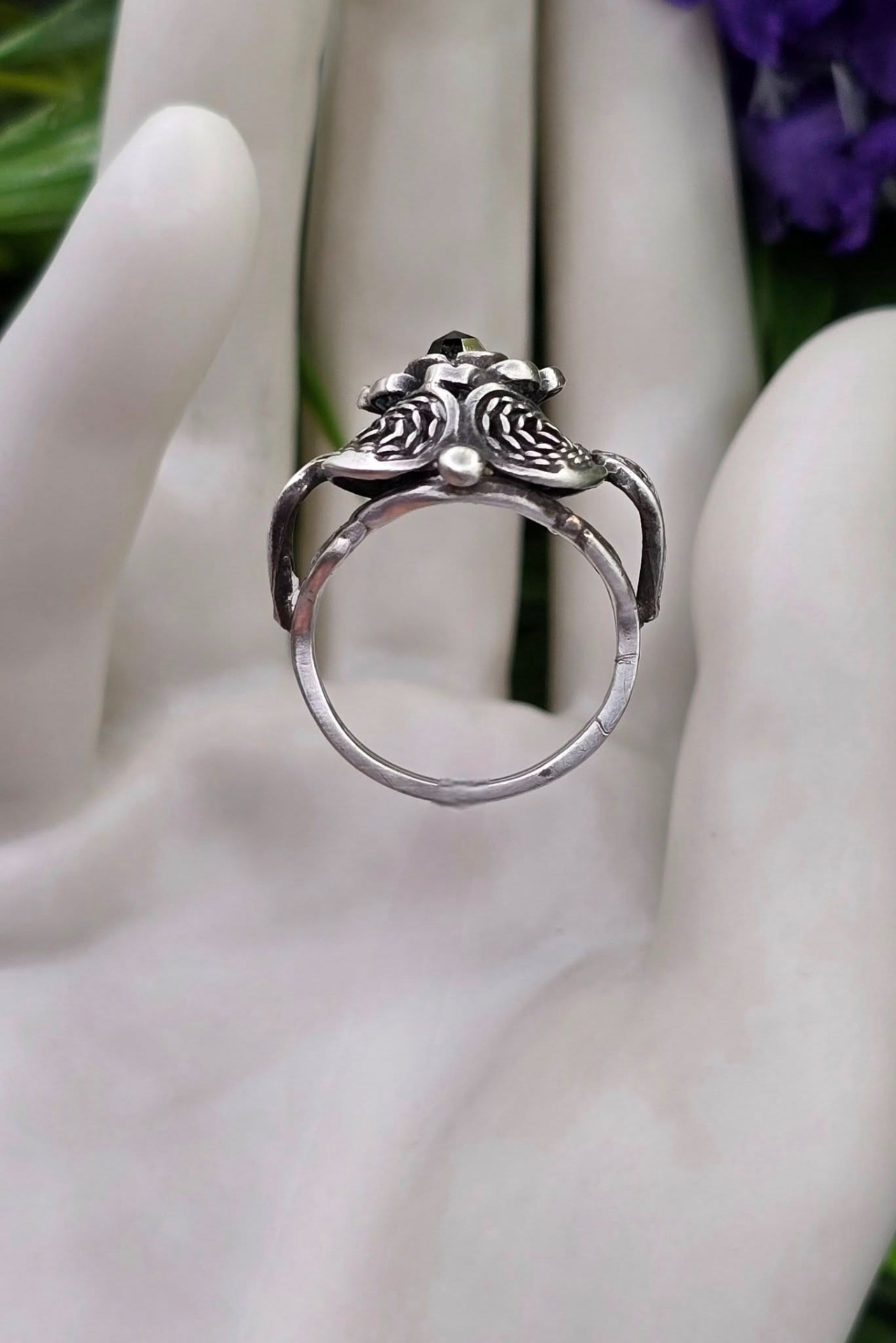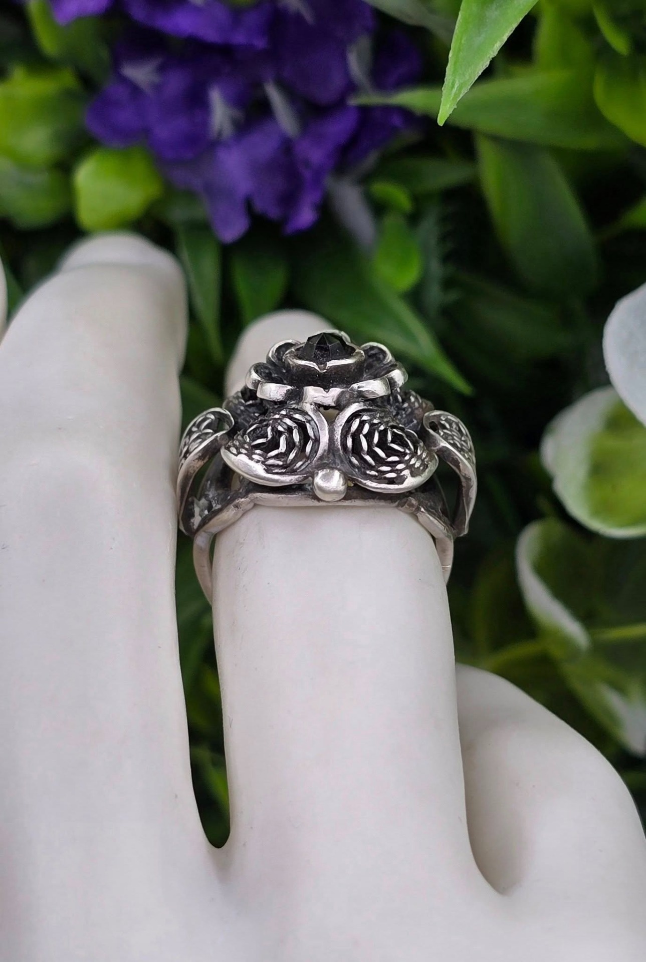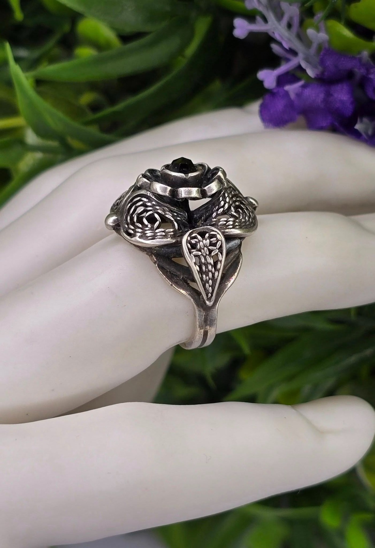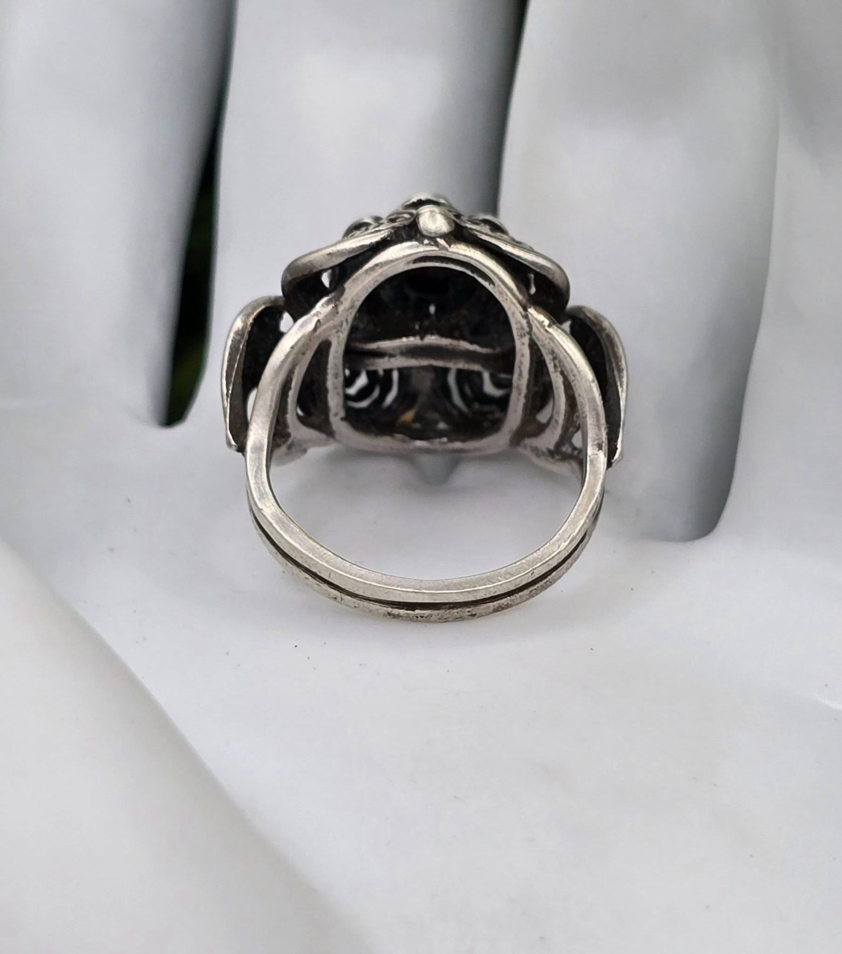 Inel vechi din argint, de colecție, cu granat Bohemia natural, manufactură de atelier austriac în filigran tridimensional "cannetille", în motiv floral (anii 1920-1930, Austria).