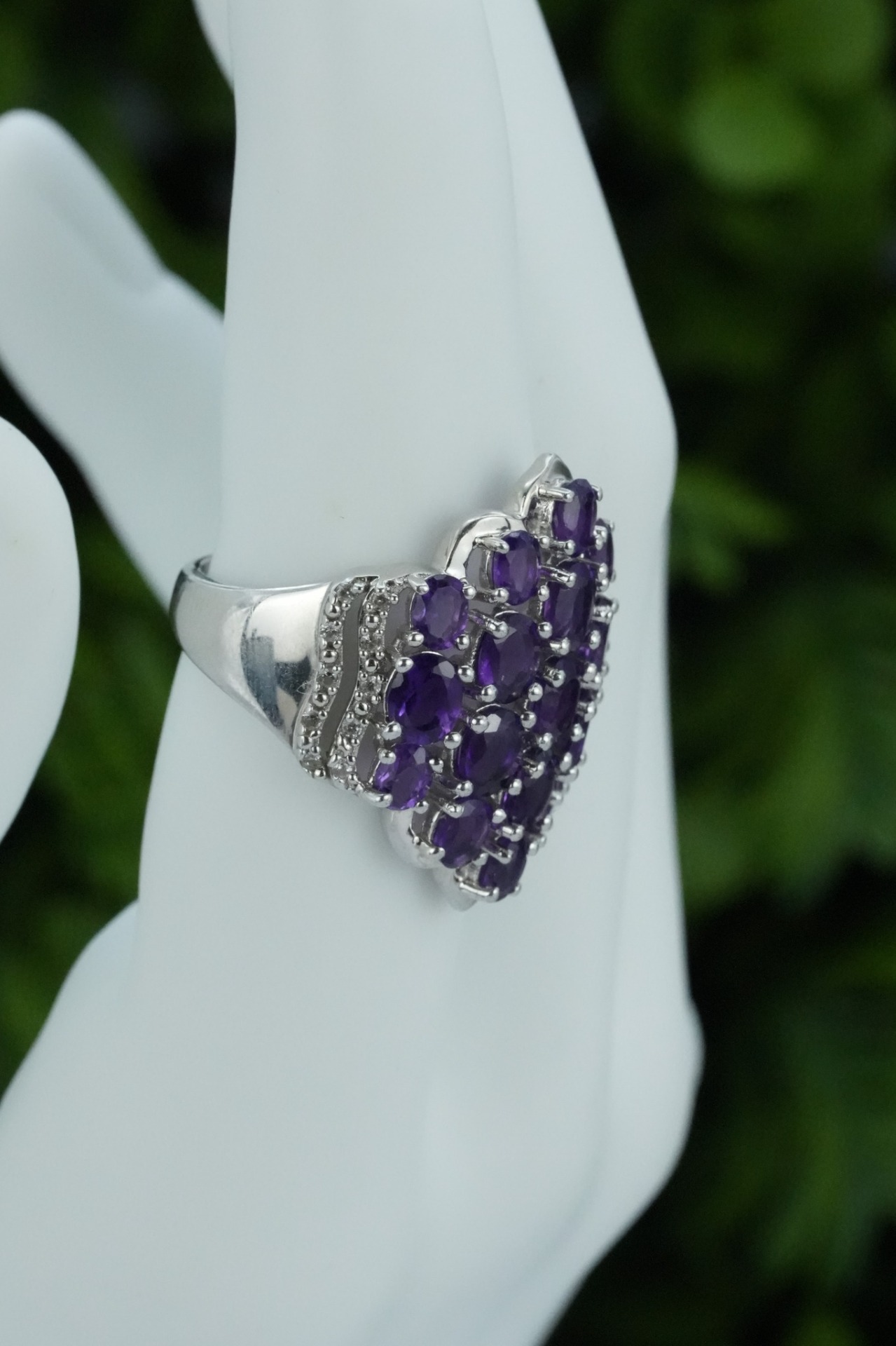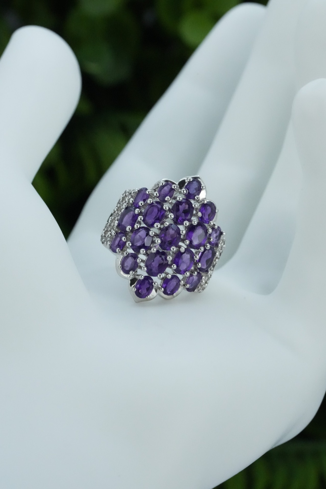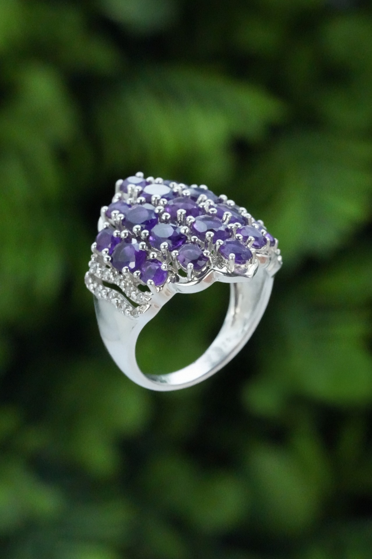 Inel vechi din argint, deosebit, cu ametiste și topaze albe naturale.
