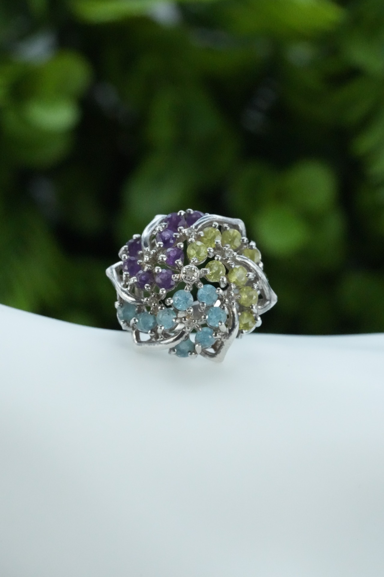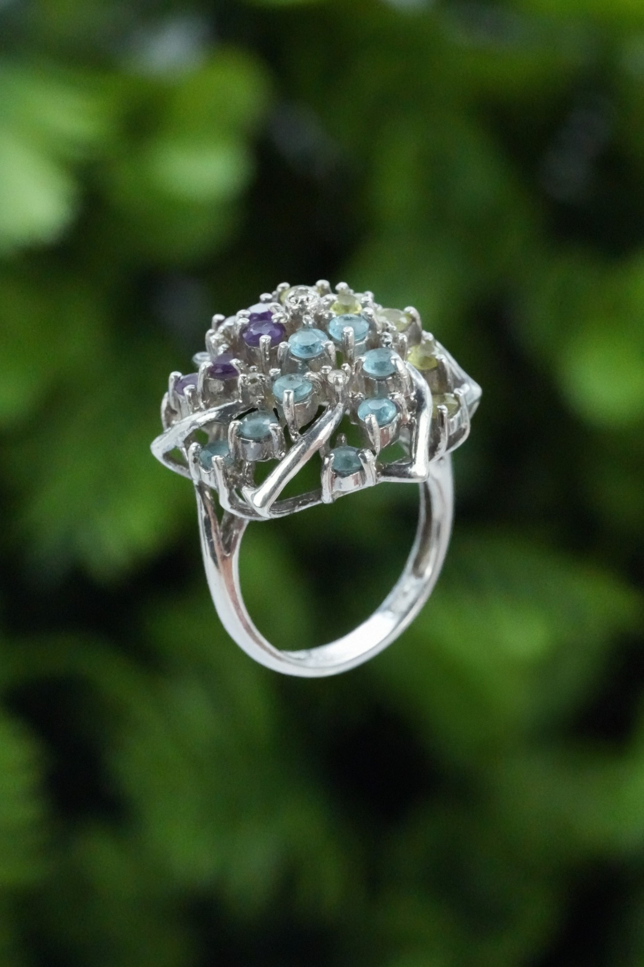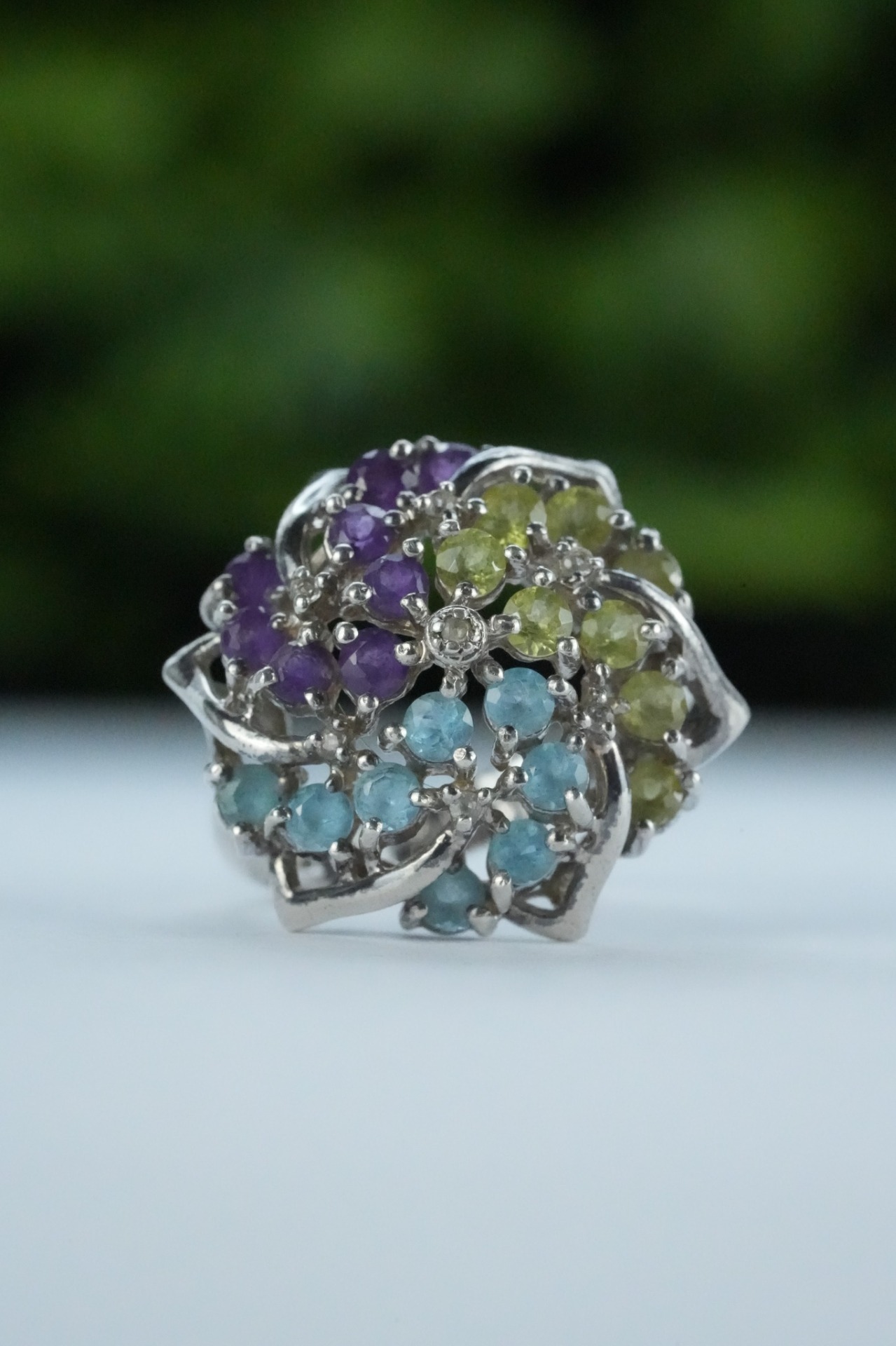 Inel vechi din argint, deosebit, cu topaze, ametiste și peridot naturale.