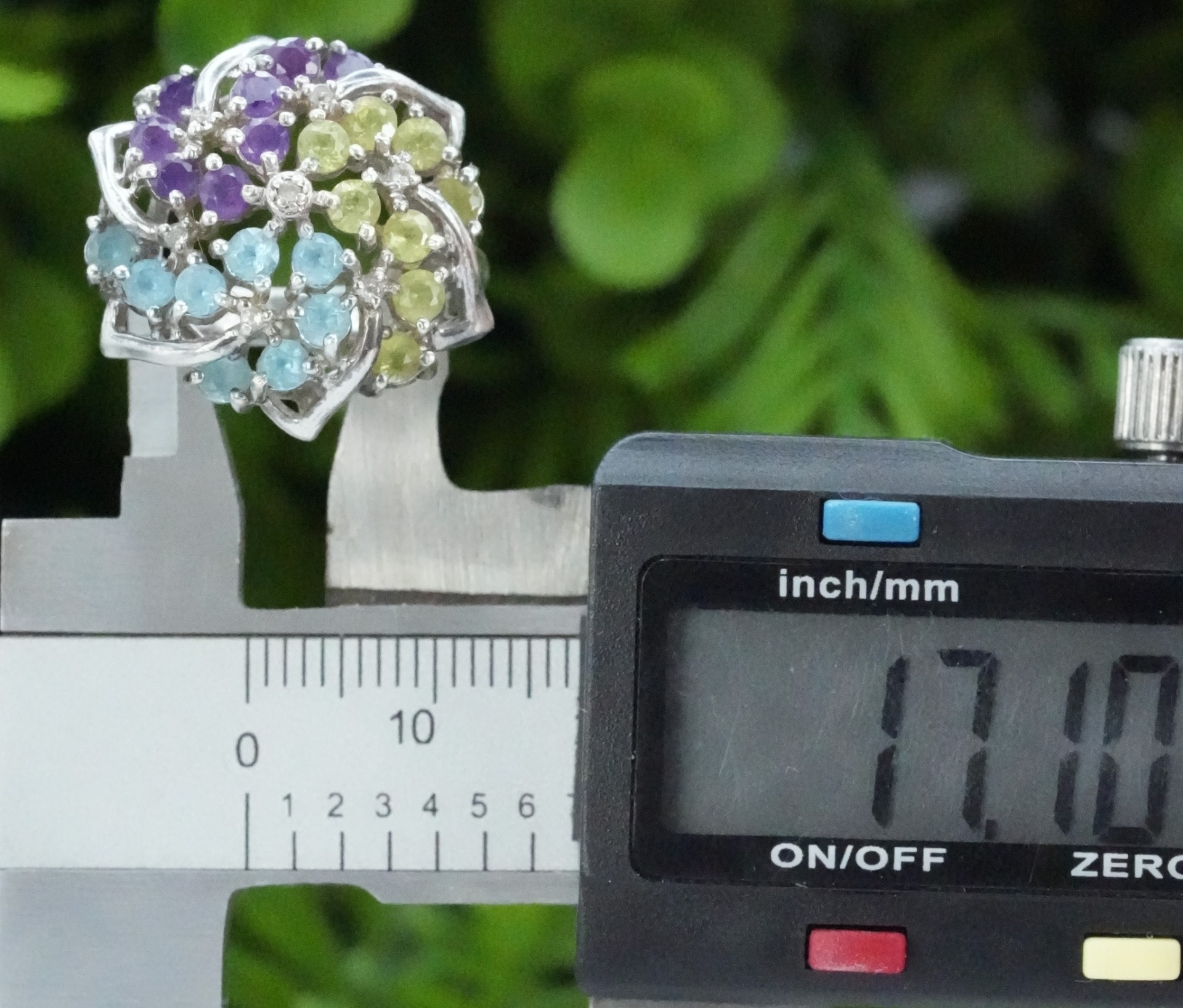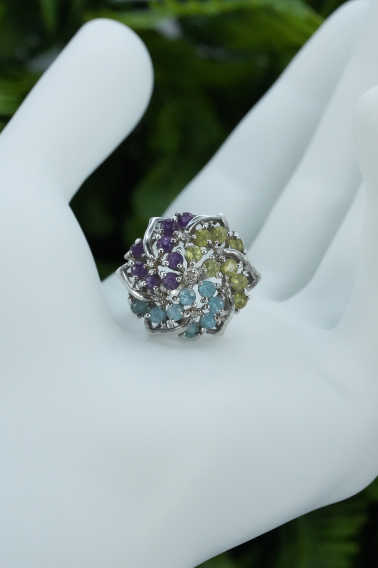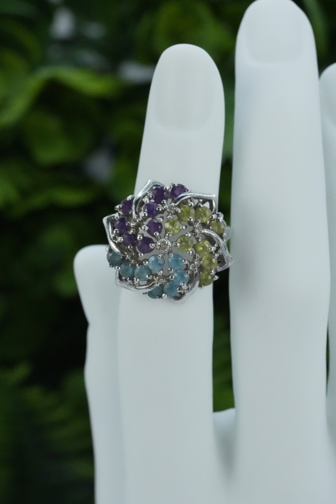 Inel vechi din argint, deosebit, cu topaze, ametiste și peridot naturale.