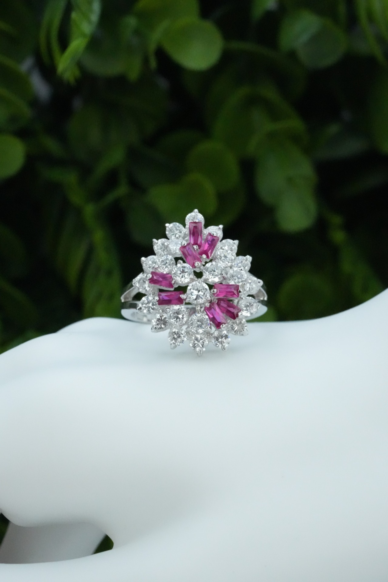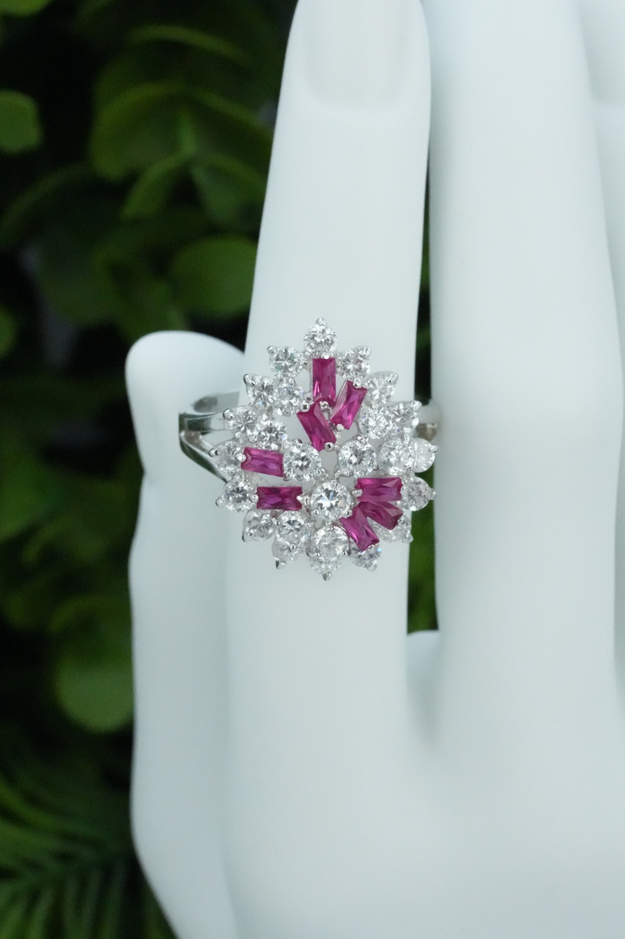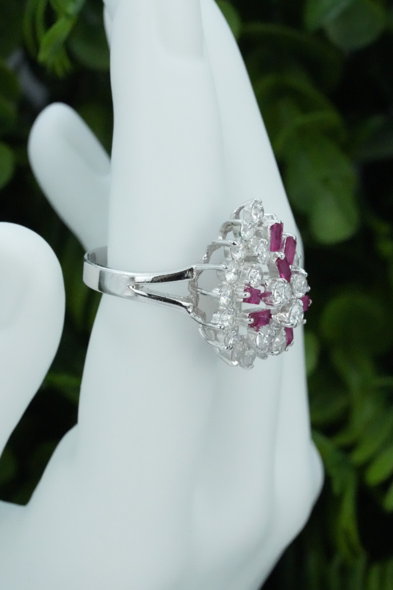 Inel vechi din argint, spectaculos, cu 8 rubine naturale și pietre cubic zirconia.