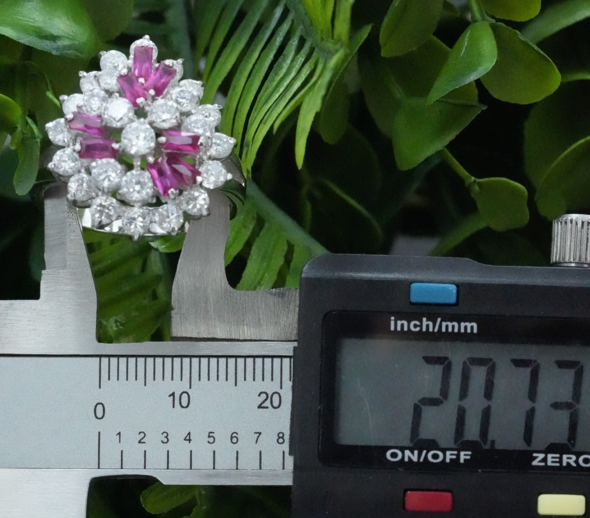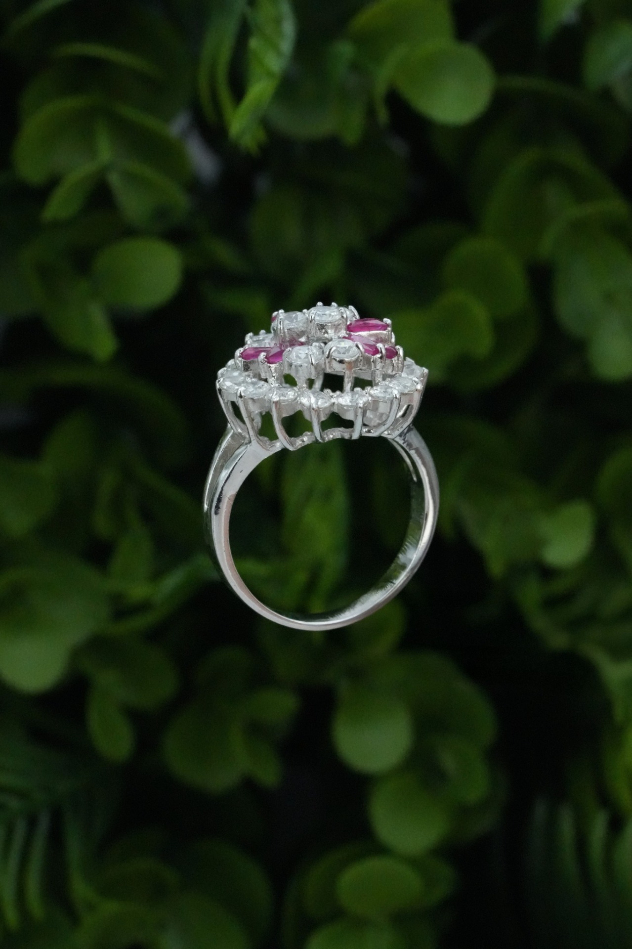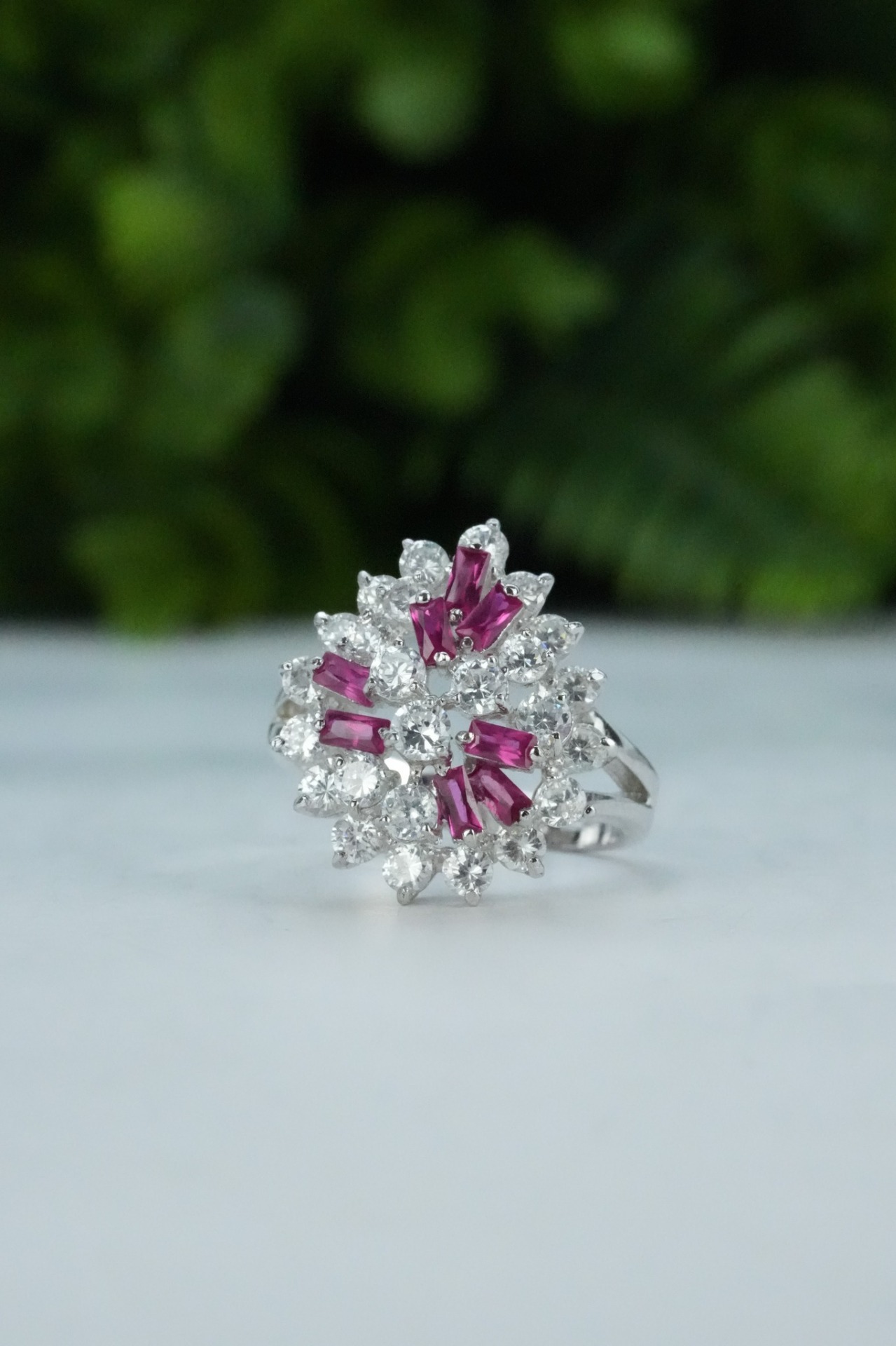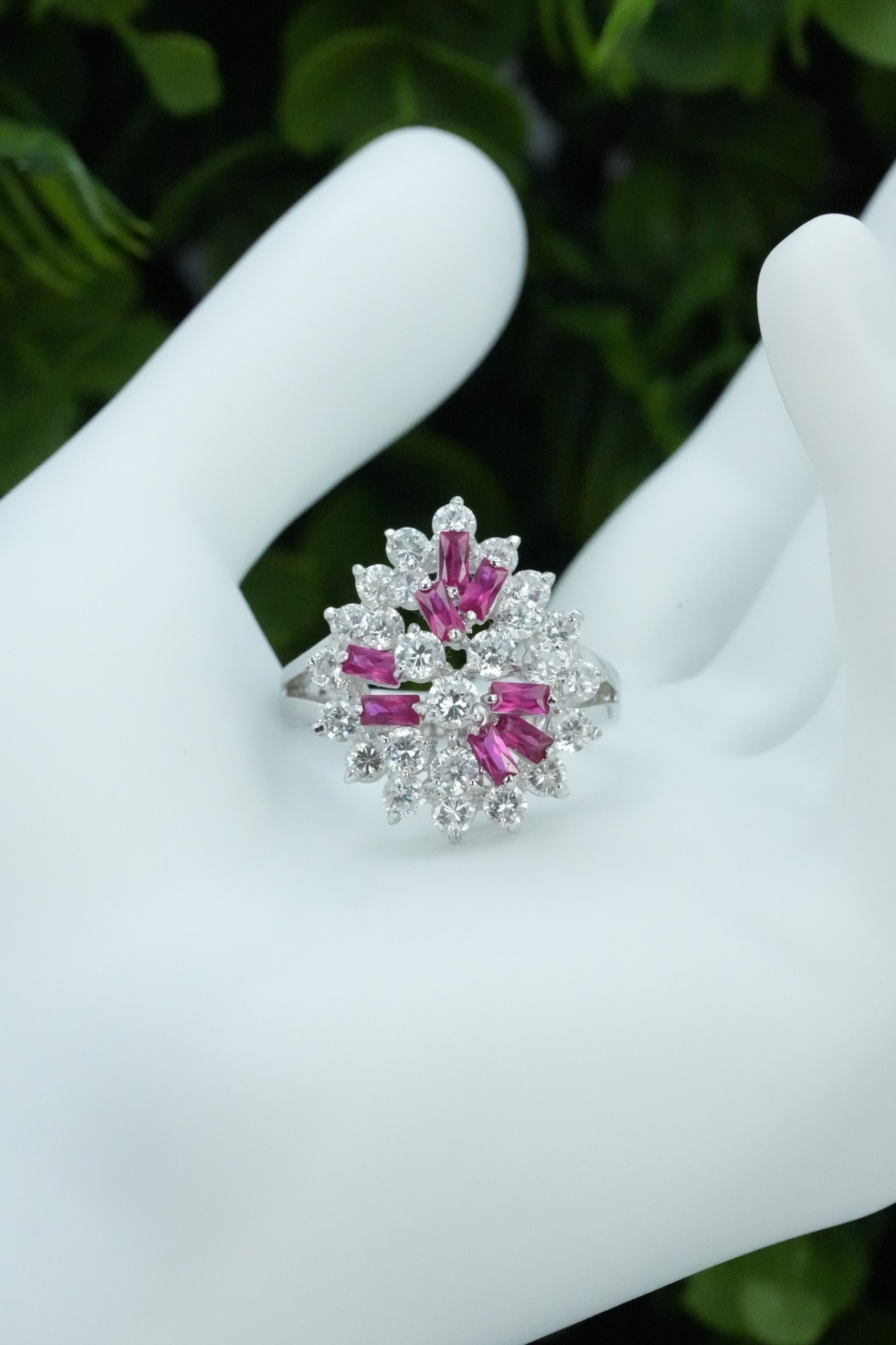 Inel vechi din argint, spectaculos, cu 8 rubine naturale și pietre cubic zirconia.