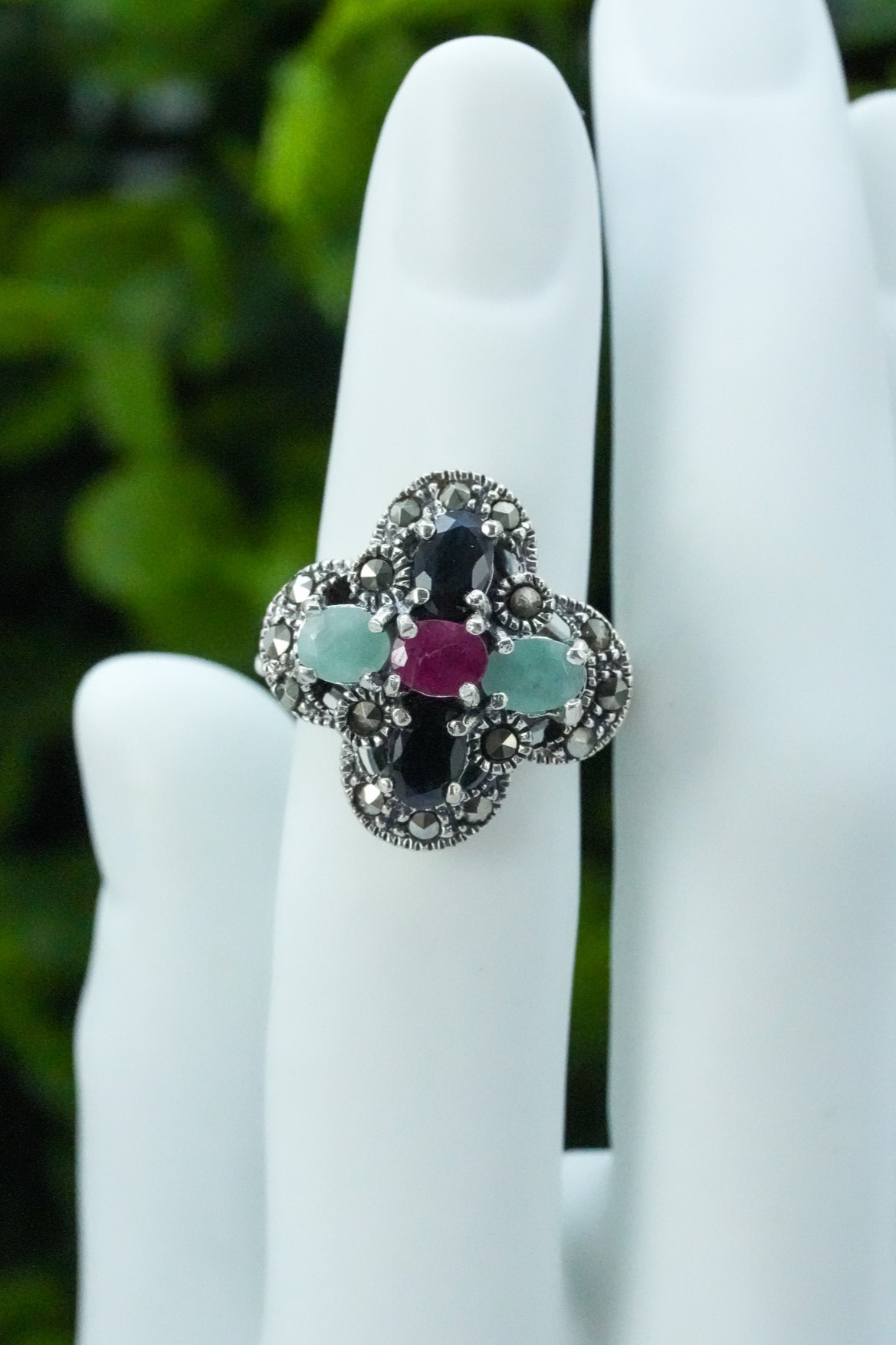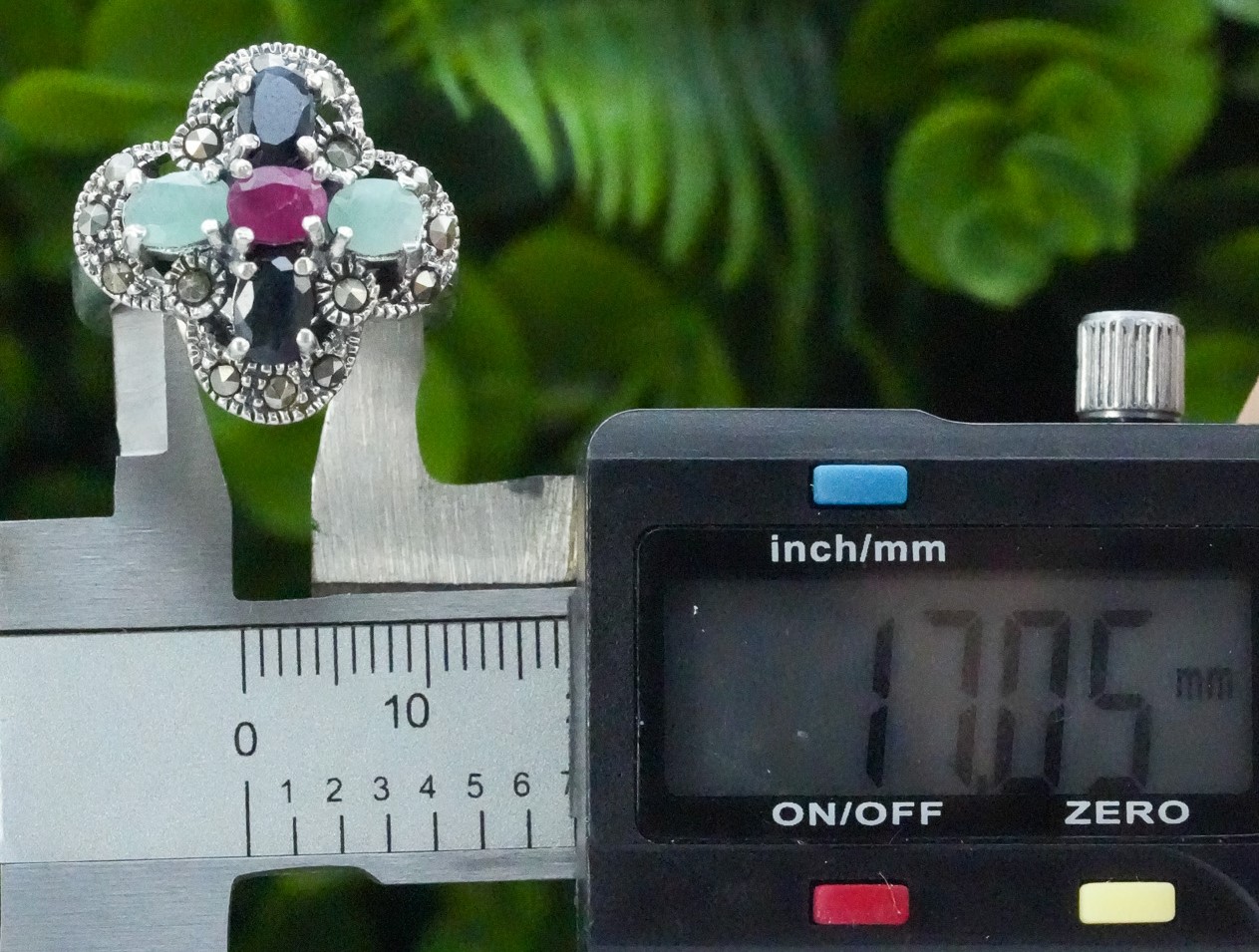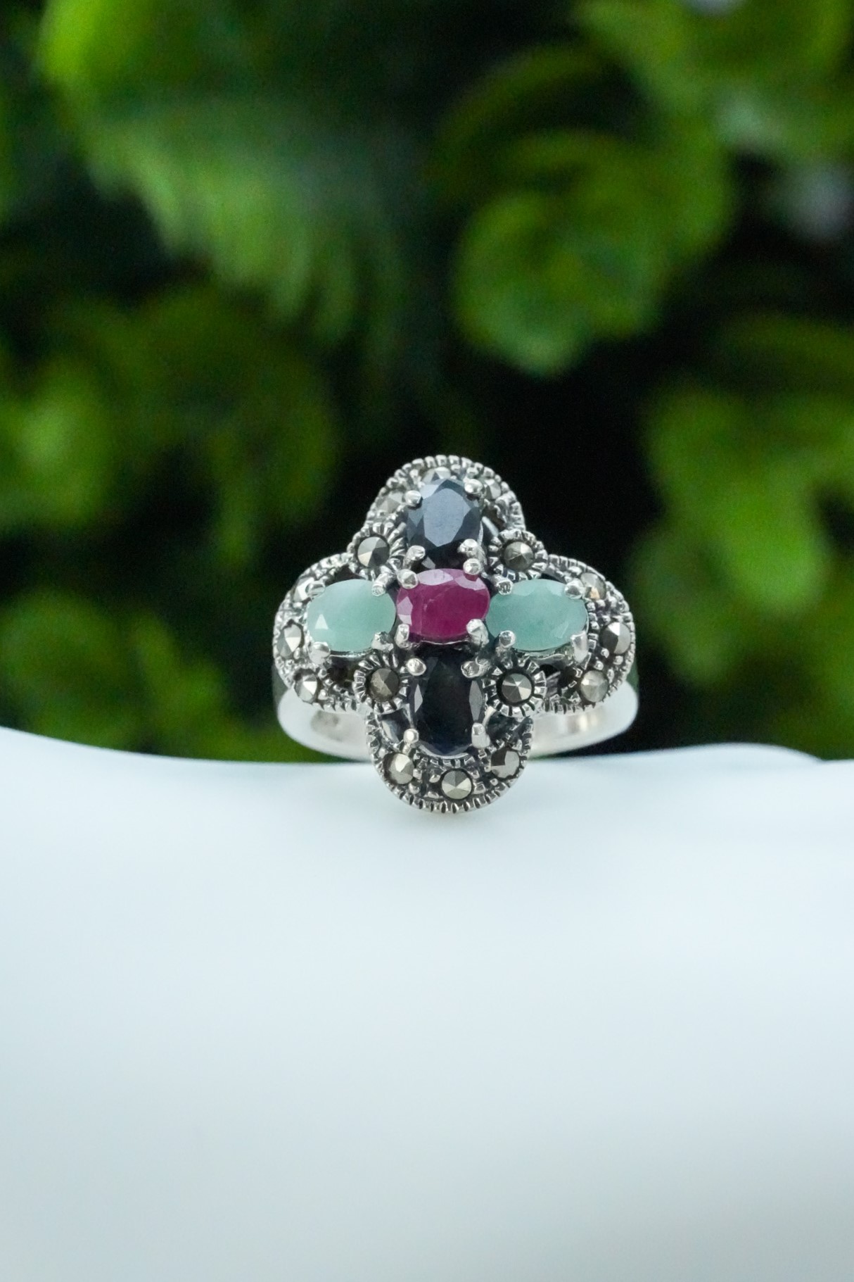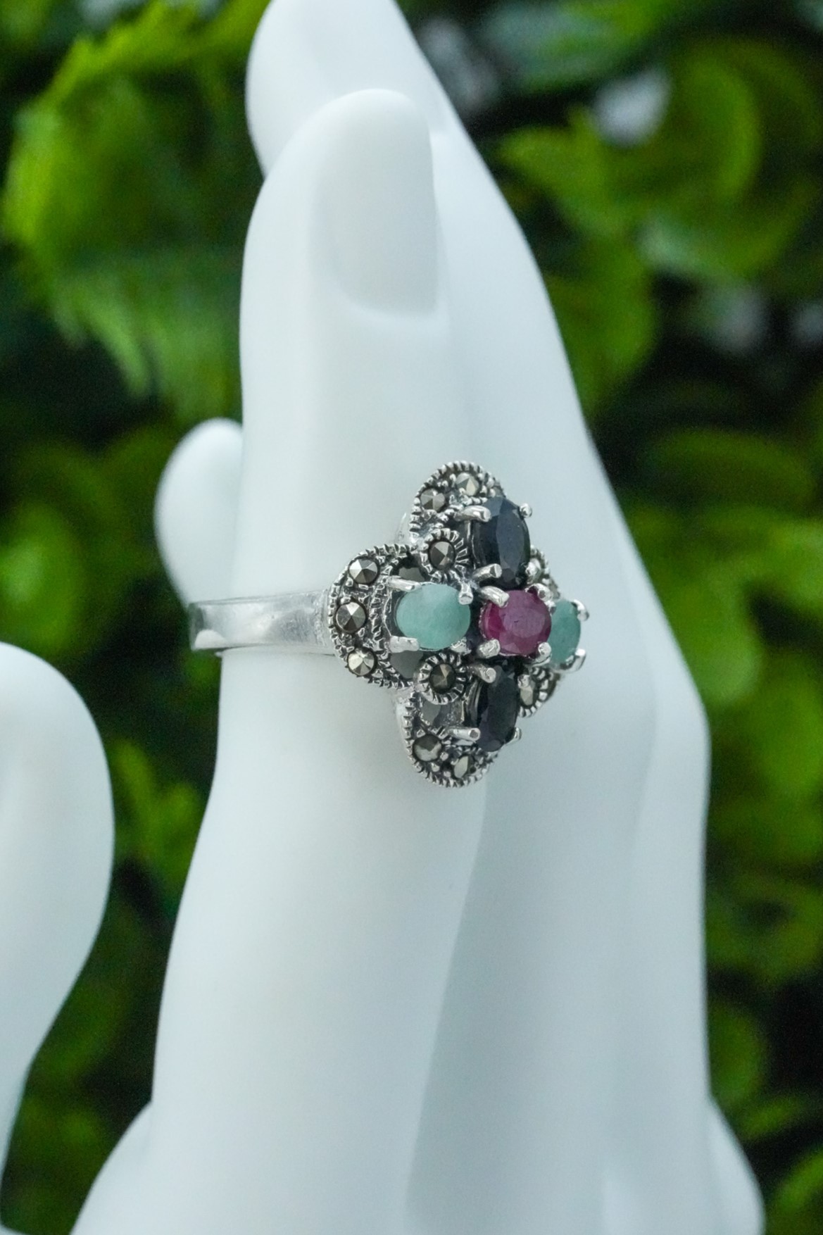 Inel vechi din argint, superb, cu rubin, safire și smaralde naturale și marcasite.