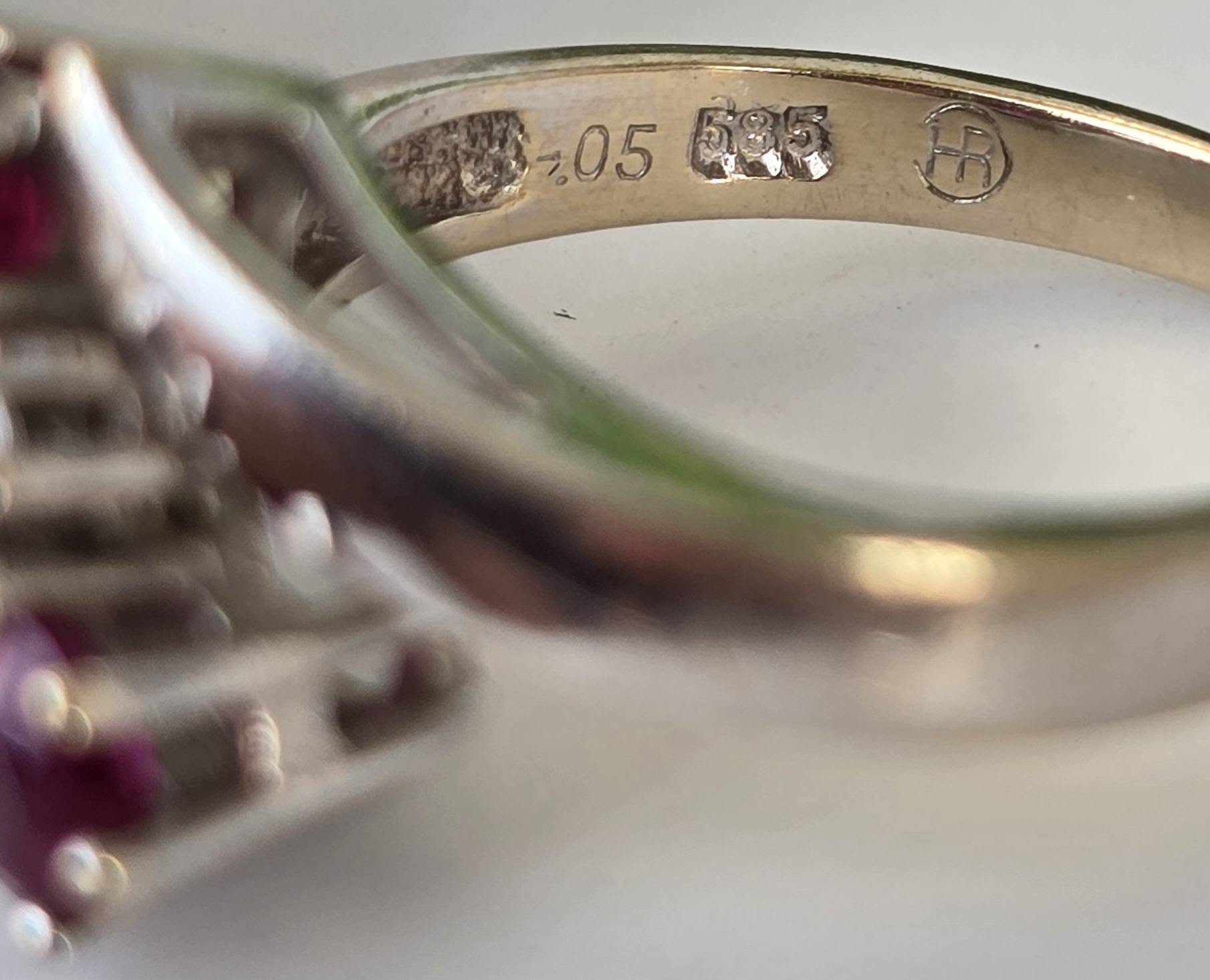 Prezintă marcaj 585 pentru puritate aur de 14K, marcaj "0.05" pentru caratajul diamantelor și marcaj de meșter.