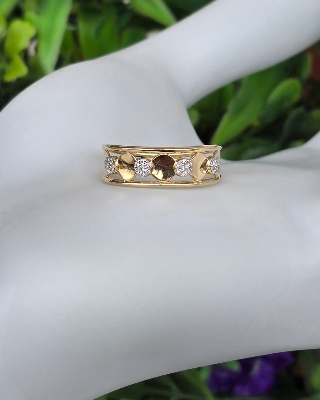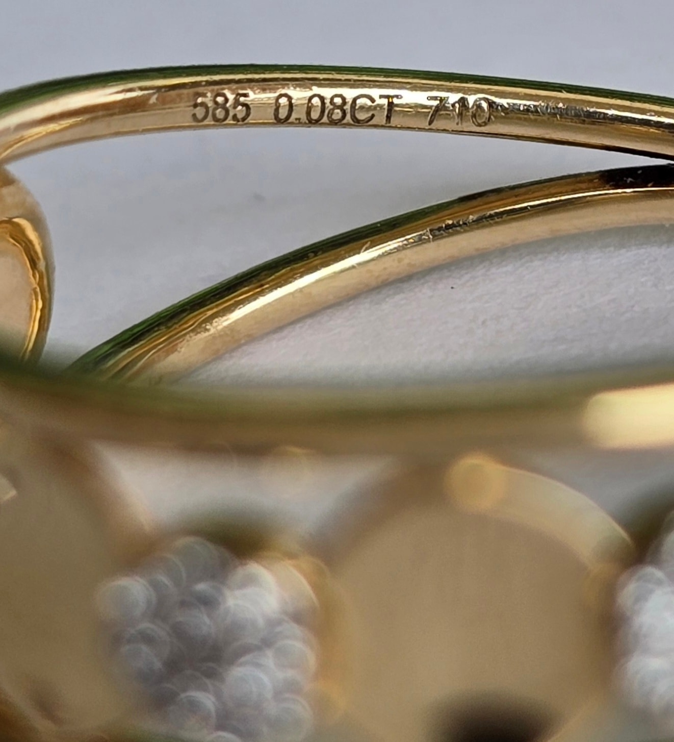 Prezintă marcaj 585 pentru puritate aur de 14K și marcaj "0.08CT" pentru caratajul diamantelor.