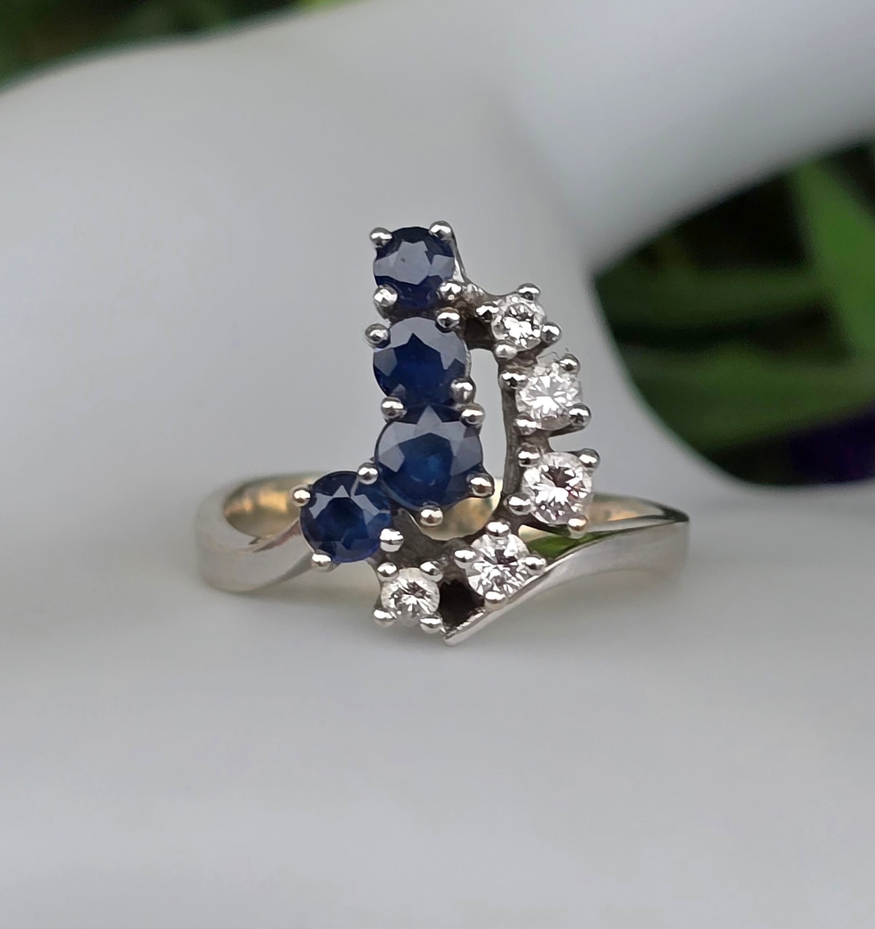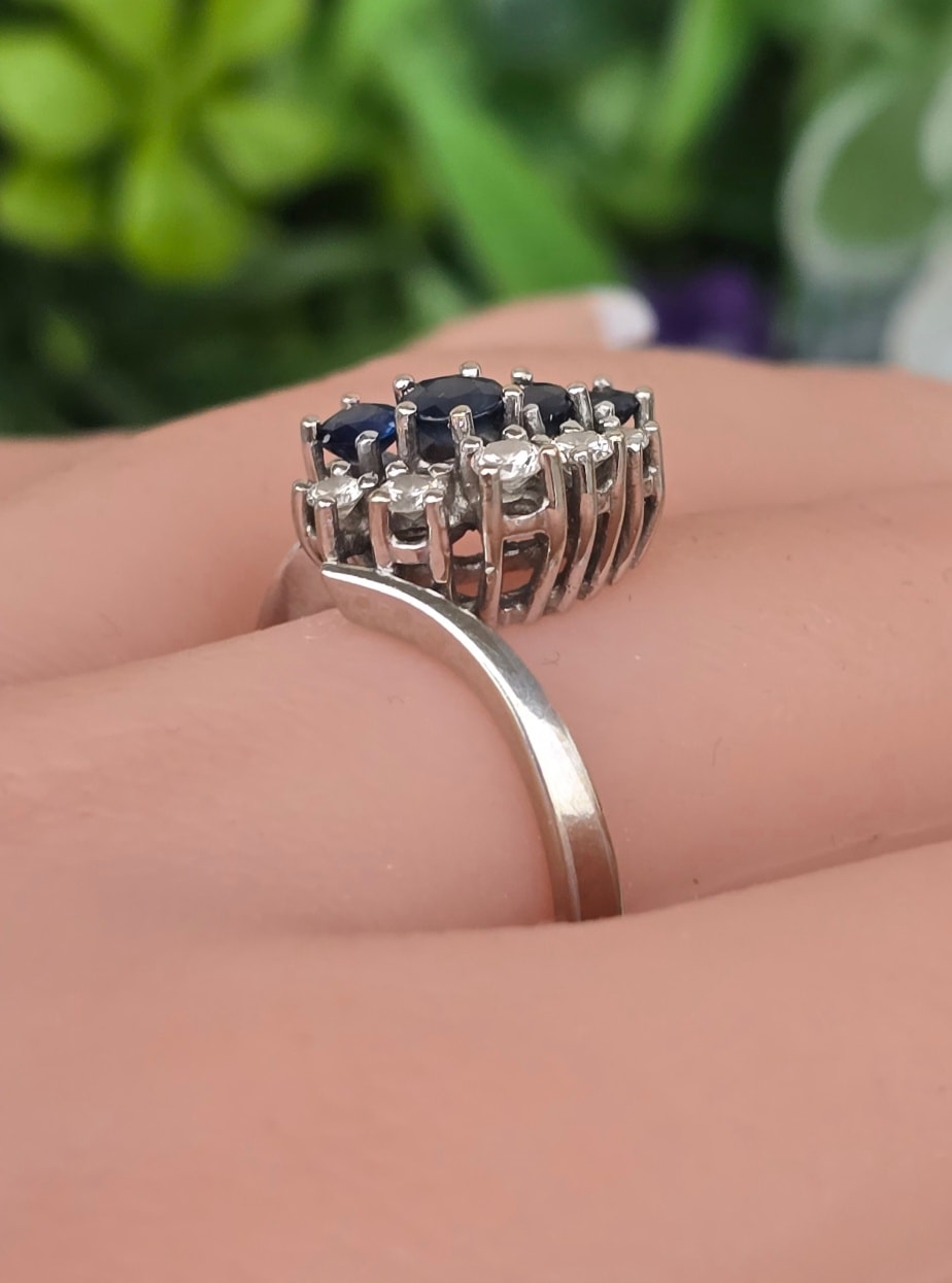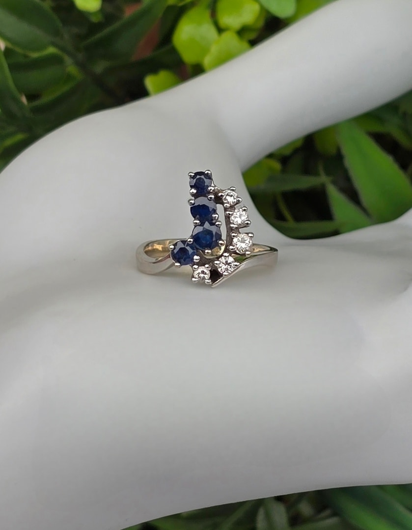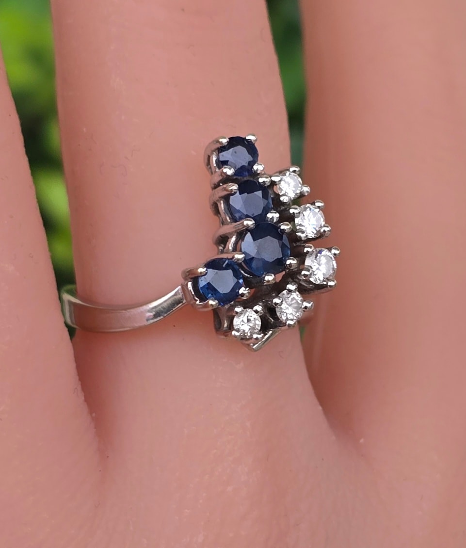 Inel vechi din aur de 14K, cu 4 safire și 5 diamante naturale de calitate excepțională.