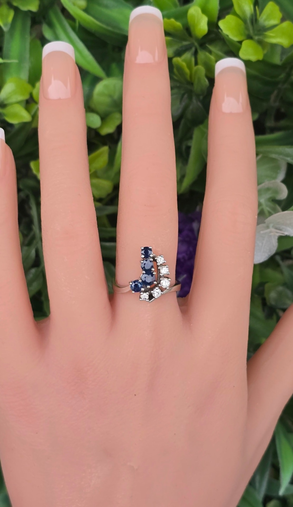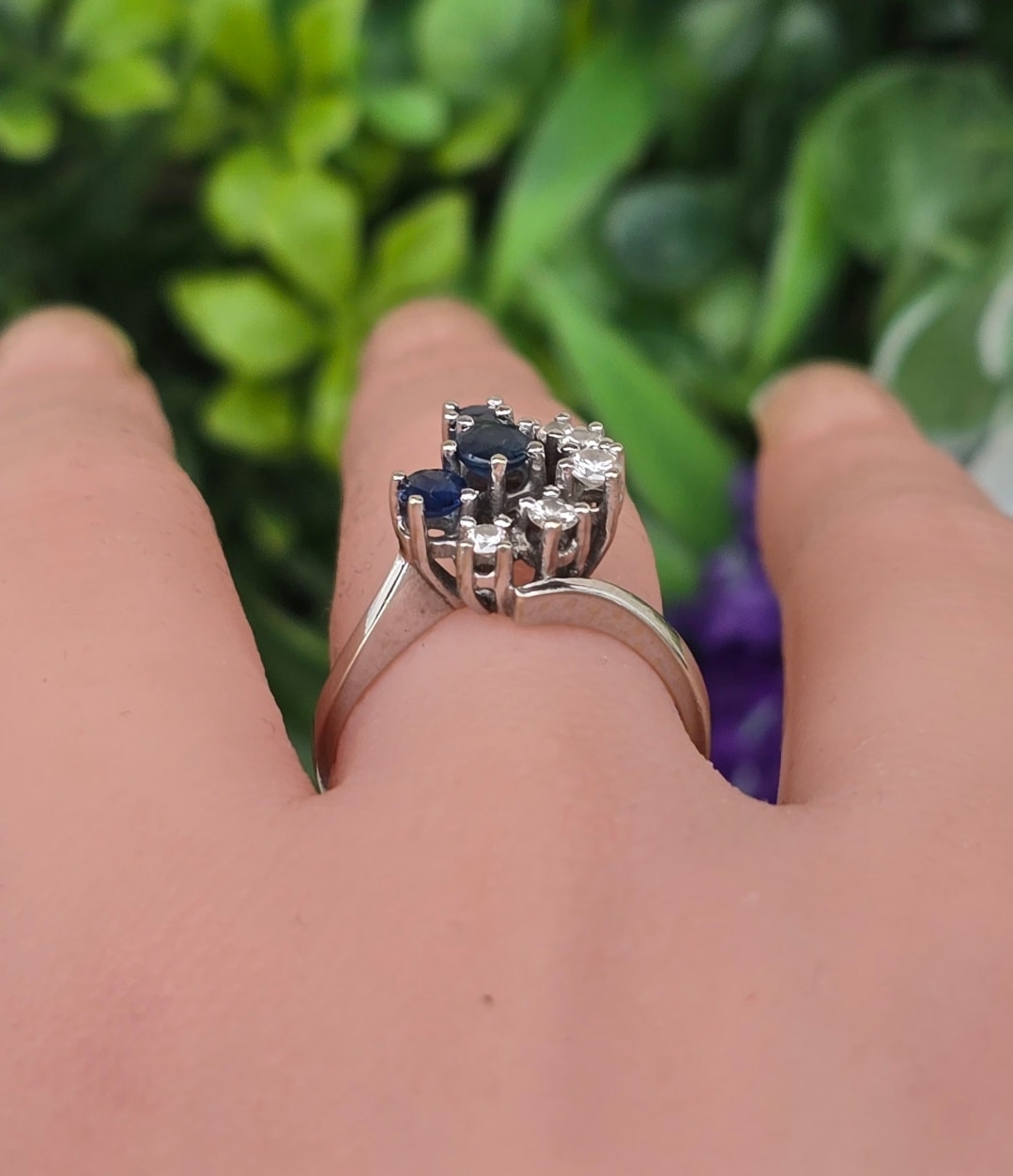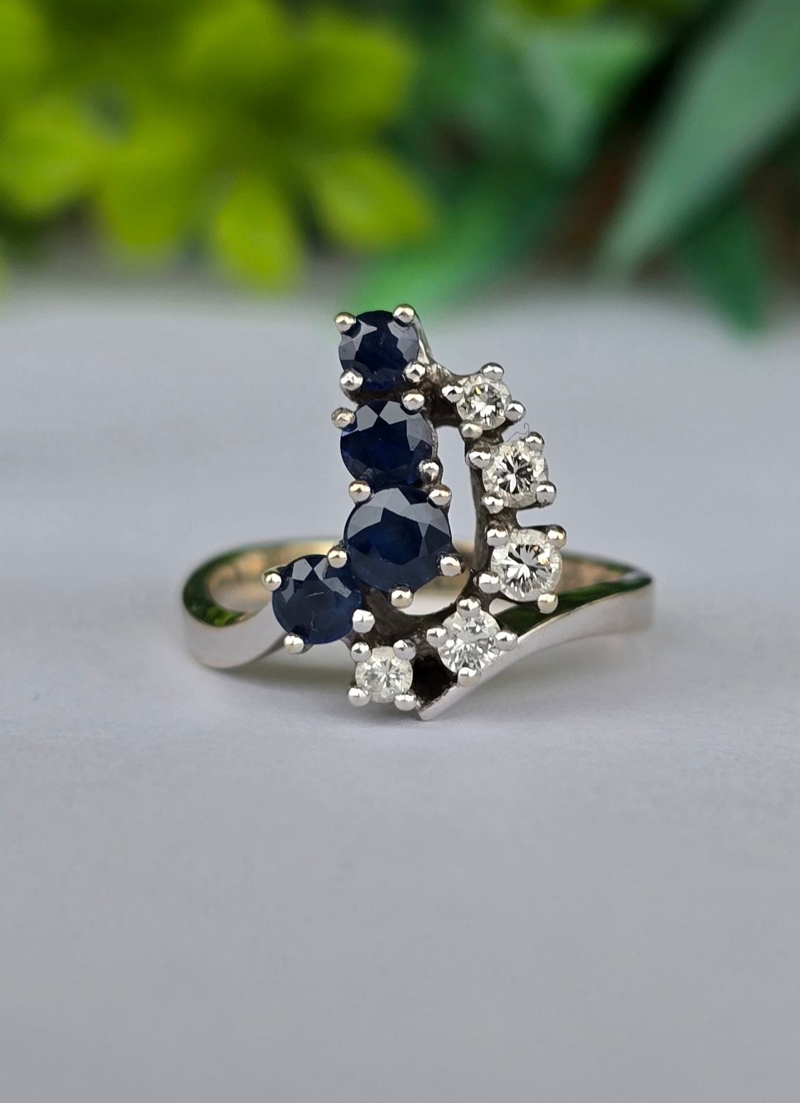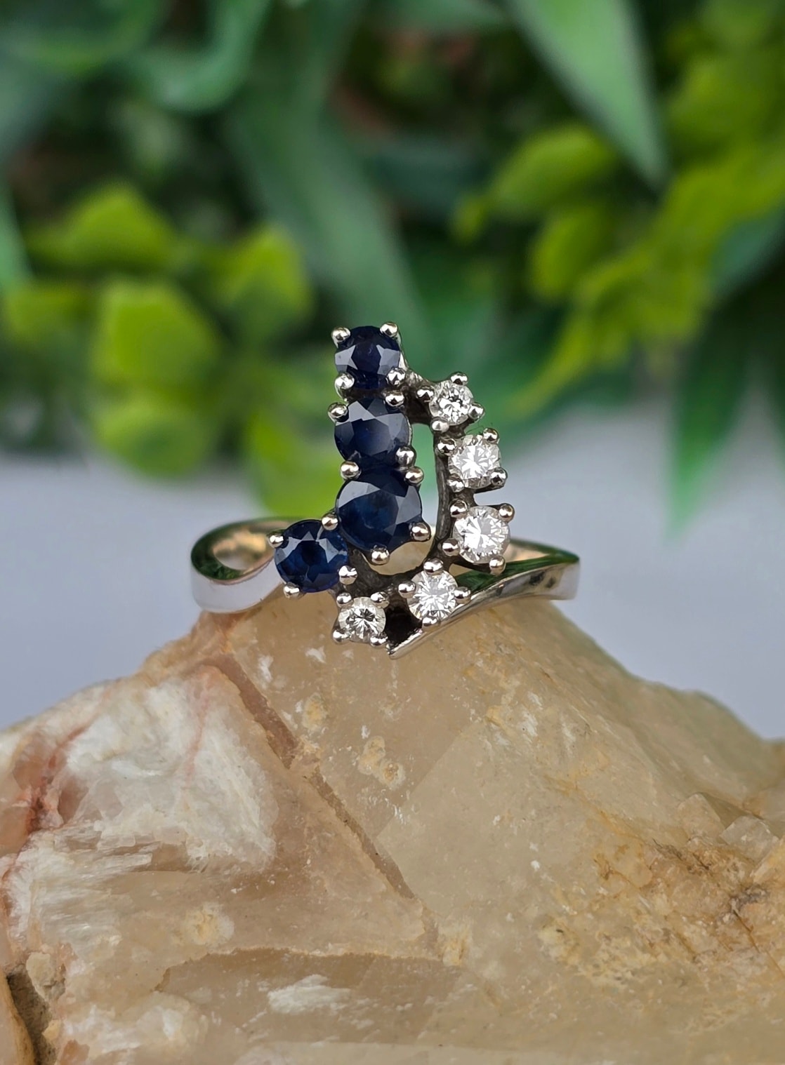 Inel vechi din aur de 14K, cu 4 safire și 5 diamante naturale de calitate excepțională.