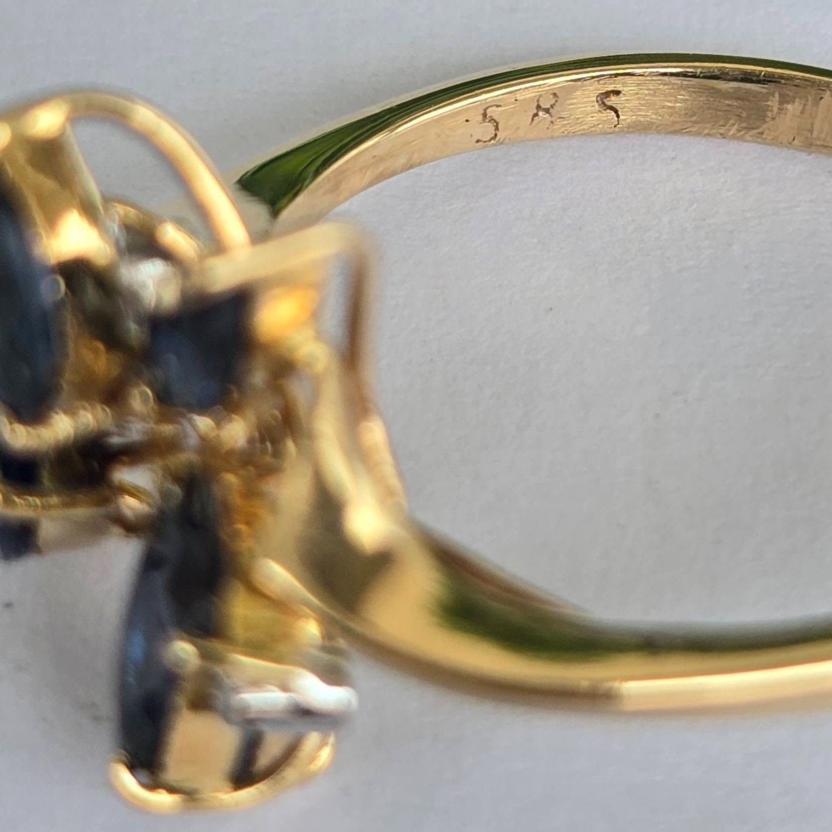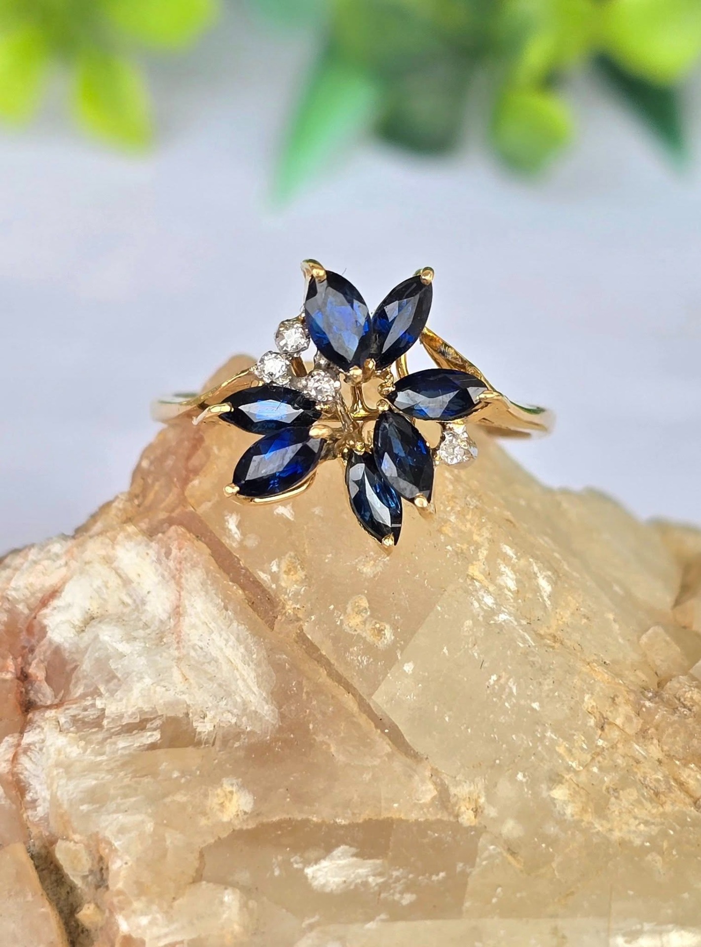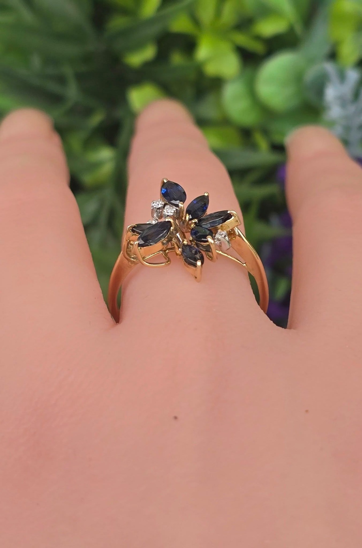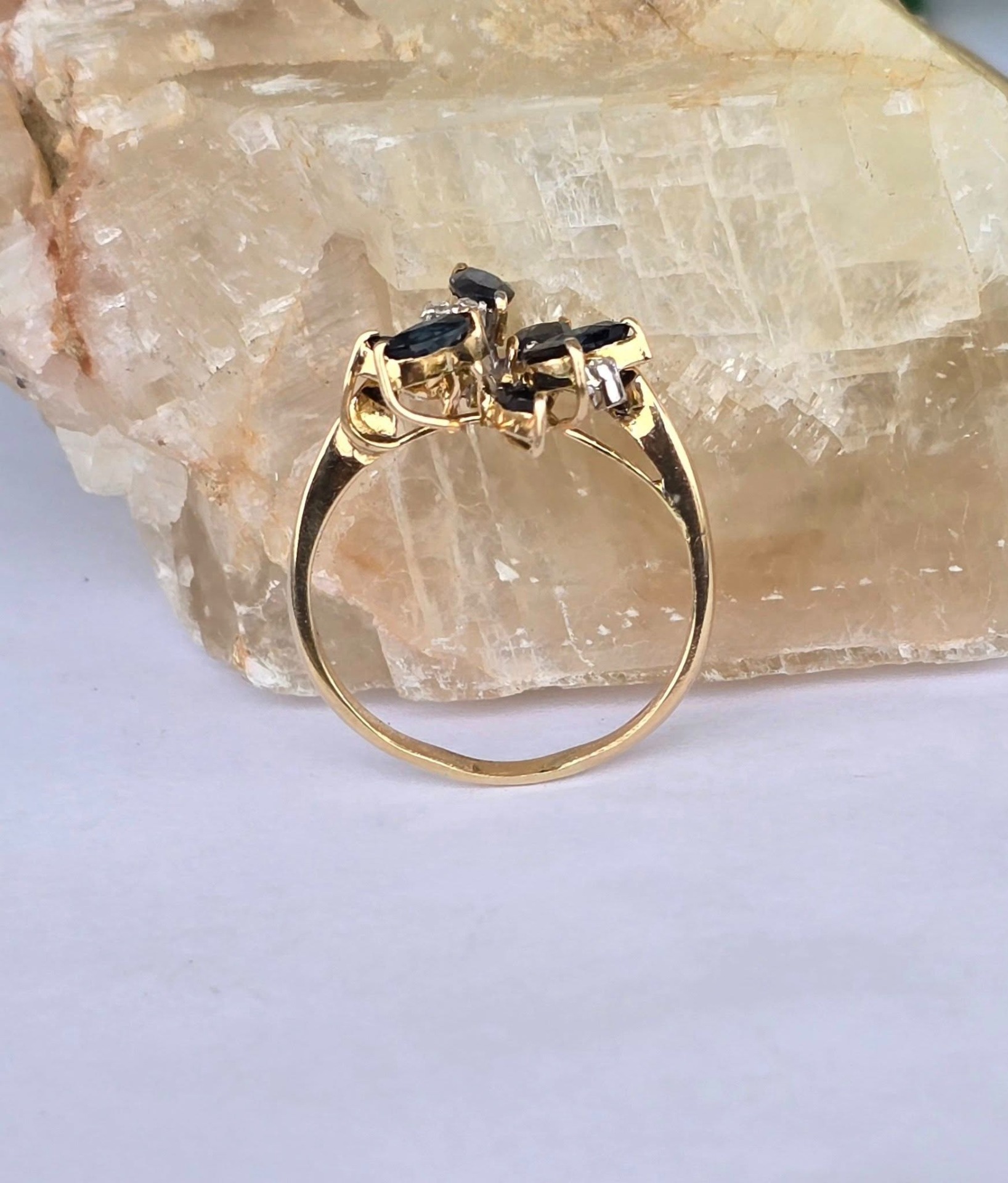 Inel vechi din aur de 14K, cu 7 safire și 4 diamante naturale.