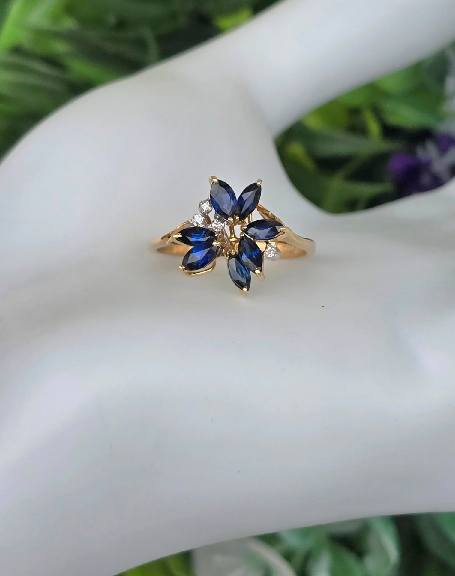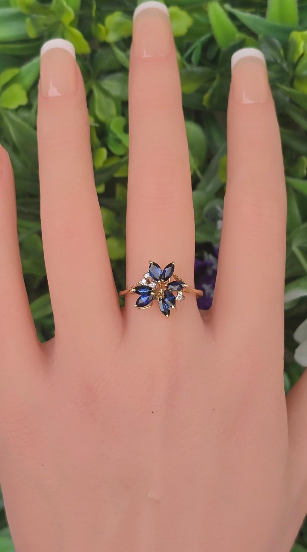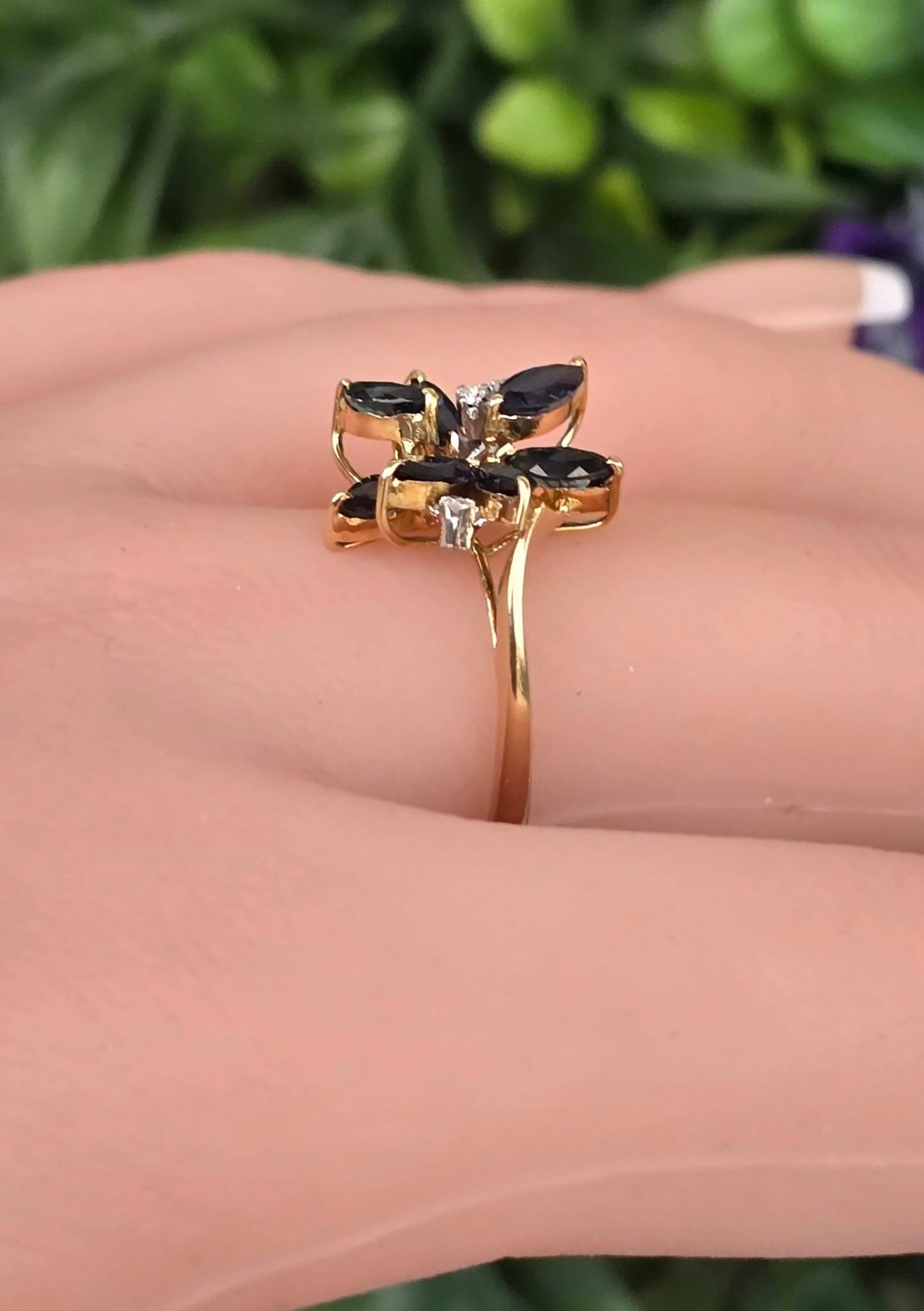 Inel vechi din aur de 14K, cu 7 safire și 4 diamante naturale.
