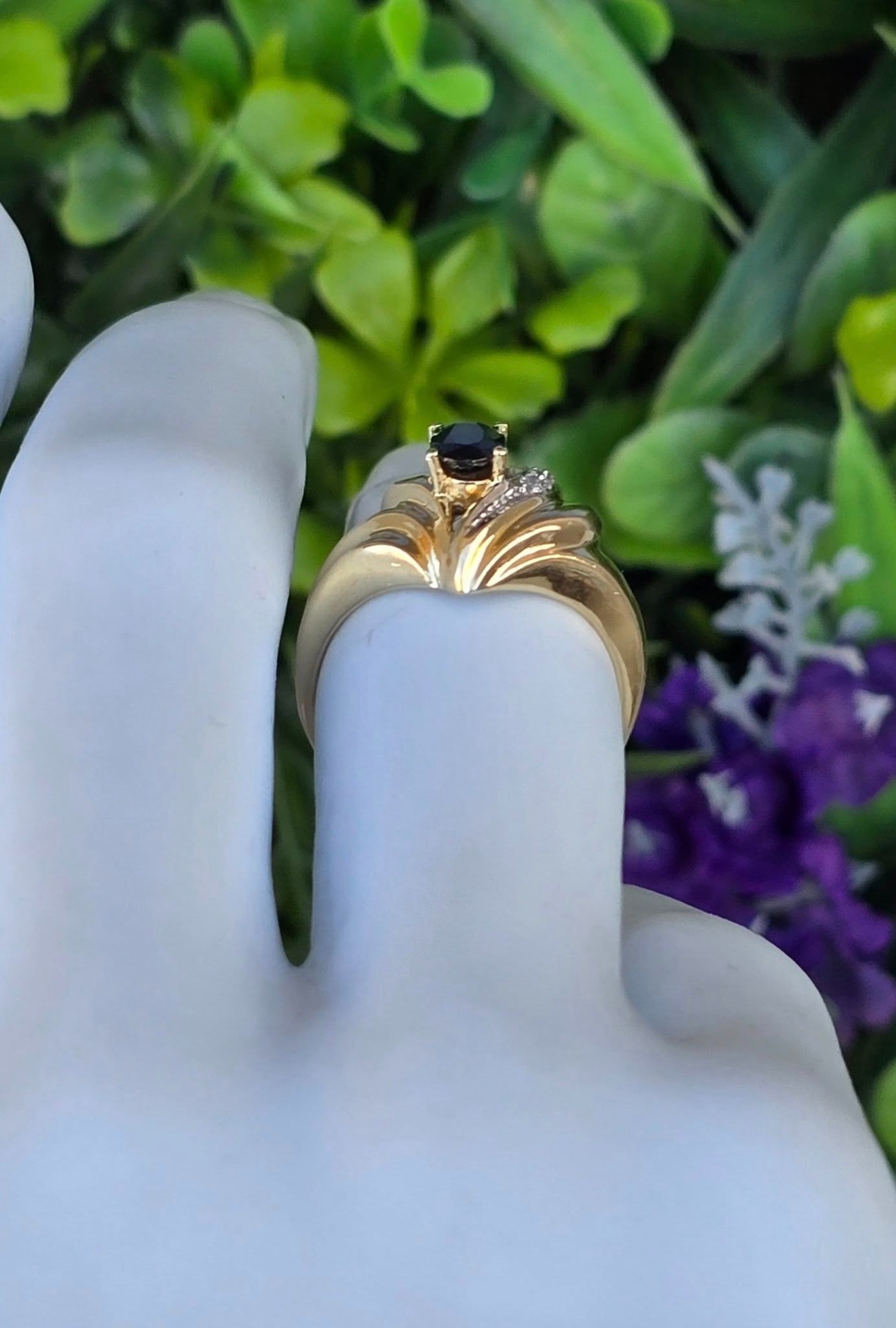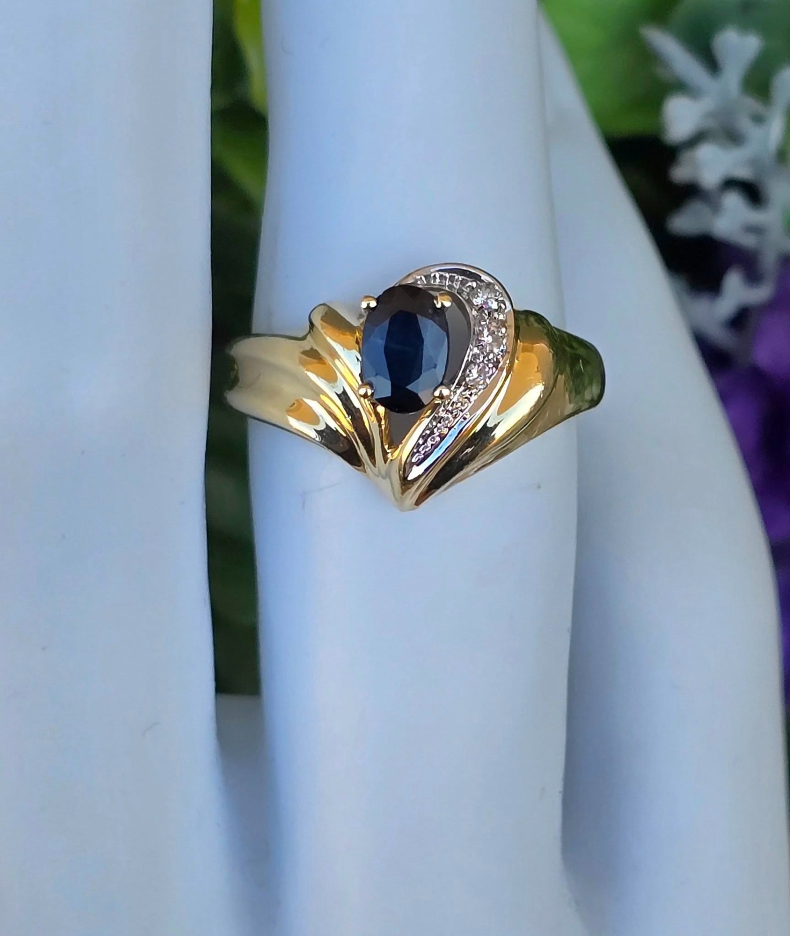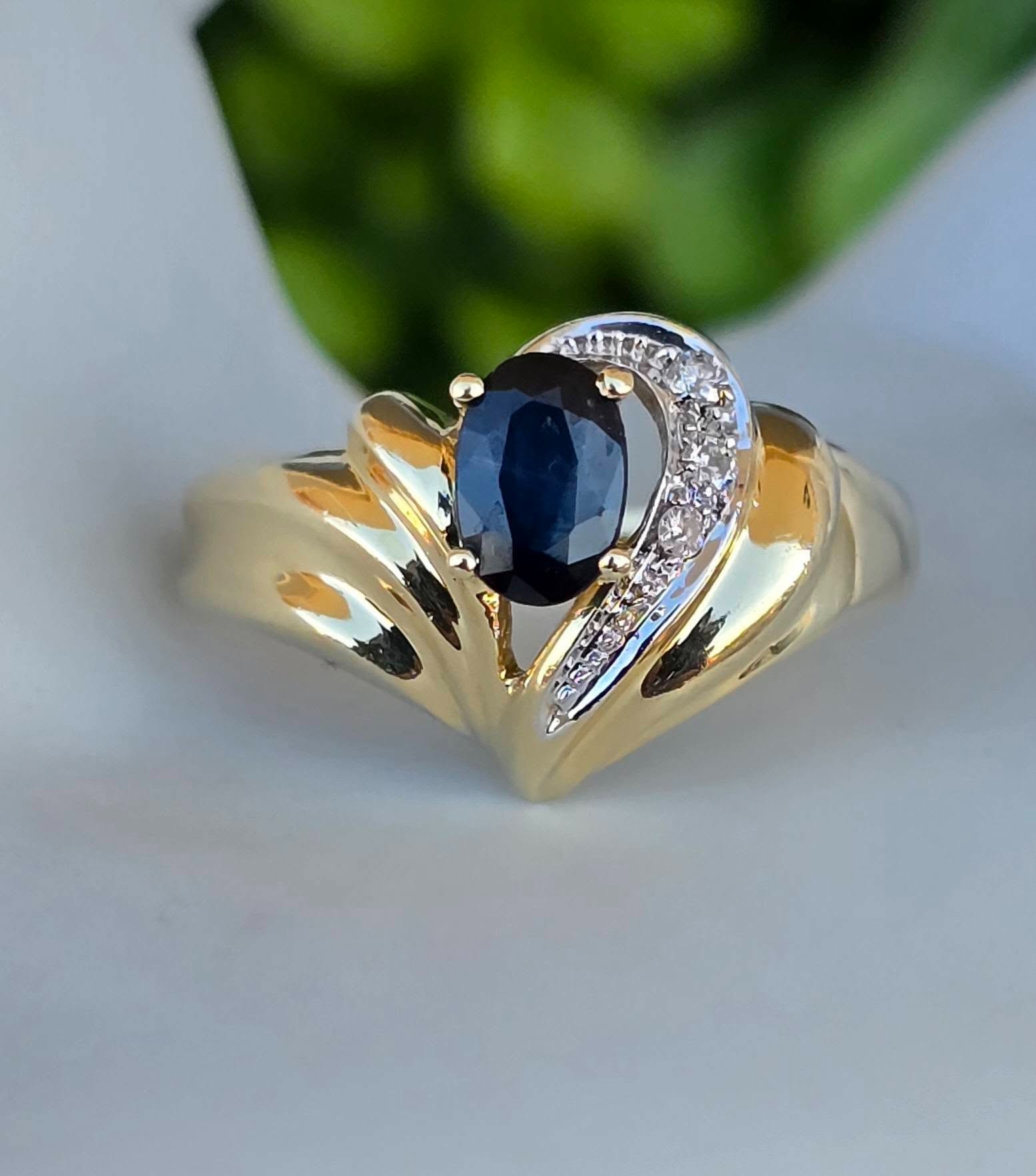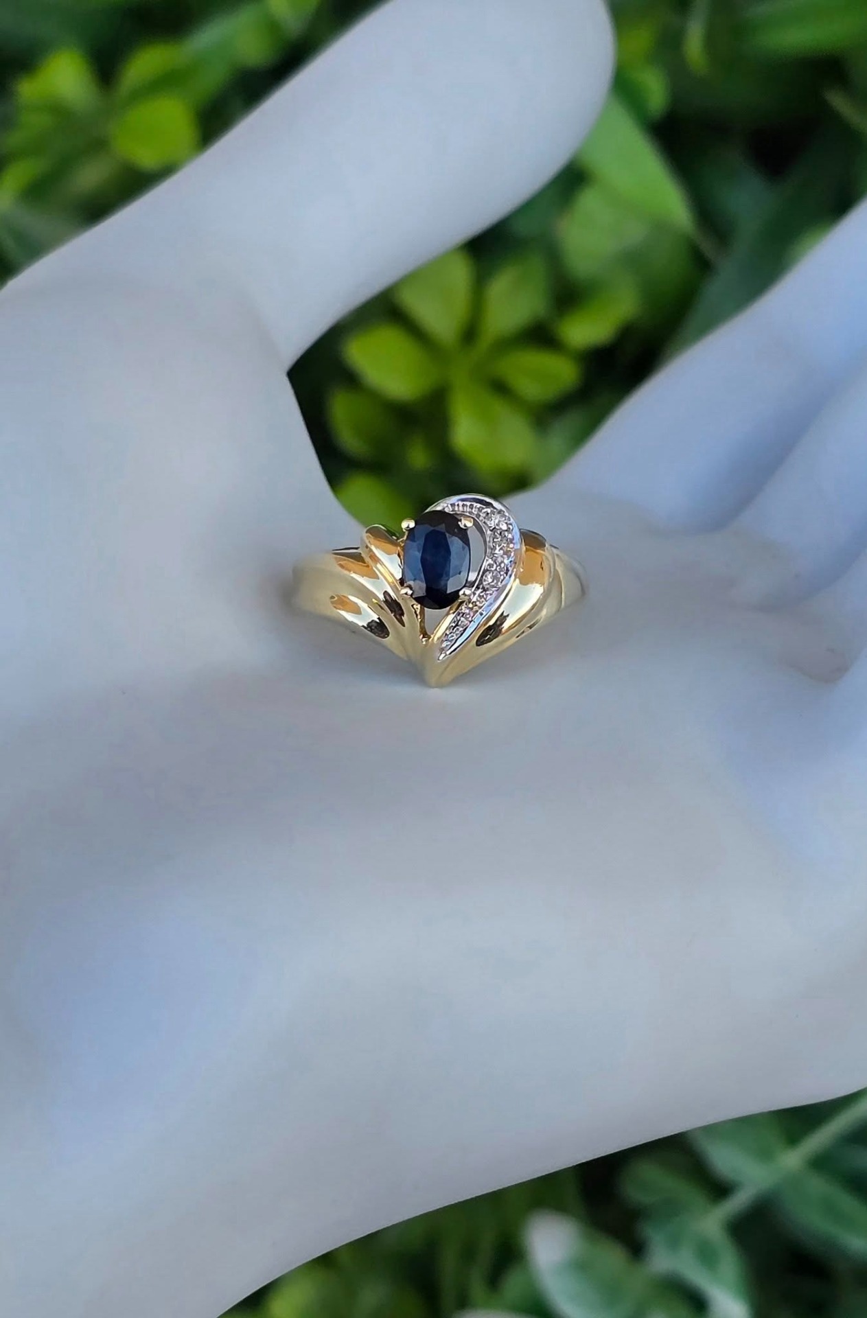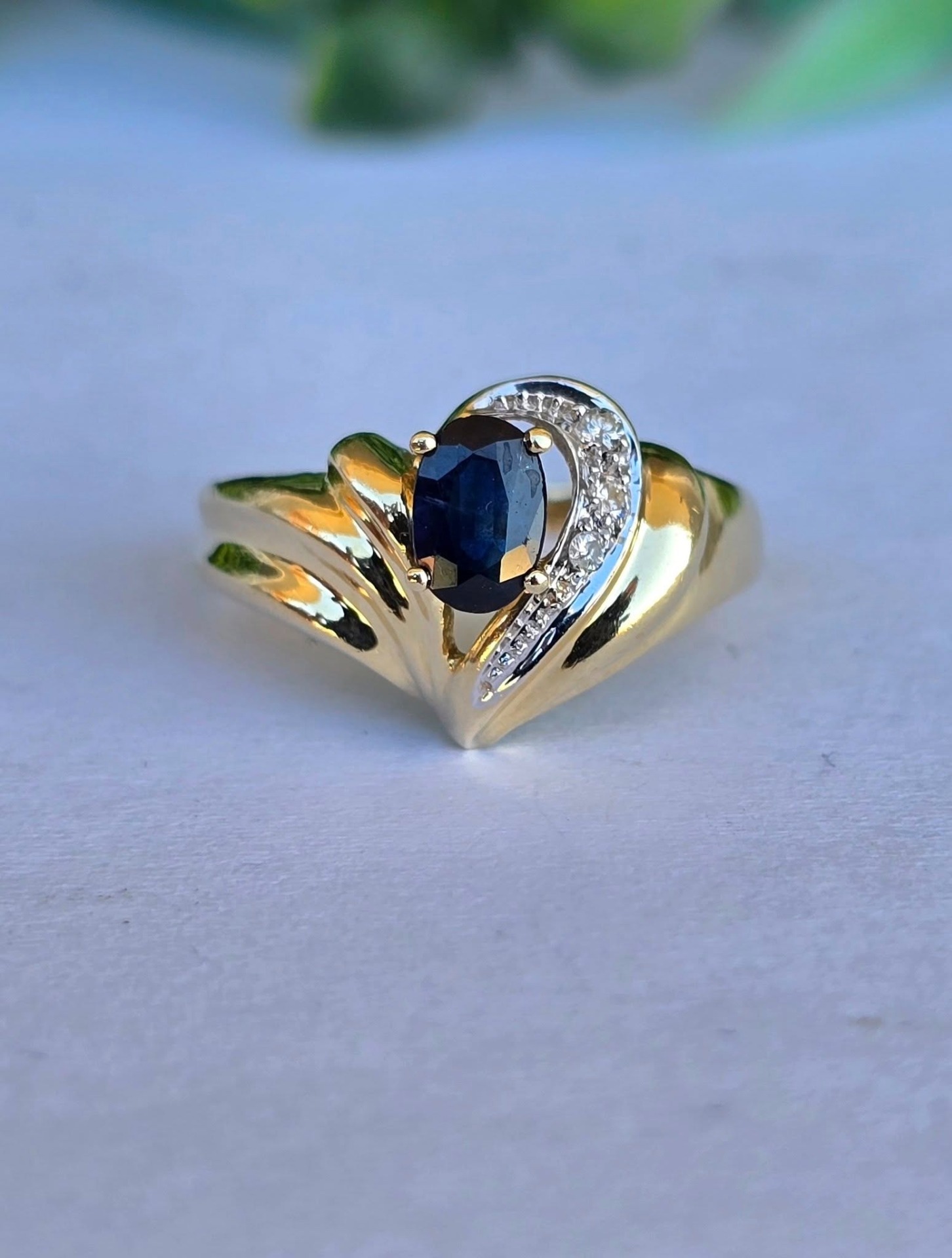 Inel vechi din aur de 14K, cu safir și 3 diamante naturale, manufactură în design romantic.